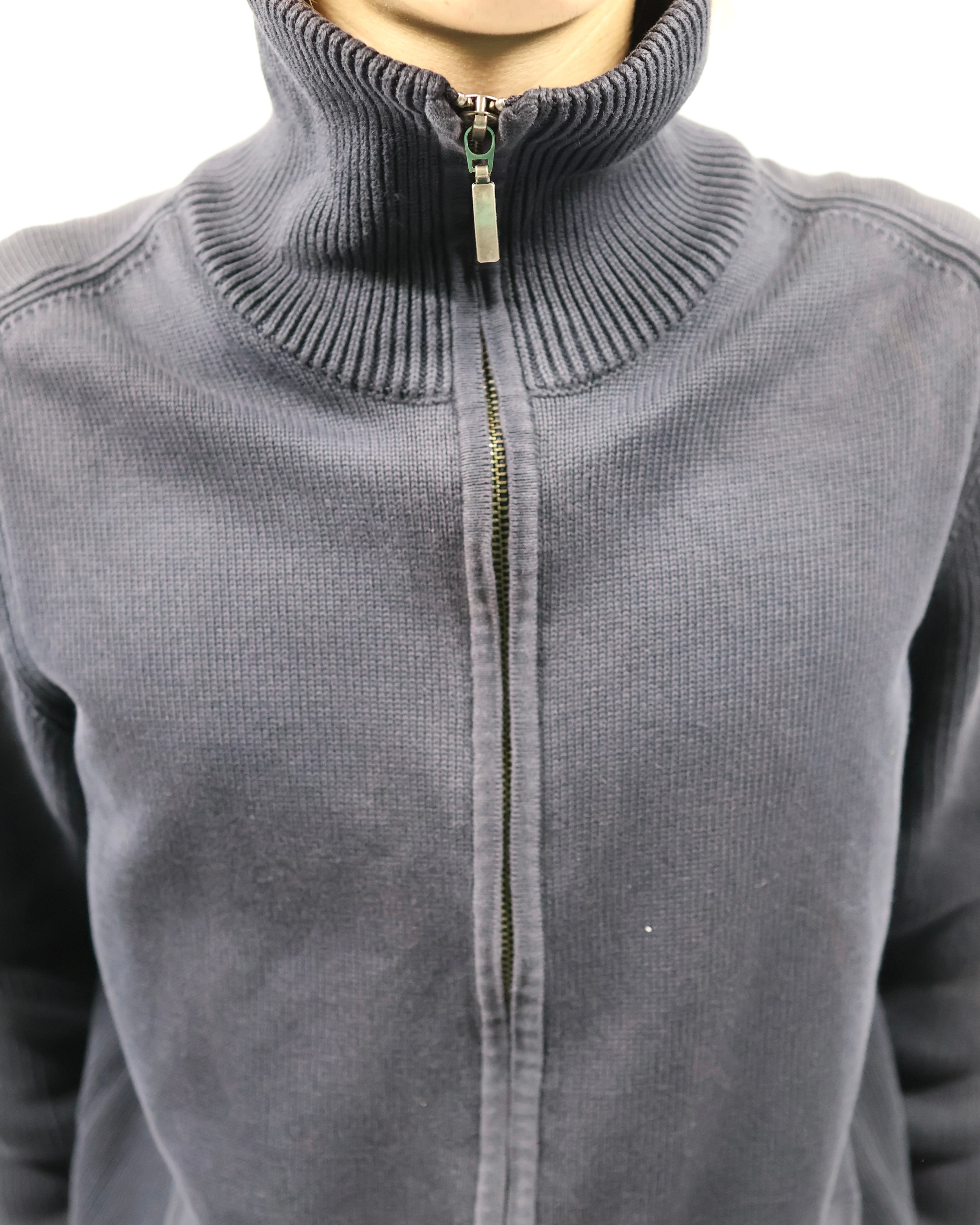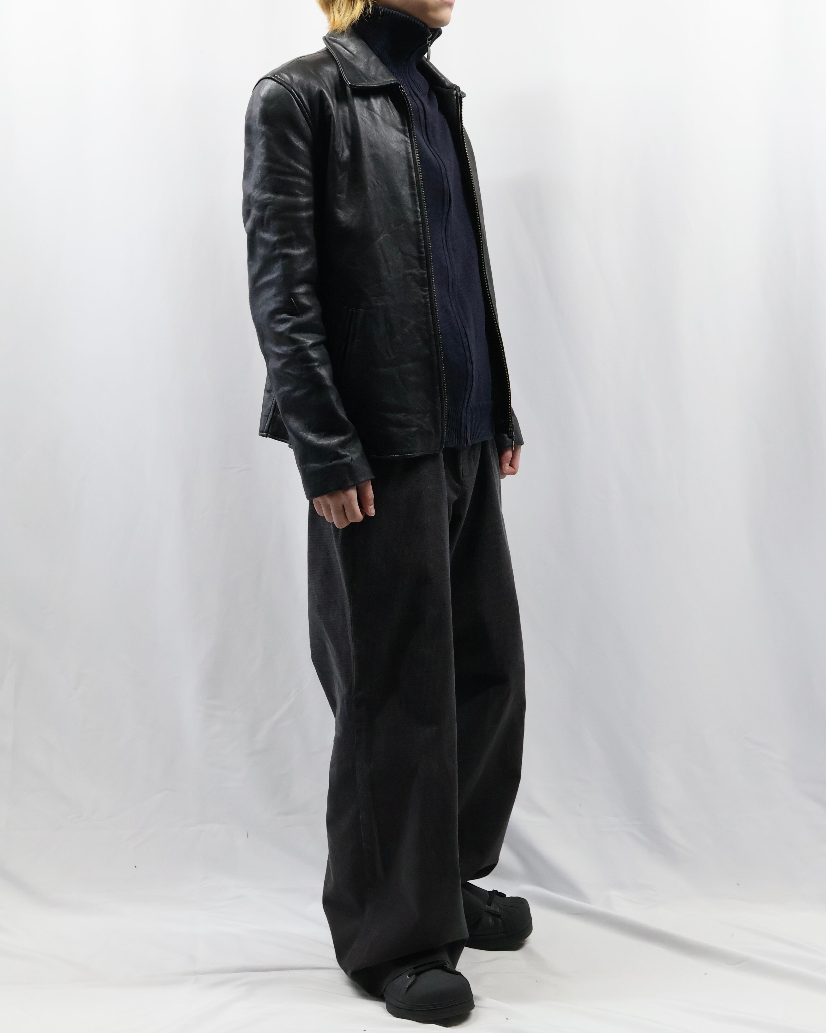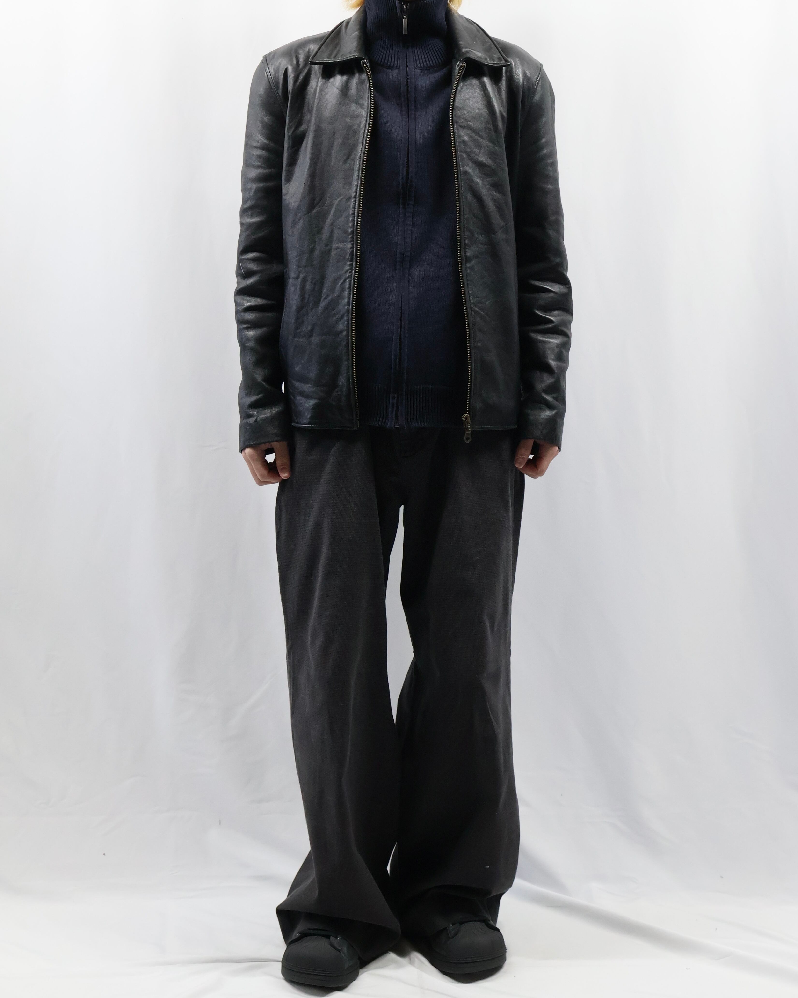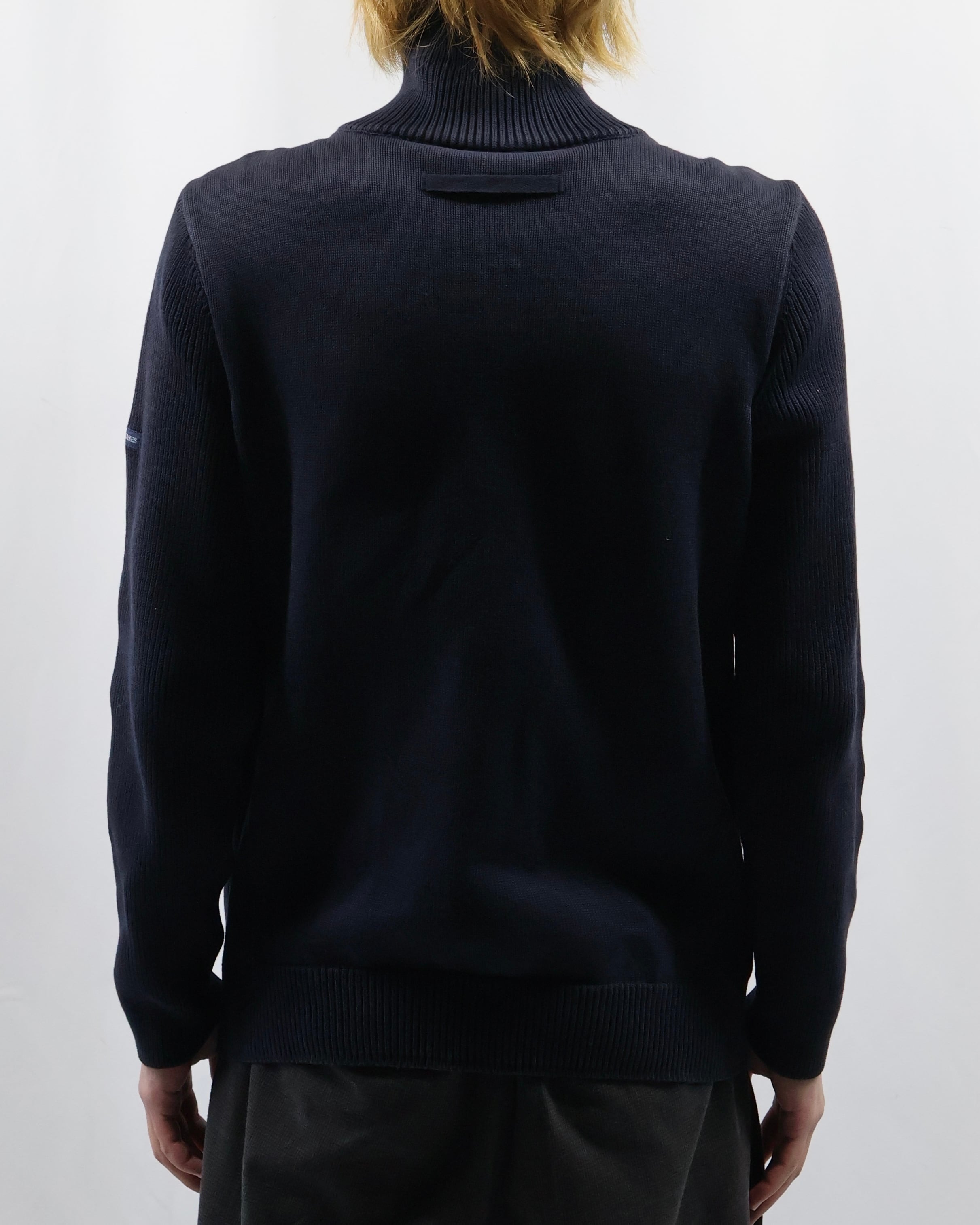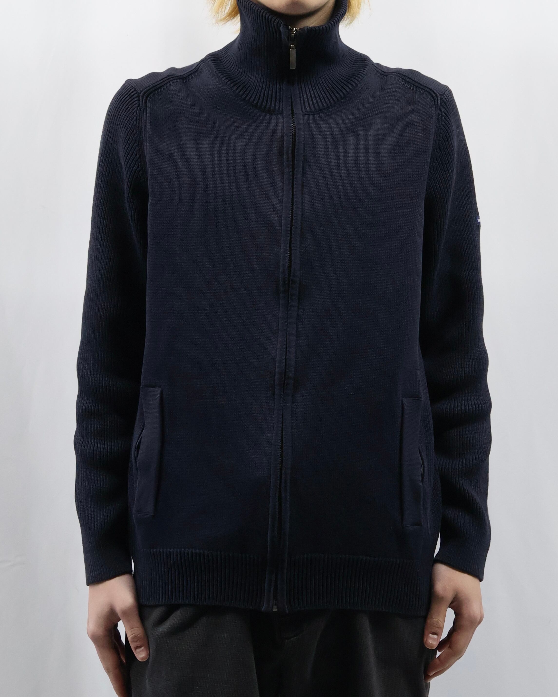 上品な風合いで仕立ての良いドライバーズニット。最近色々なブランドがドライバーズニットを出していますが、デザイナーズのようなディテールで一枚の説得力もあり、タイトなサイジングのためインナーに入れてネックの部分を見せるだけでも充分に存在感を発揮します。ネイビーの色合いもよく、黒やグレーとも違う、クラシックながらもすこし抜け感を与えてくれるようなカラーで色に挑戦したい方におすすめです。