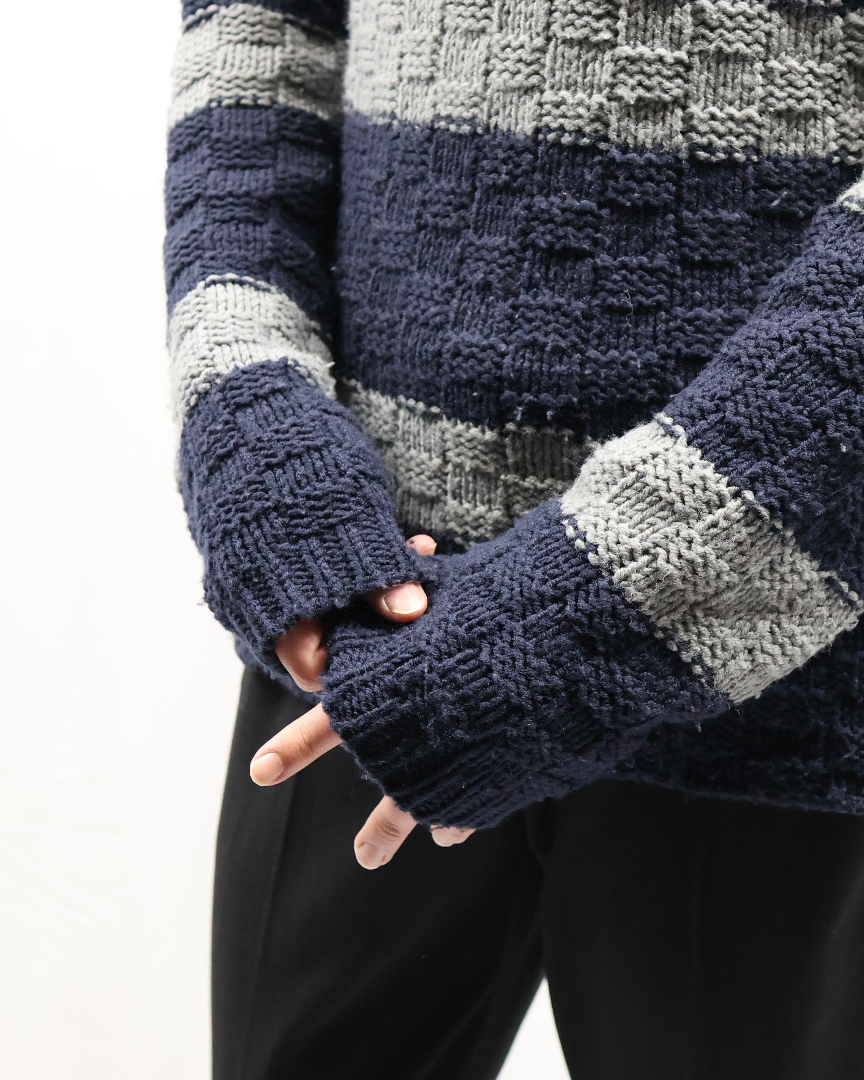 ボーダーで配色が可愛らしいカラーネックニット。編み方がブロックチェックのようになっており、構築的な雰囲気を漂わせ、フォーマルな格好に差し込んでも、外しすぎないこなれ感を演出します。もちろんボーダーの配色を活かした寒色でまとめたスタイリングのインナー、主役としてもおすすめです。