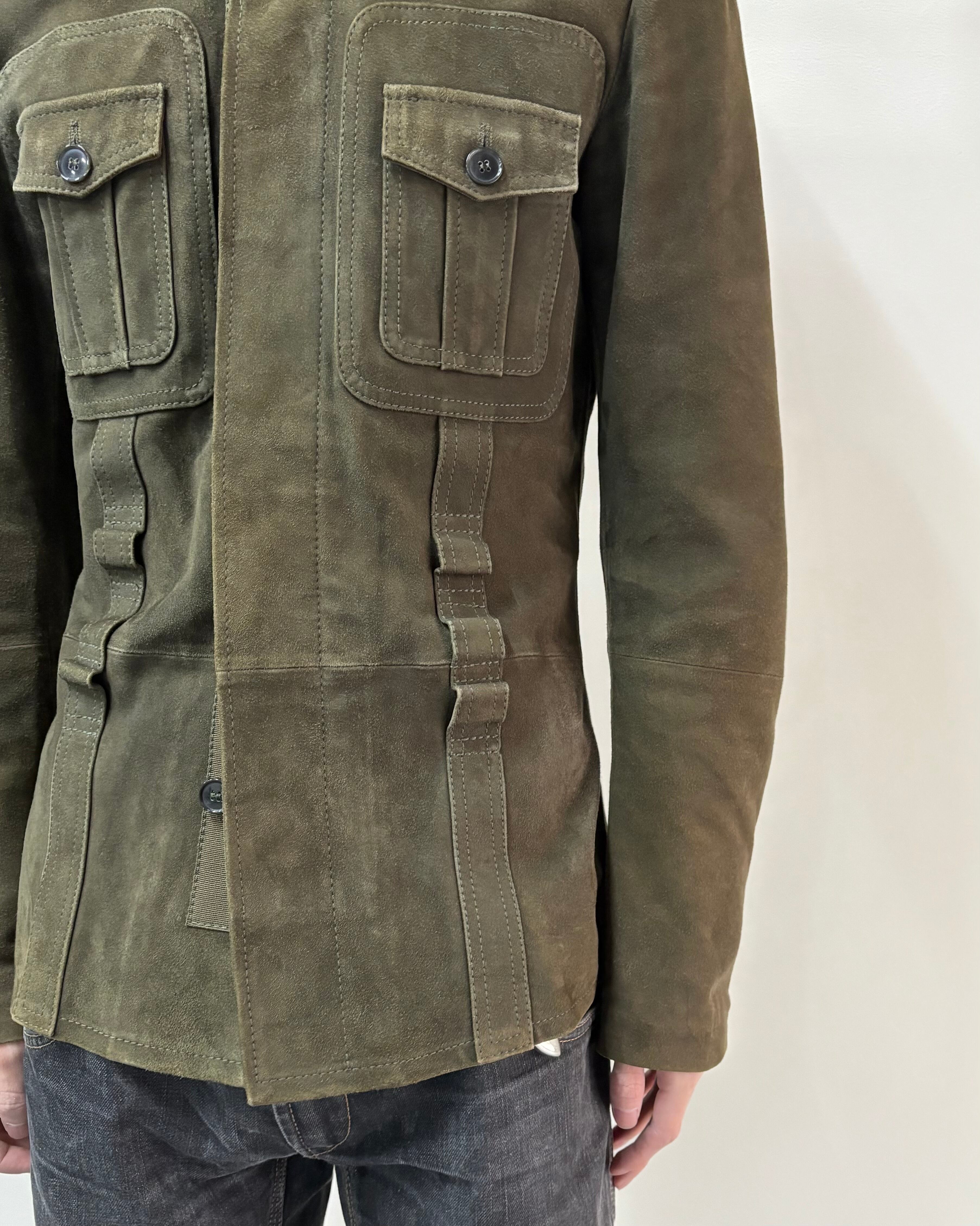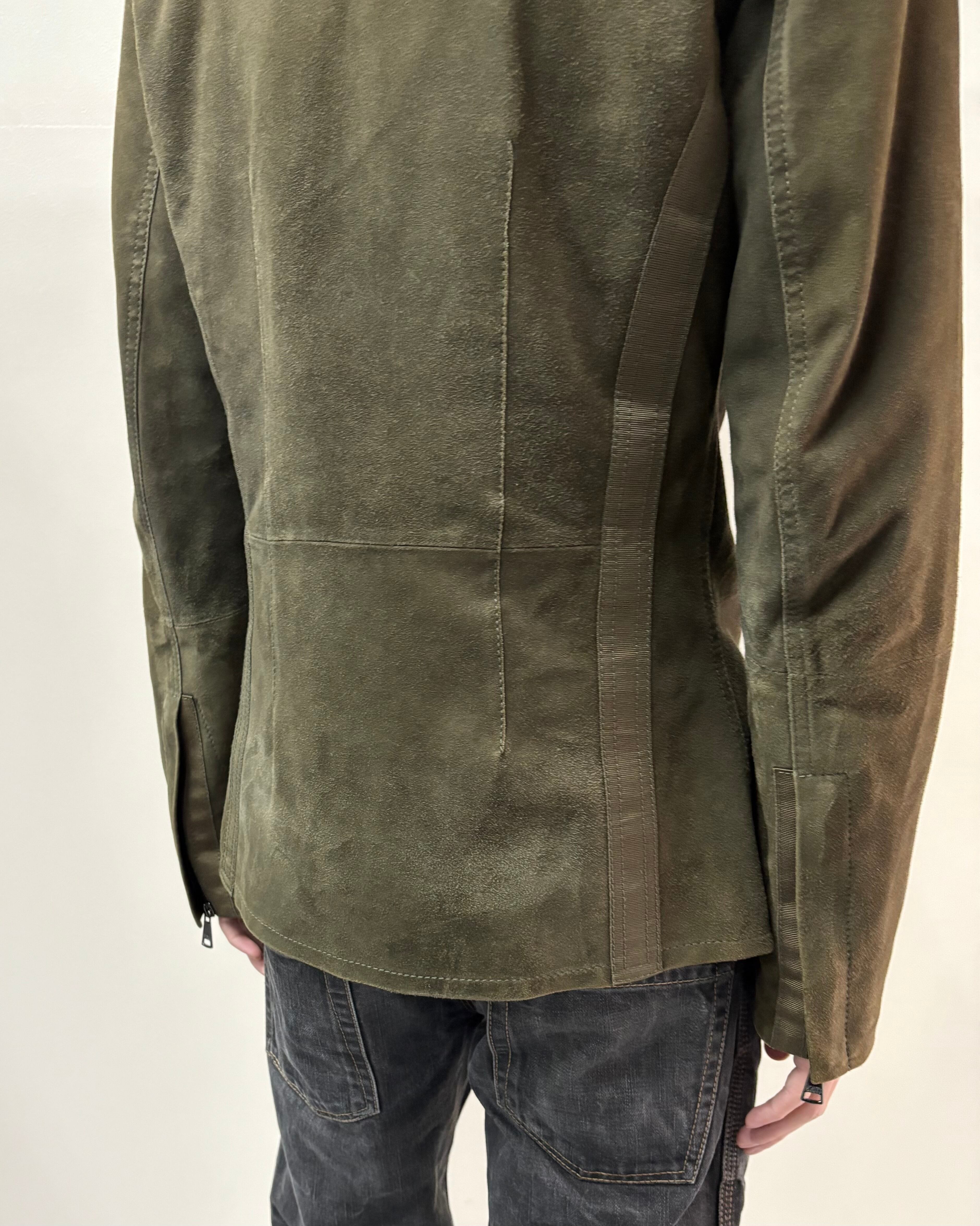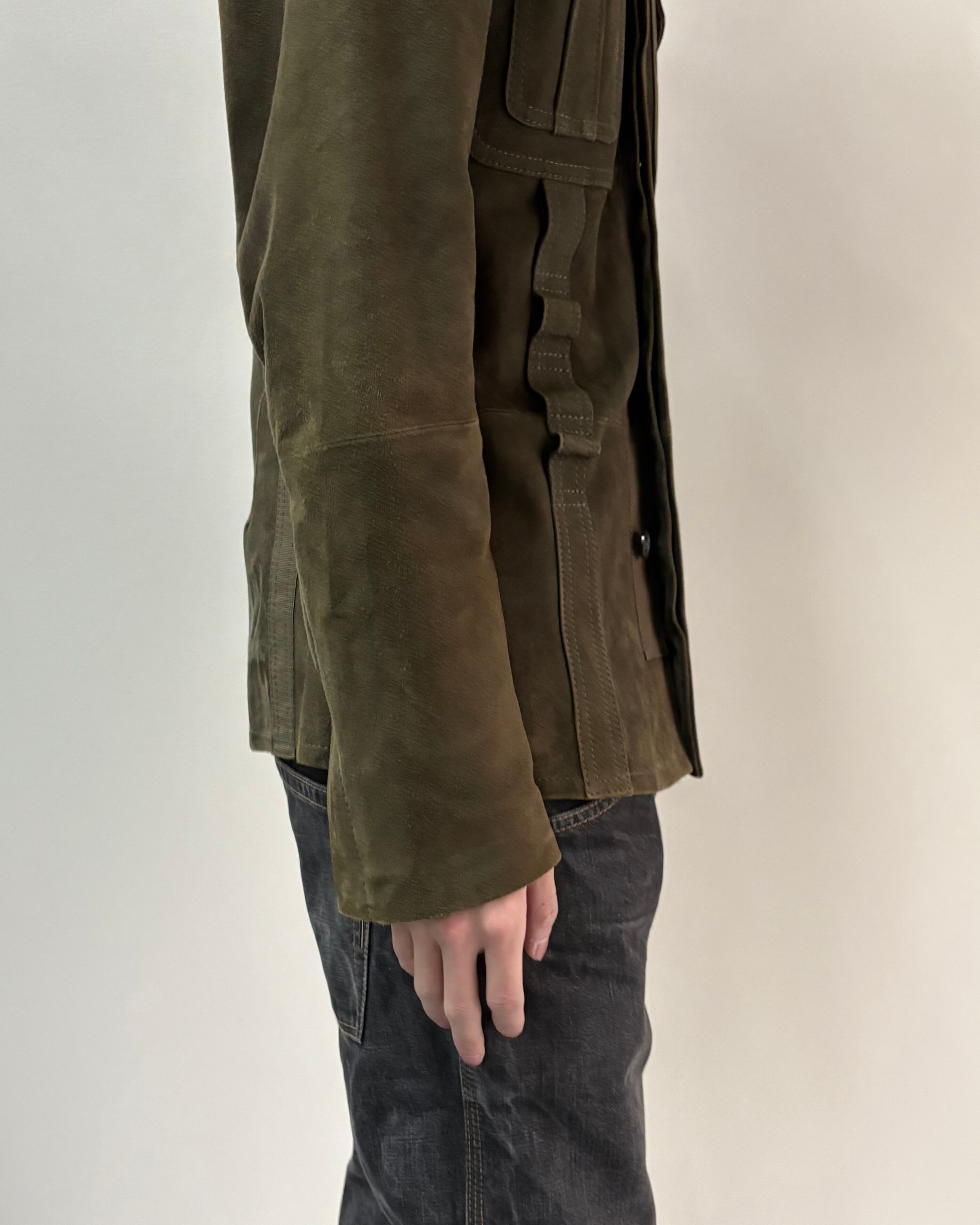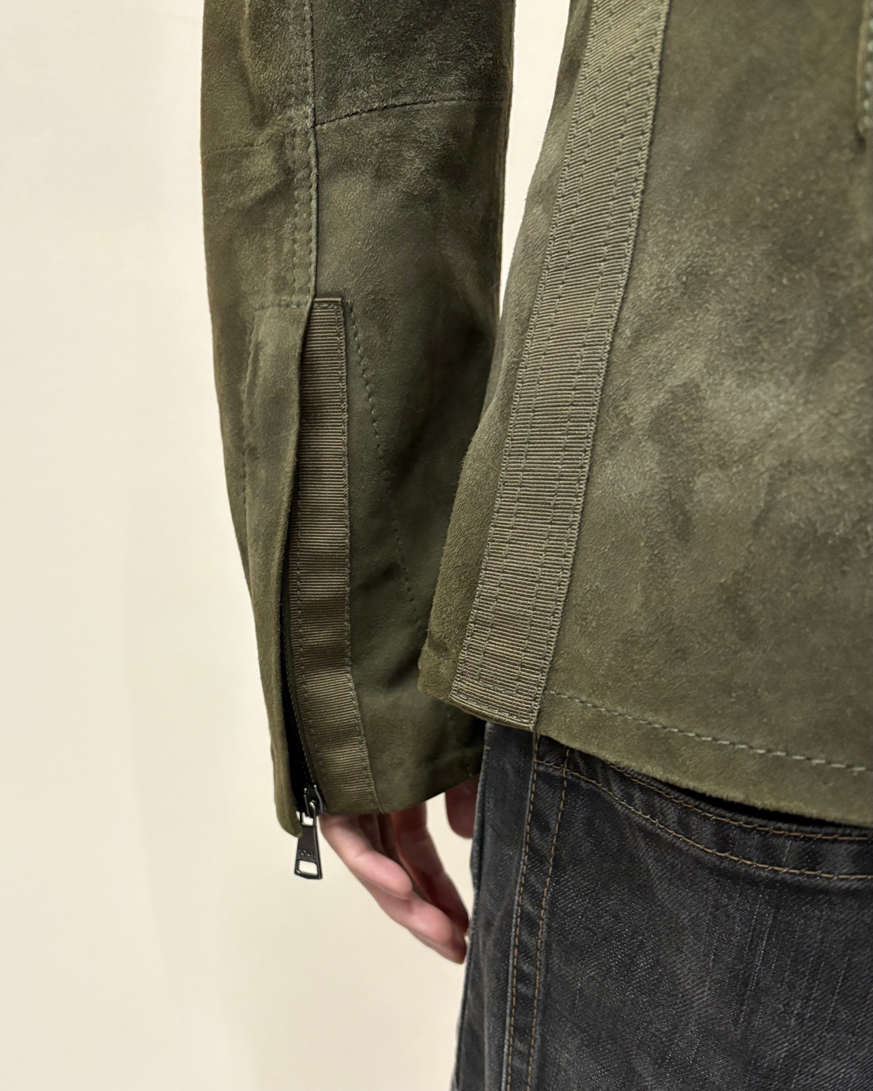 スッキリとしたサイズ感とゴートスキンスエードの上品さにミリタリーのディテールを落とし込んだ一着。