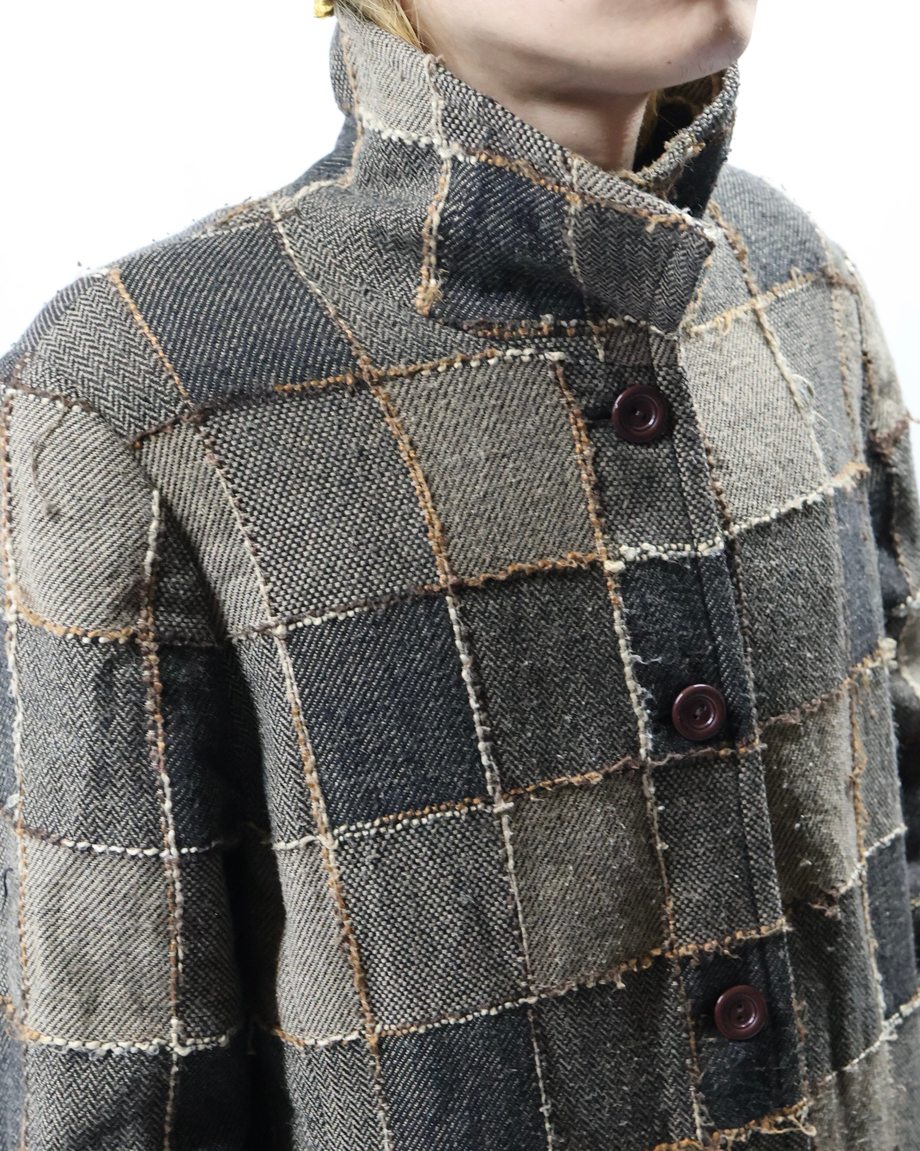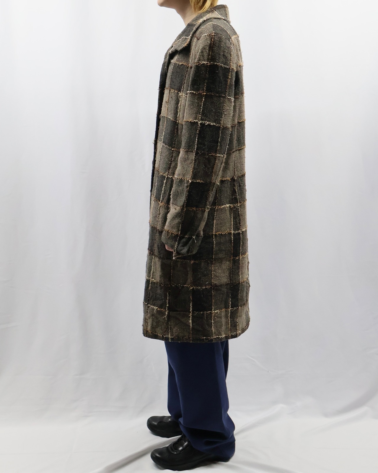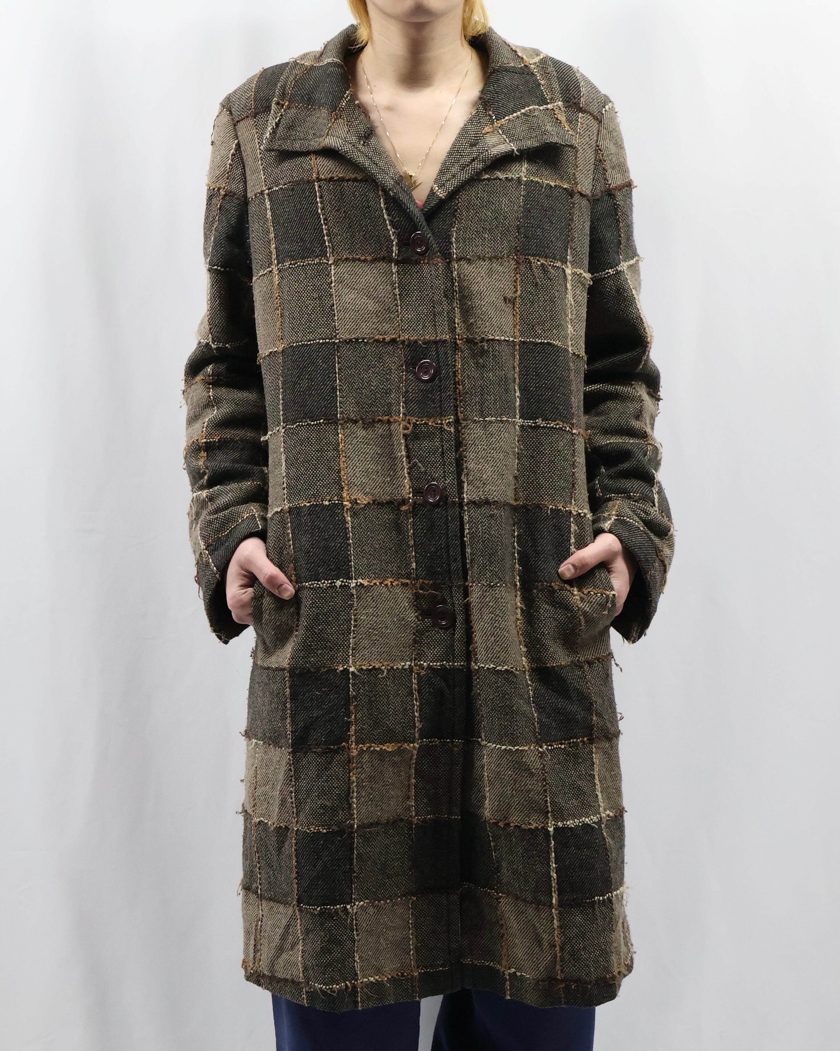 シルエットの良さがカラーとデザインに引けを取らない、絶妙なバランスで、クラシックとカジュアルを併せ持つ、古着ならではのgoodなコートです。意外とパンツに細かいチェックなどの柄を持ってきてもらっても程よい抜け感とファッション性を演出してくれる一枚で、柄物やハーフ丈のアウターをお探しの方に是非おすすめです。