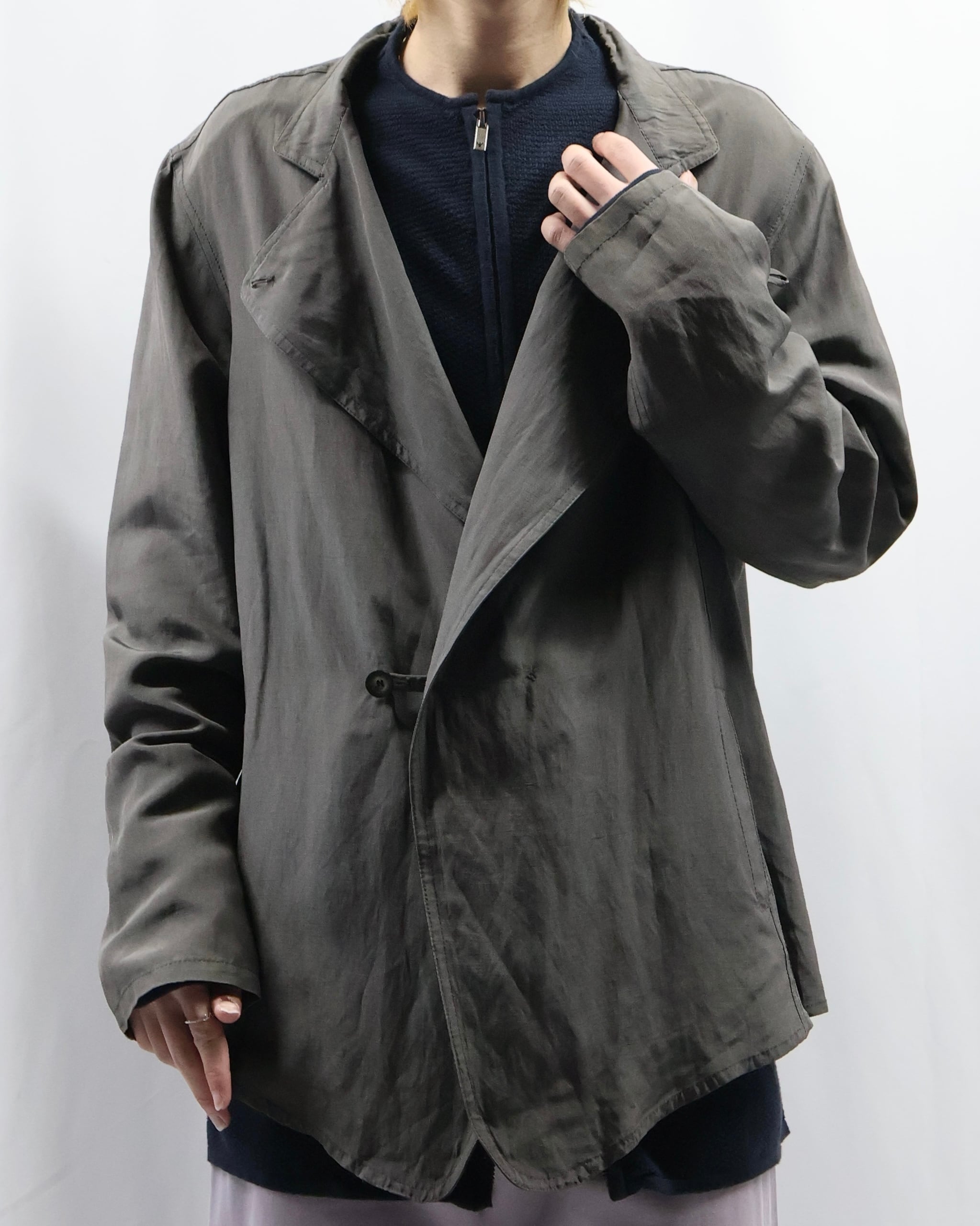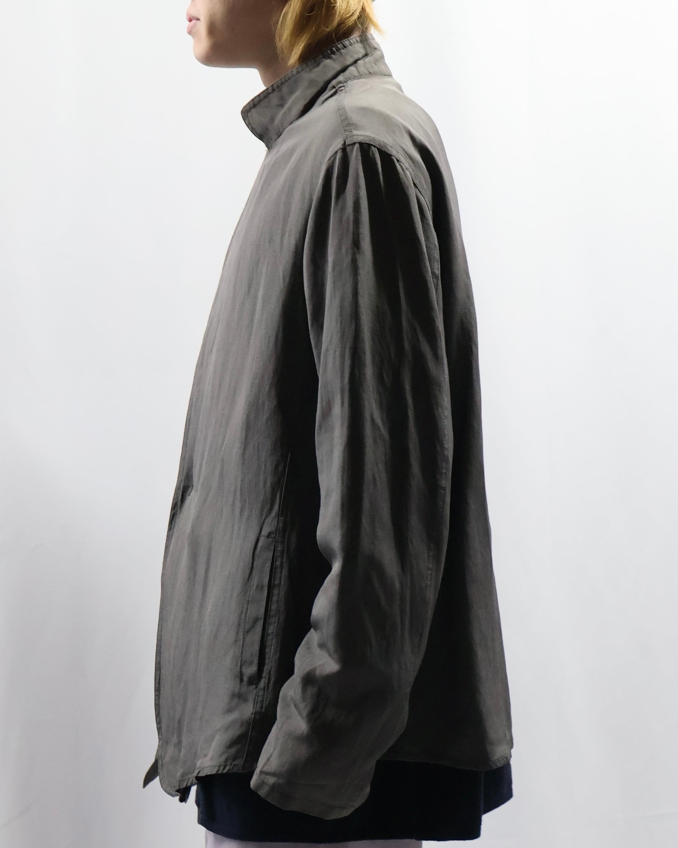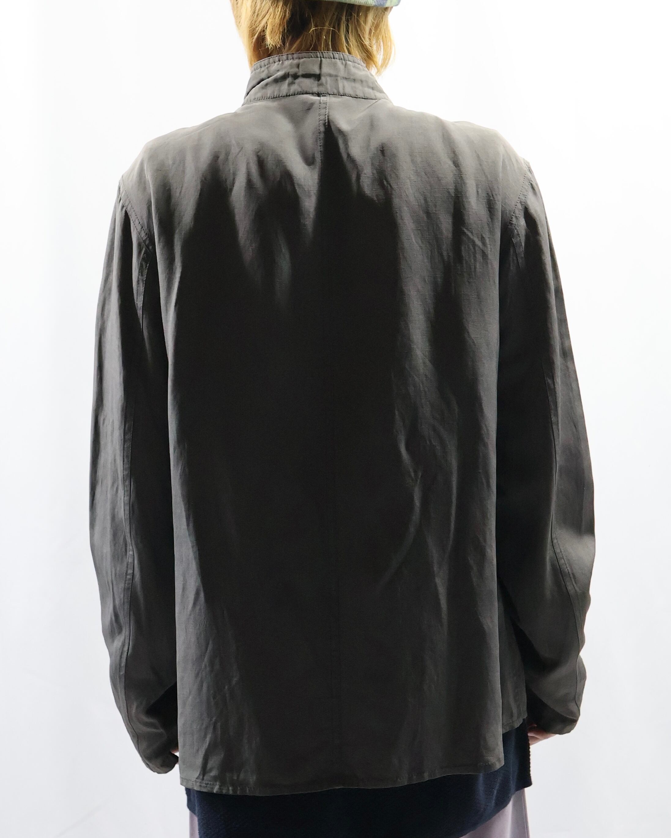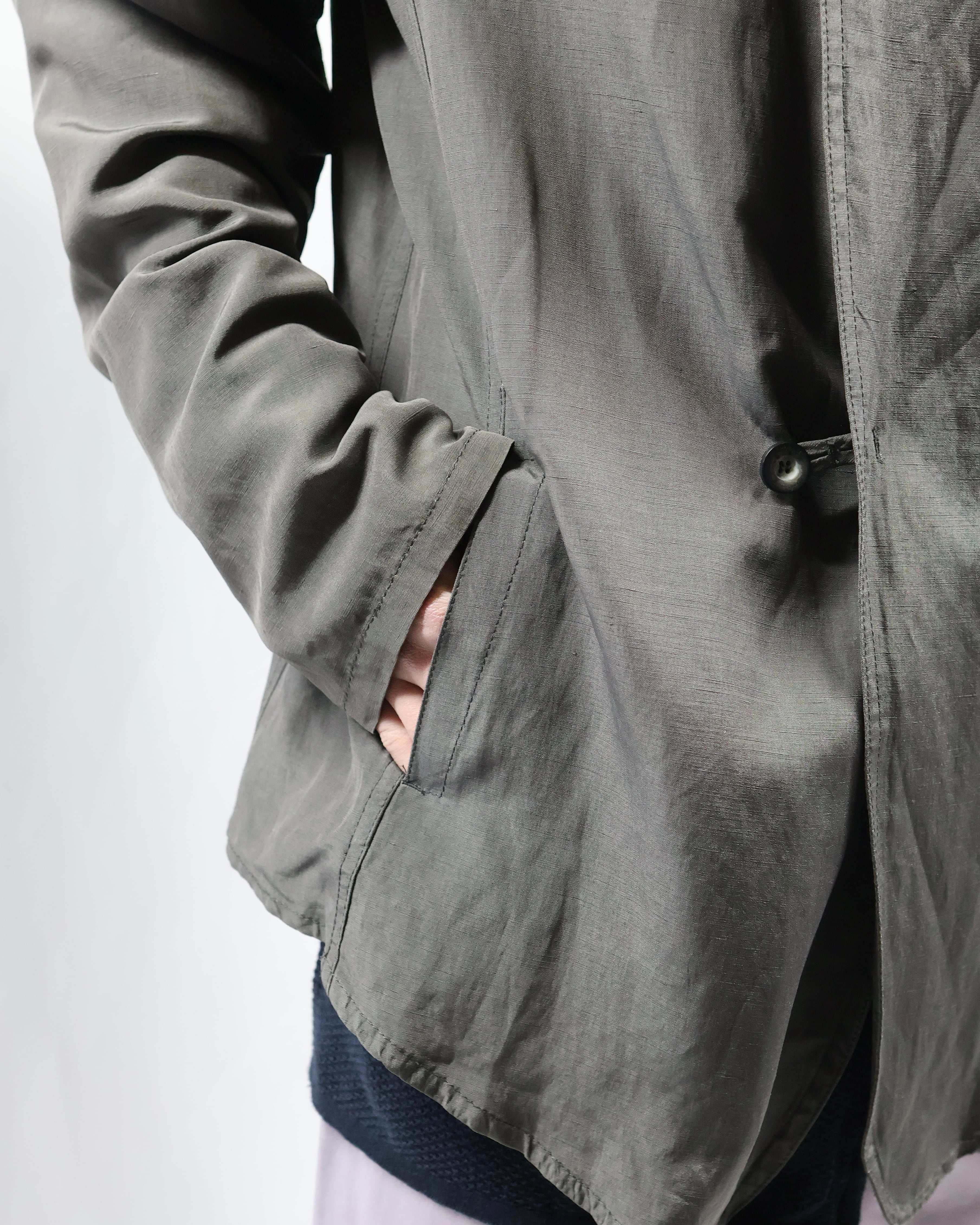 シルクとリネンを使用した、ドレープ感のあるライトジャケット。シルクの光沢感が上品で、一枚できるのはもちろん、インナーにしても存在感があります。色もよく、ダークトーンの差し色として使用すると、玄人感のあるファッションを楽しんでいただけます。