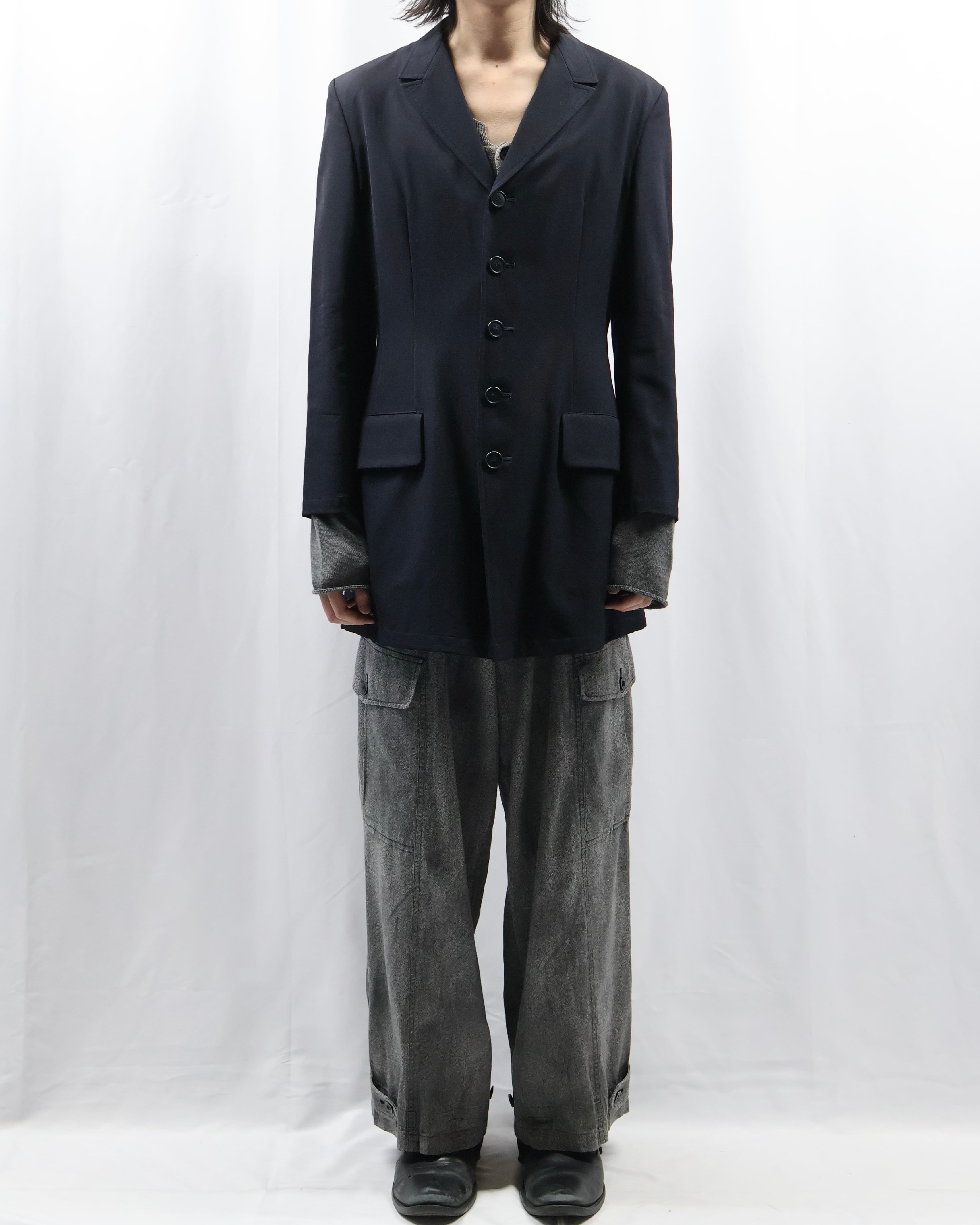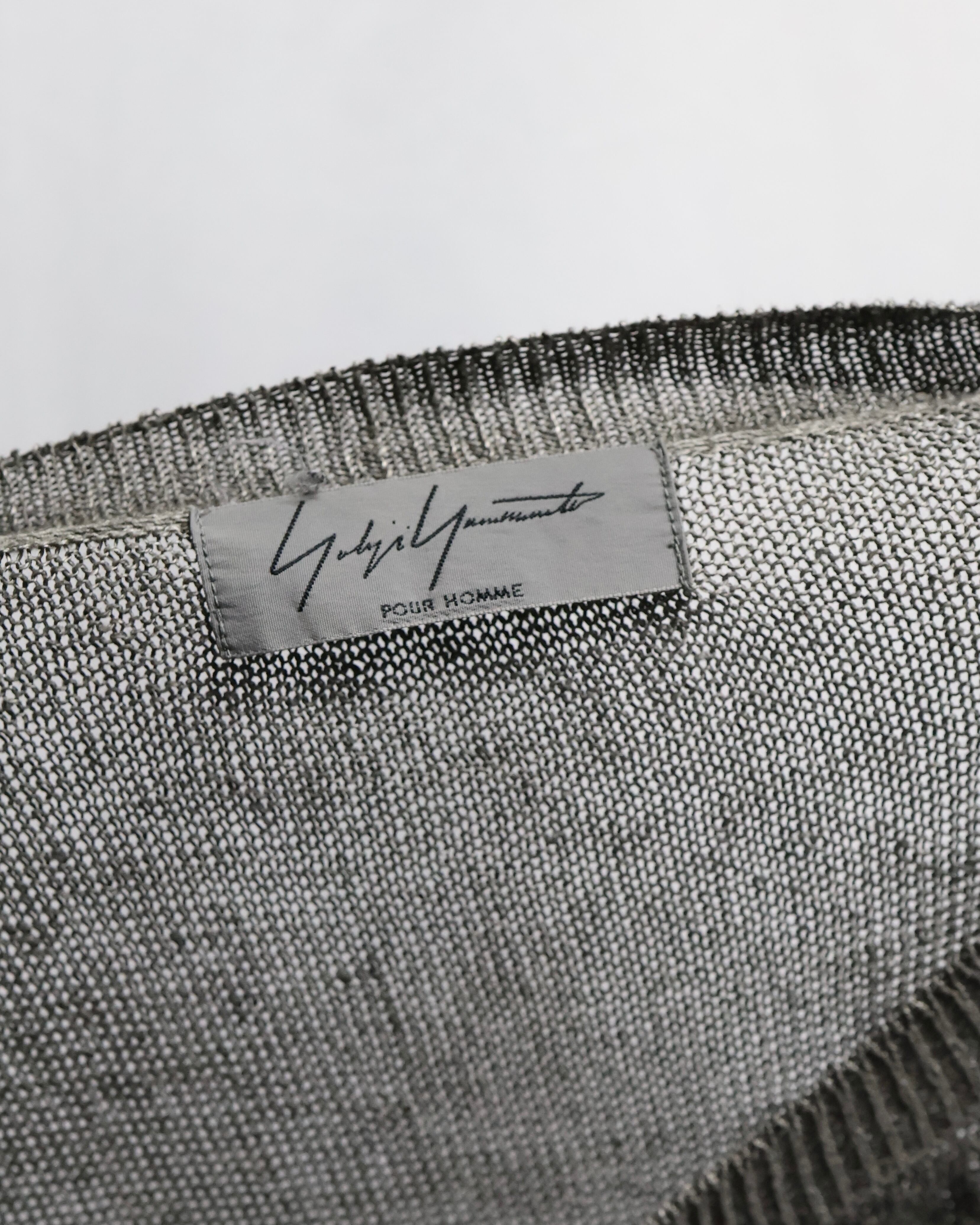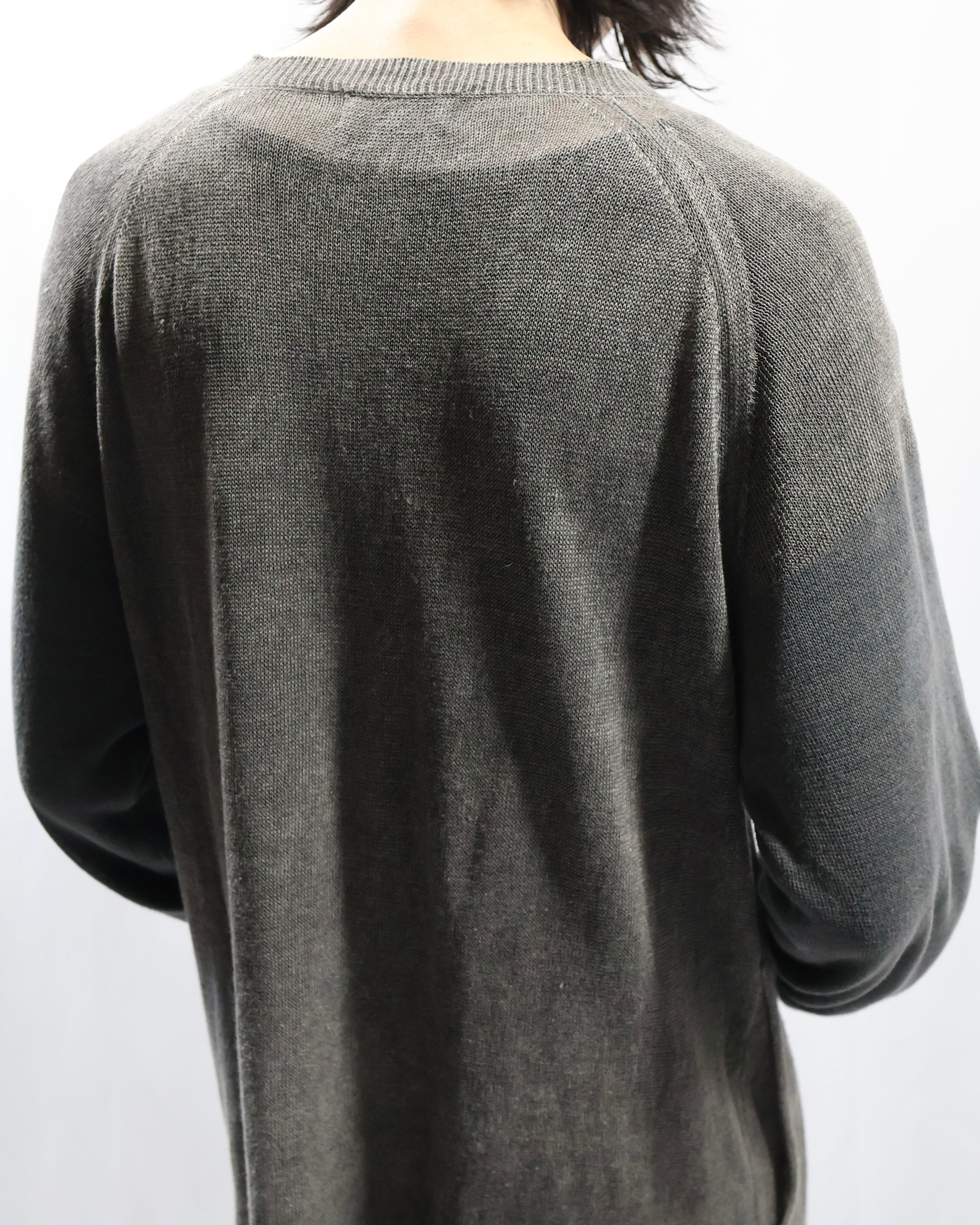 色合いとサイズ感がヨウジらしいミドル丈のカーディガン。the yohji といったシルエットのカーディガンでしなやかな素材で落ち感やドレープ感が素晴らしく、シンプルに一枚インナーとして用いるだけで、コーディネートの格上げをしてくれるようなアイテムです。ラグランスリーブになっており、適度な緩さを併せ持ち、ダークな装いに抜け感をプラスしてくれます。