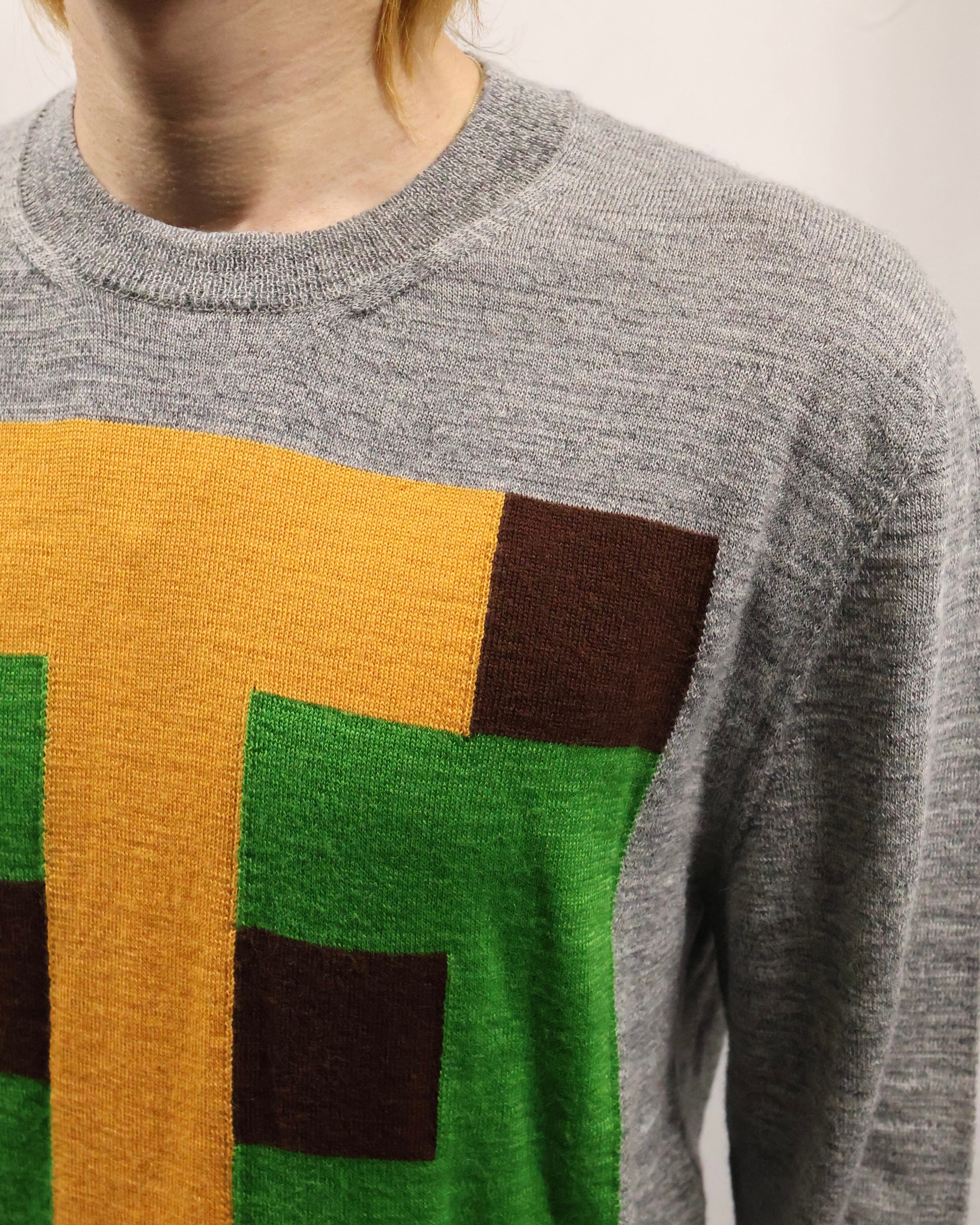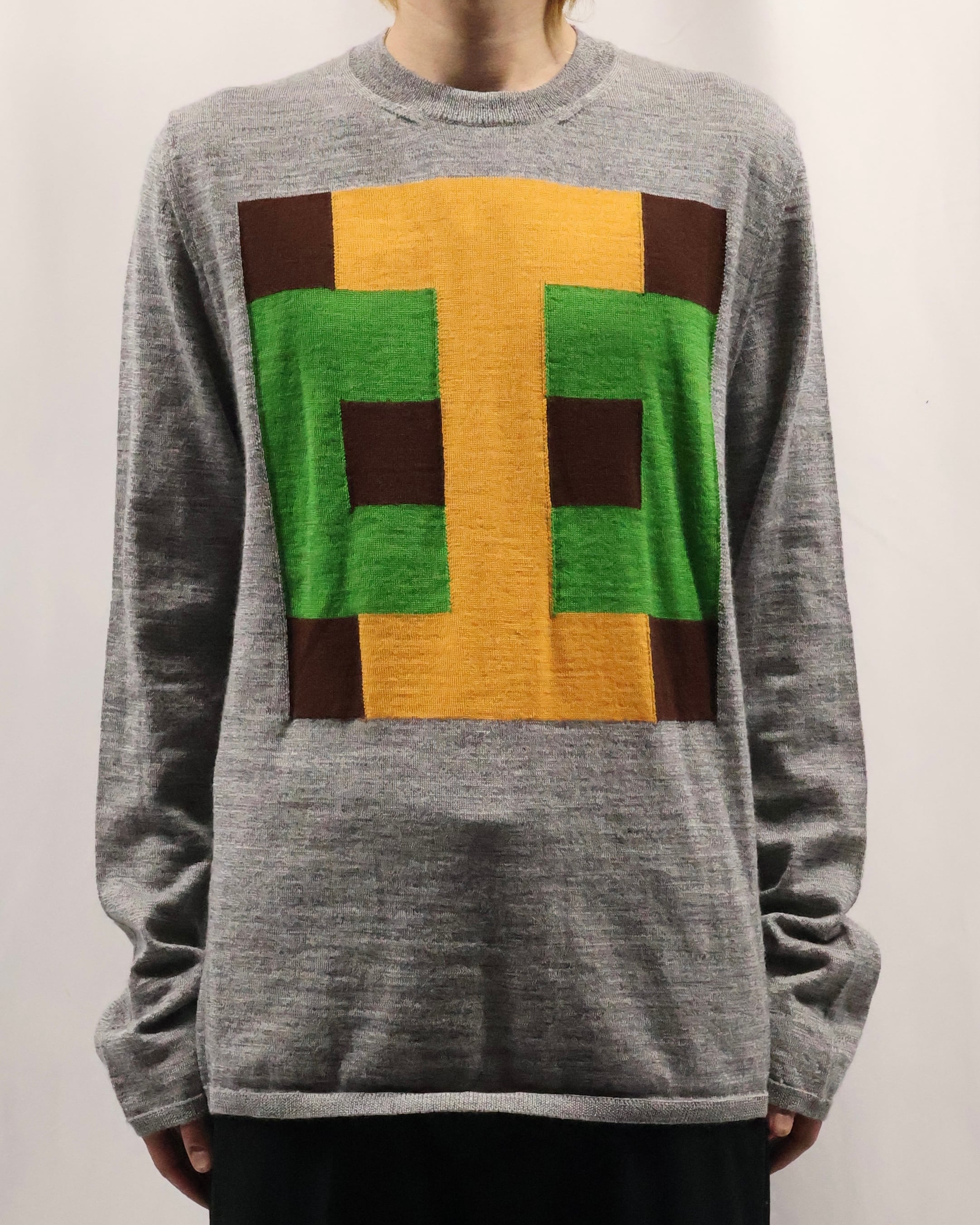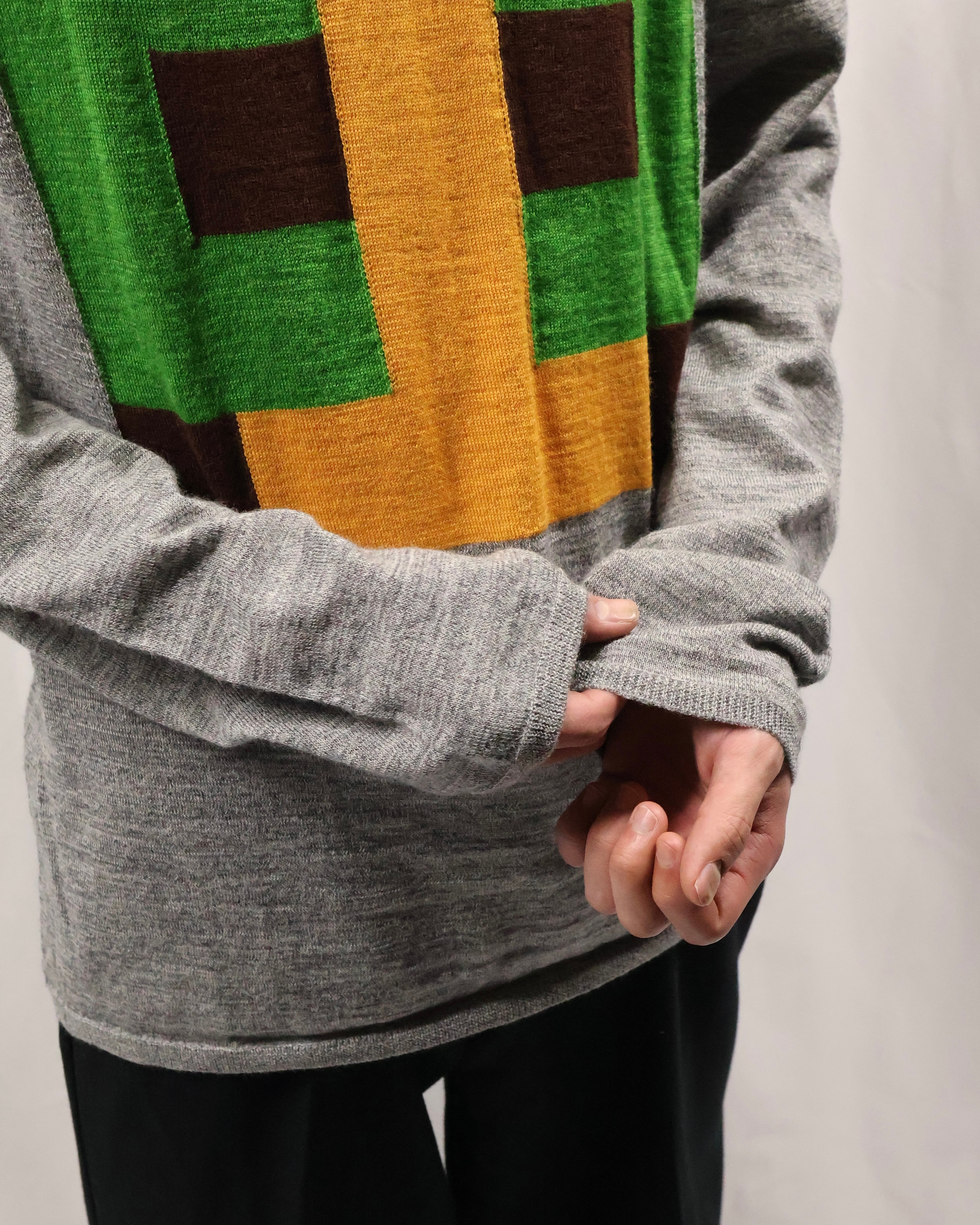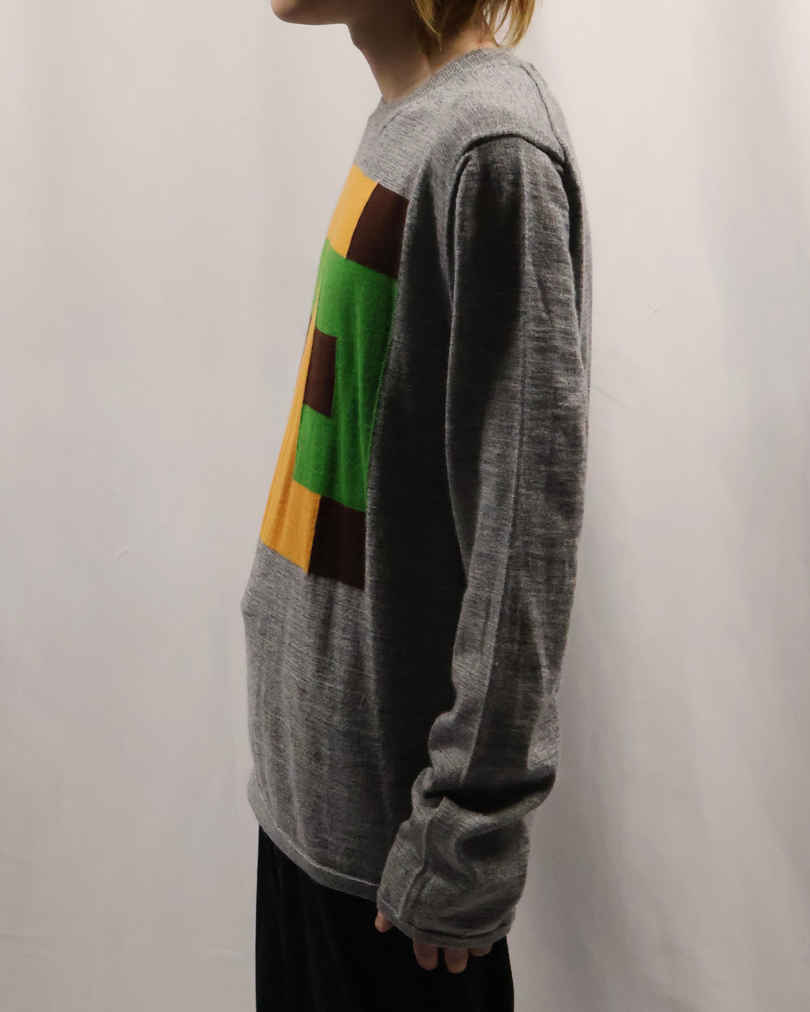 幾何学的なデザインが特徴的な、薄地のニット。グレーに暖色のカラーリングがgoodで冬の装いに暖かみとカジュアルさをプラスしてくれます。薄地の為、落ち感も良く、インナーとして大活躍の一枚です。