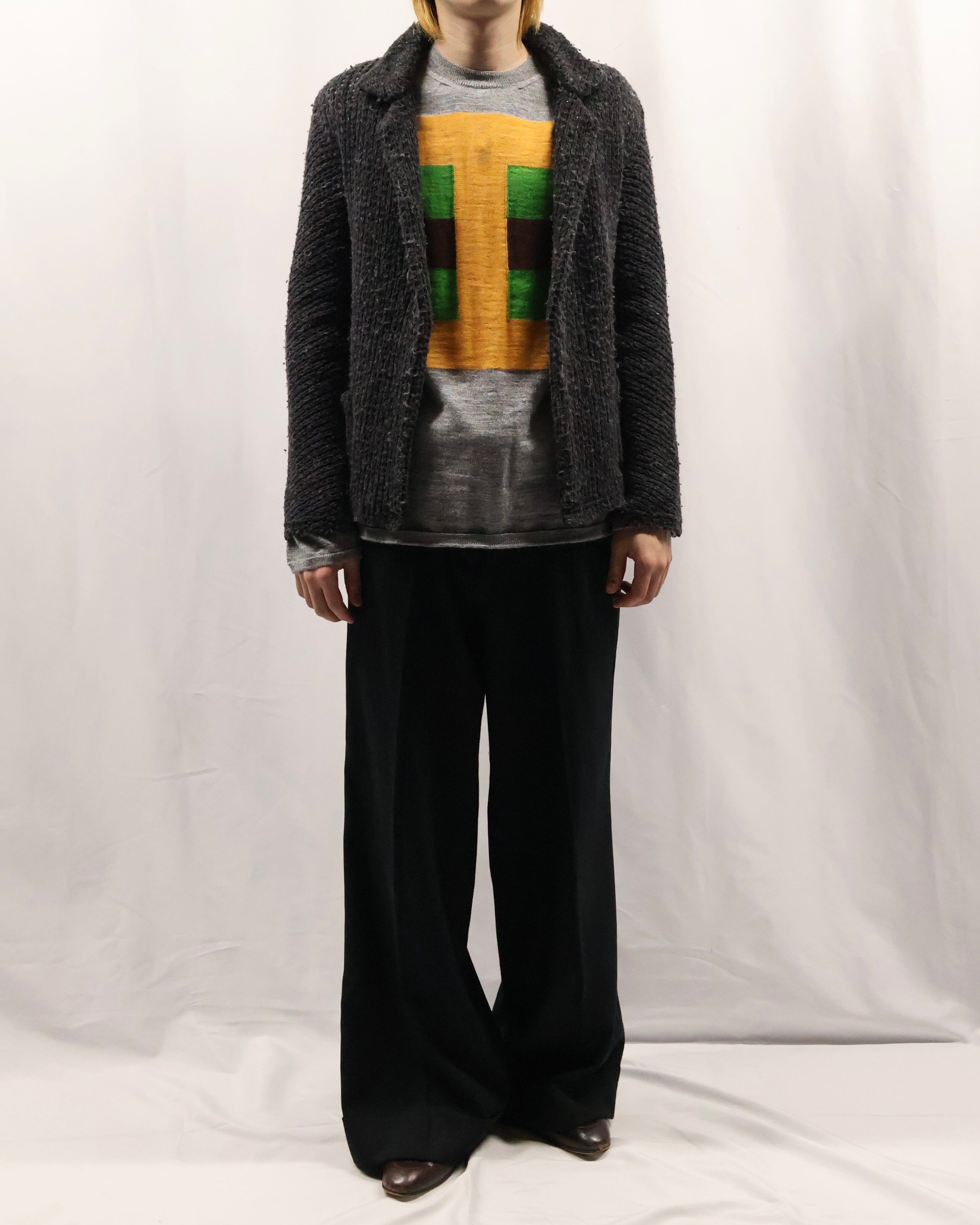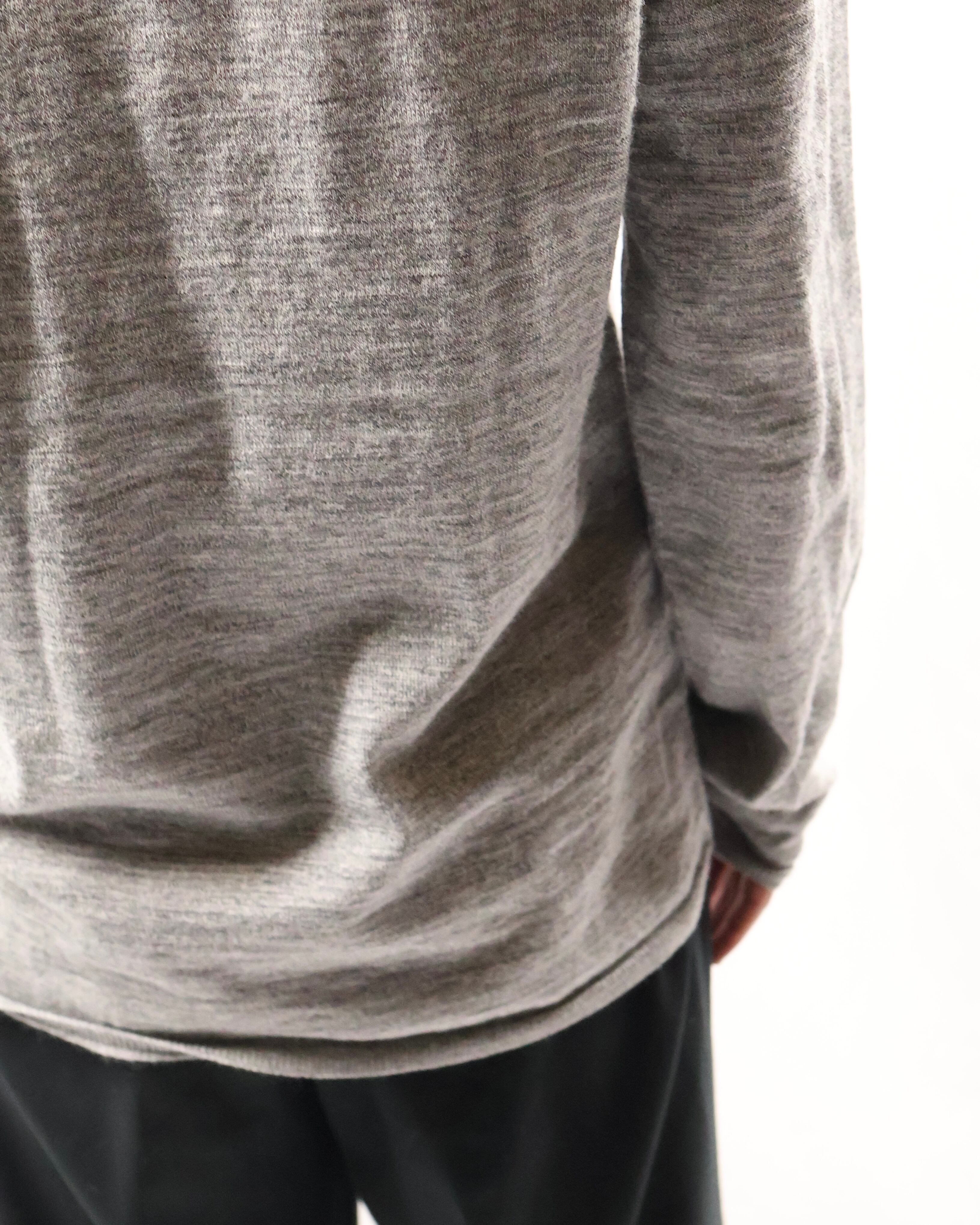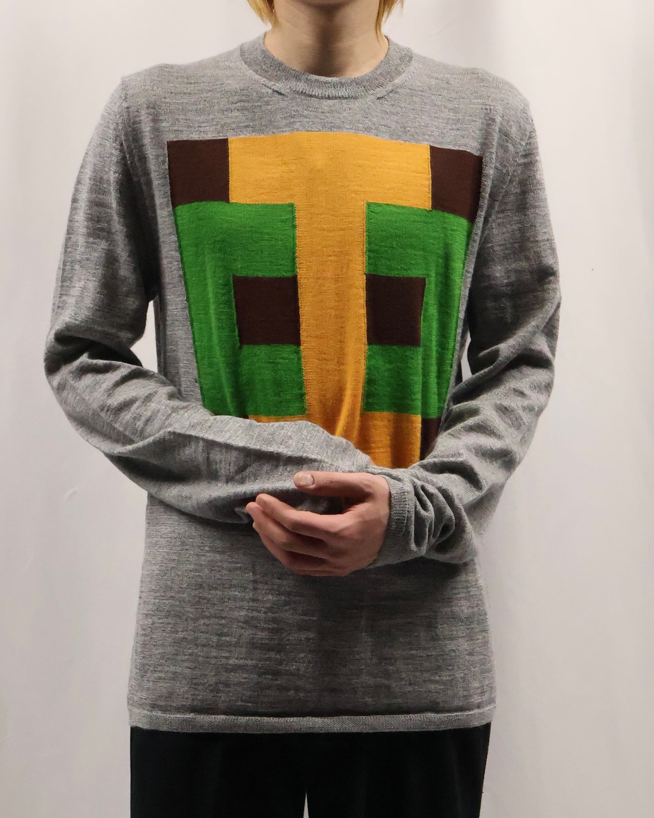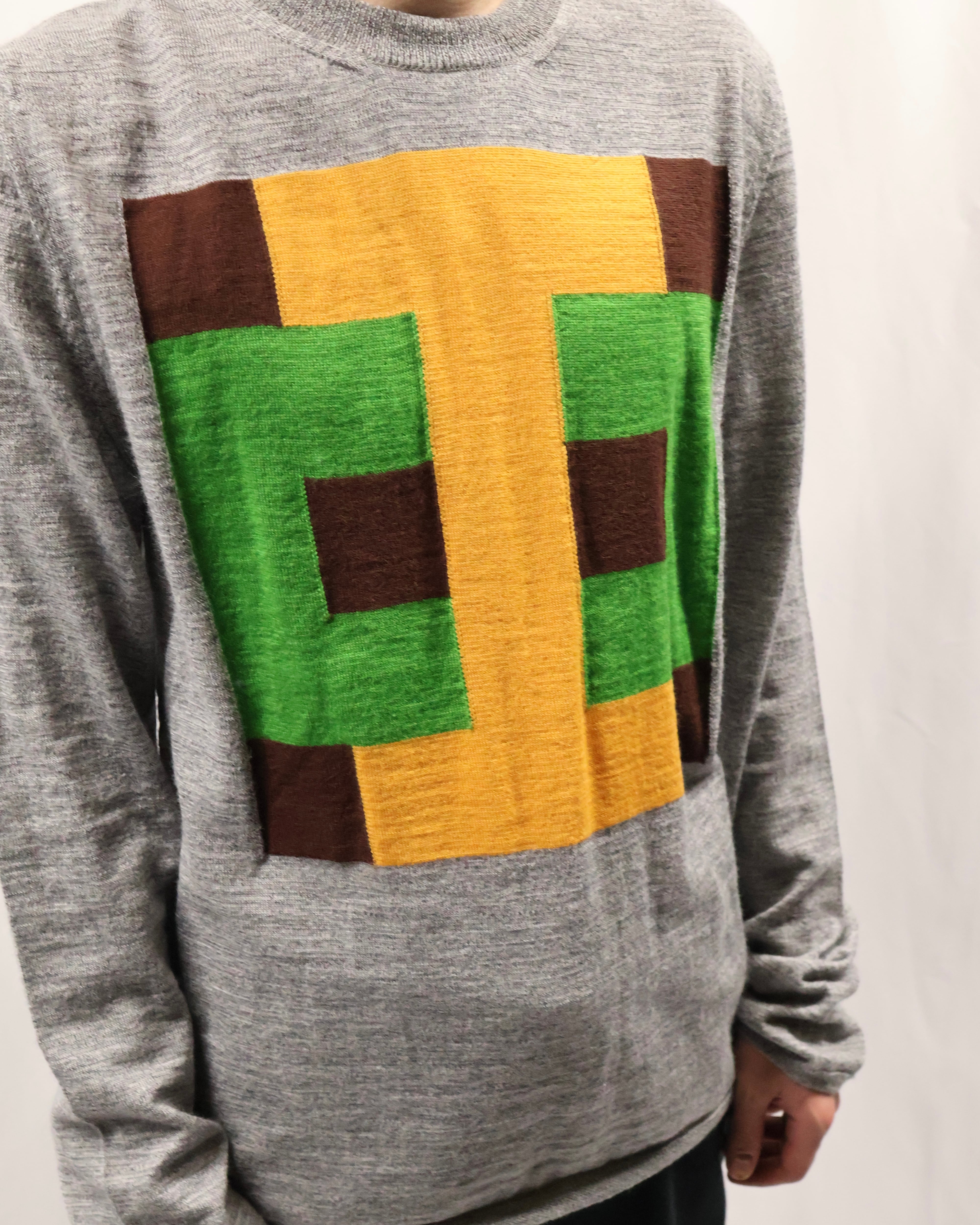 幾何学的なデザインが特徴的な、薄地のニット。グレーに暖色のカラーリングがgoodで冬の装いに暖かみとカジュアルさをプラスしてくれます。薄地の為、落ち感も良く、インナーとして大活躍の一枚です。