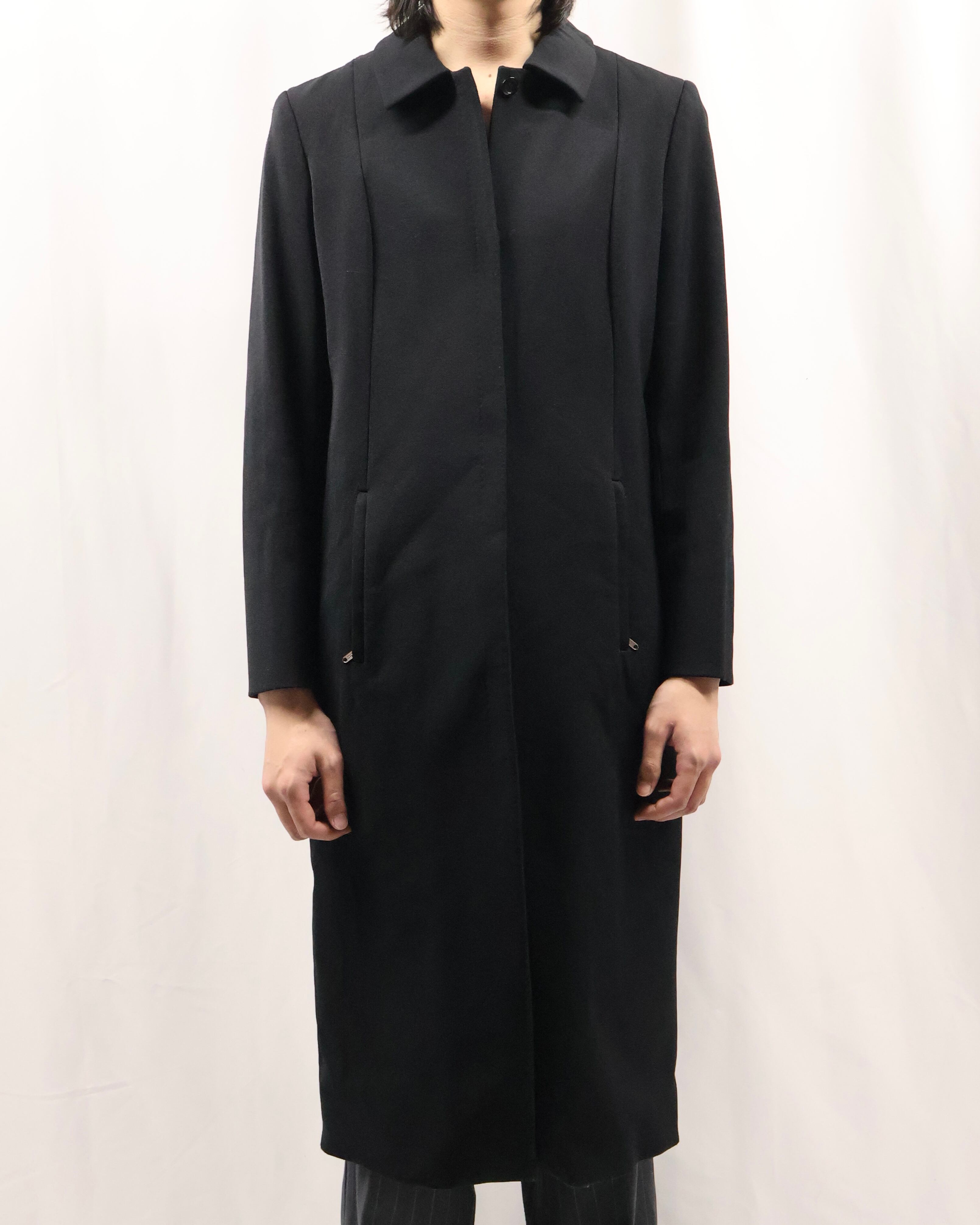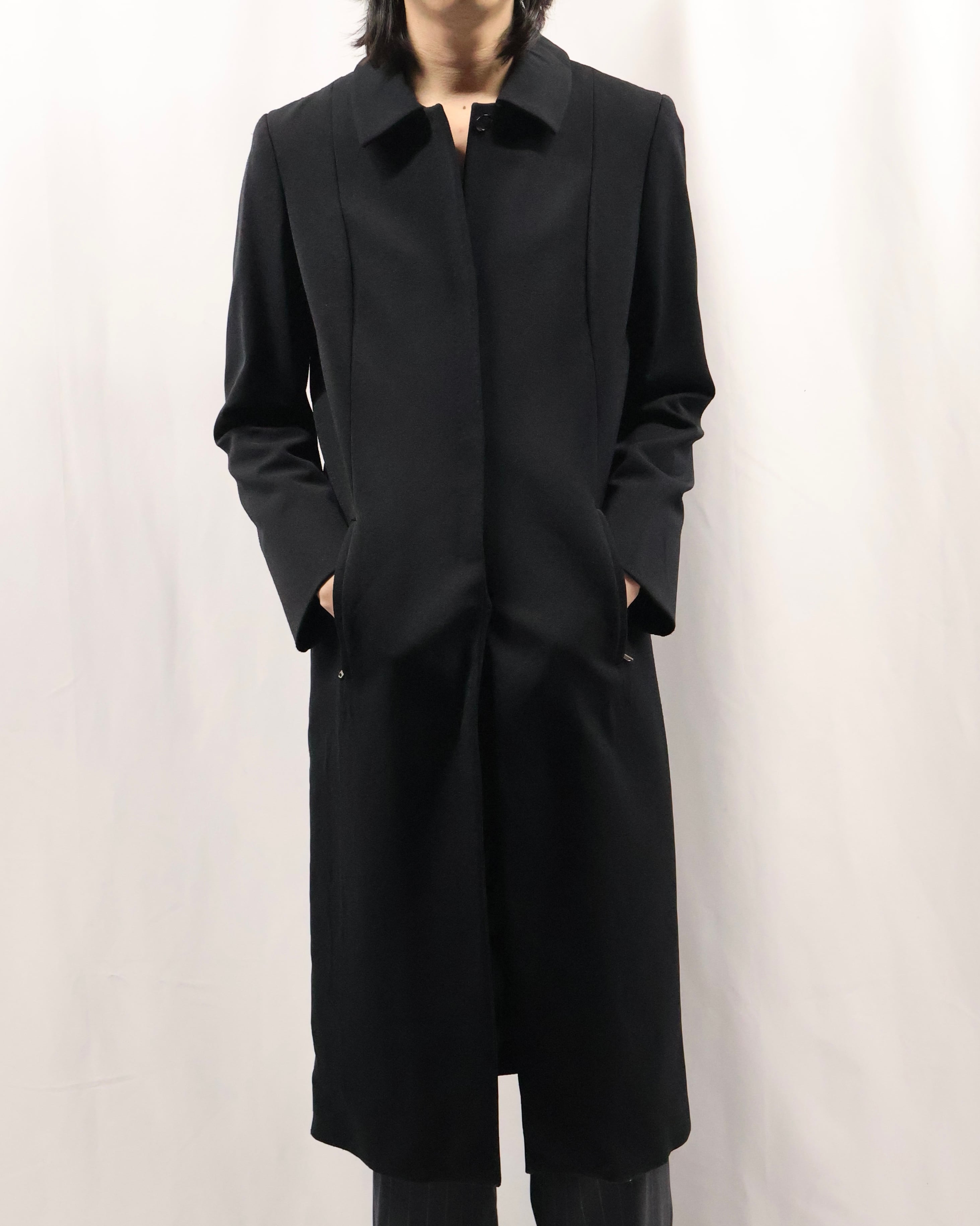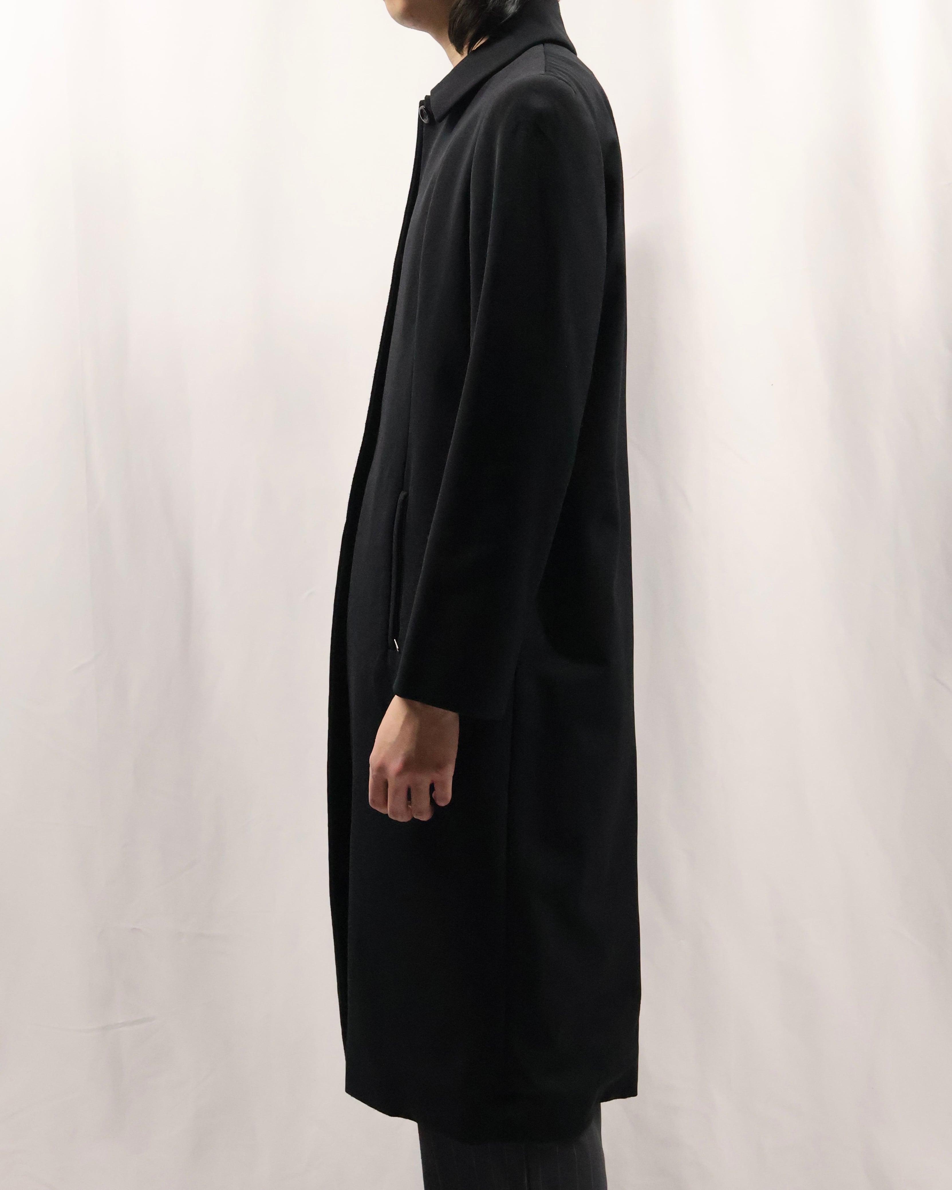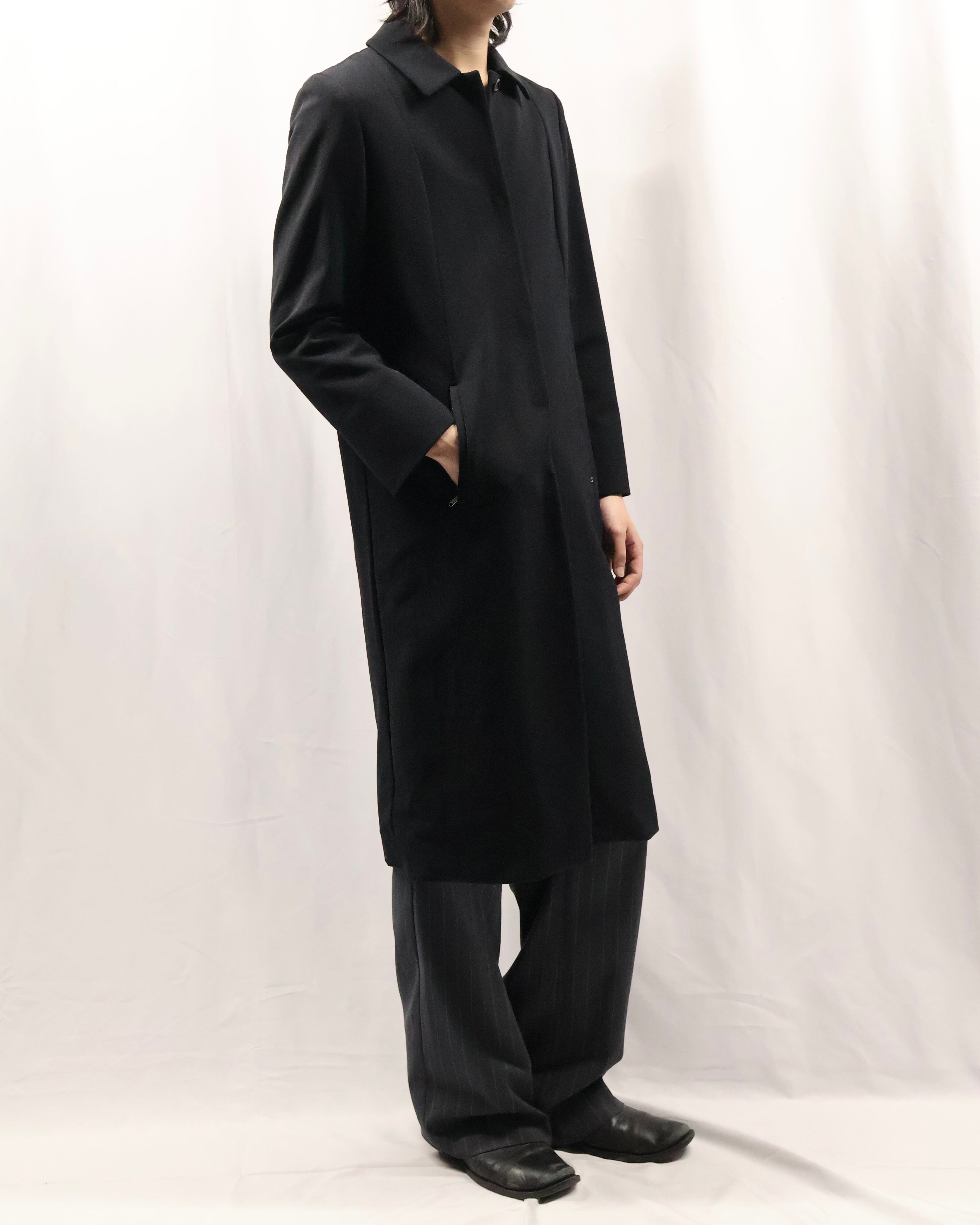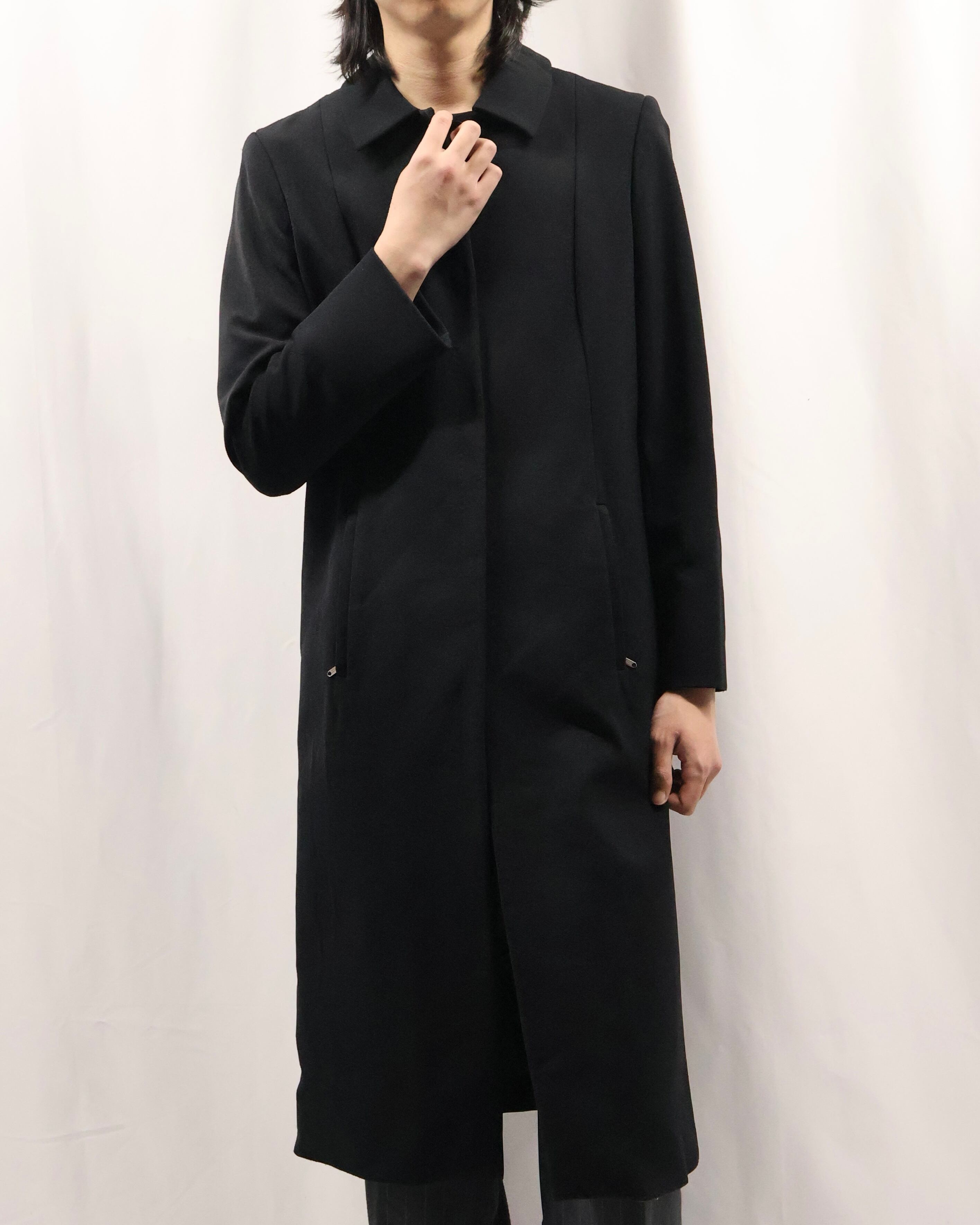 色味とシルエットがシャープなロングコート。こちらのコートの特徴はなんといってもシルエット。シェイプがしっかりと効いており、一枚の存在感は抜群です。タイトな為、ロングシャツライクな運用もgood。コートの可能性を広げてくれるアイテムです。汎用性の高いアイテムをお探しの方におすすめです。