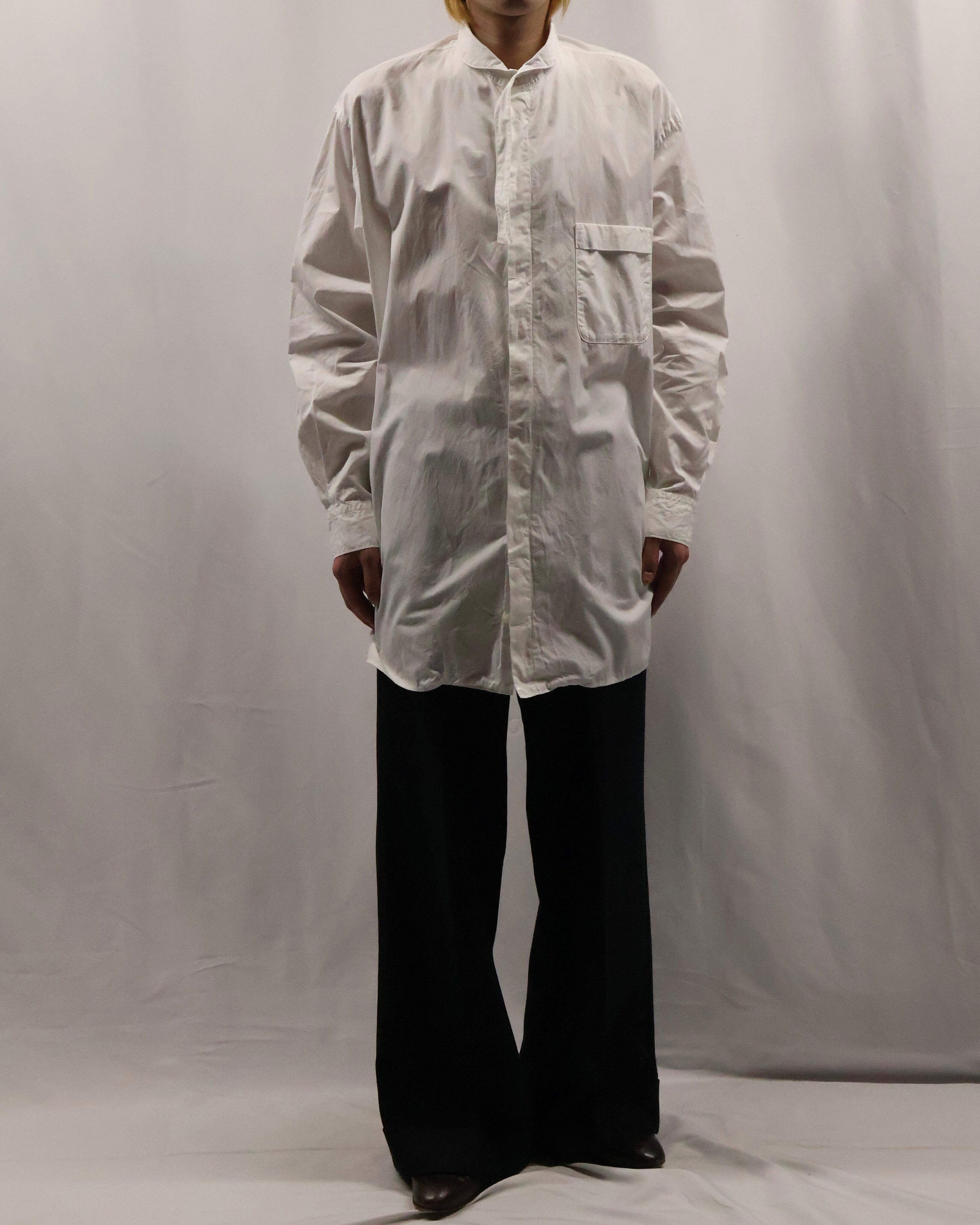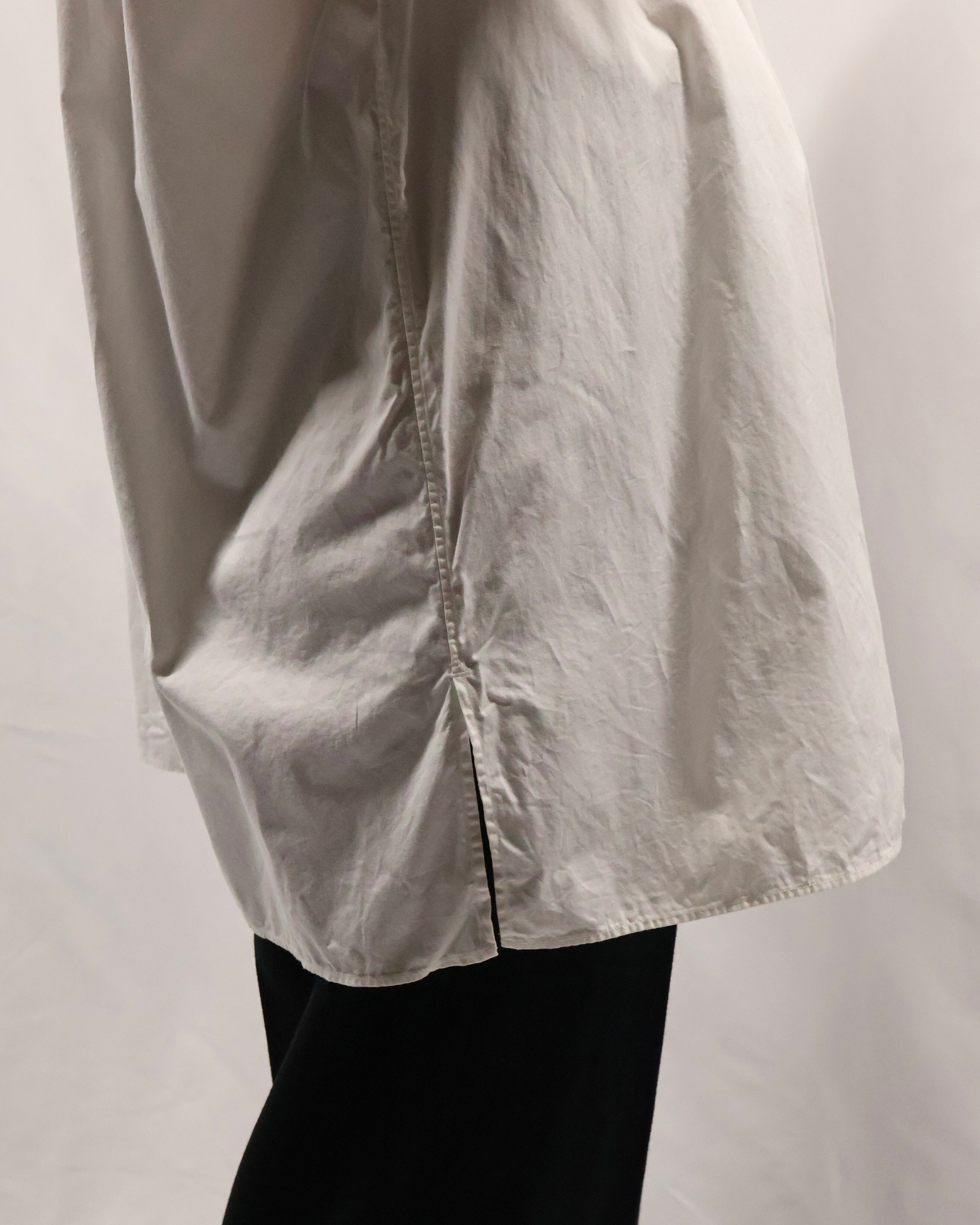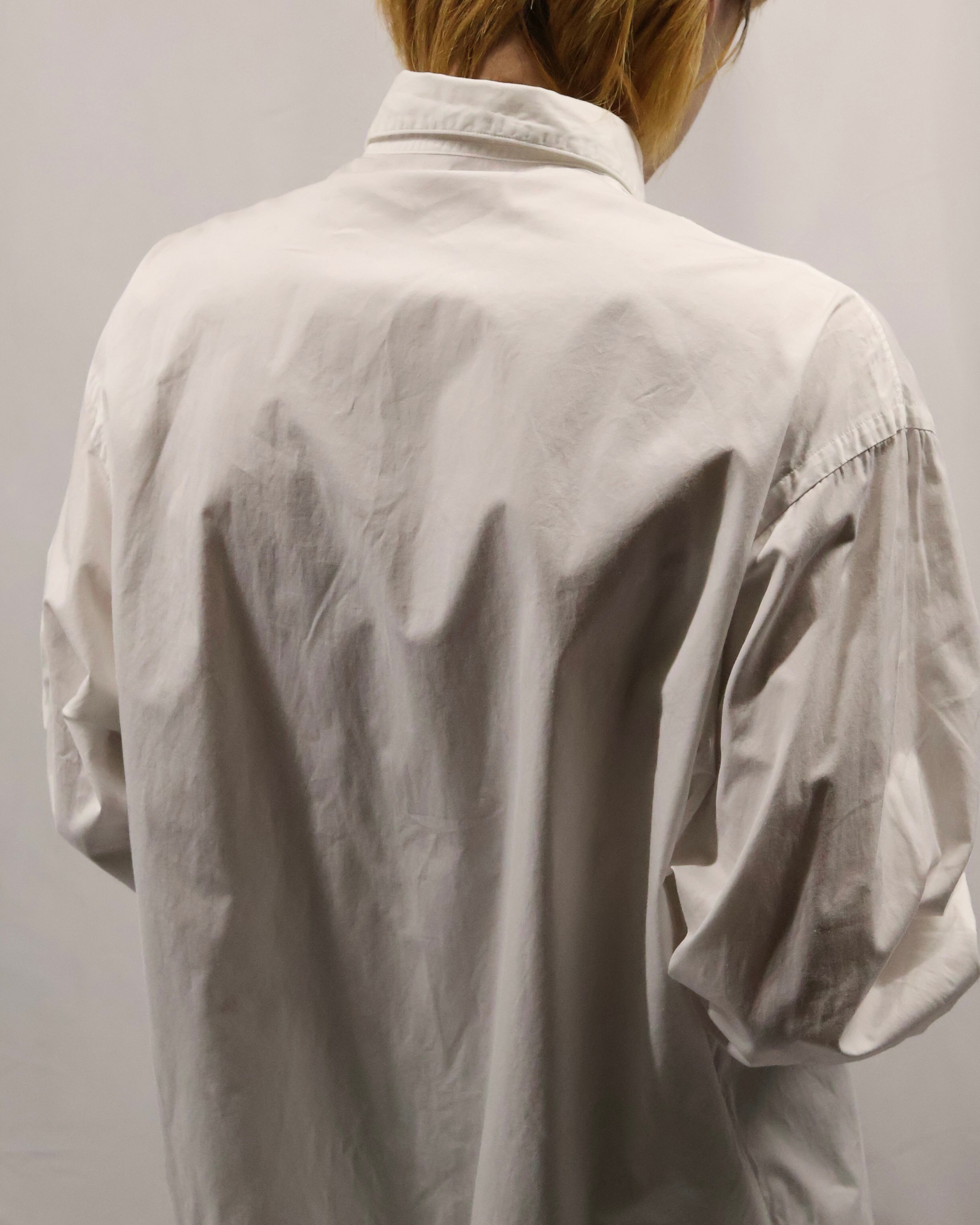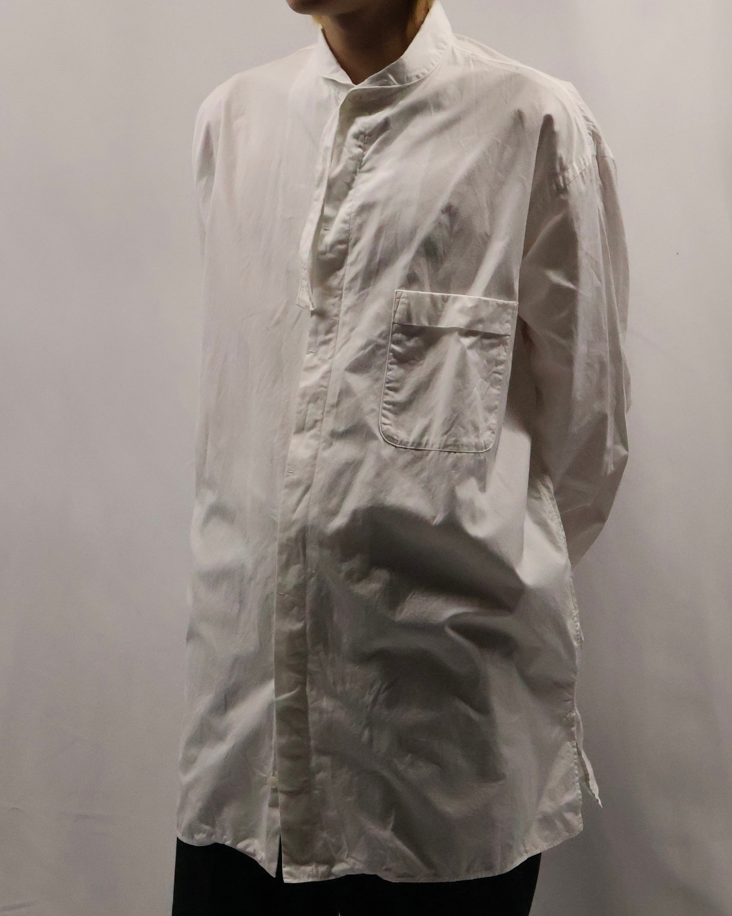 襟元のデザインが特徴的な綺麗なシルエットのシャツ。着丈に対してミニマルな作りの襟が綺麗さと抜け感を両立させています。様々なテイストに合わせていただけるシャツで、一枚でコーディネートの幅、クオリティがかなりグレードアップします。