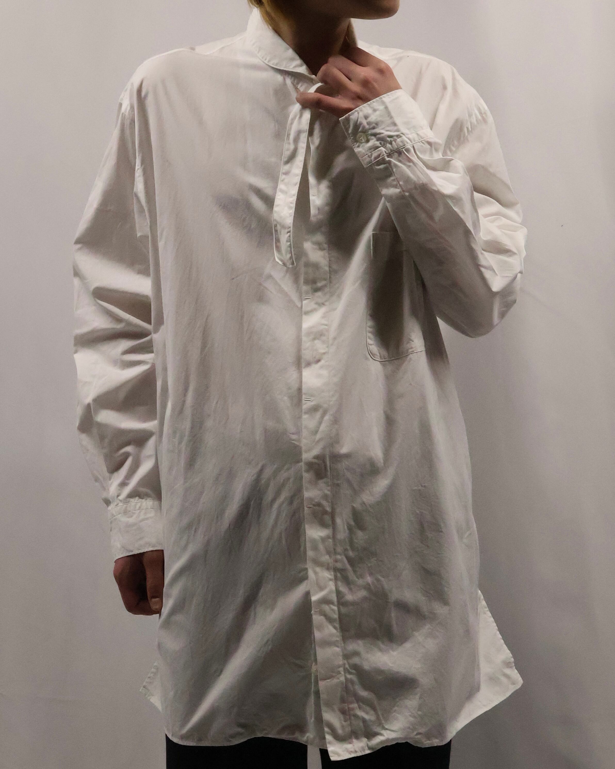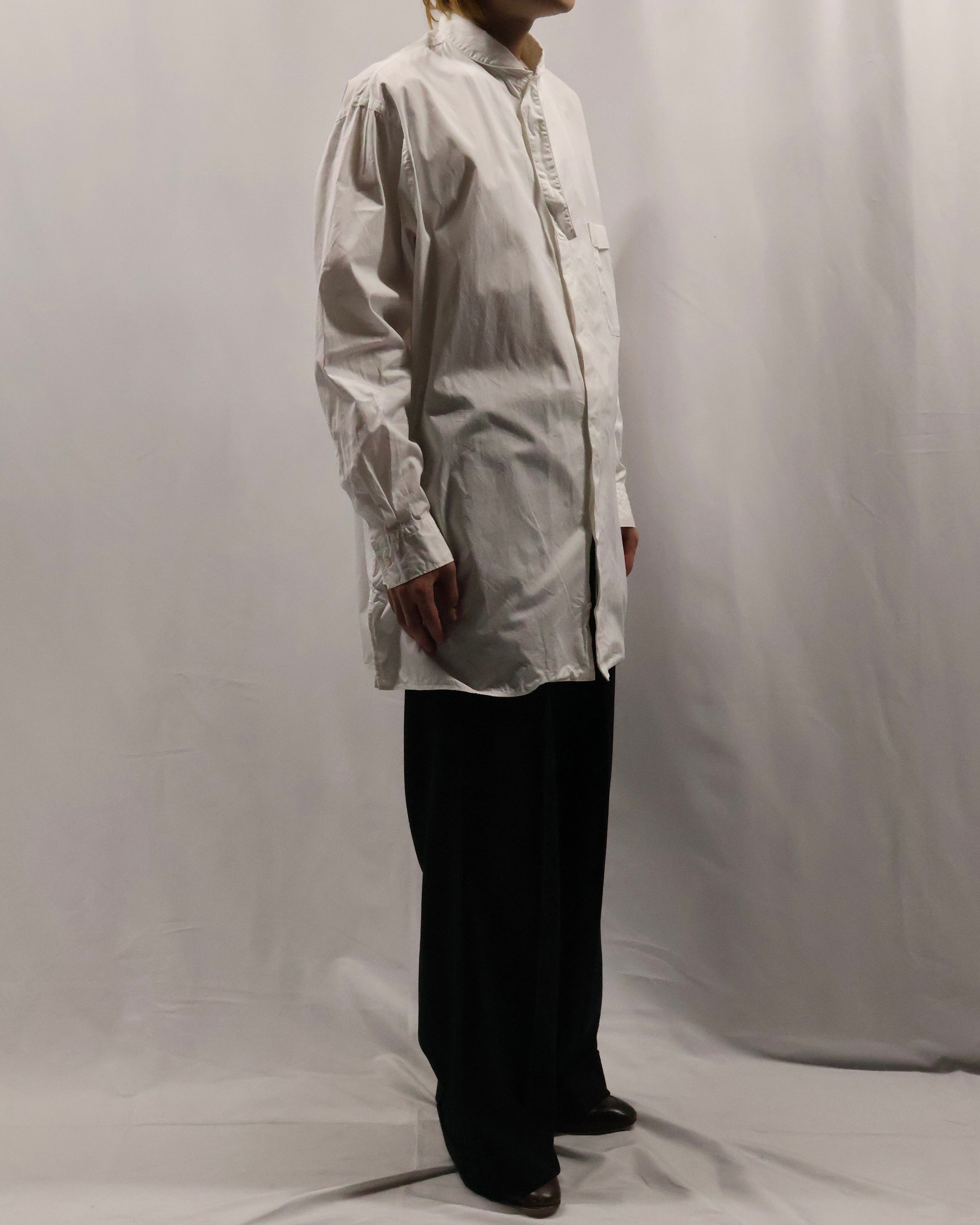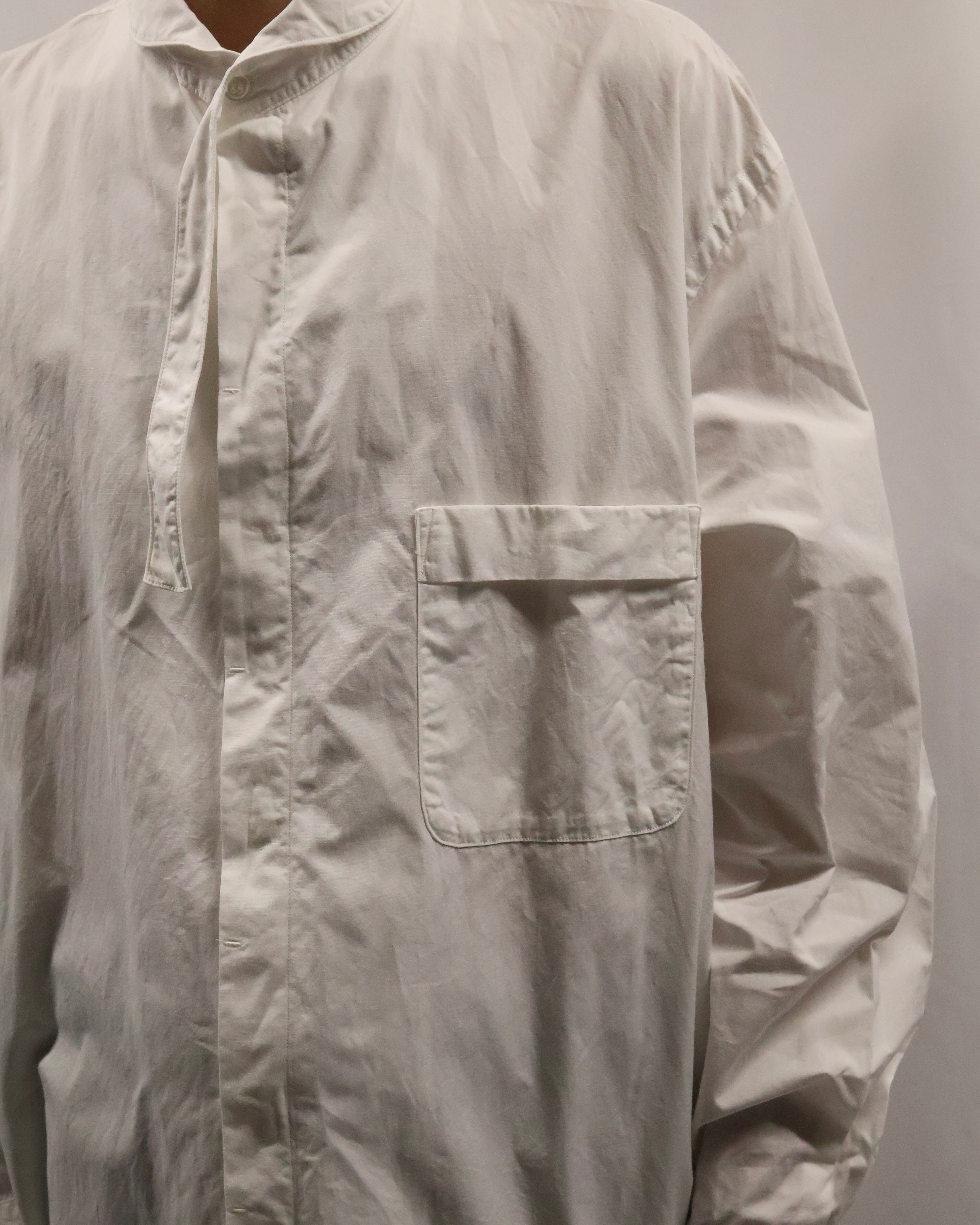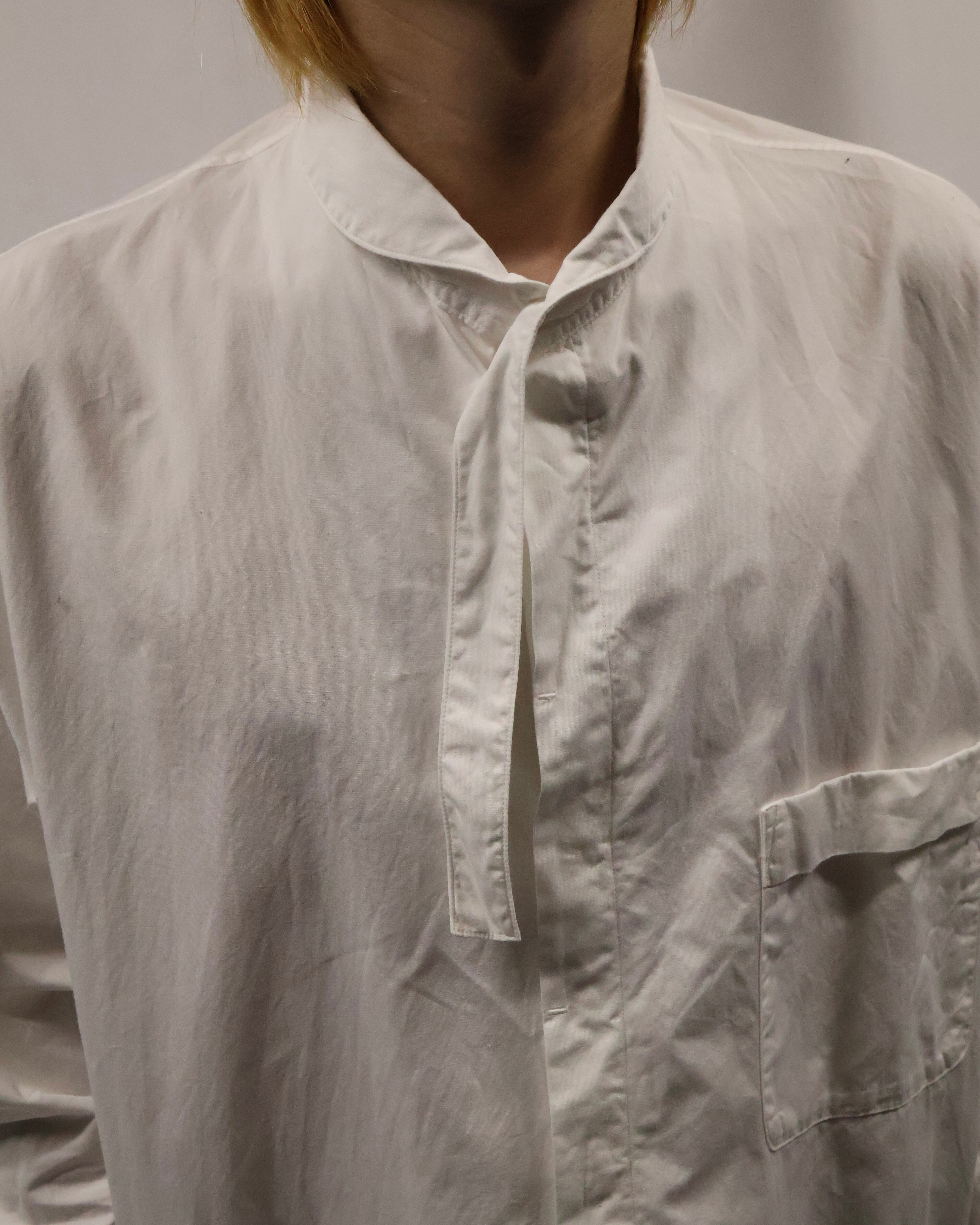 襟元のデザインが特徴的な綺麗なシルエットのシャツ。着丈に対してミニマルな作りの襟が綺麗さと抜け感を両立させています。様々なテイストに合わせていただけるシャツで、一枚でコーディネートの幅、クオリティがかなりグレードアップします。
