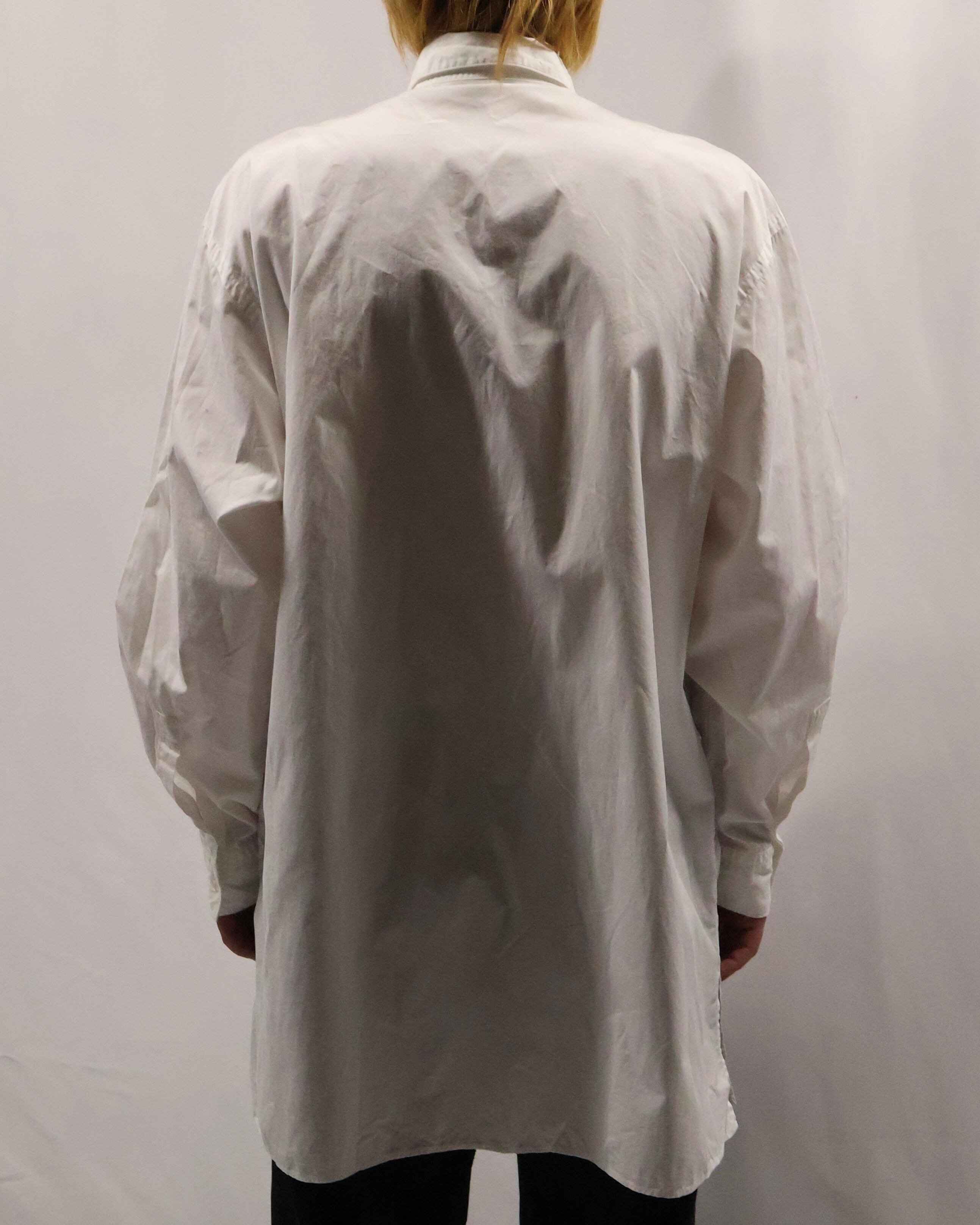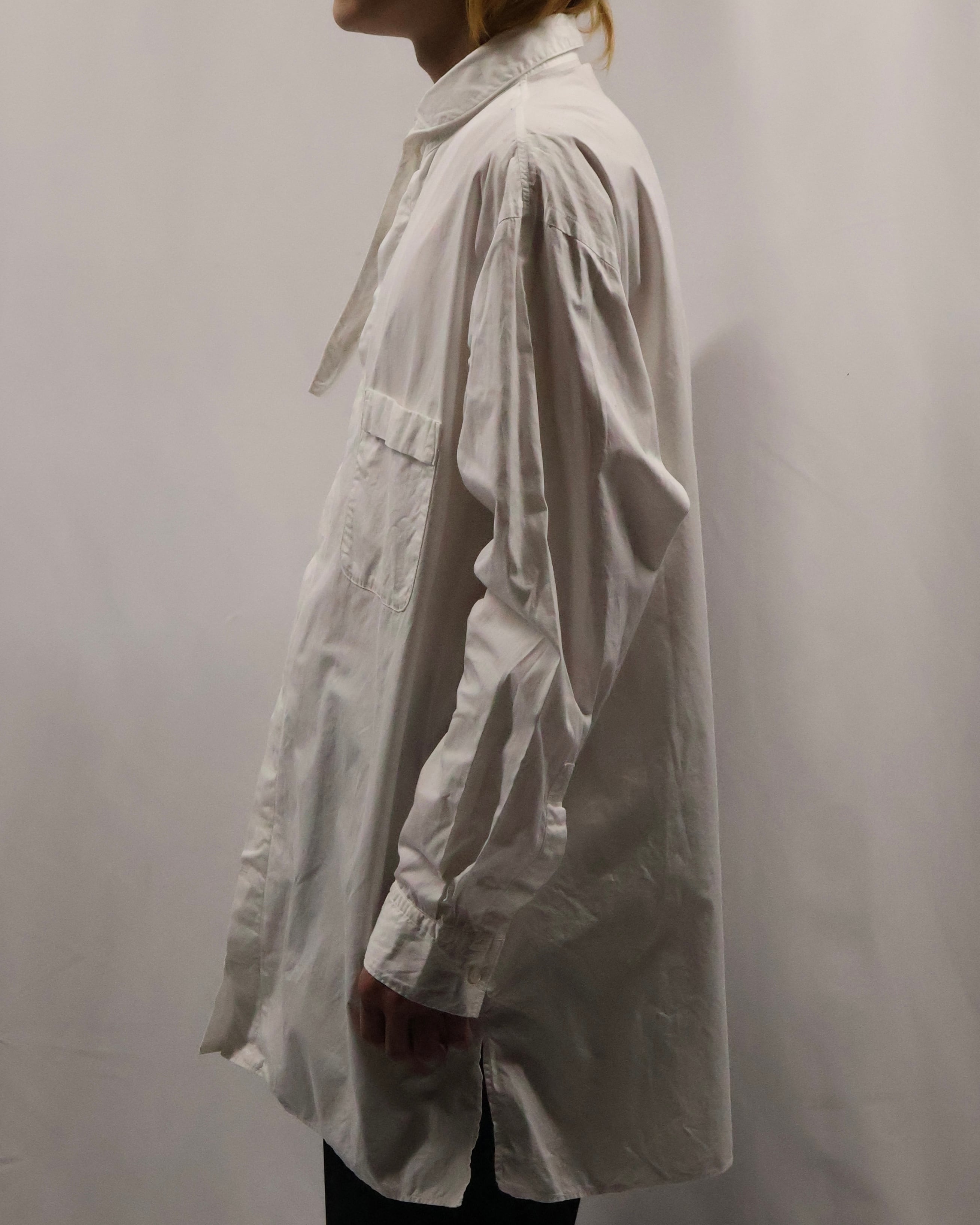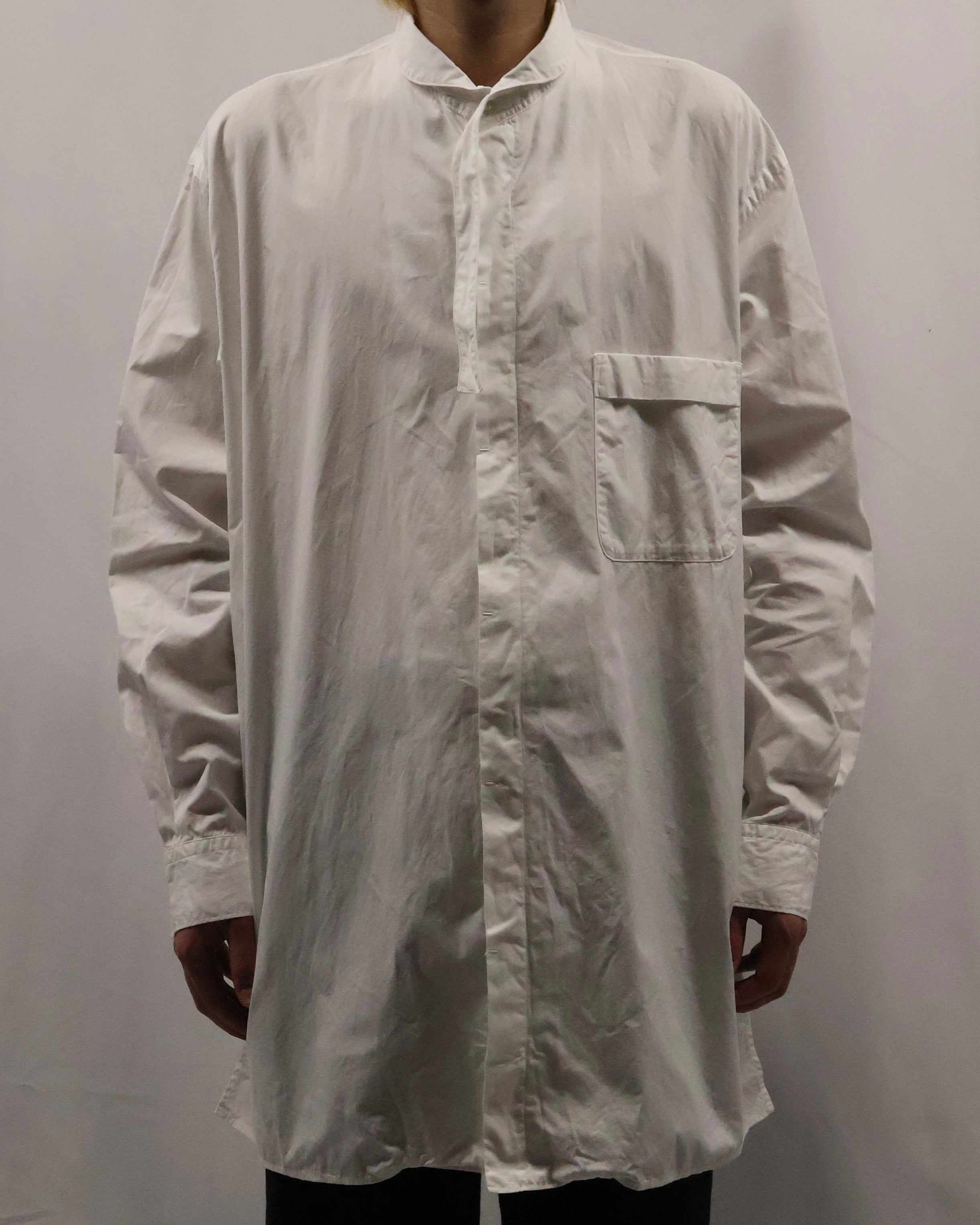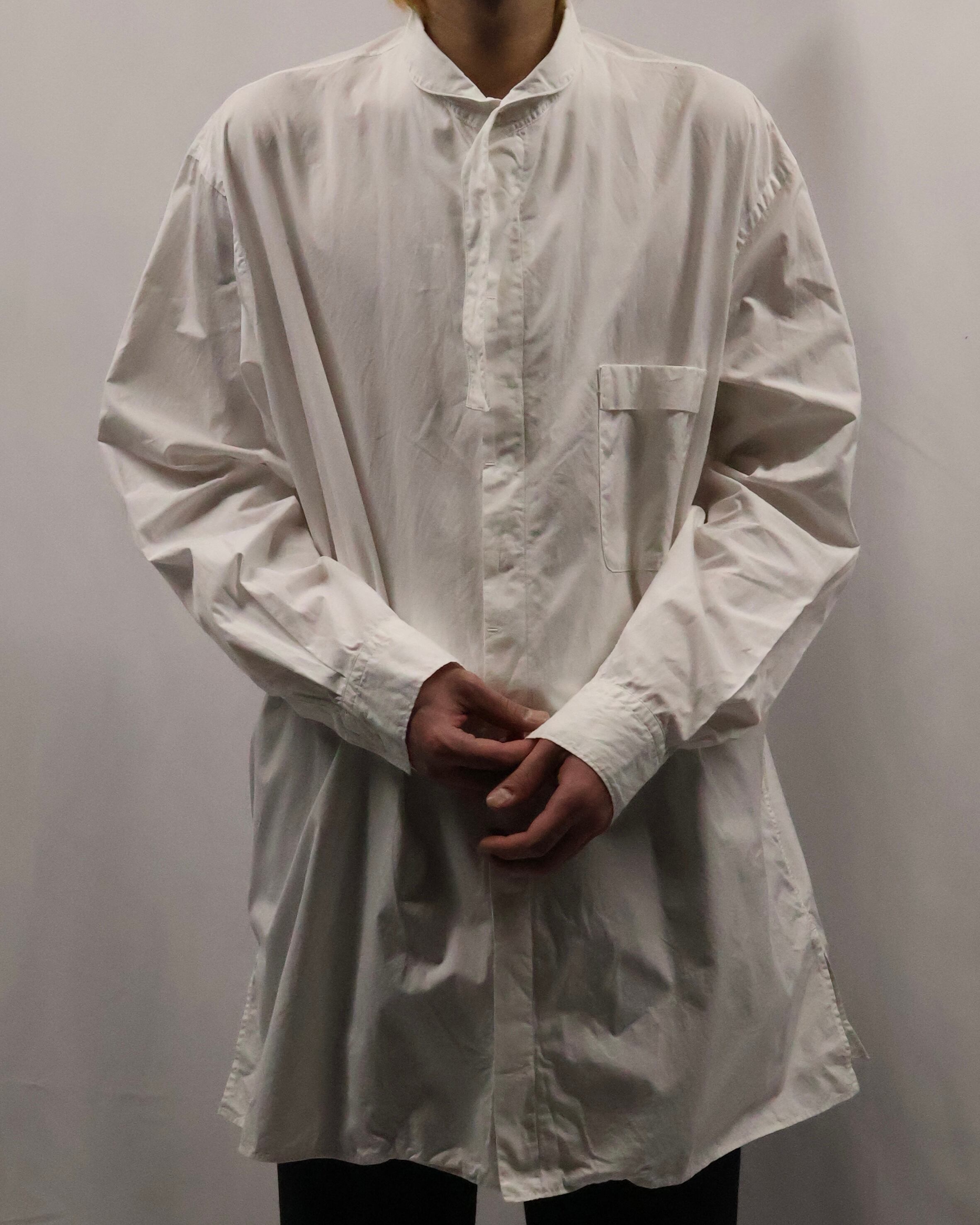 襟元のデザインが特徴的な綺麗なシルエットのシャツ。着丈に対してミニマルな作りの襟が綺麗さと抜け感を両立させています。様々なテイストに合わせていただけるシャツで、一枚でコーディネートの幅、クオリティがかなりグレードアップします。