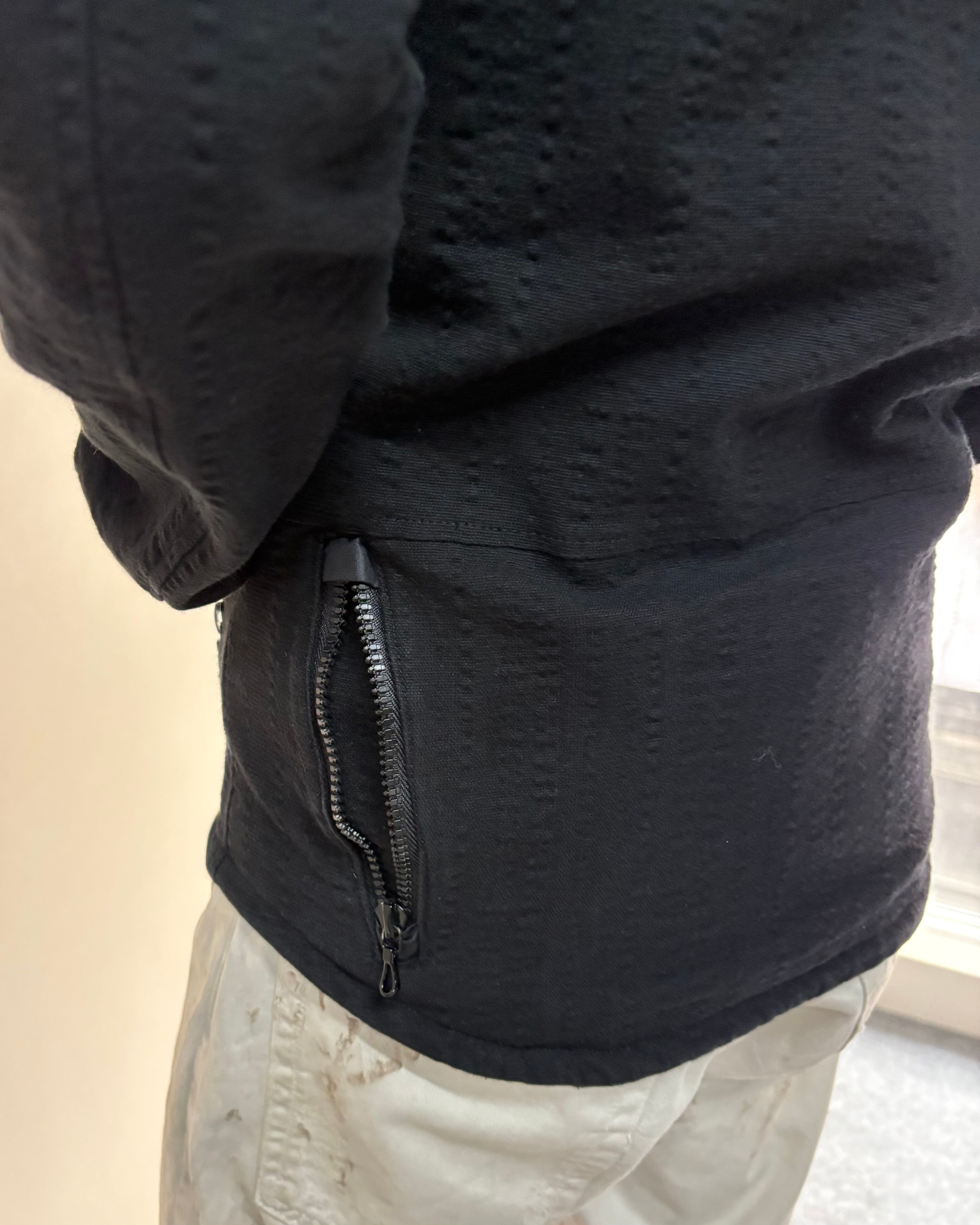 マットな質感と独特の生地感が特徴で、シンプルながらもブランドらしい退廃的でモードな空気感のある一着。