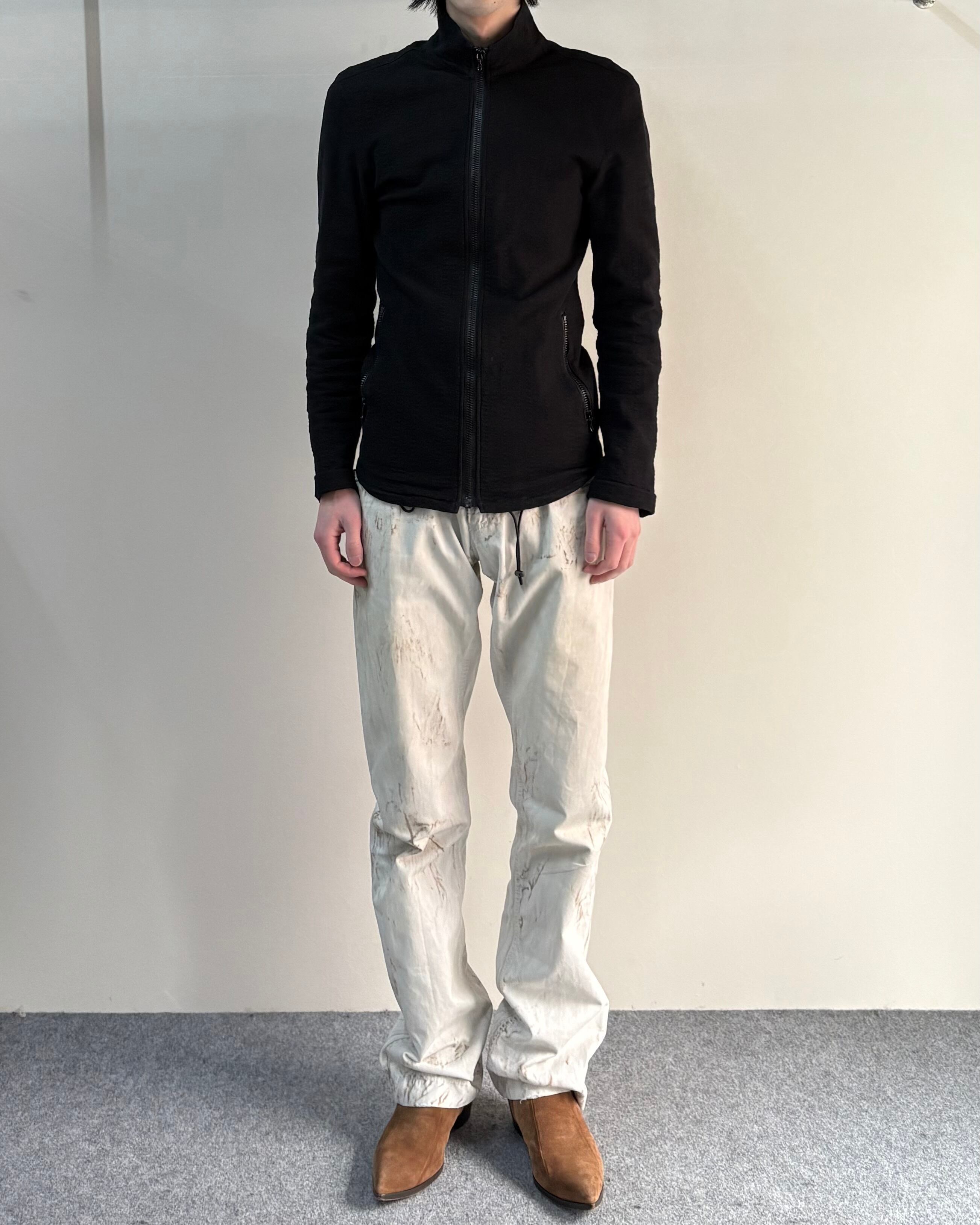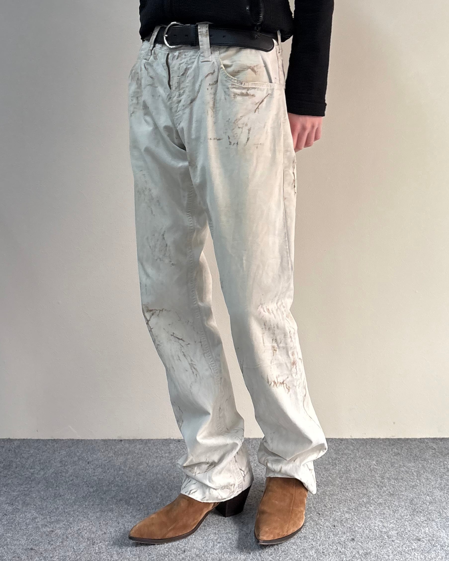 ワークやグランジの要素を感じさせつつも、シルエットはすっきりとしたストレート寄りで、ブランドらしい色気のあるバランスのアイテム。