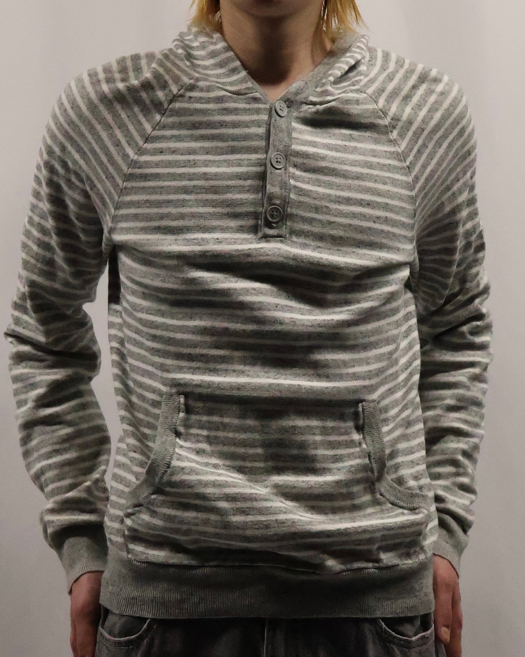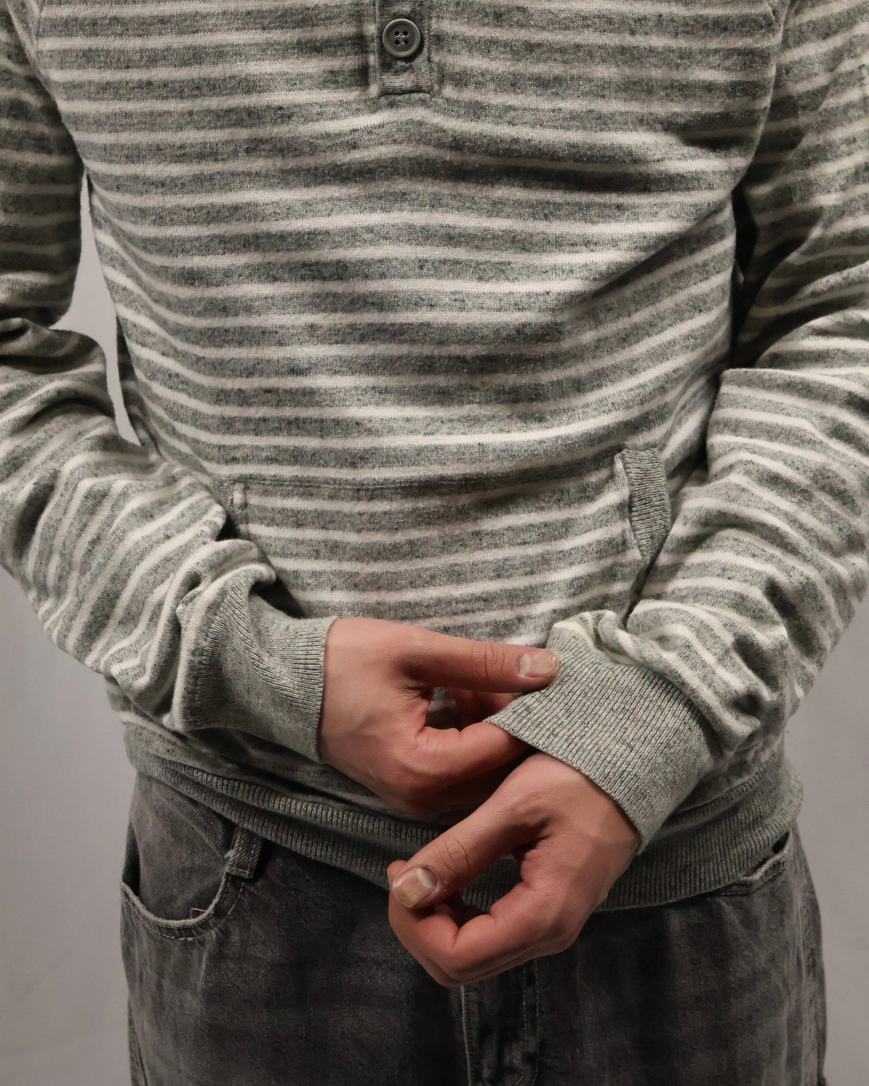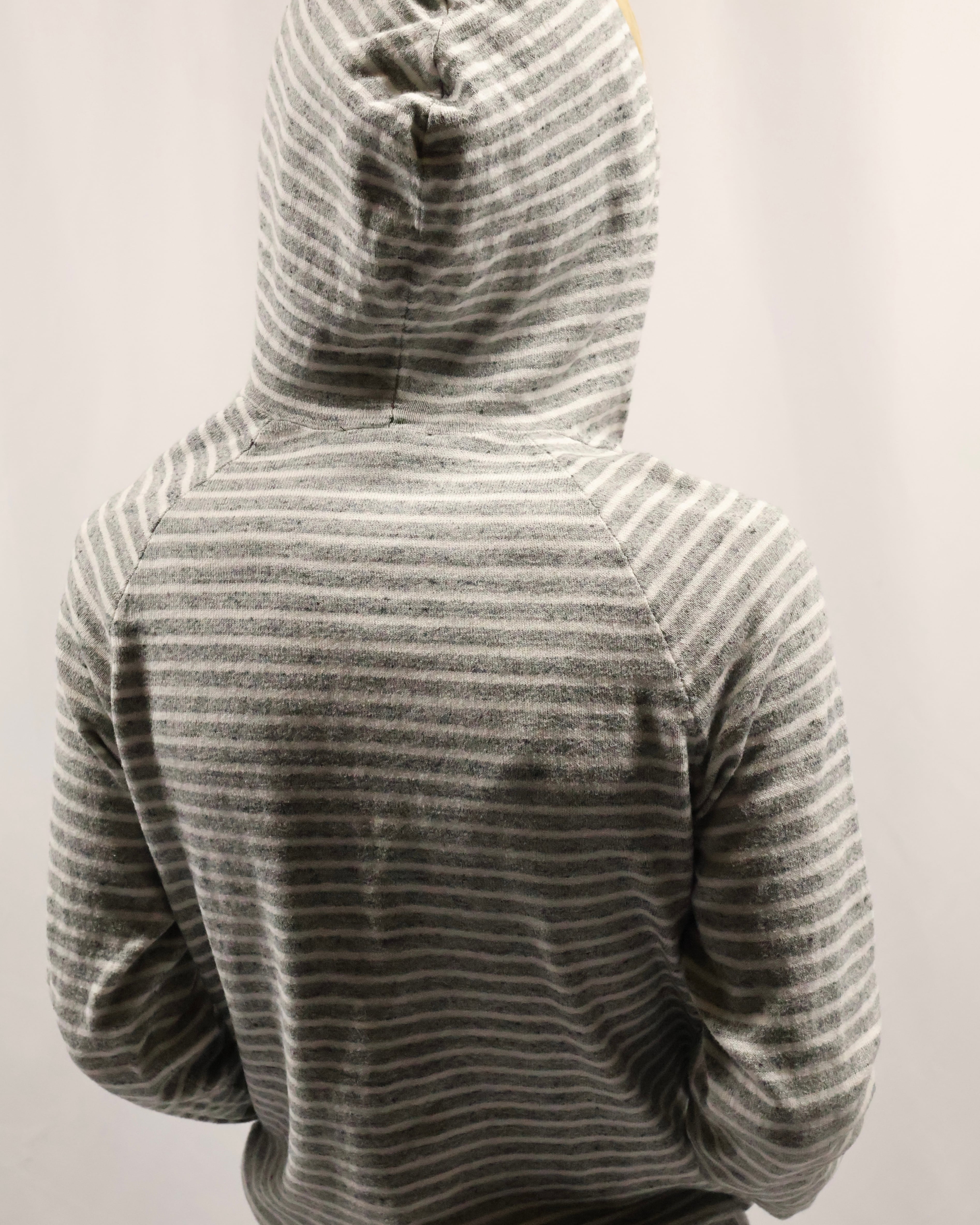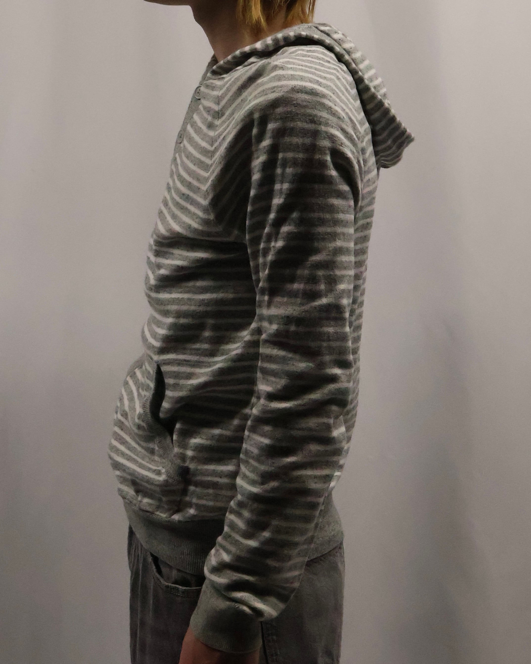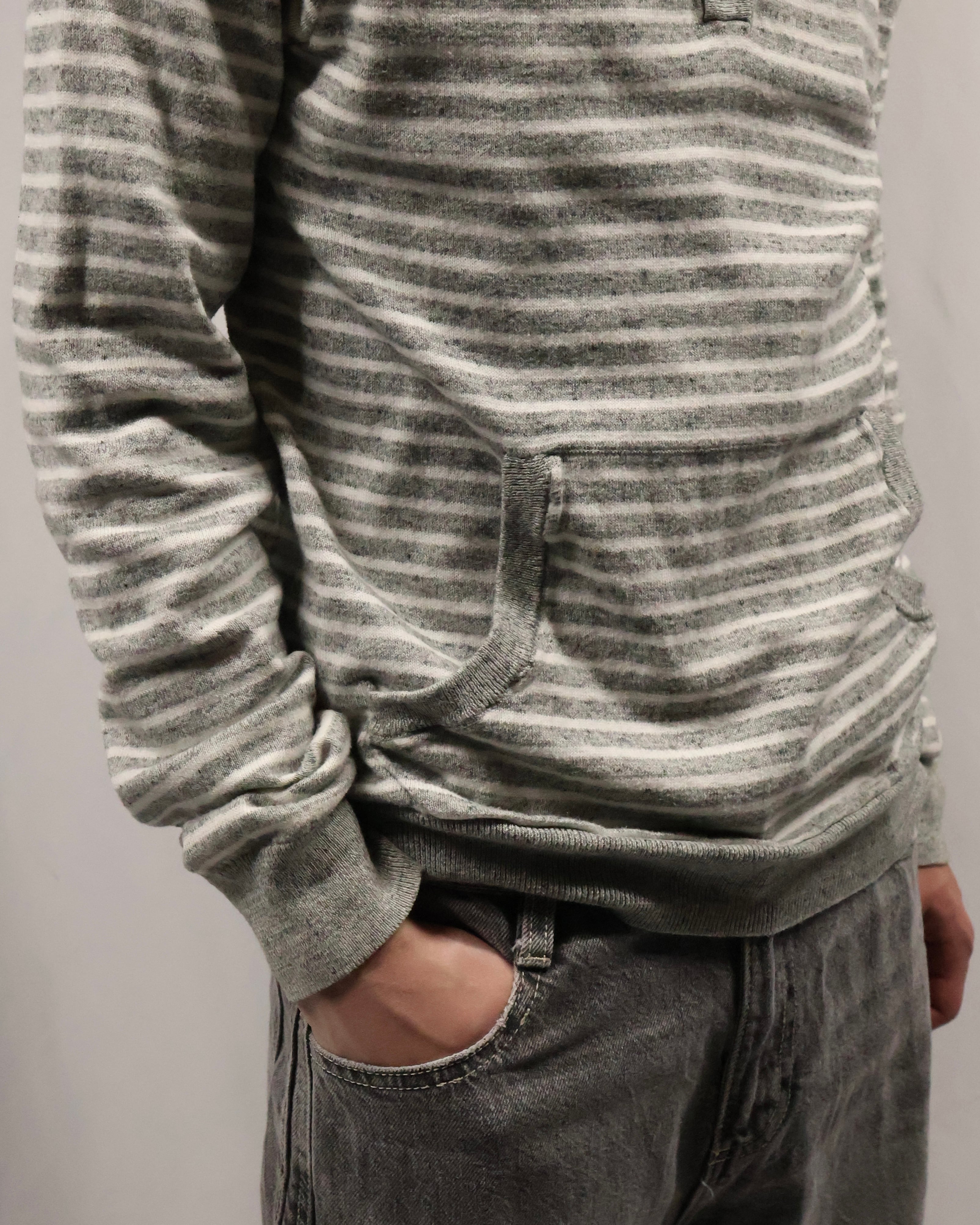 細いボーダーのヘンリーネックフーディ。インナーとして一枚は欲しい、使い勝手のいいボーダーフーディ。インナーに入れるだけでこなれ感を演出し、柄も相まって手軽にファッションが出来る、汎用性の高い一枚。