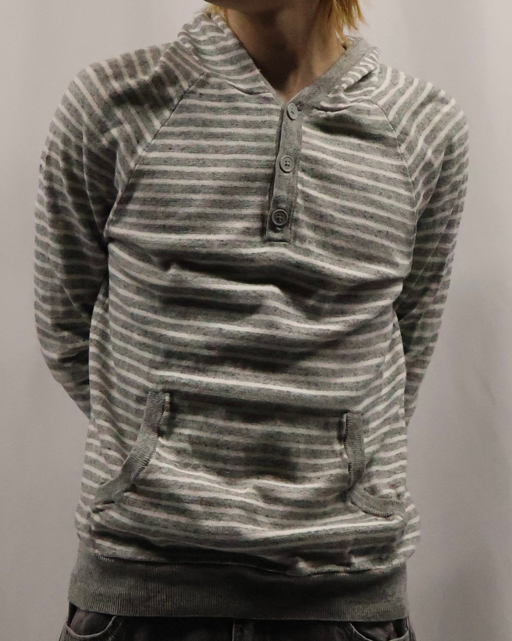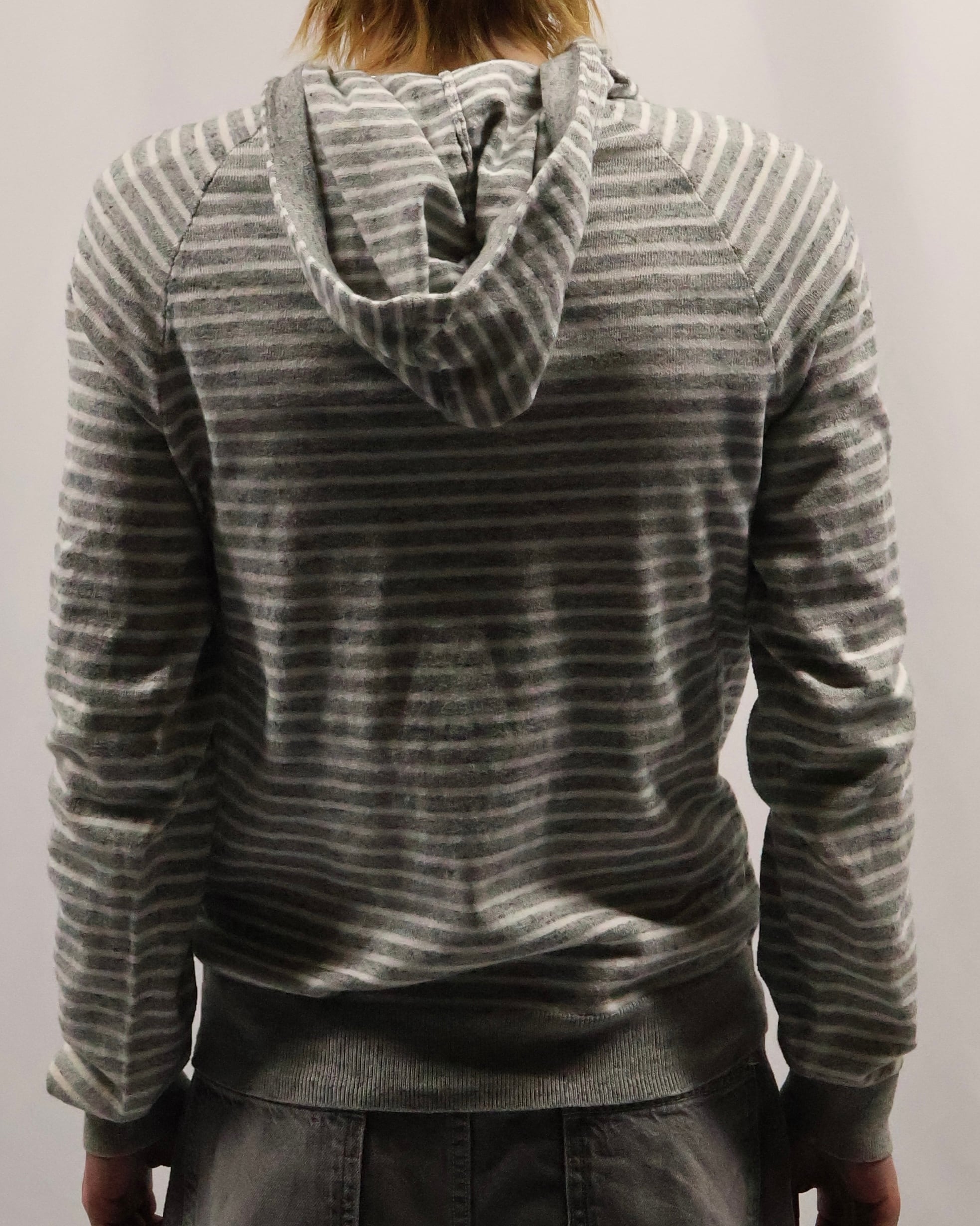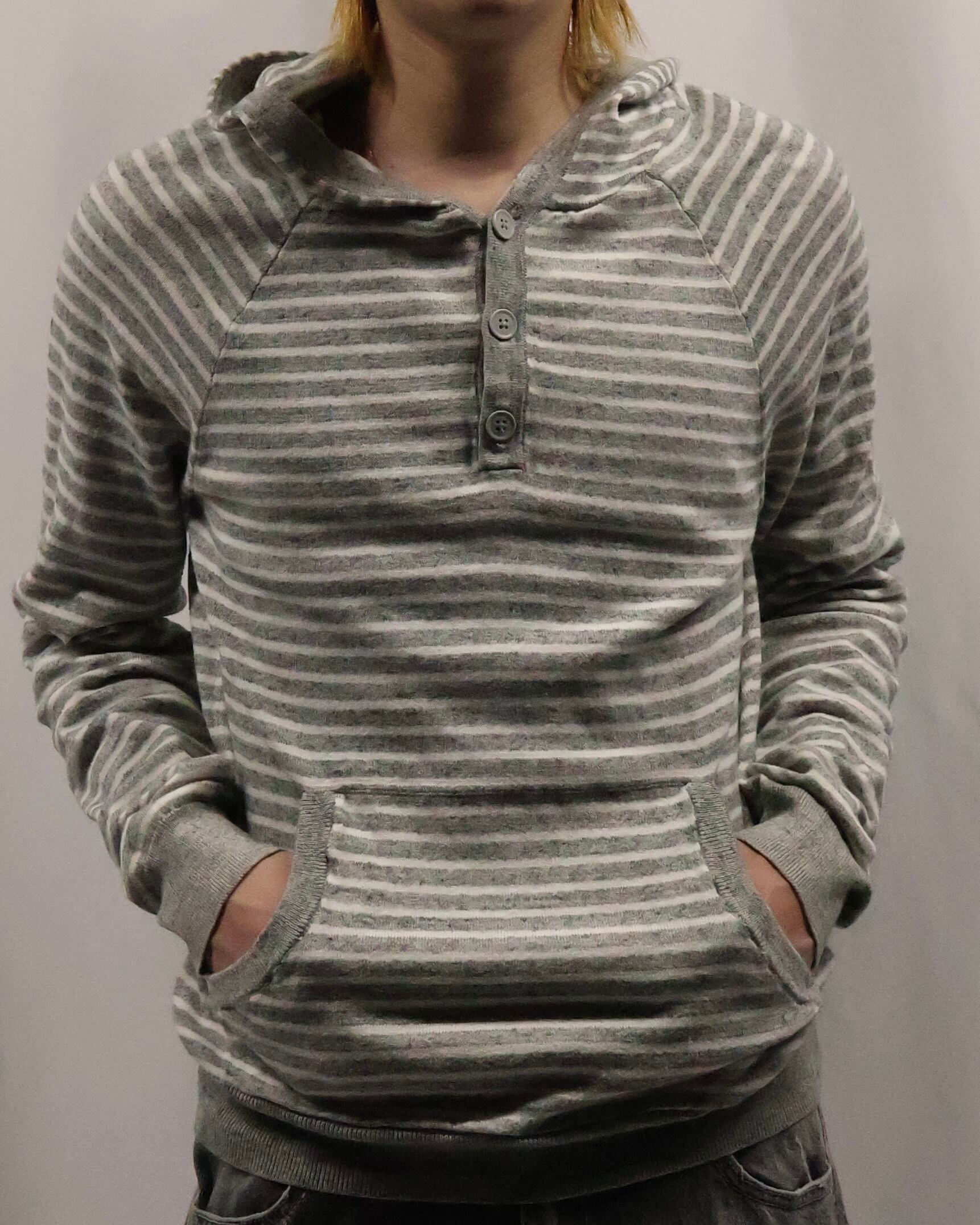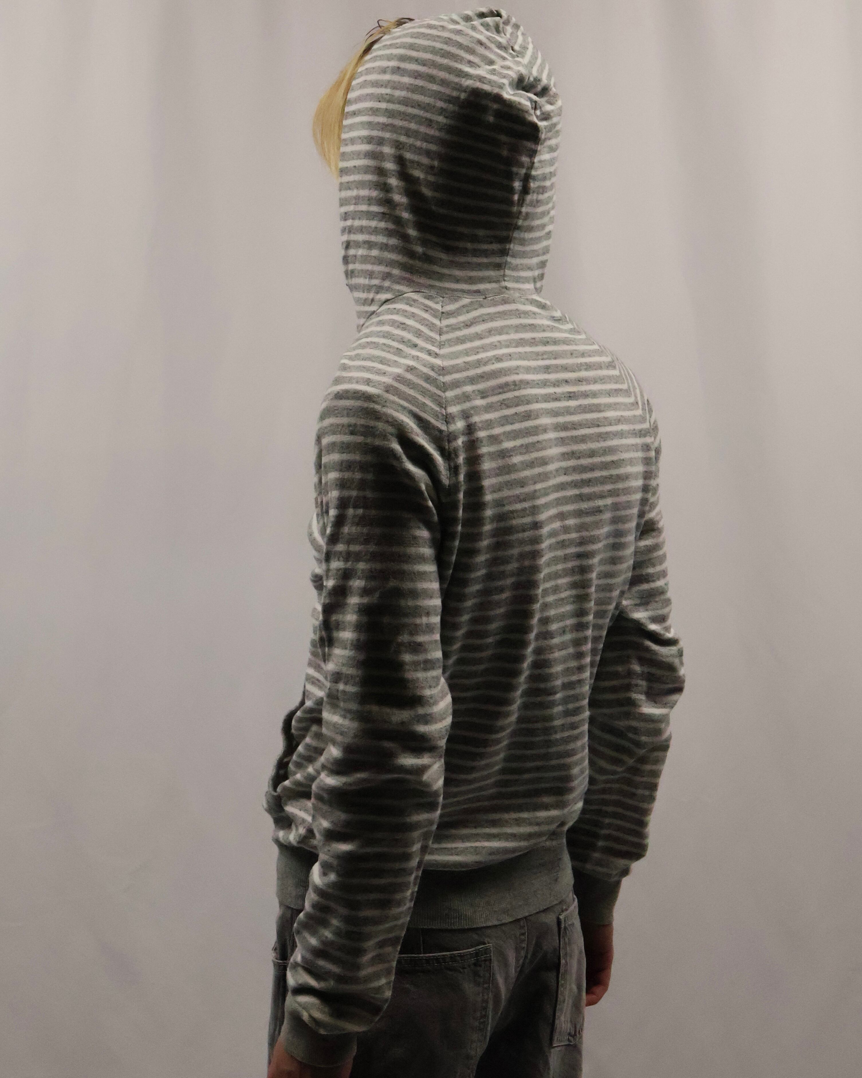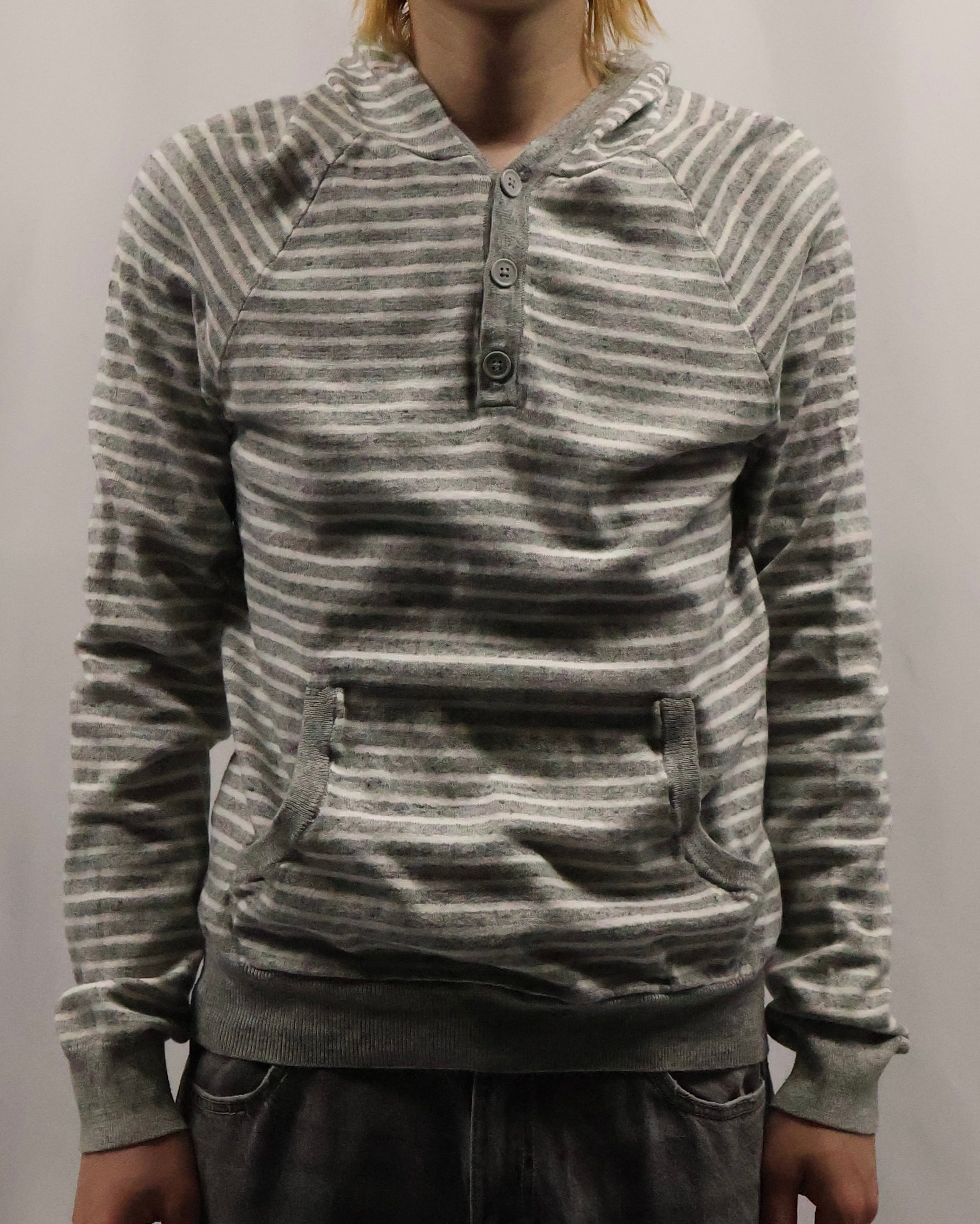 細いボーダーのヘンリーネックフーディ。インナーとして一枚は欲しい、使い勝手のいいボーダーフーディ。インナーに入れるだけでこなれ感を演出し、柄も相まって手軽にファッションが出来る、汎用性の高い一枚。