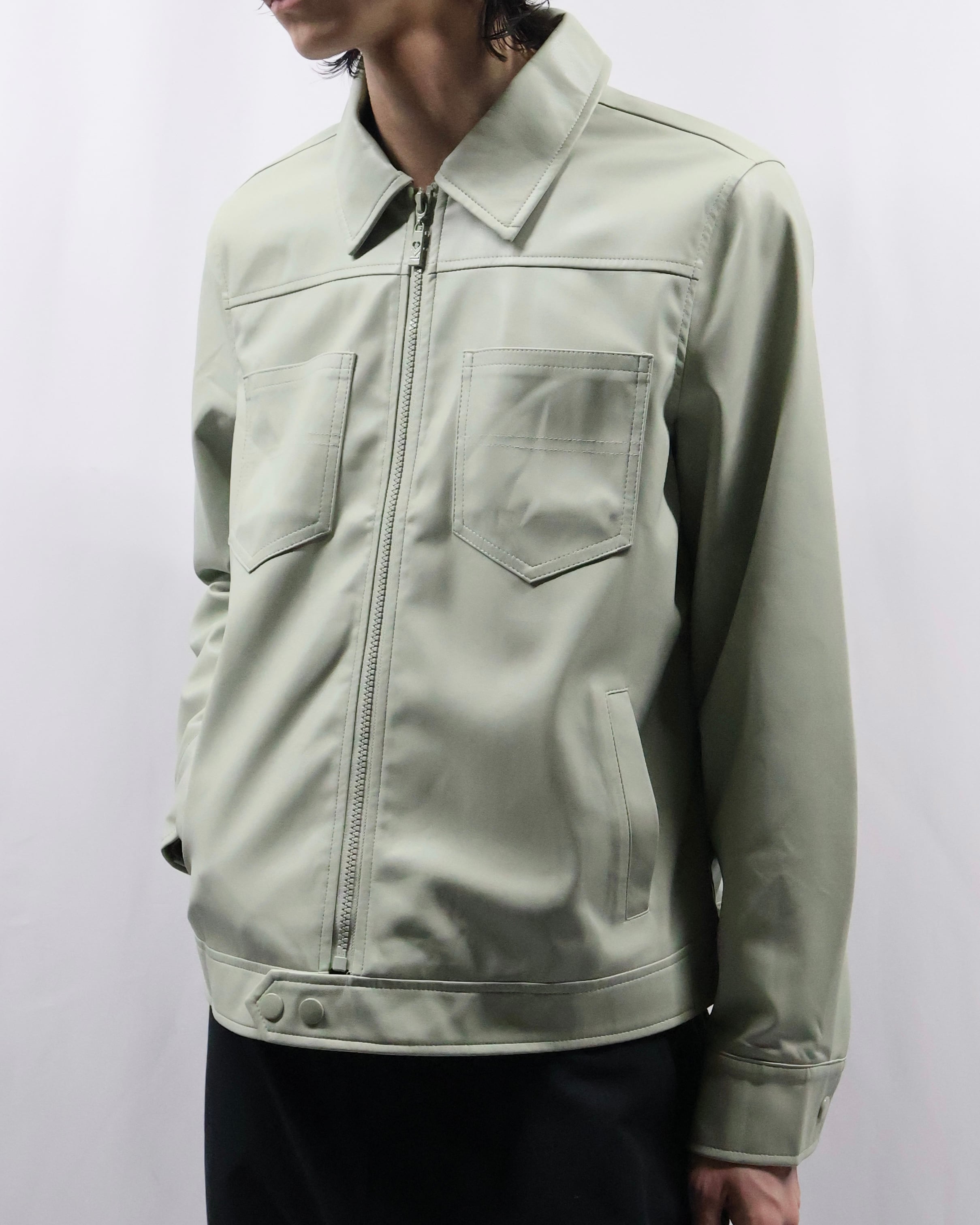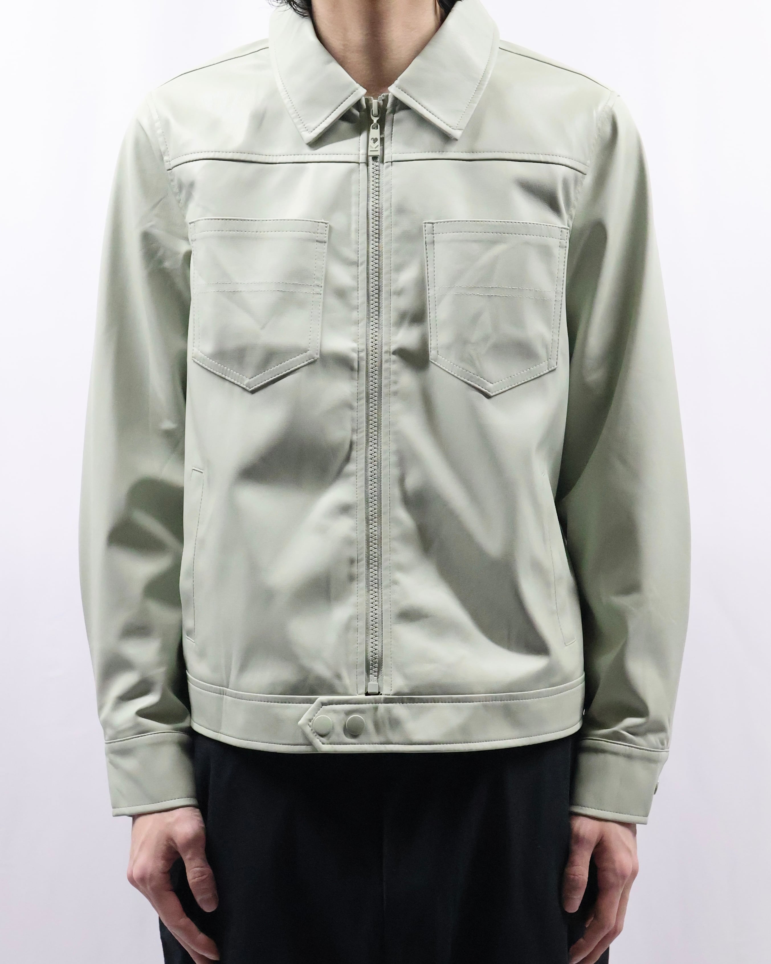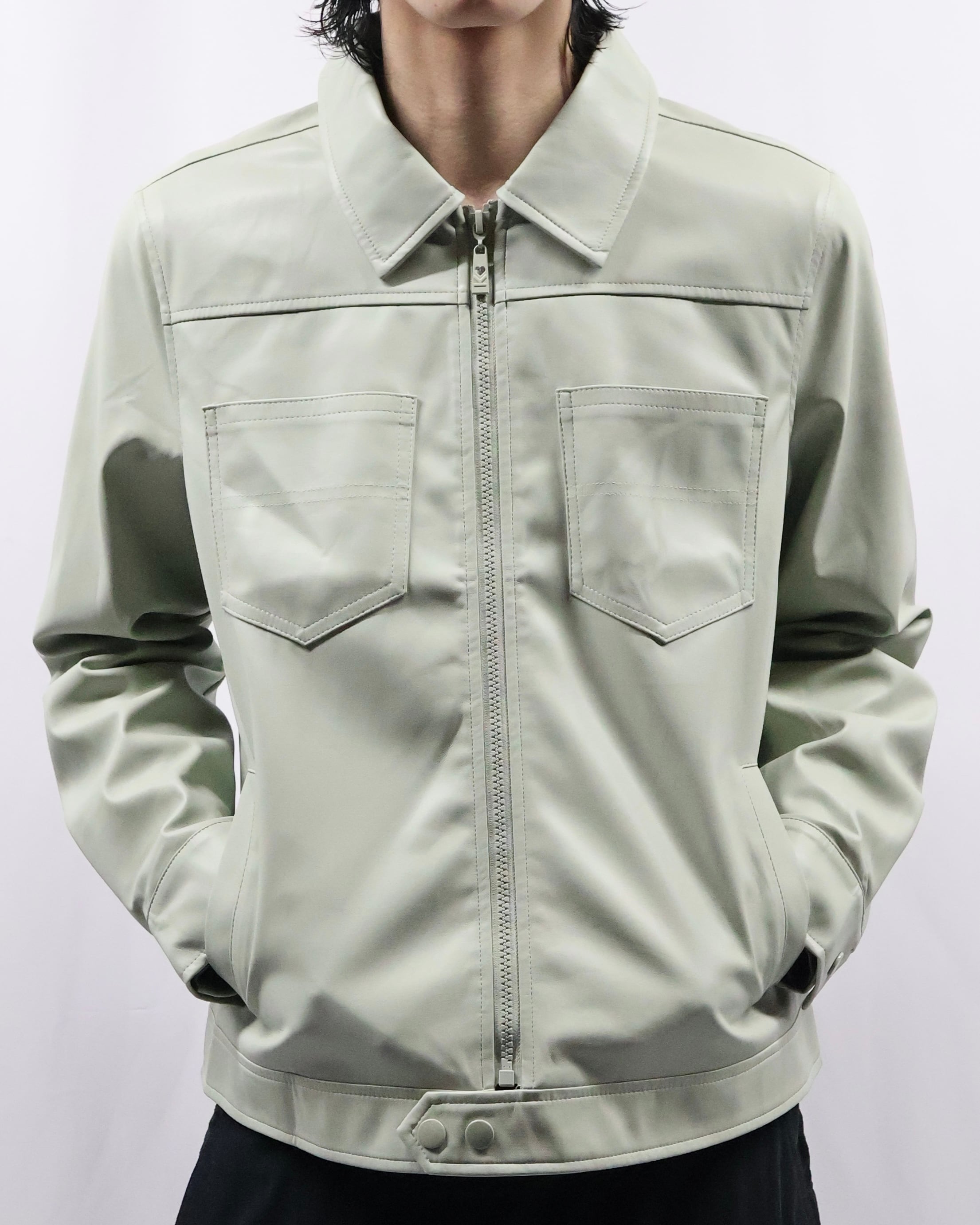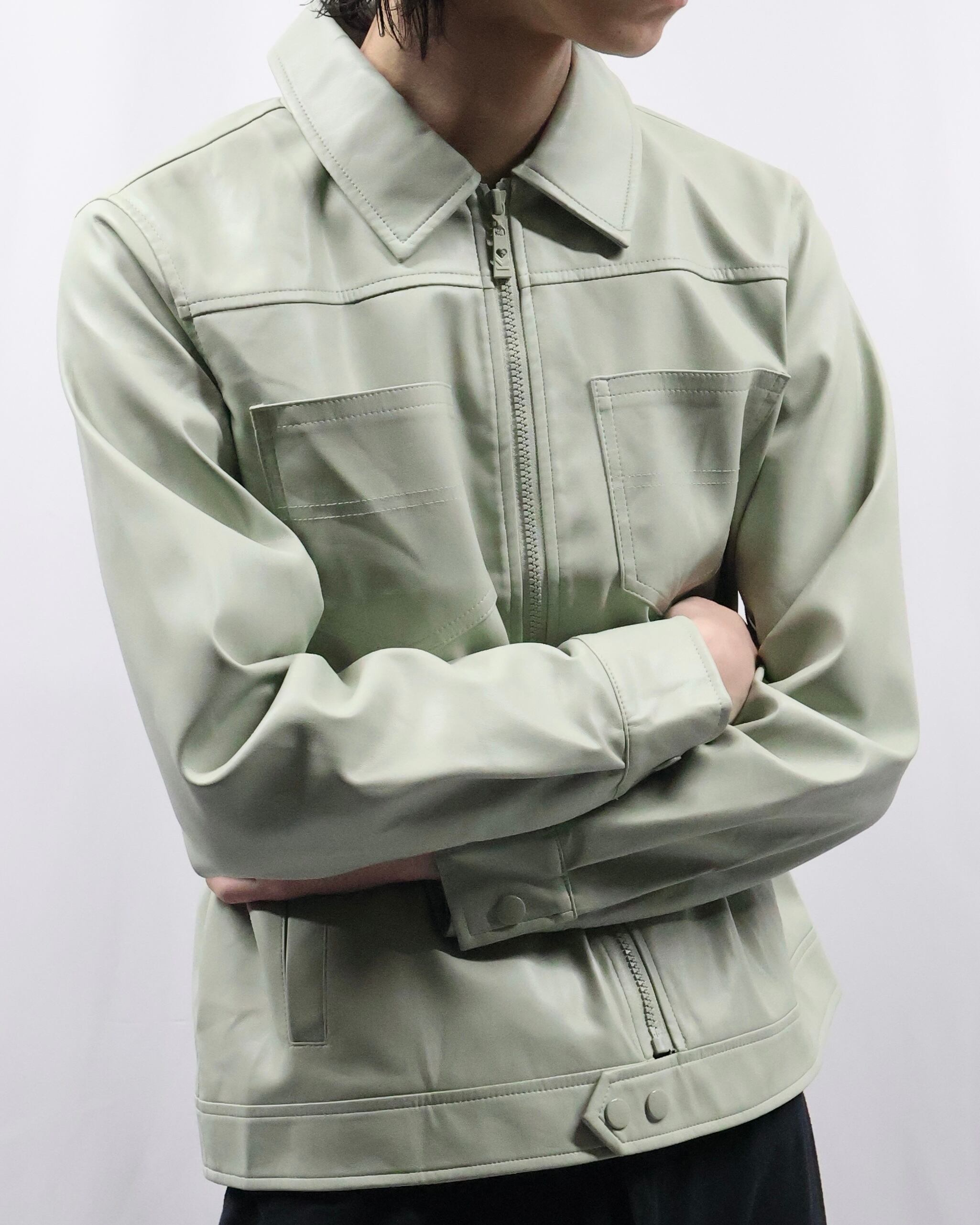 淡い色味が特徴のフェイクレザージップアップブルゾン