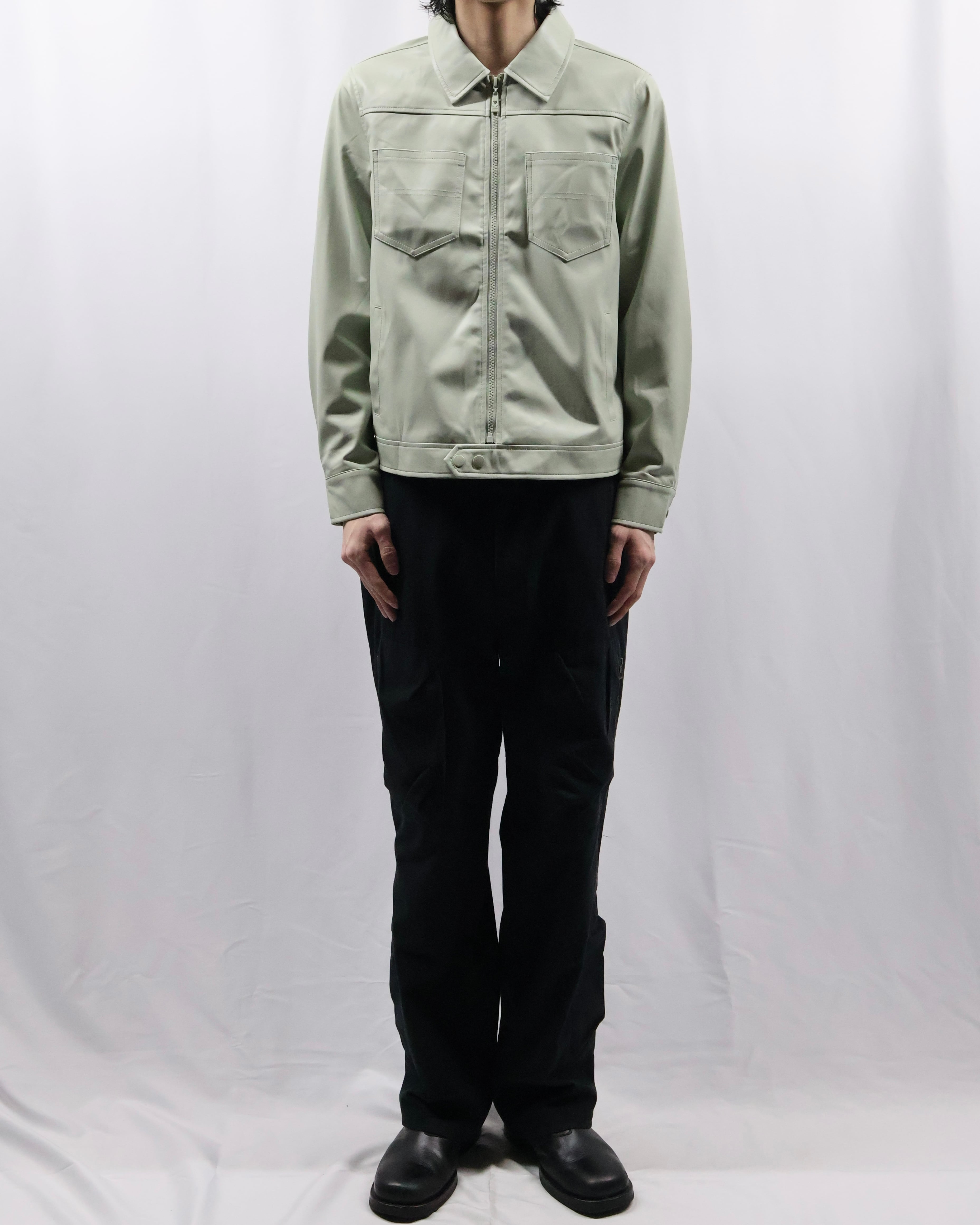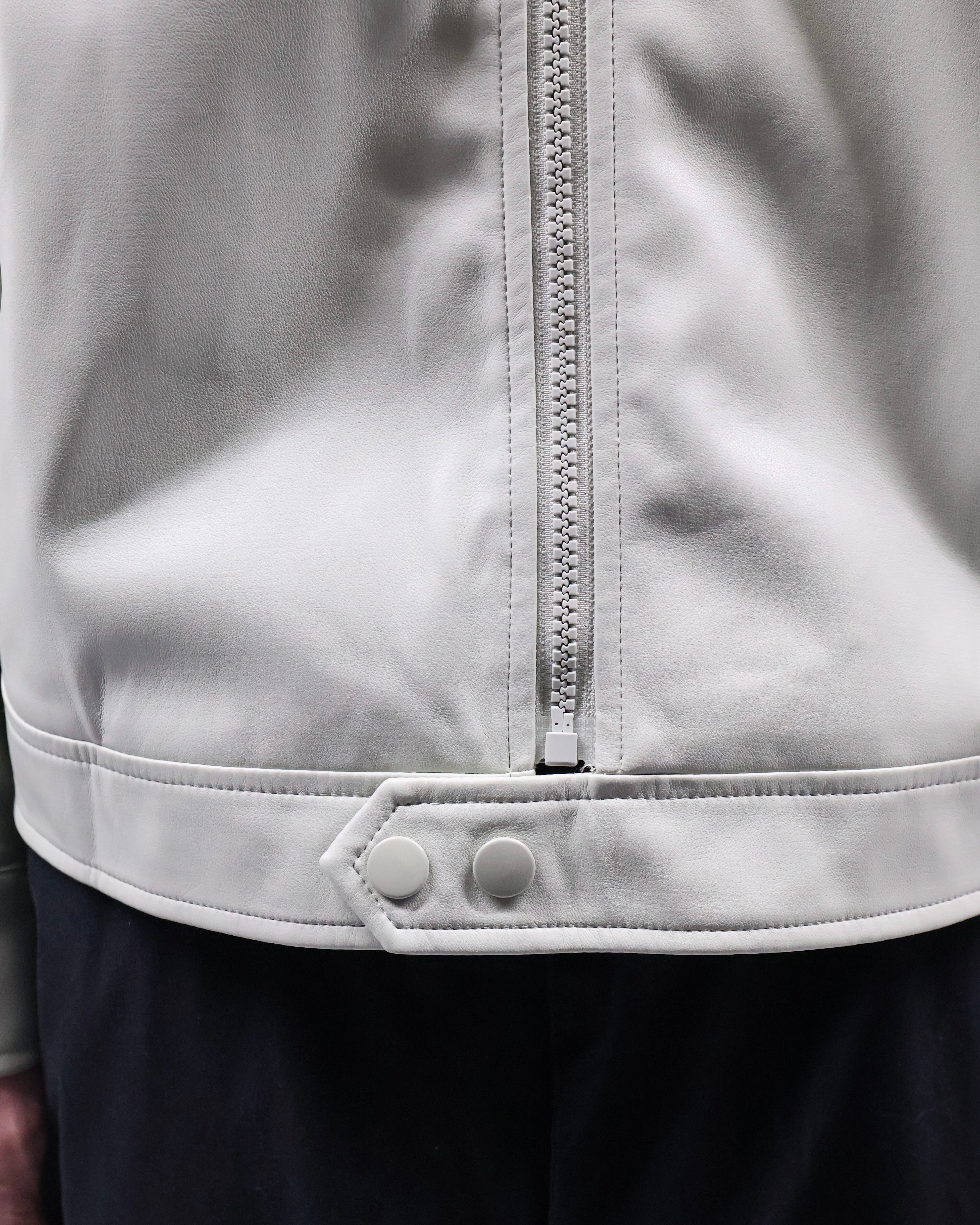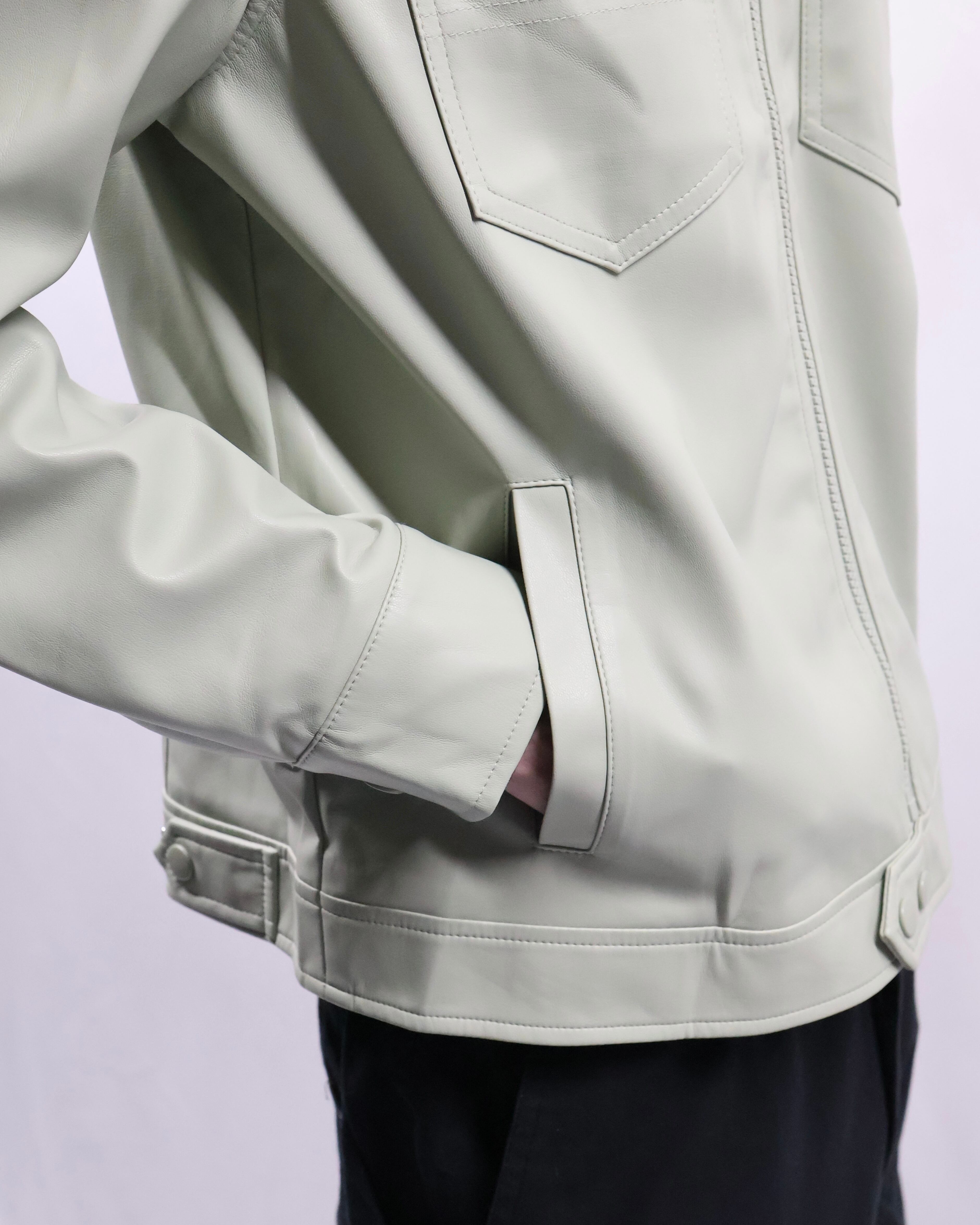 淡い色味が特徴のフェイクレザージップアップブルゾン