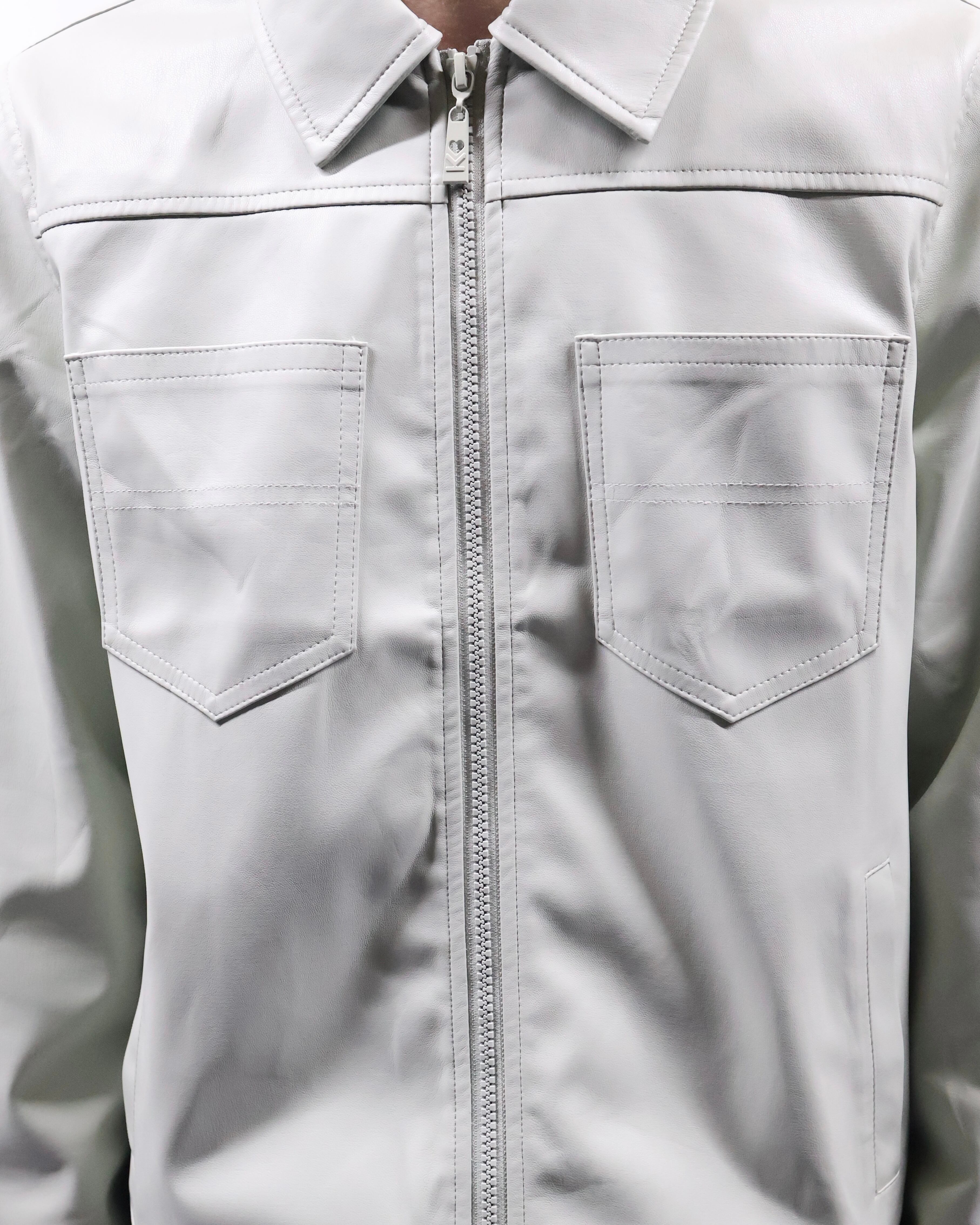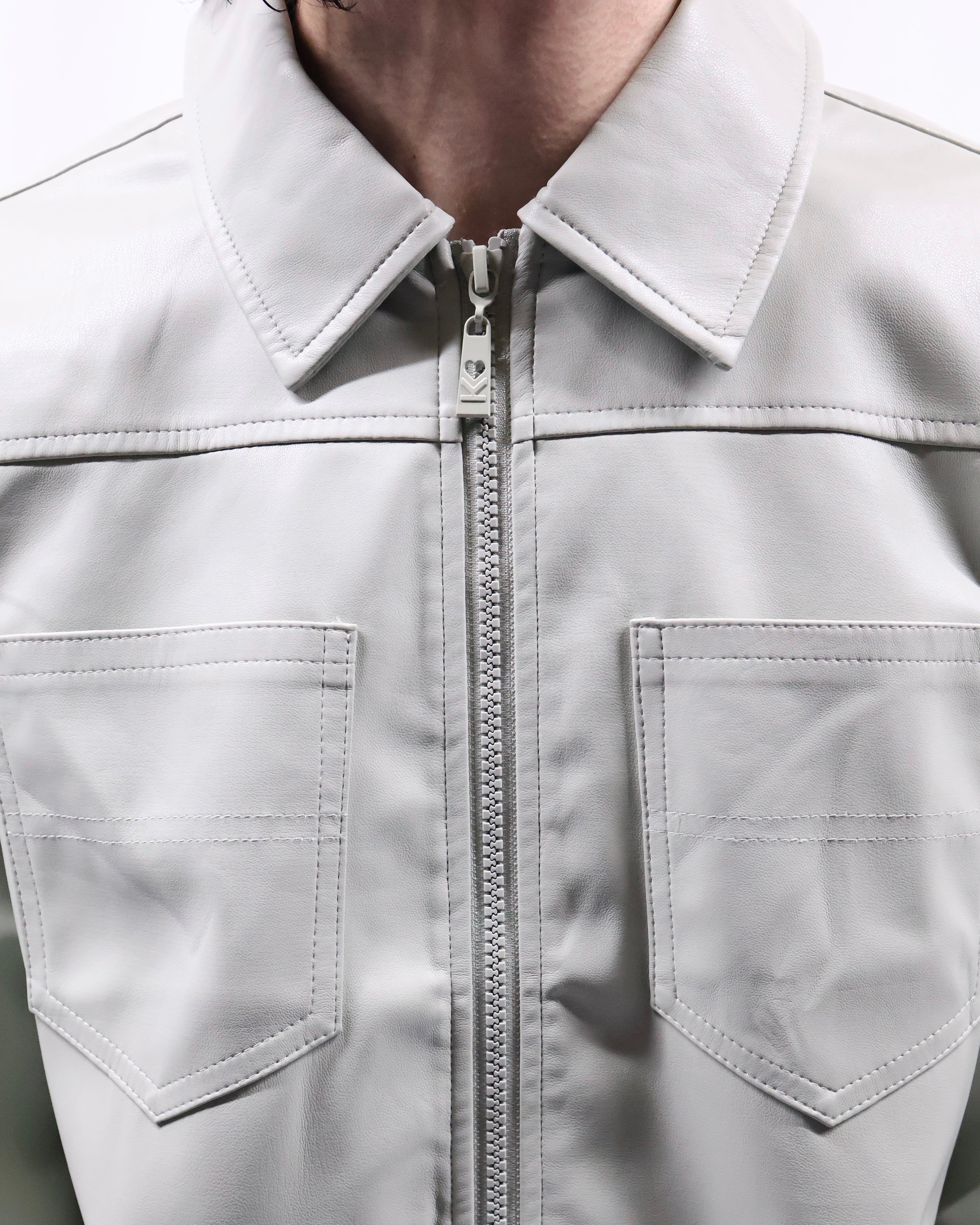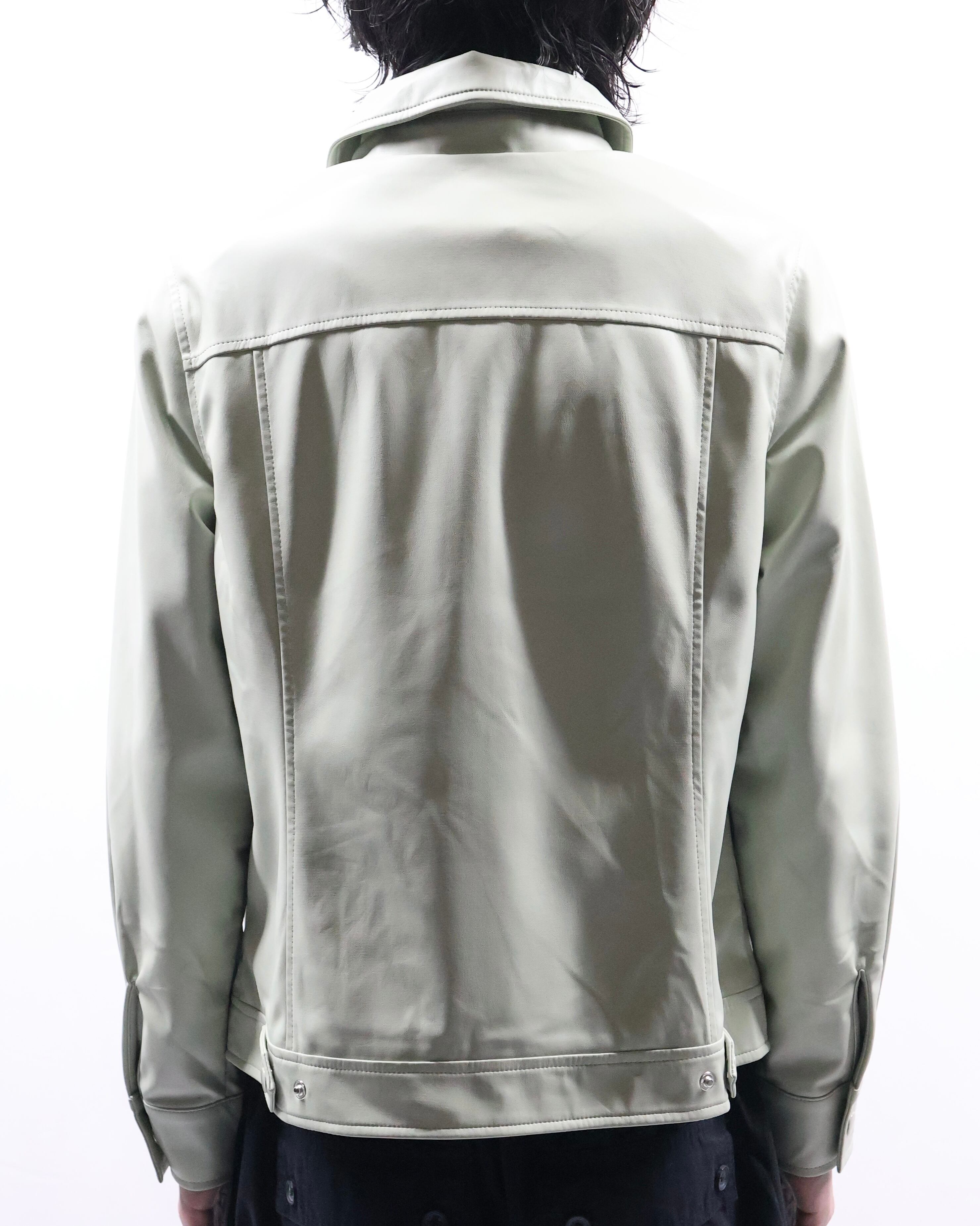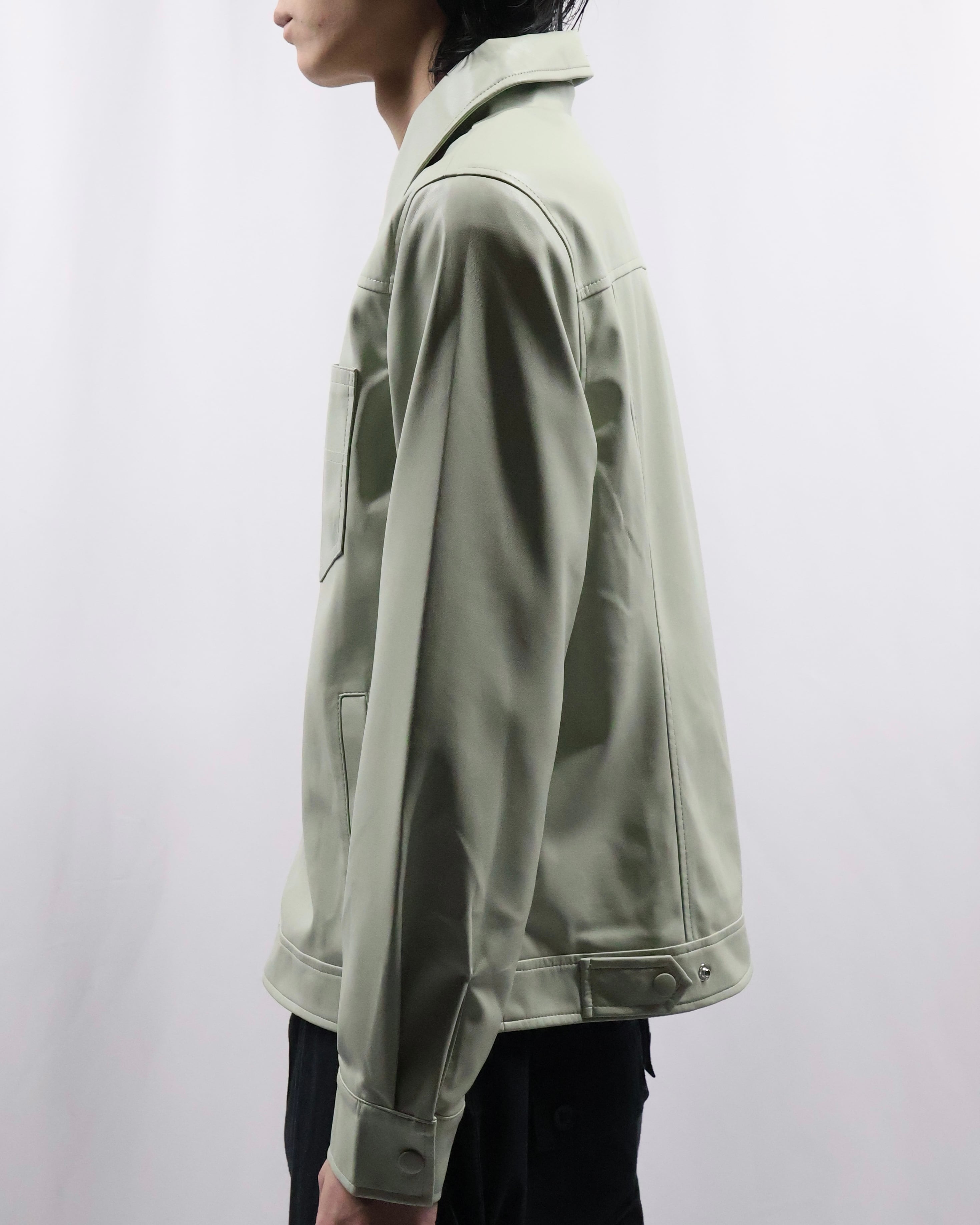 淡い色味が特徴のフェイクレザージップアップブルゾン