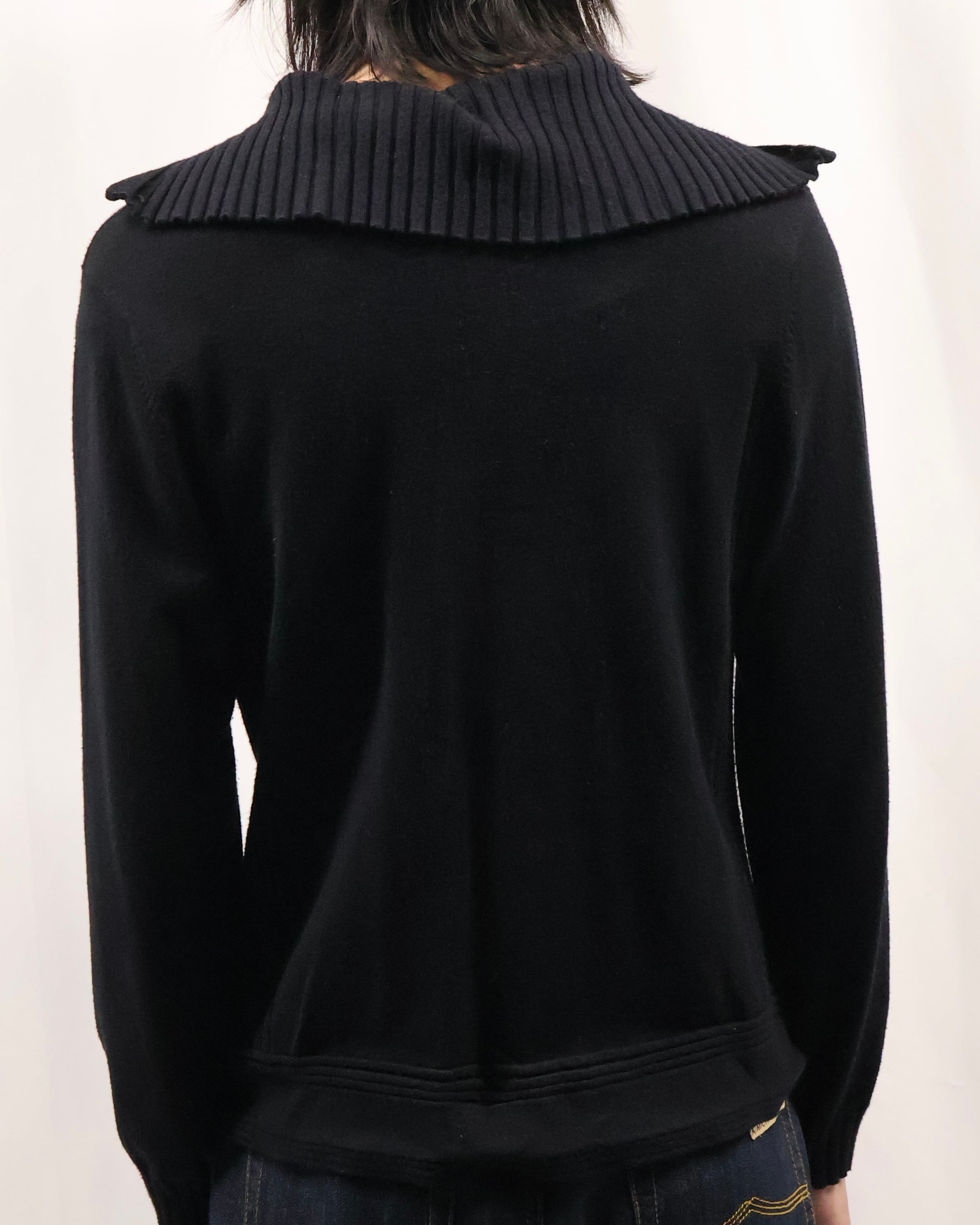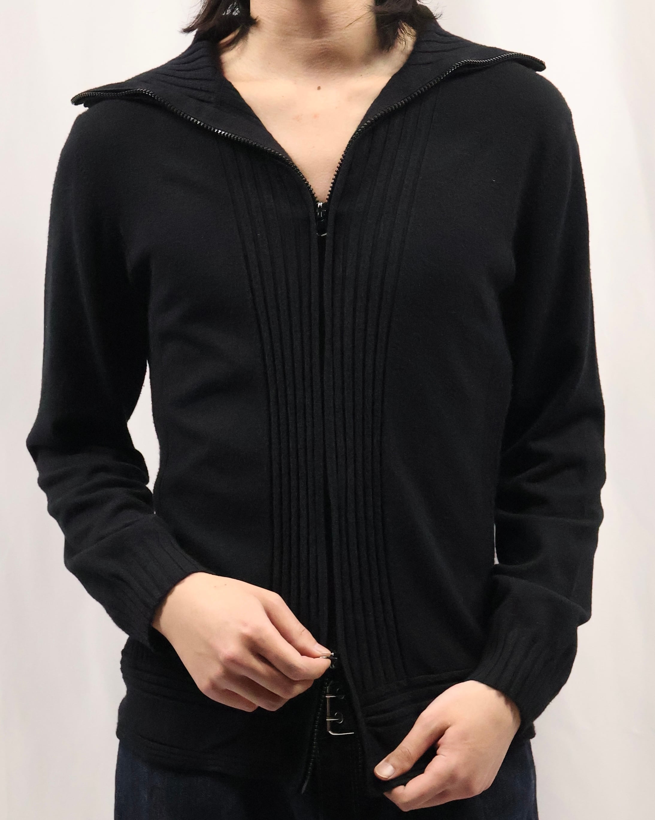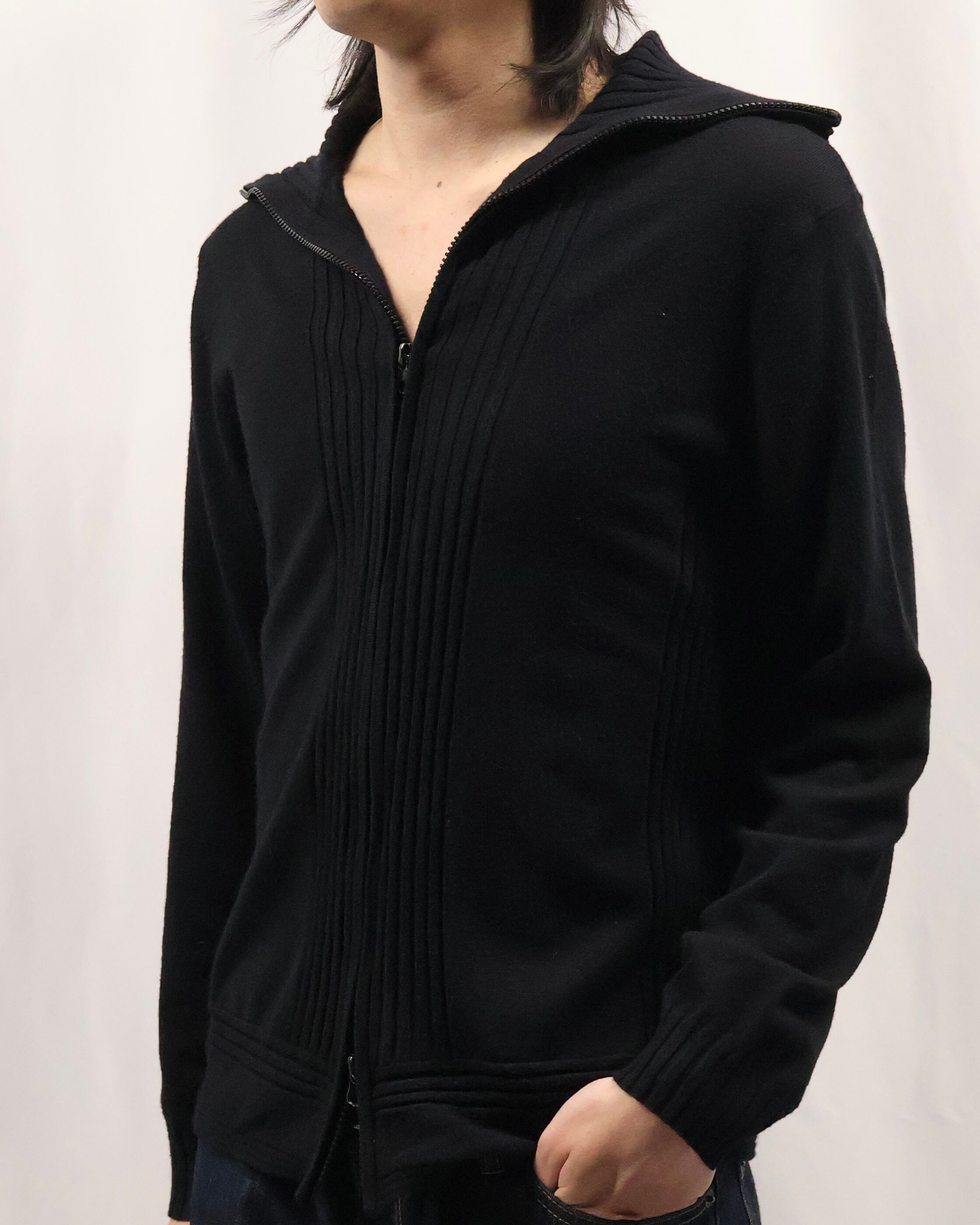薄地の上品な雰囲気を持つダブルジップニット。セーラーカラーのような大きめの襟が特徴的で、上品ではありつつも、ダブルジップで程よい抜け感も演出でき様々なコーディネートのインナーとして最適な一枚。