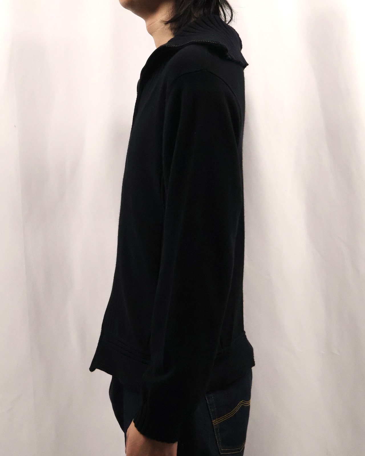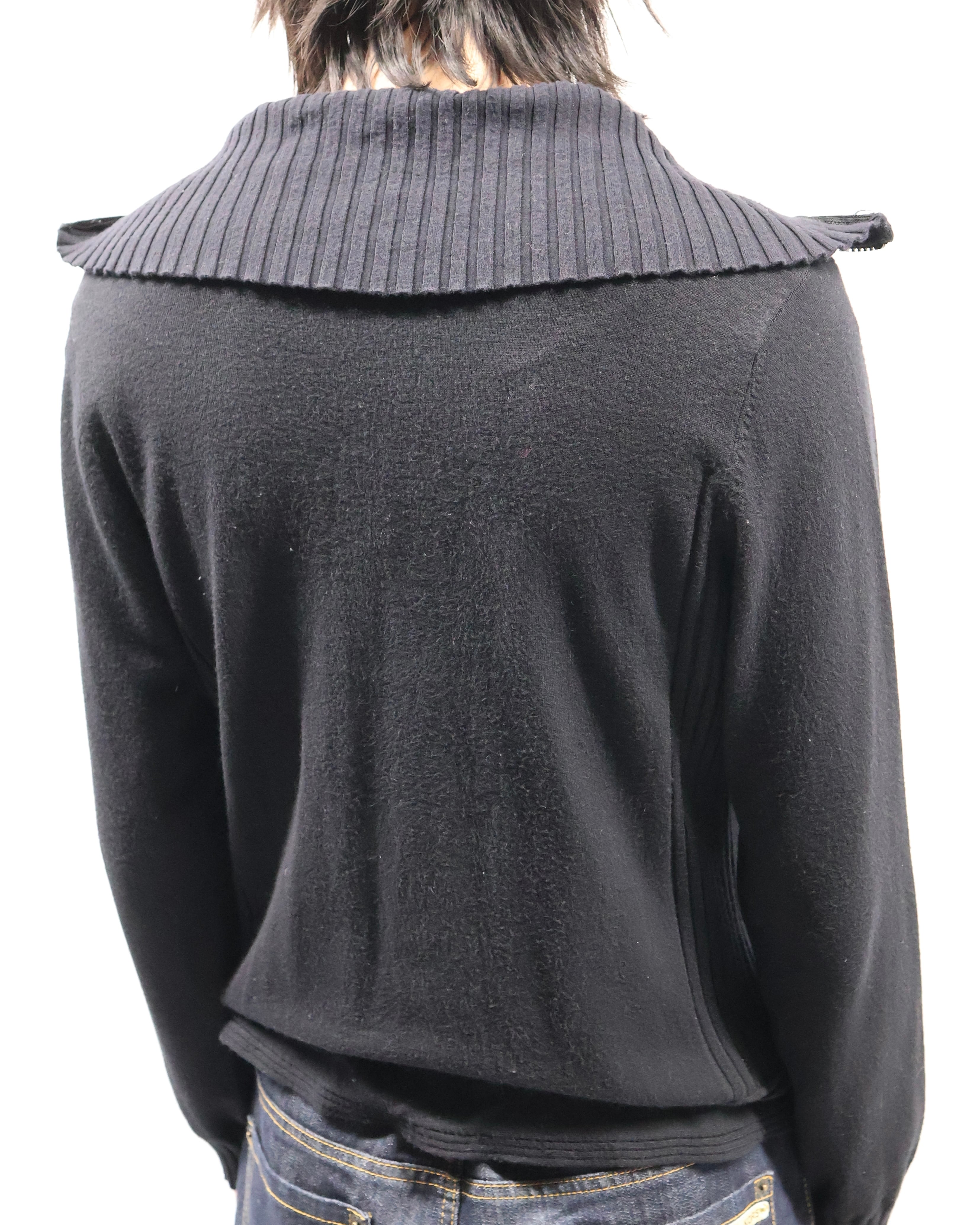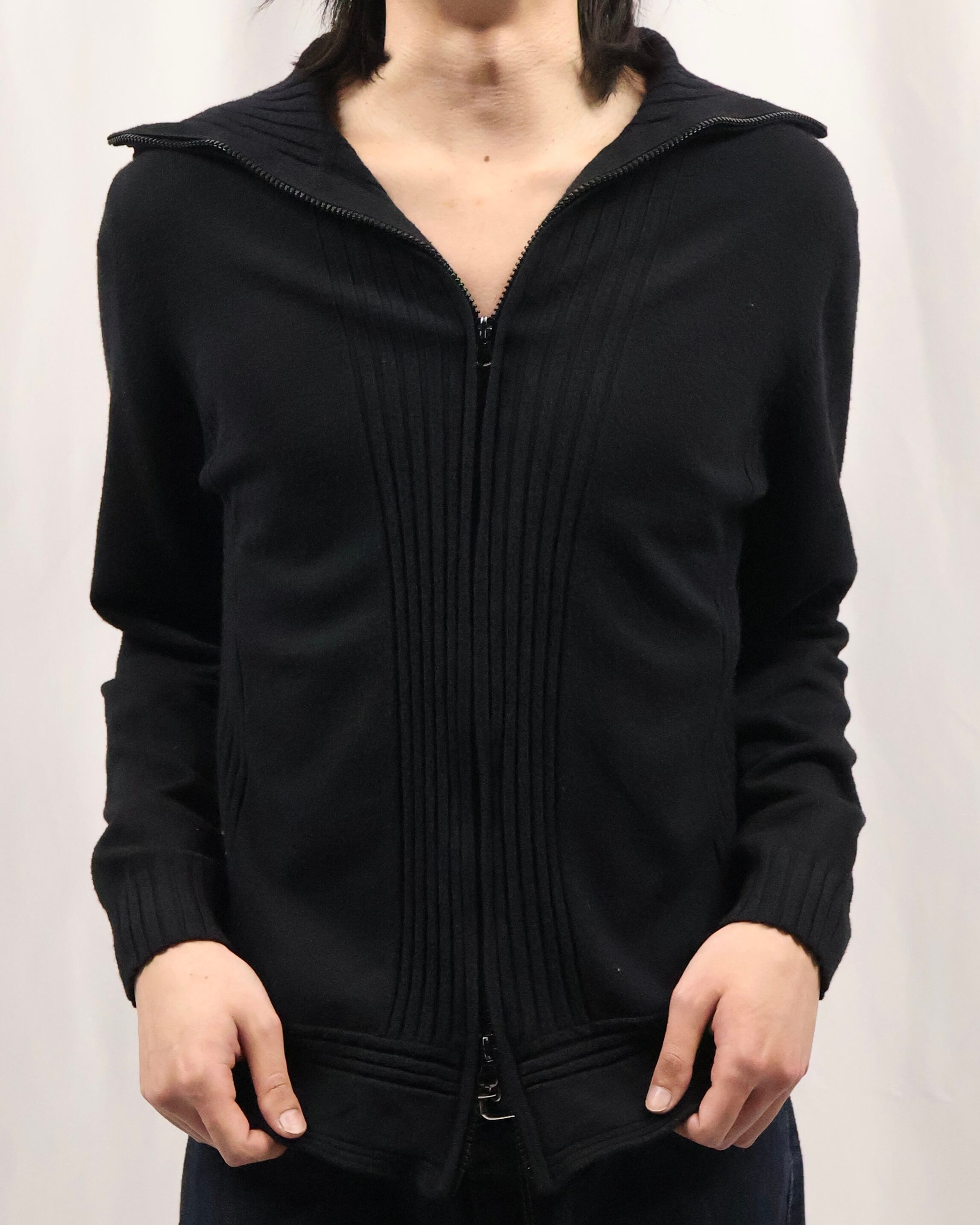 薄地の上品な雰囲気を持つダブルジップニット。セーラーカラーのような大きめの襟が特徴的で、上品ではありつつも、ダブルジップで程よい抜け感も演出でき様々なコーディネートのインナーとして最適な一枚。