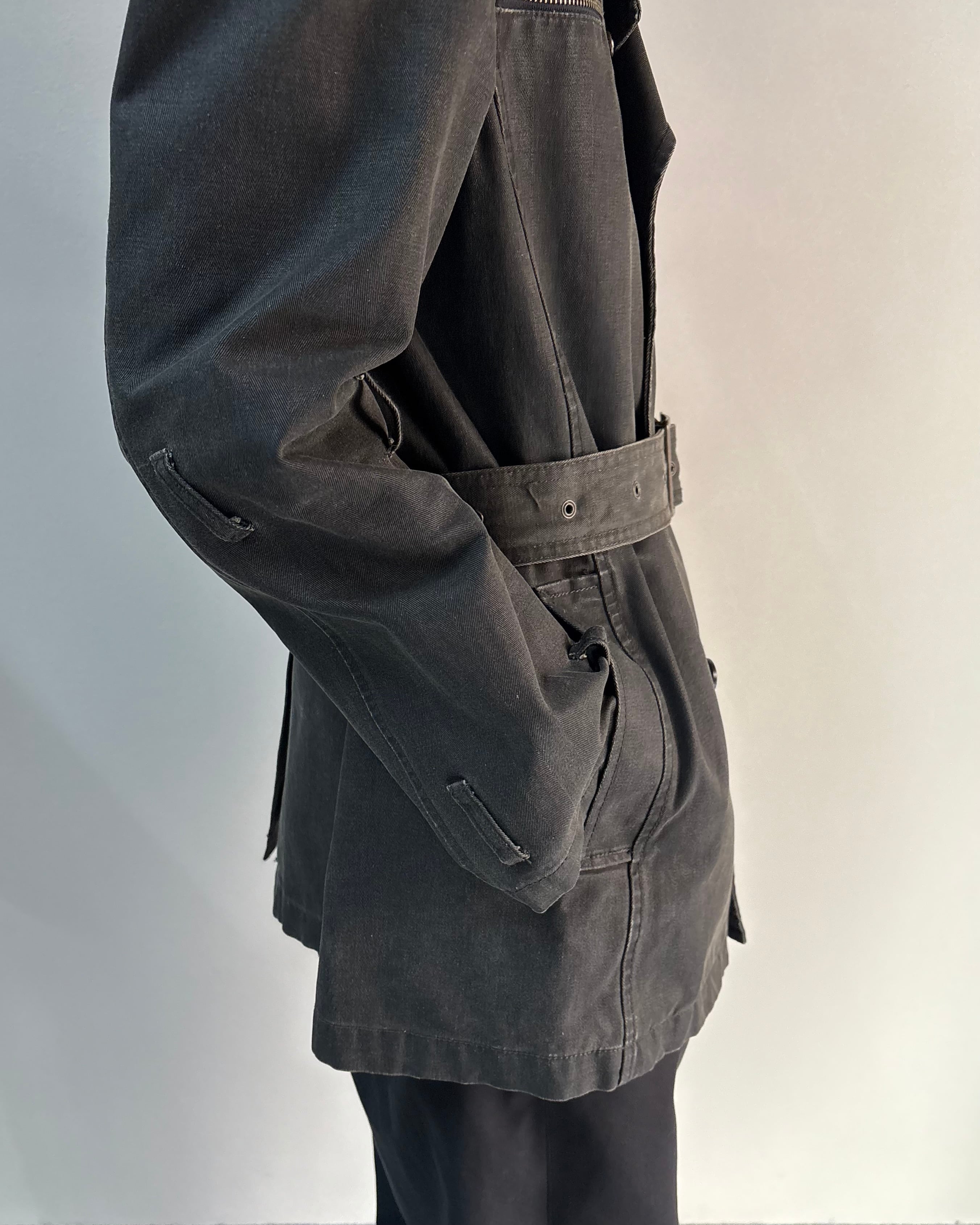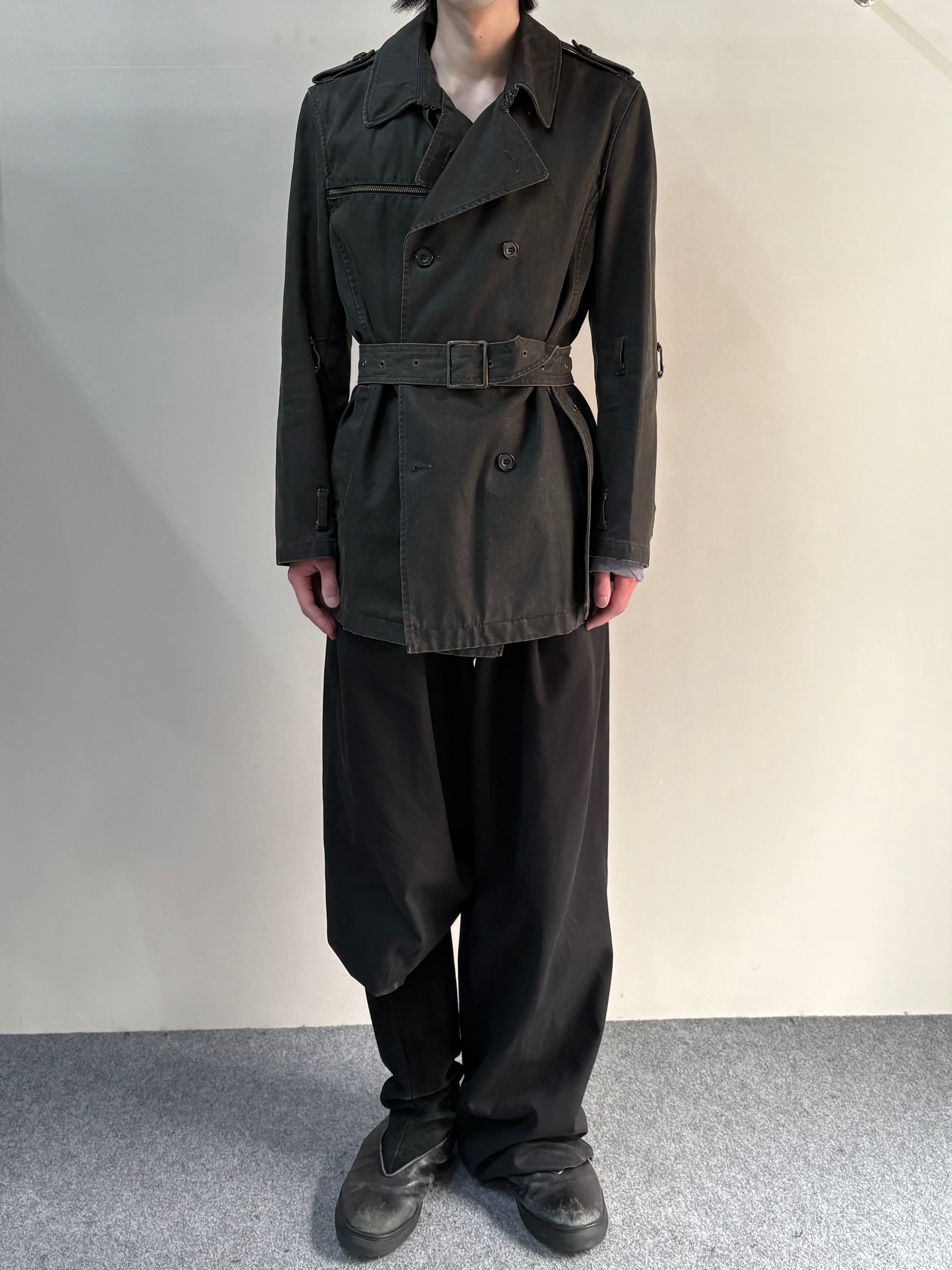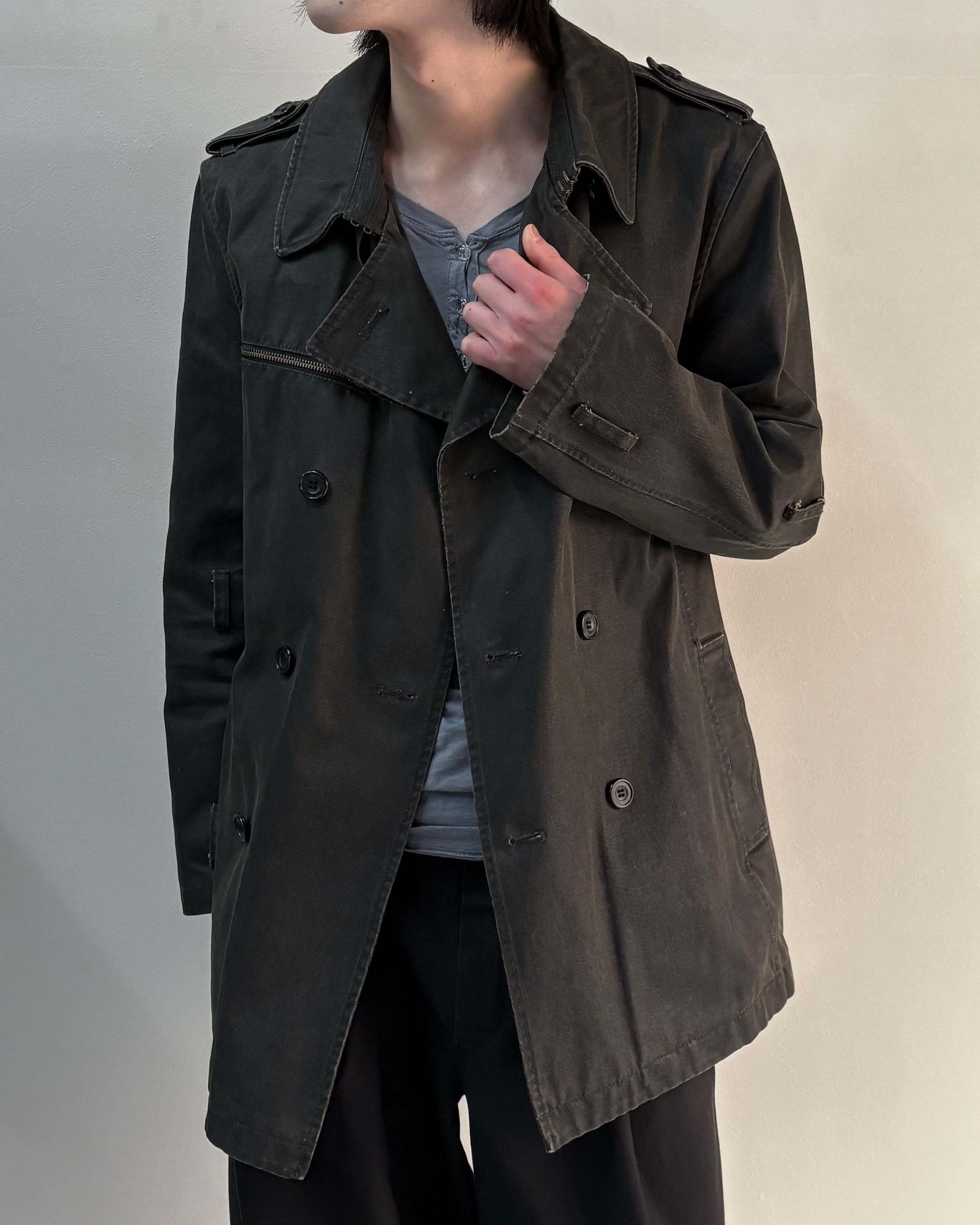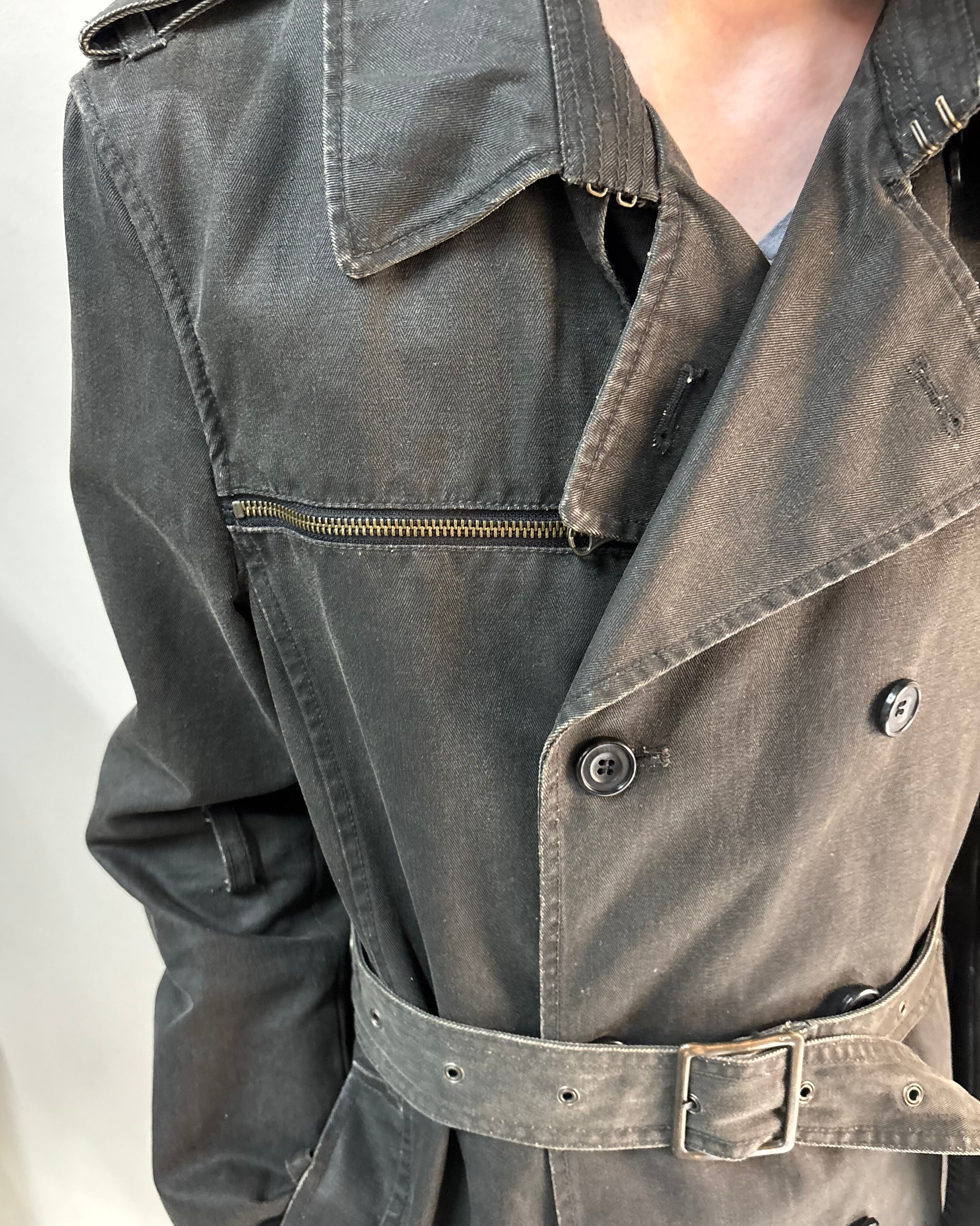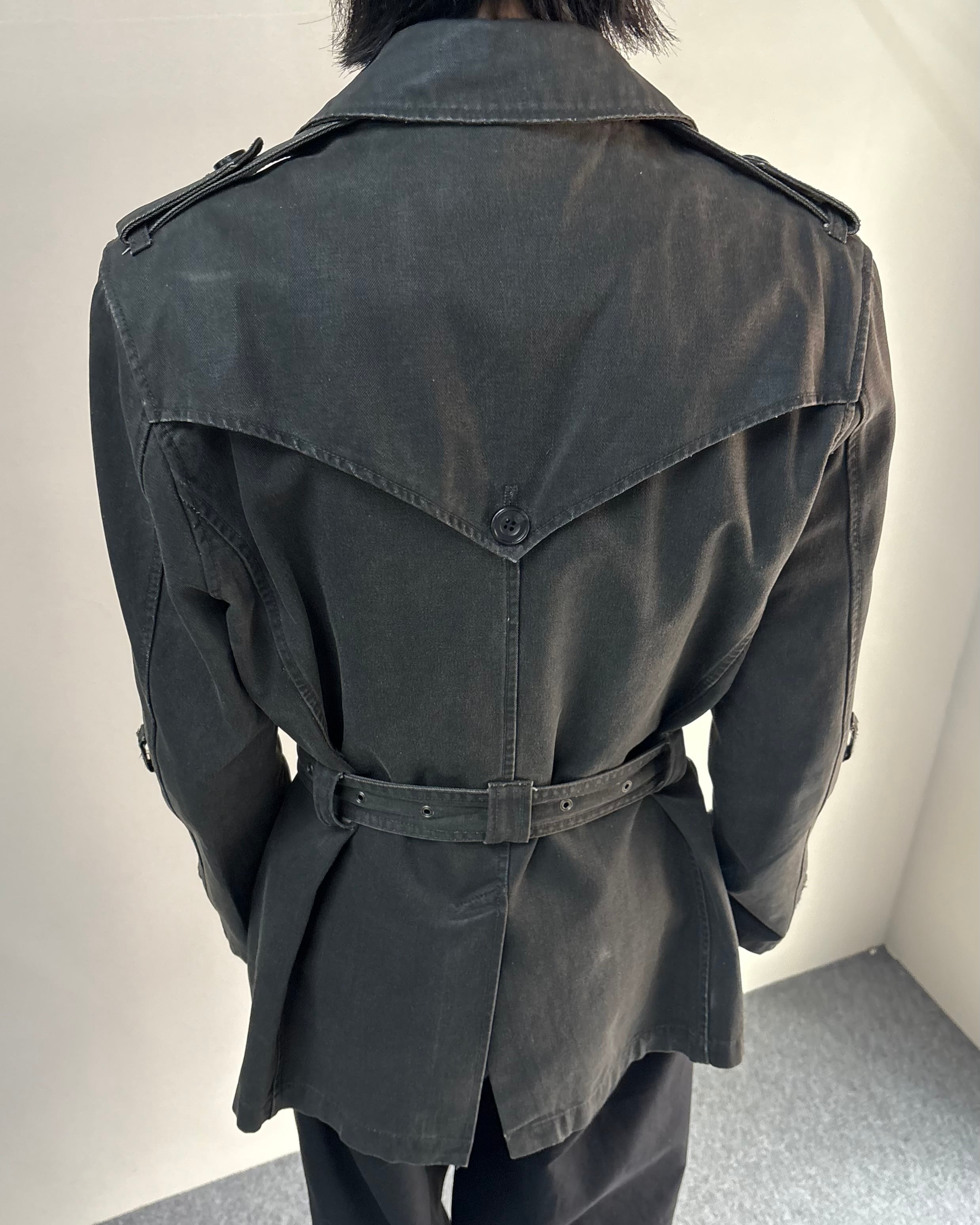 ややコンパクトな丈感と細身のシルエットでモード寄りに仕上げられた一着。コーティング加工されたムラ感のあるブラックカラーが、無骨さと退廃的な雰囲気を演出するアイテム。