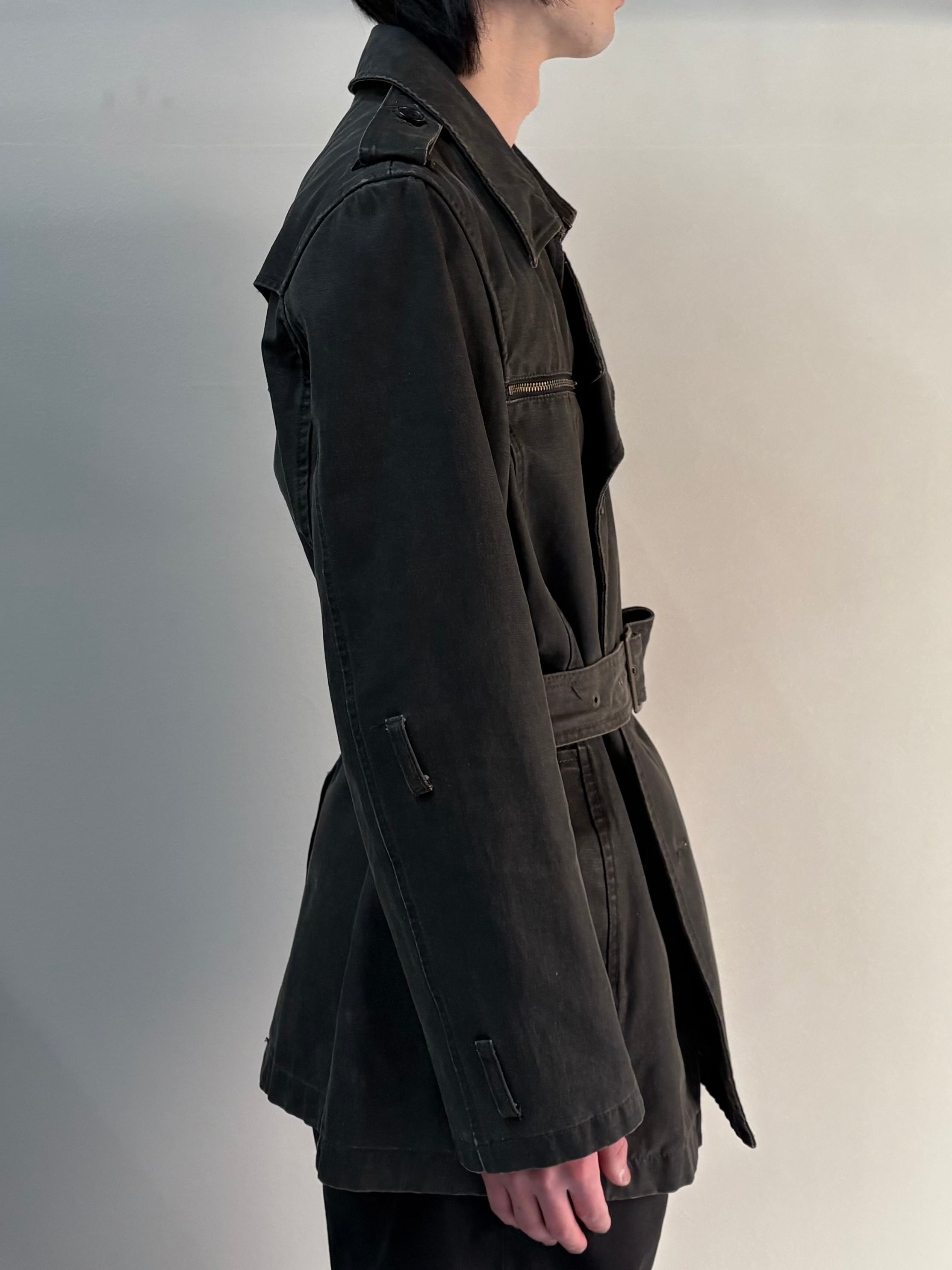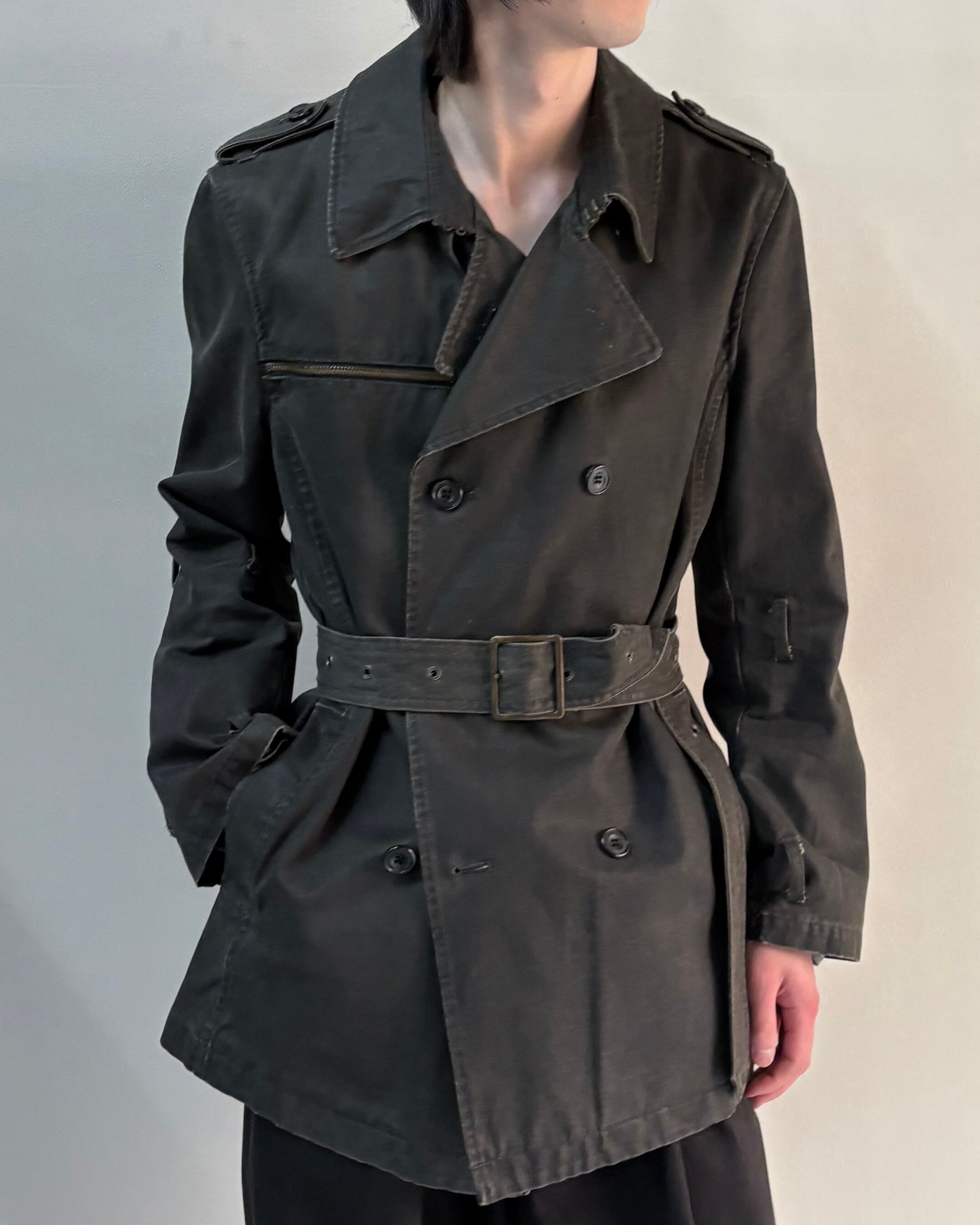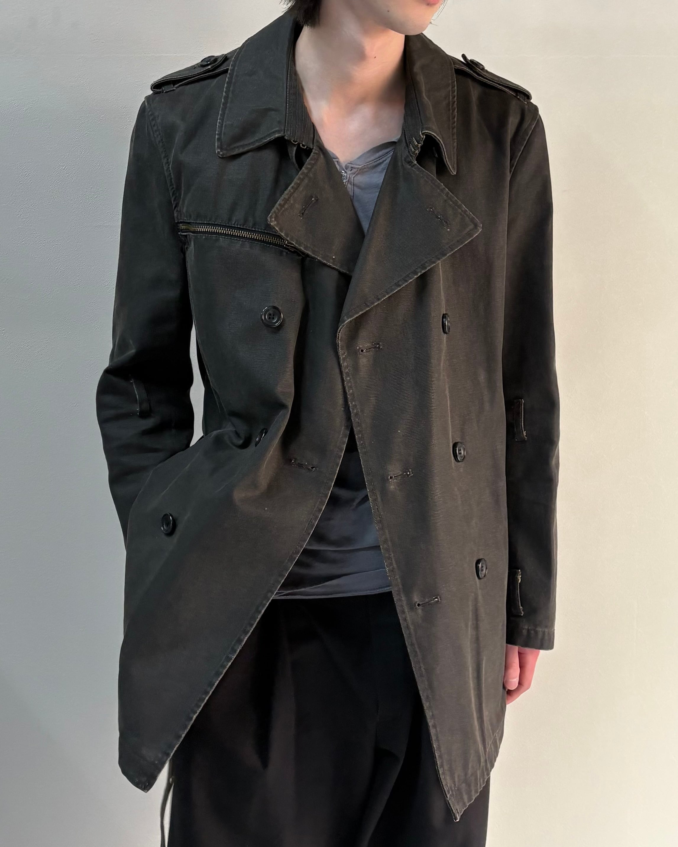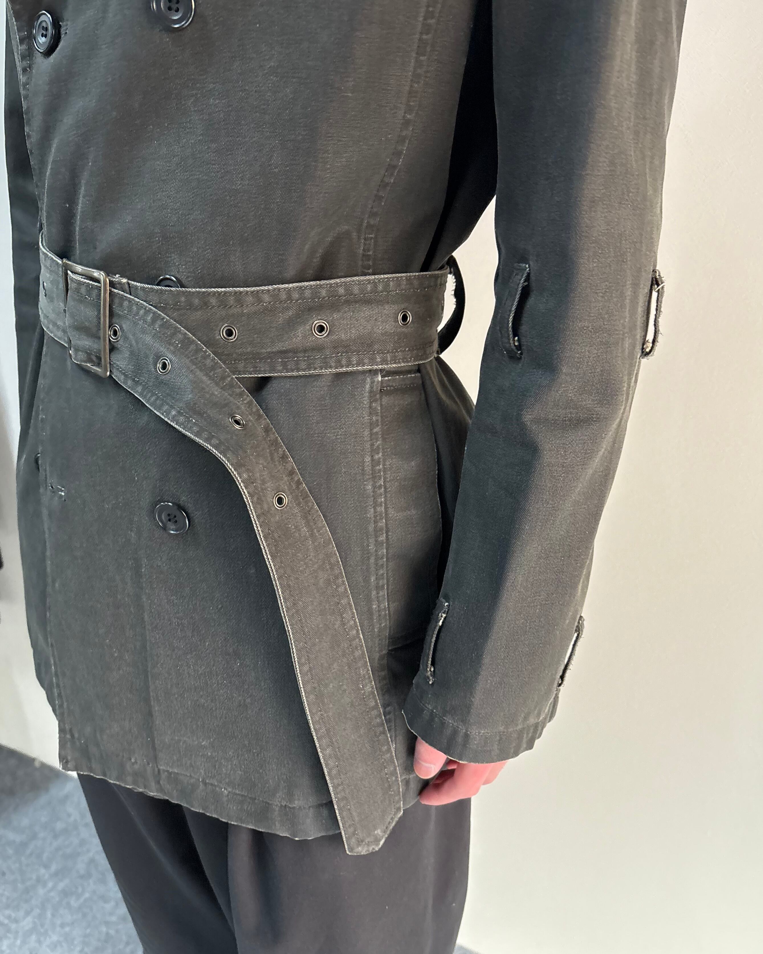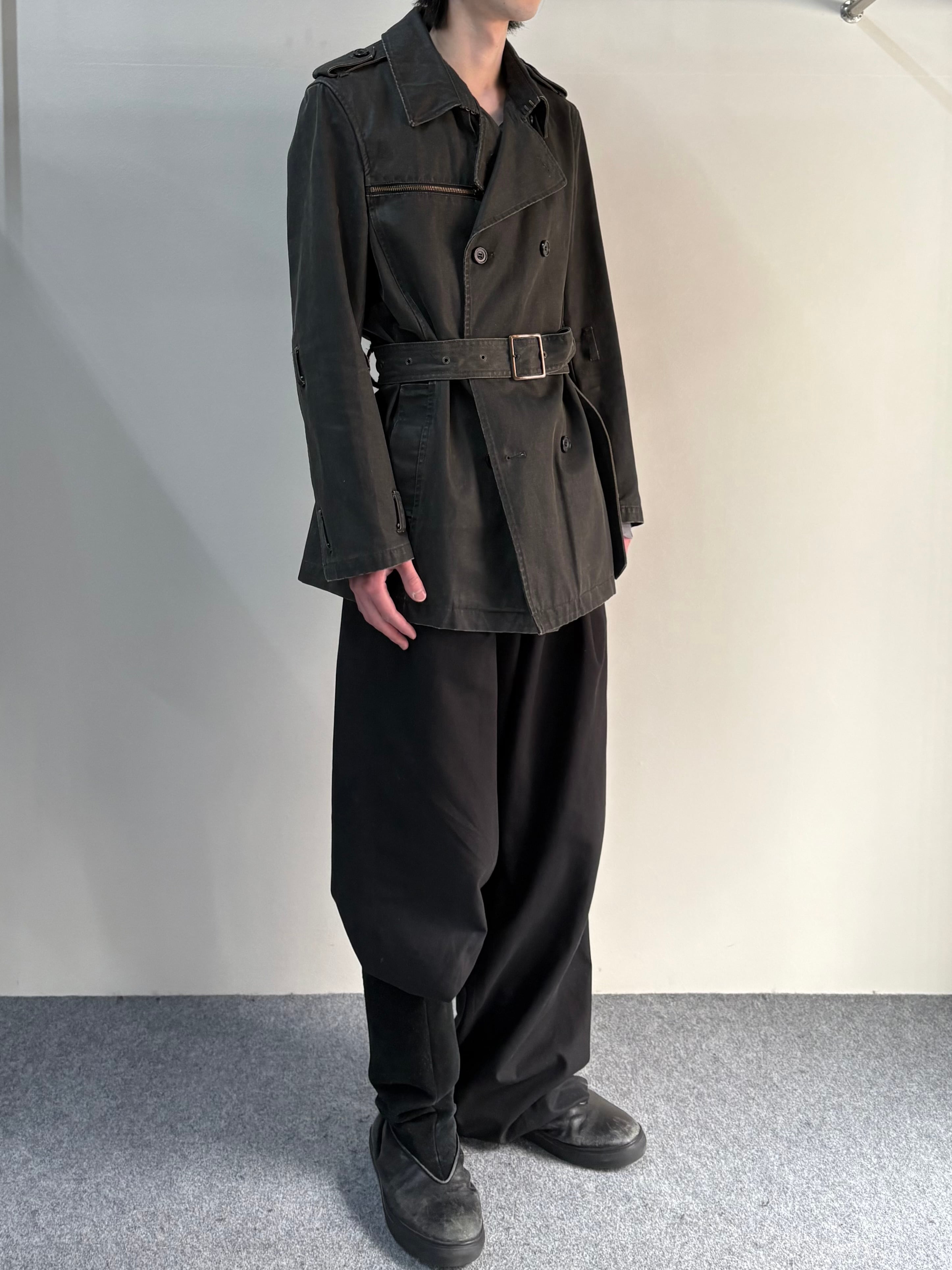 ややコンパクトな丈感と細身のシルエットでモード寄りに仕上げられた一着。コーティング加工されたムラ感のあるブラックカラーが、無骨さと退廃的な雰囲気を演出するアイテム。