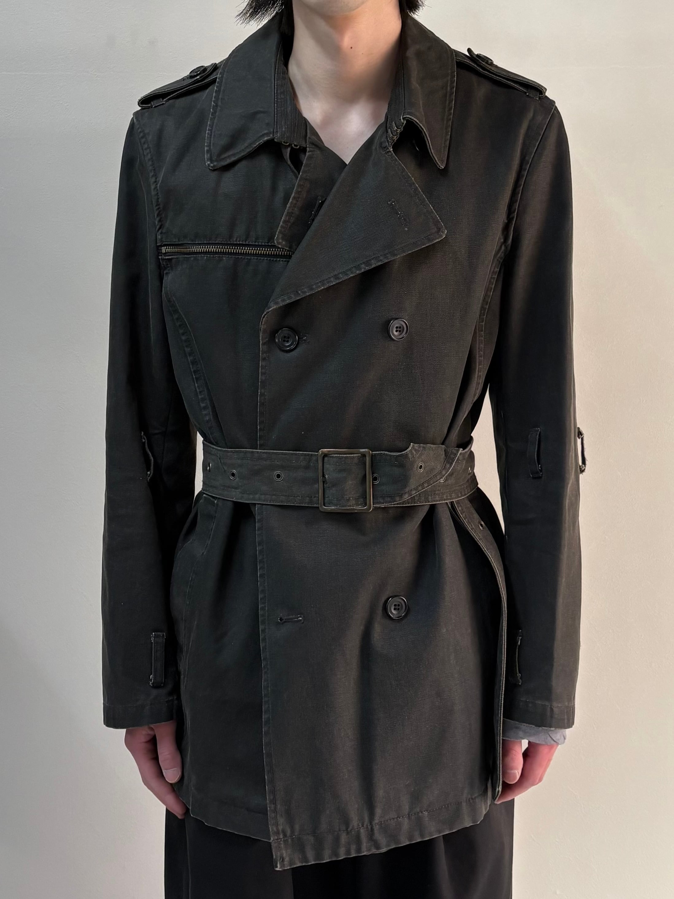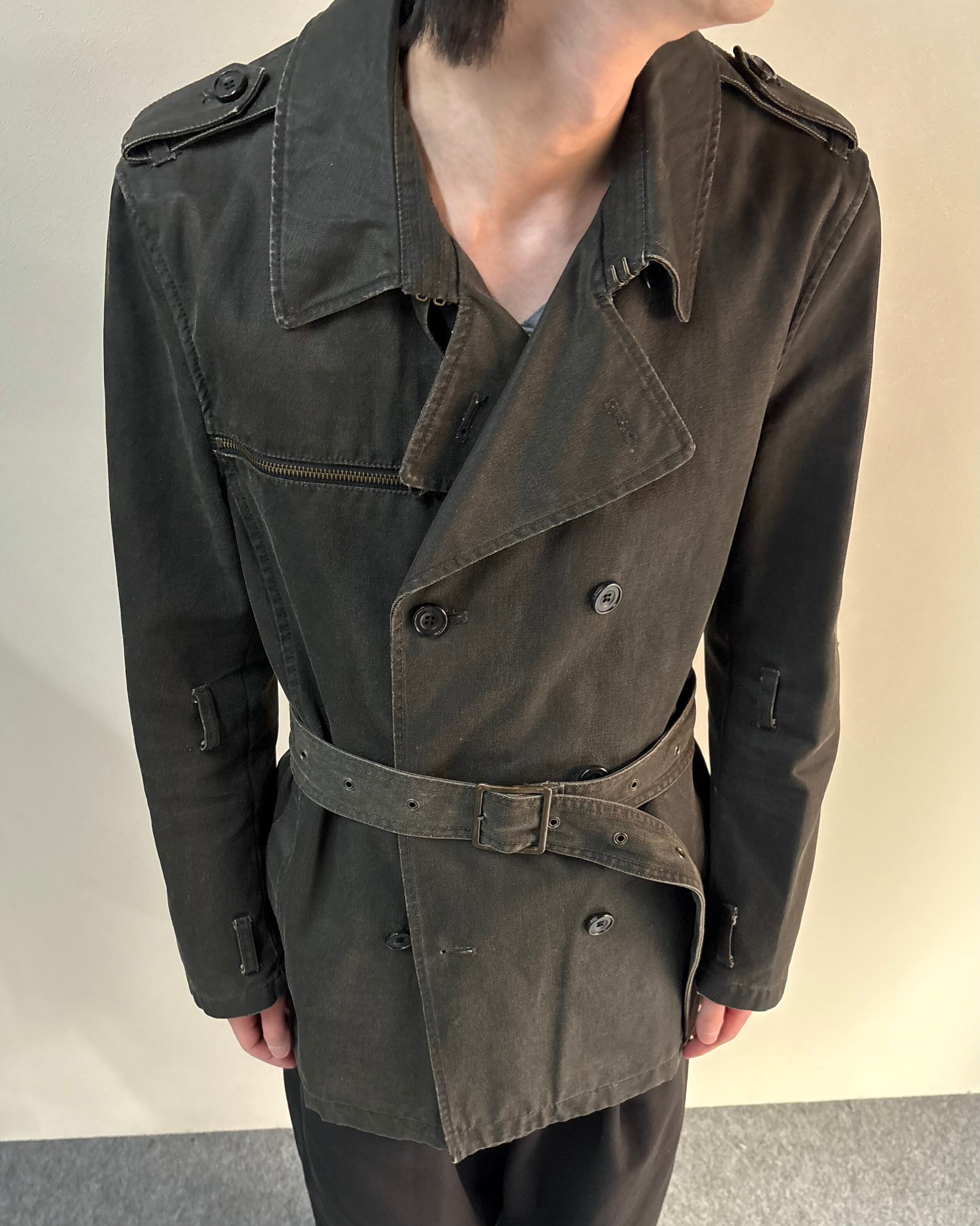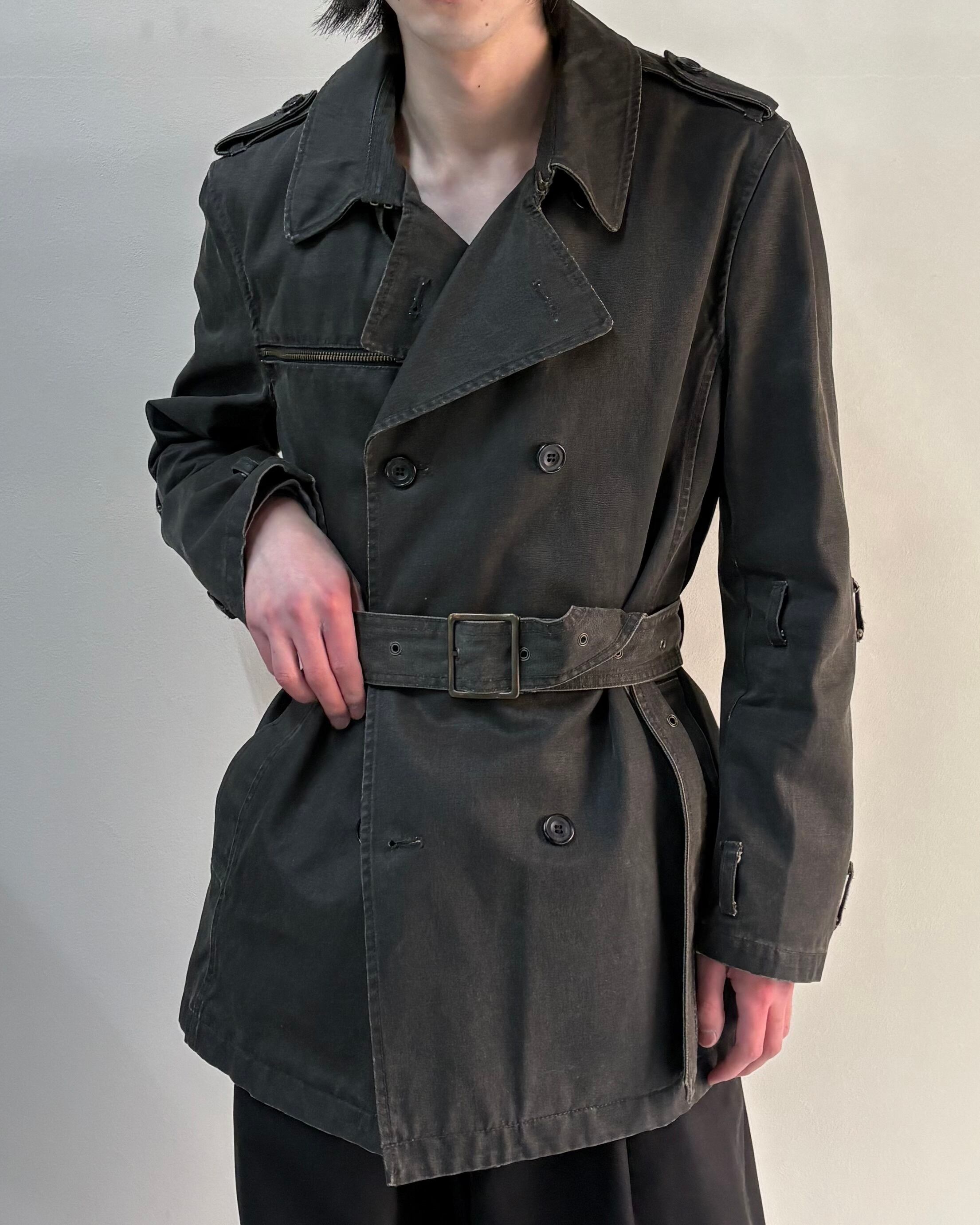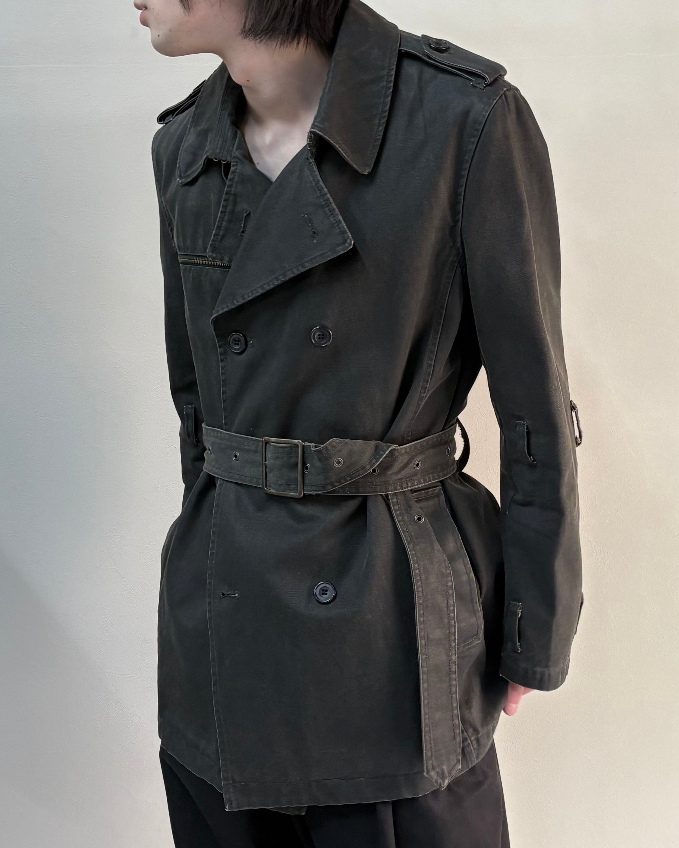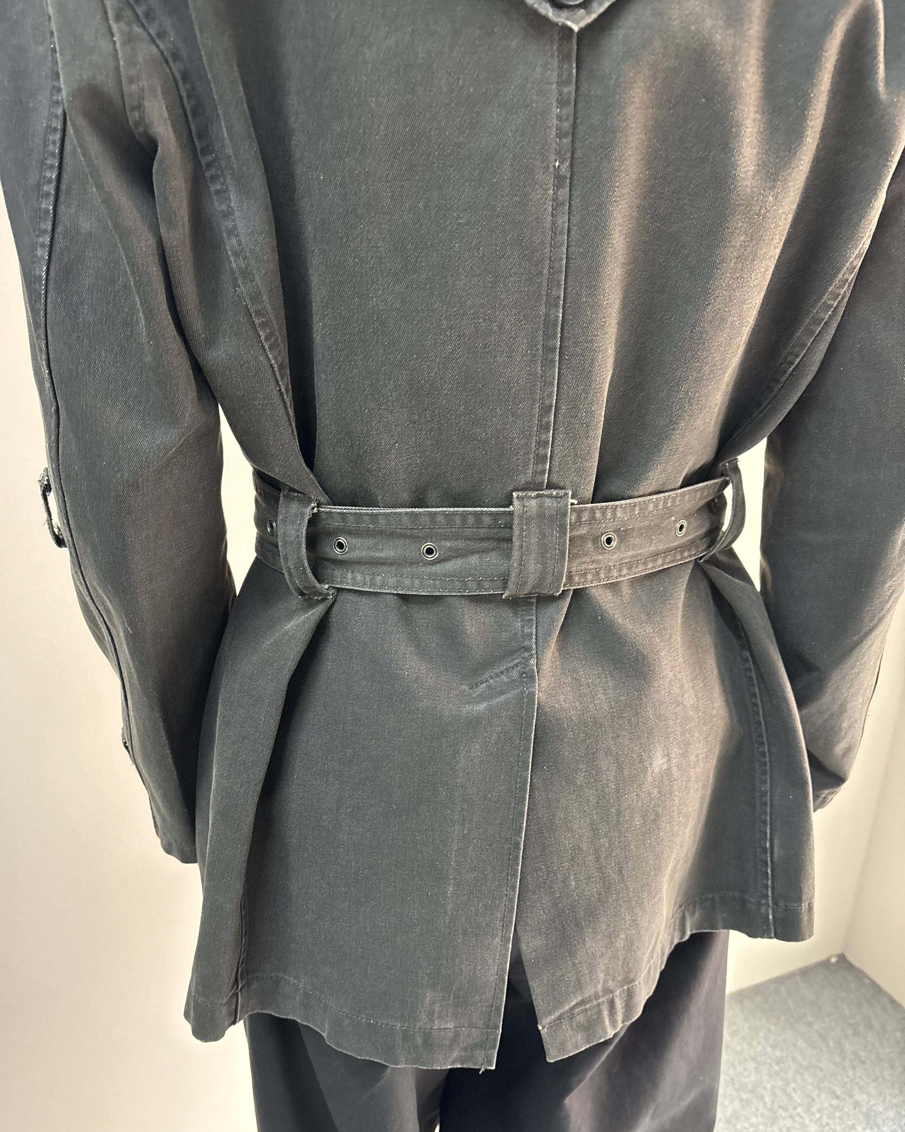 ややコンパクトな丈感と細身のシルエットでモード寄りに仕上げられた一着。コーティング加工されたムラ感のあるブラックカラーが、無骨さと退廃的な雰囲気を演出するアイテム。