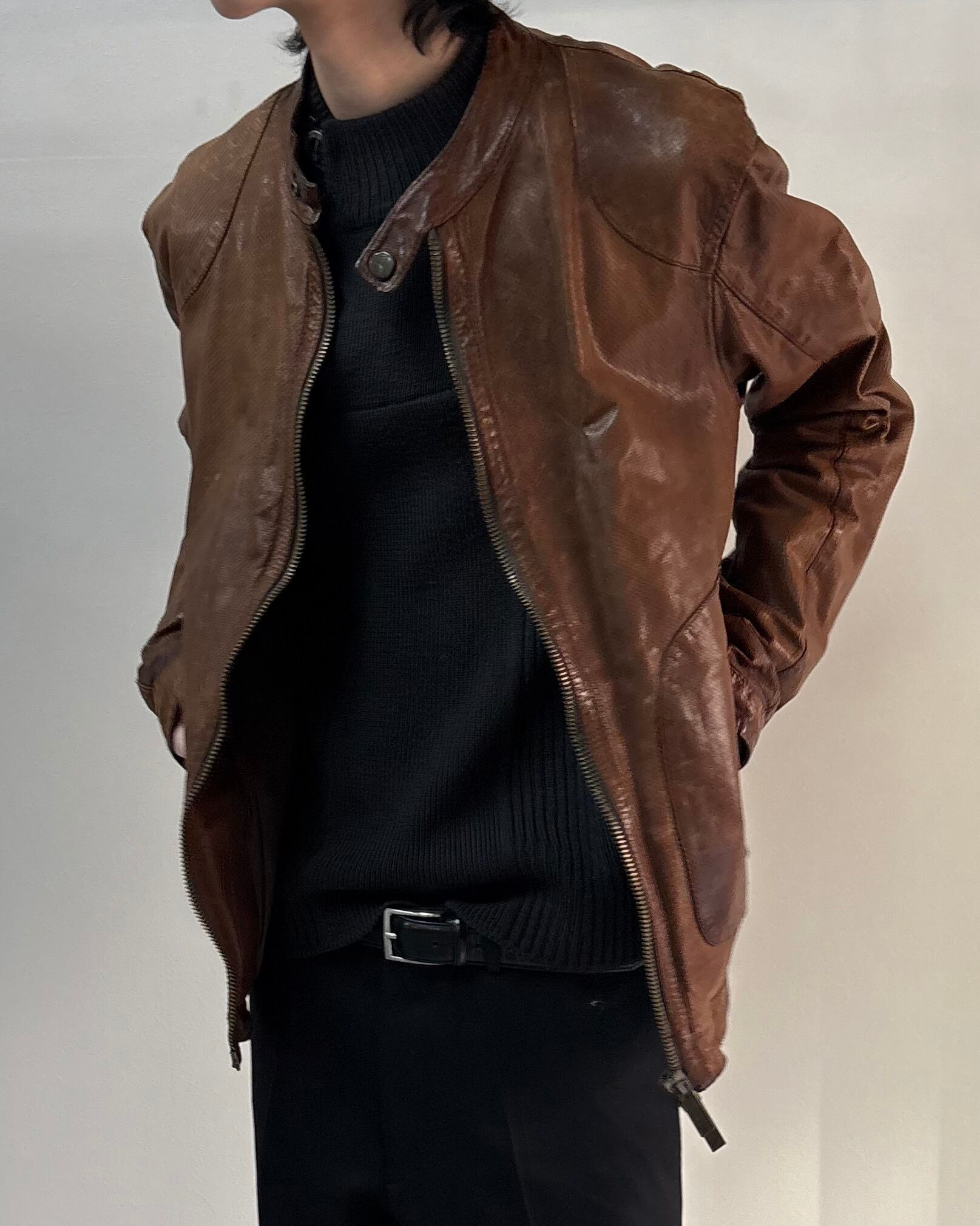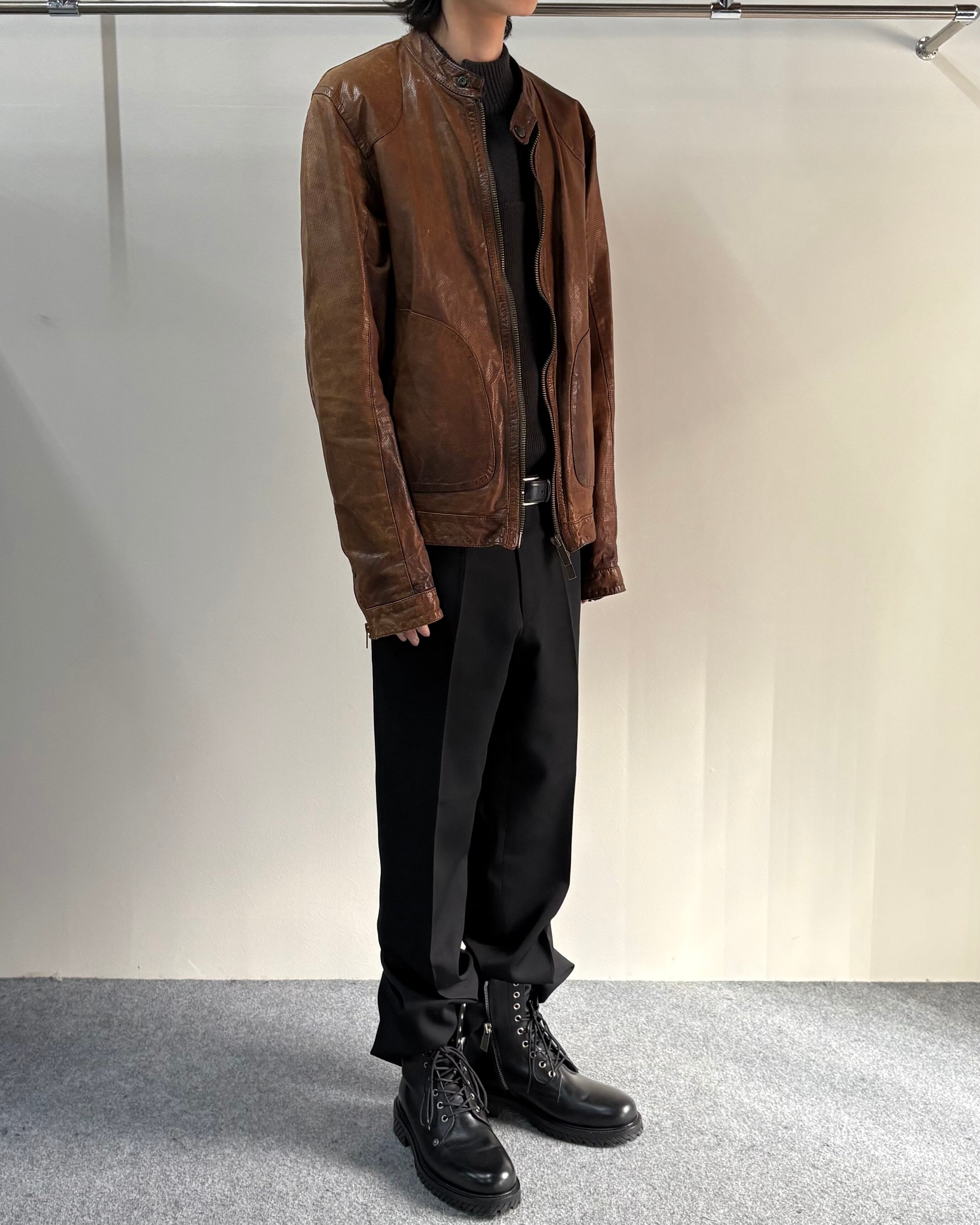 深みのあるダークベースなブラウンが無骨な印象を出しつつモダンな雰囲気にもマッチしやすく、ジャンルレスに幅広く活躍できる1着