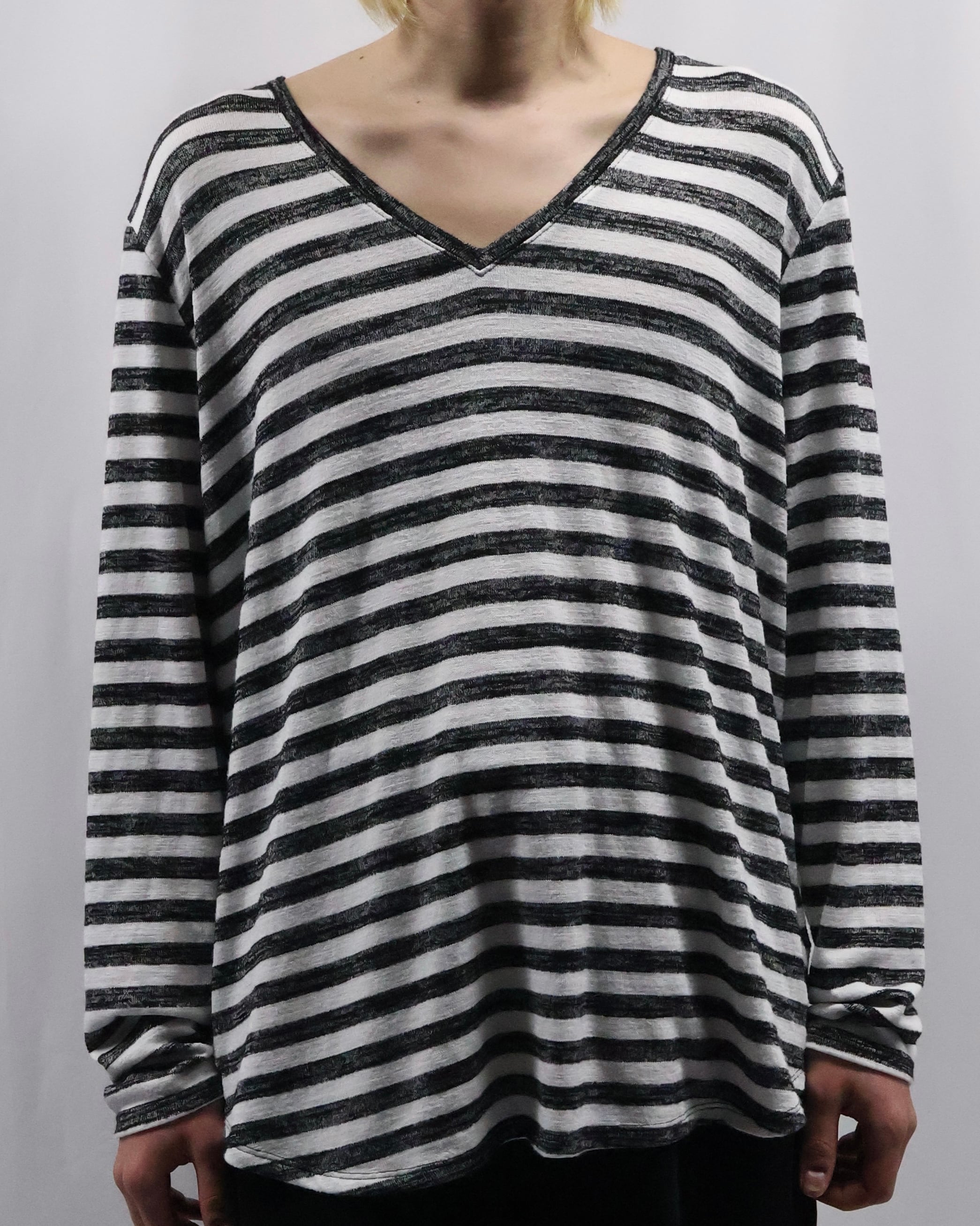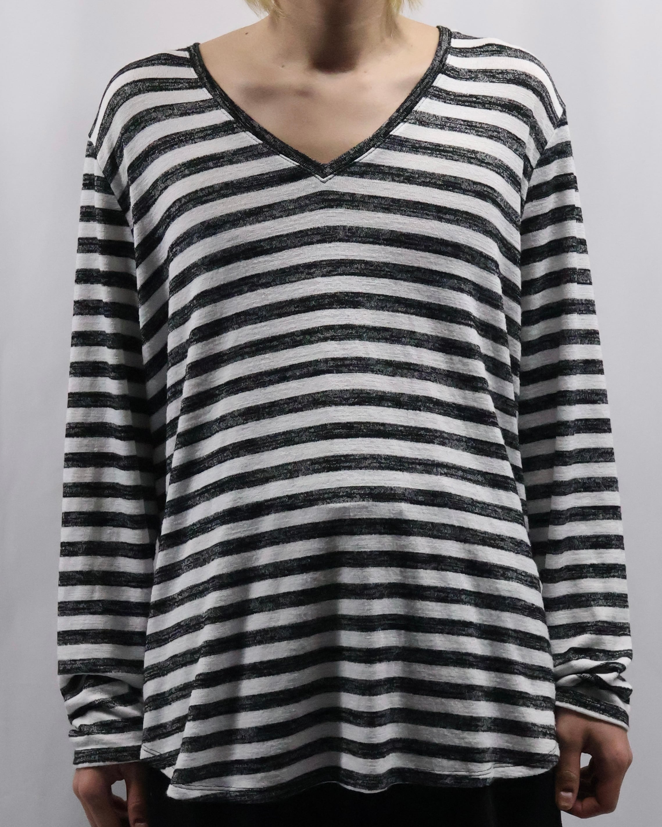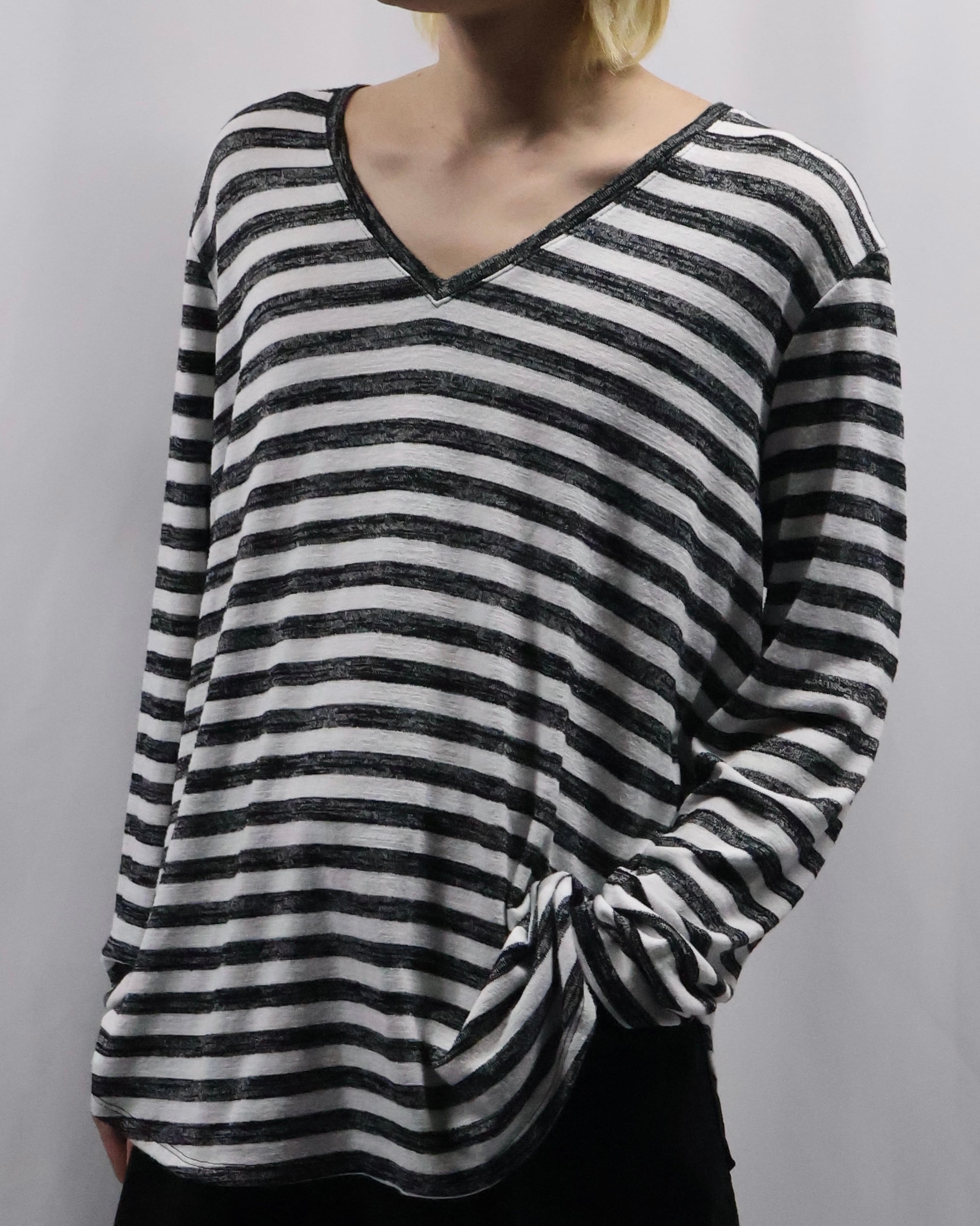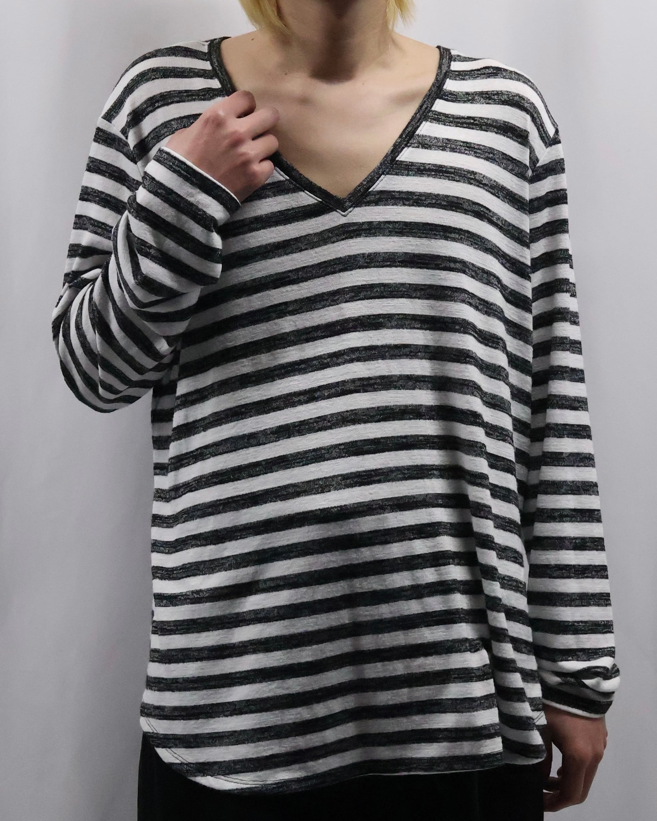 ボーダーのデザインが可愛らしい、Vネックトップス。ハンドペイントされたような味わいのあるボーダーでチープに見えない柄に仕上がっており、春先の柄物をお探しの方には是非お勧めしたい一枚。