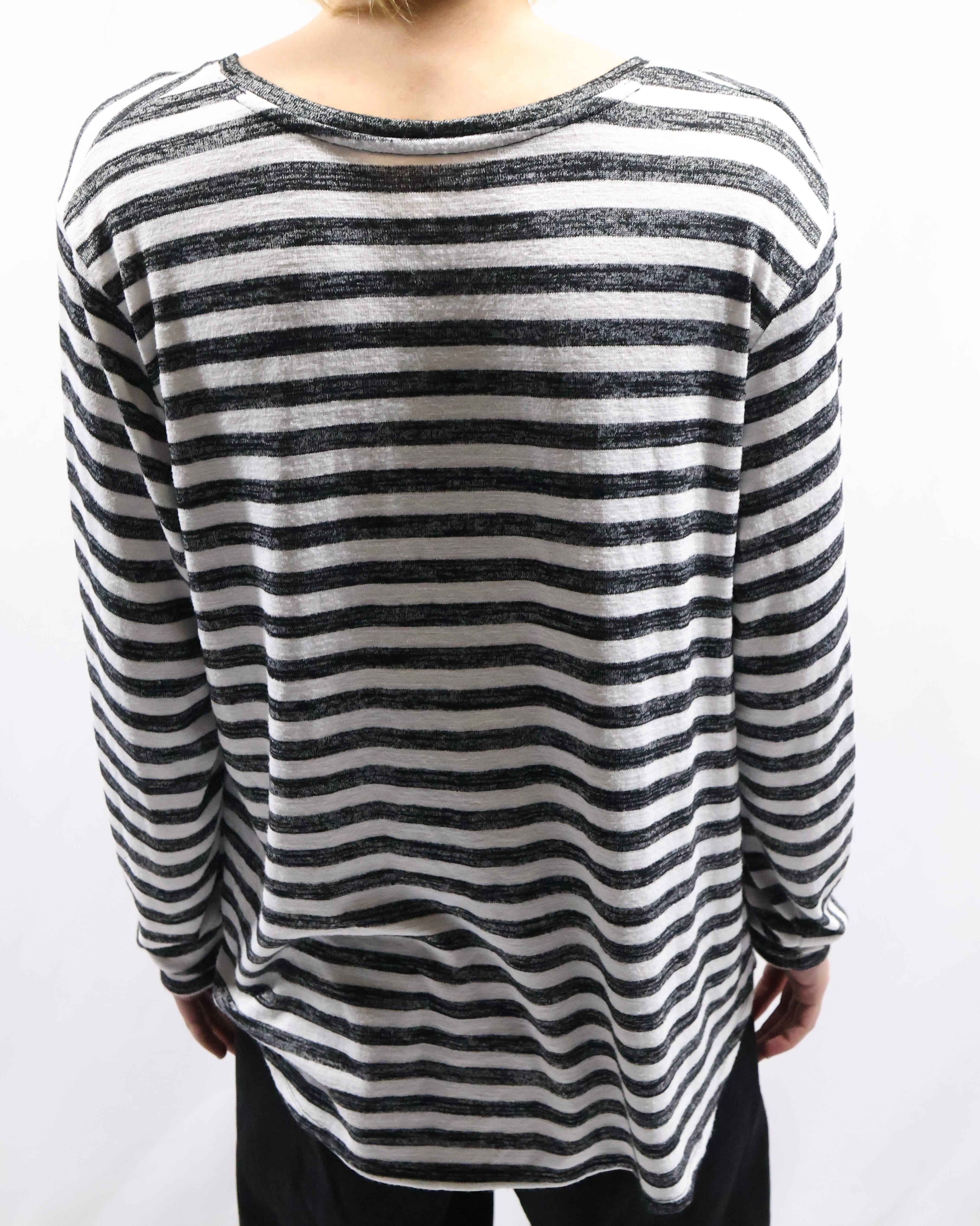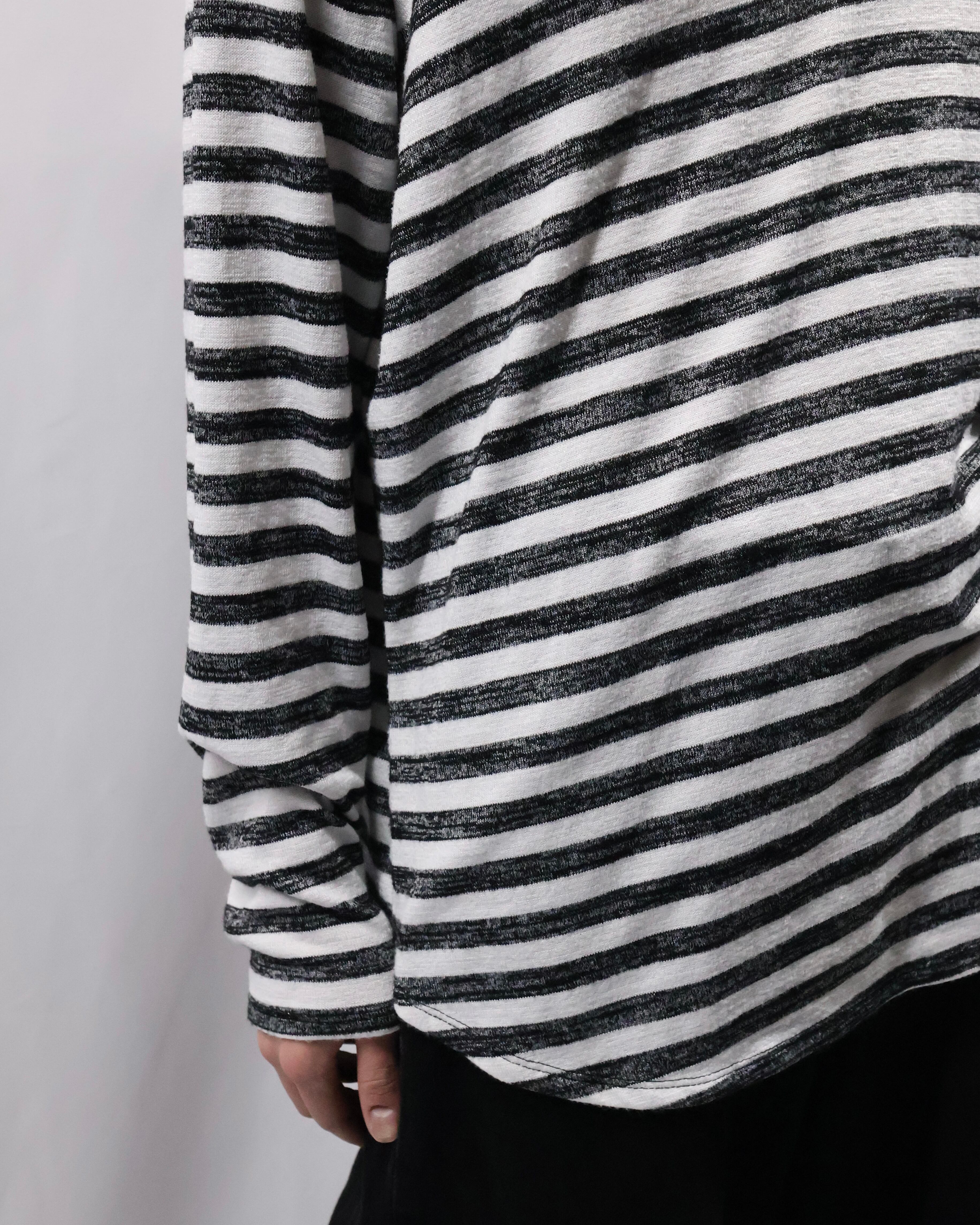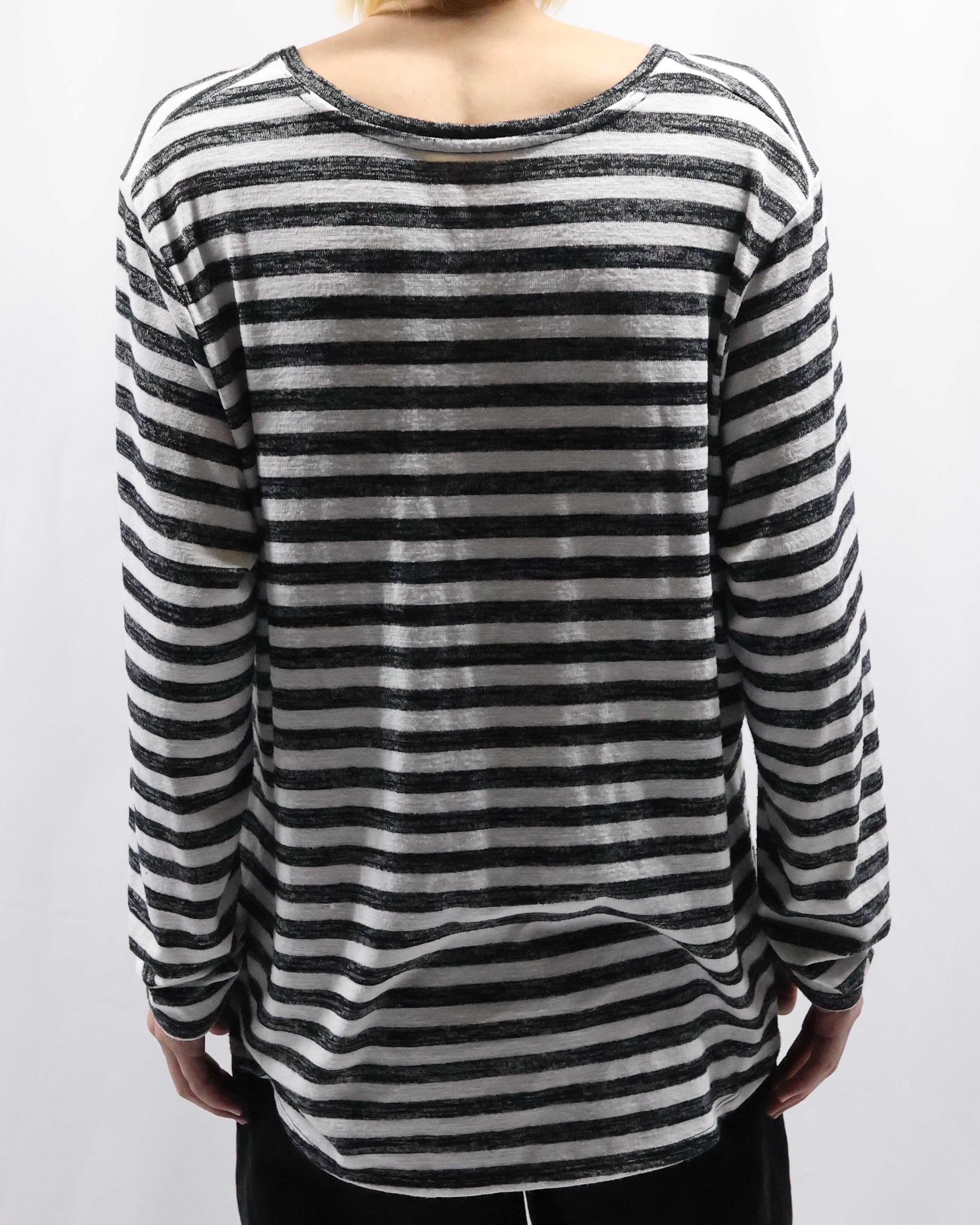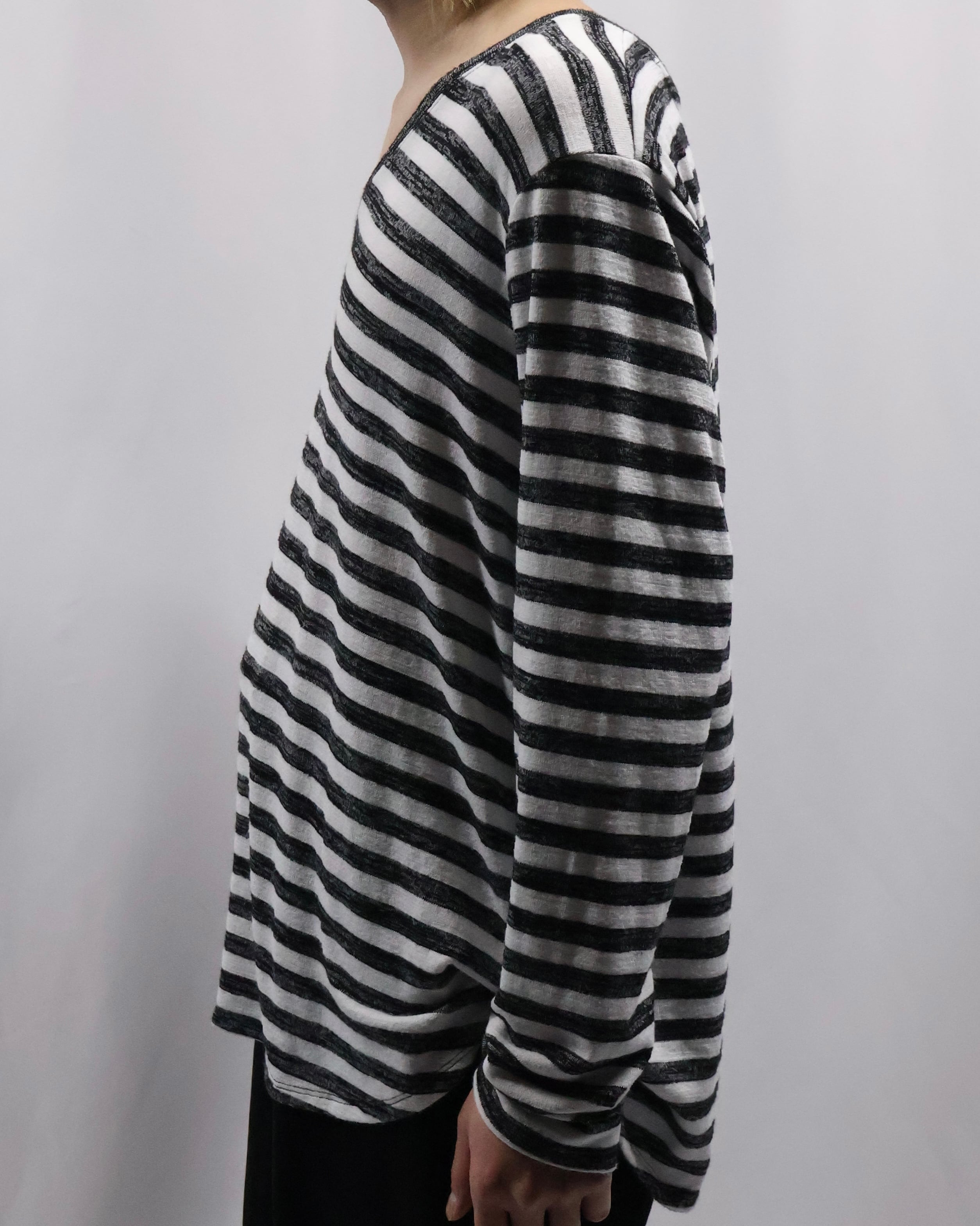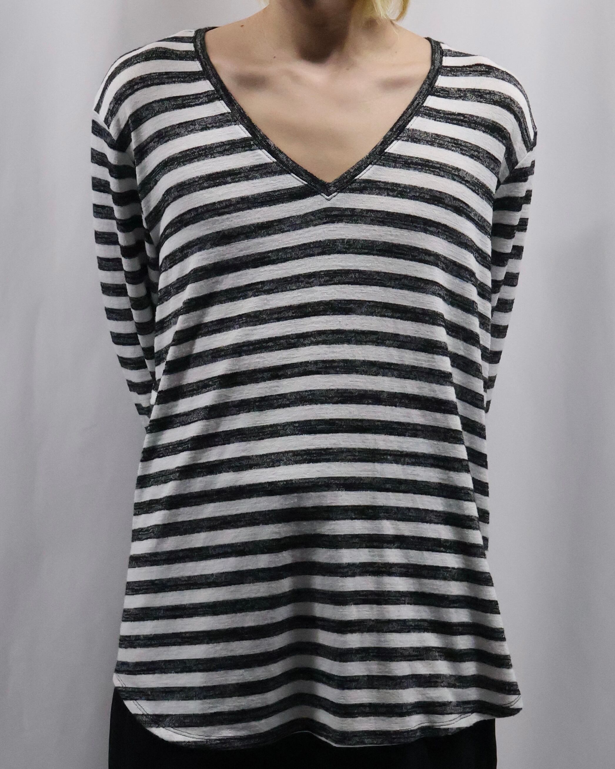 ボーダーのデザインが可愛らしい、Vネックトップス。ハンドペイントされたような味わいのあるボーダーでチープに見えない柄に仕上がっており、春先の柄物をお探しの方には是非お勧めしたい一枚。
