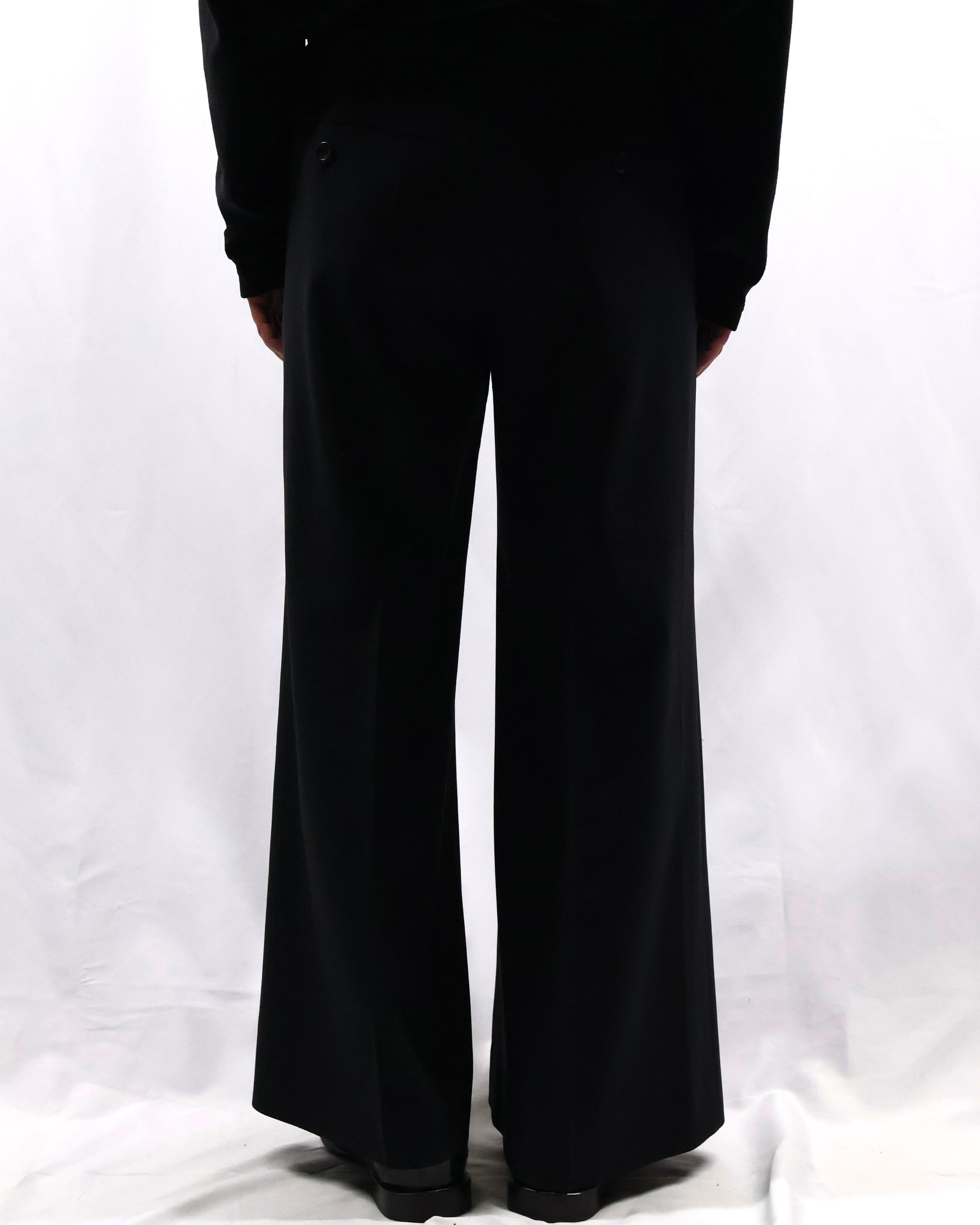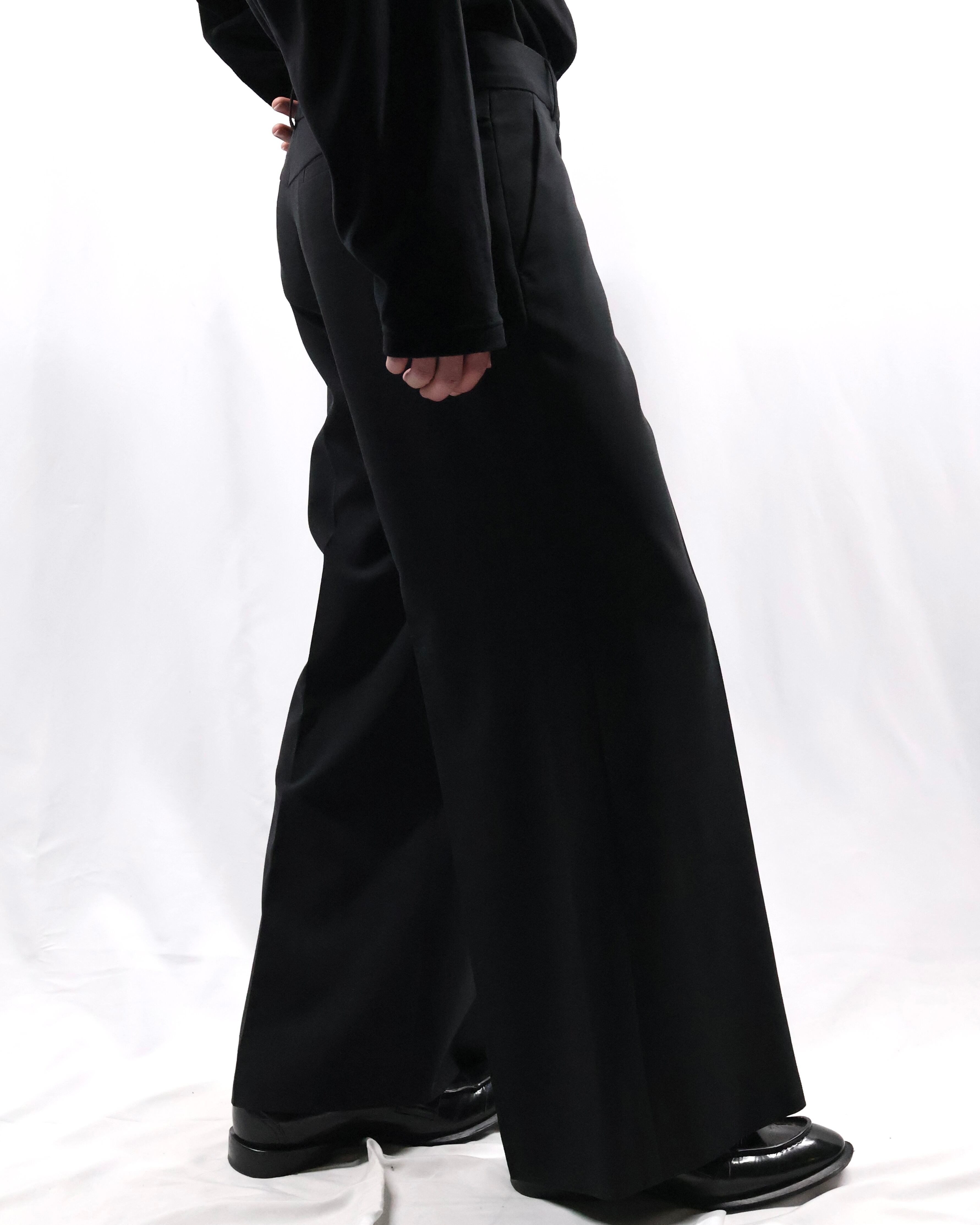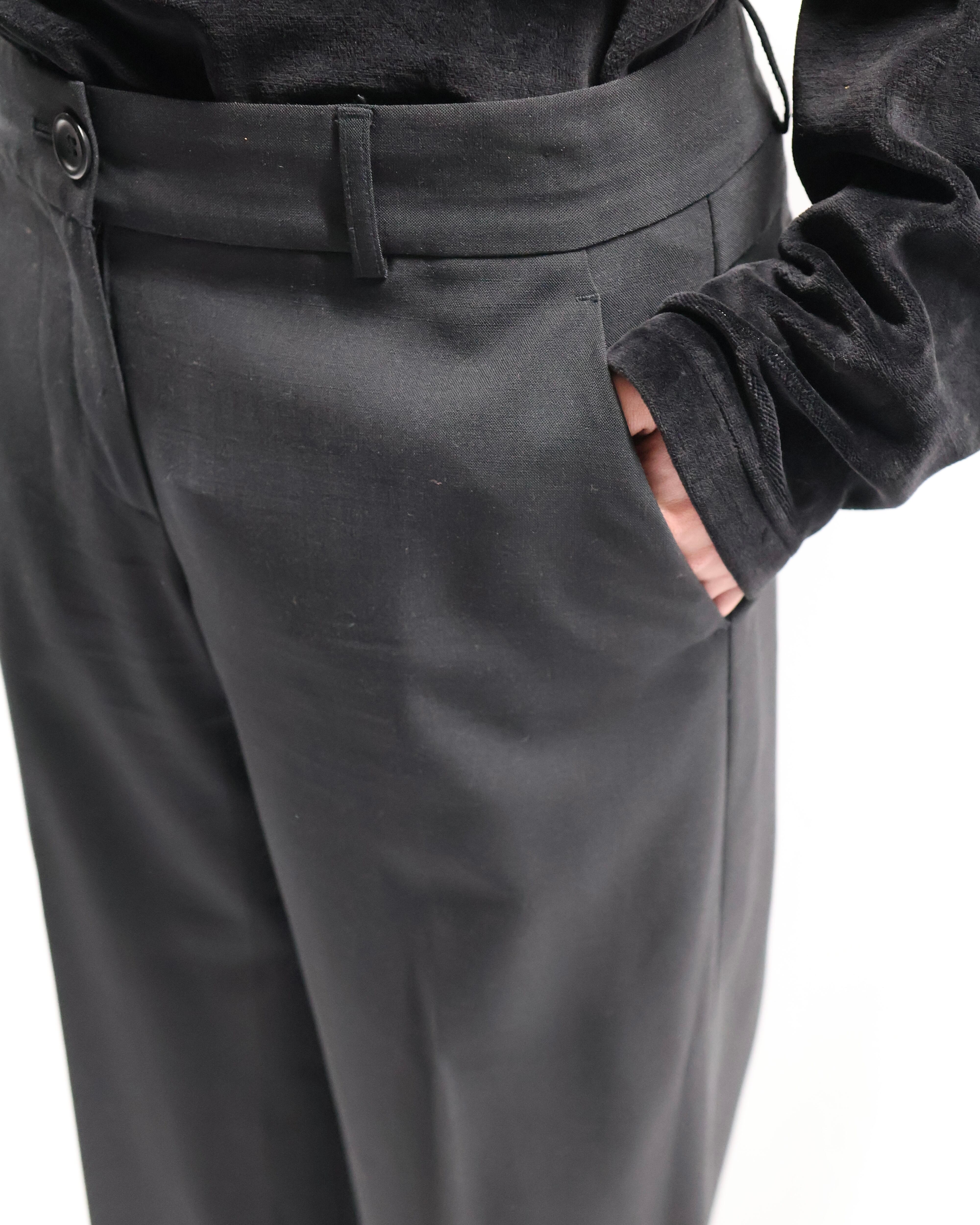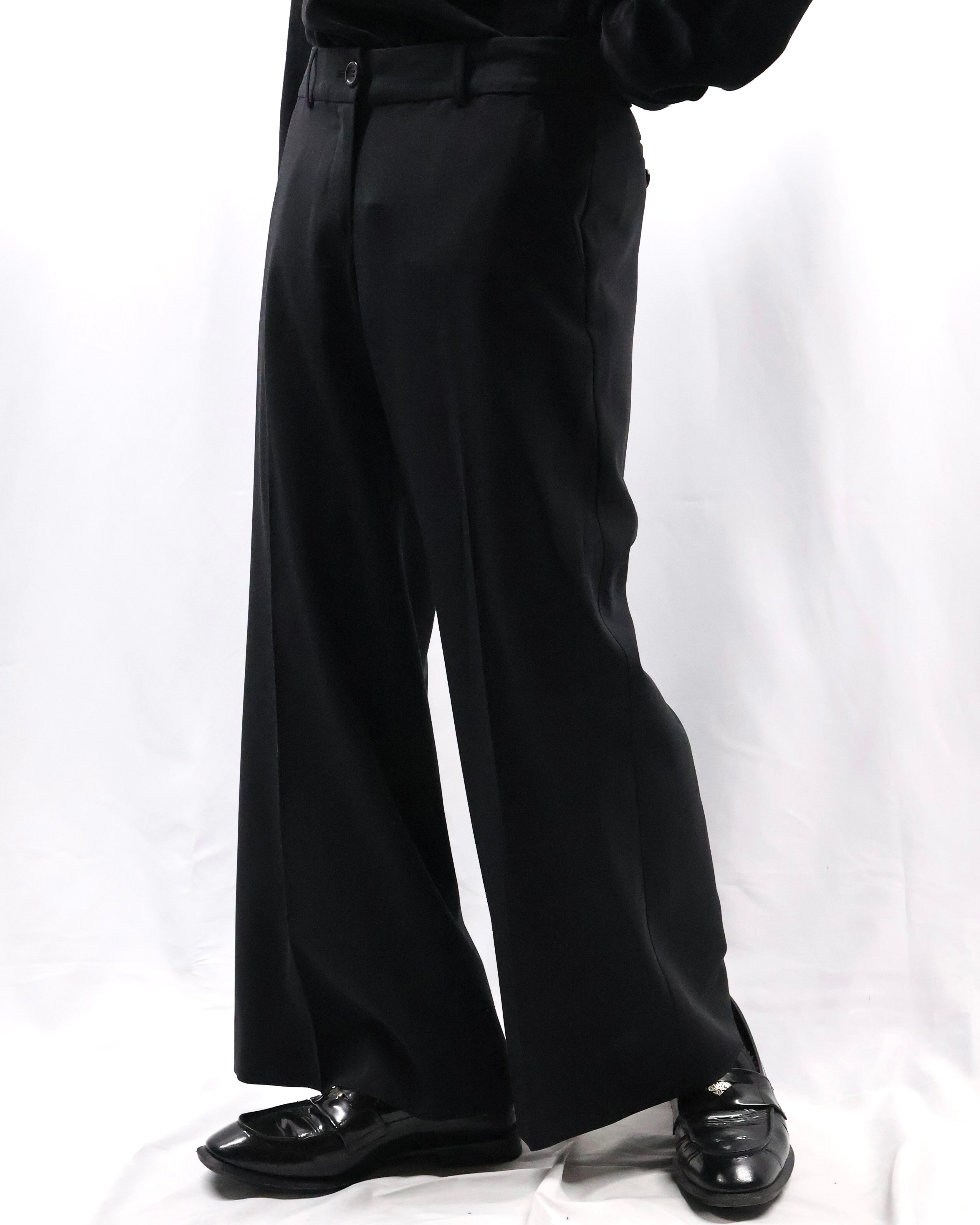 センタープレスの入った落ち感のある生地でドレスな印象もありながら、クロップド丈の為ブーツ合わせやソックスを見せるスタイルなど幅広くスタイリングが楽しめるアイテム。