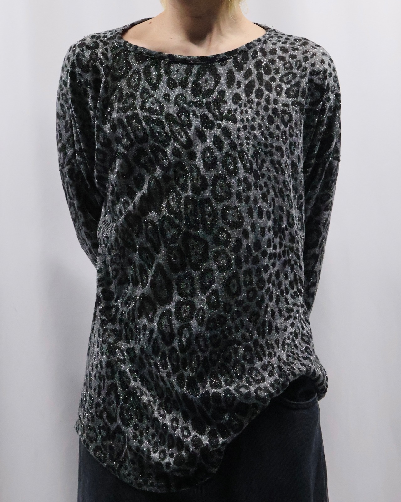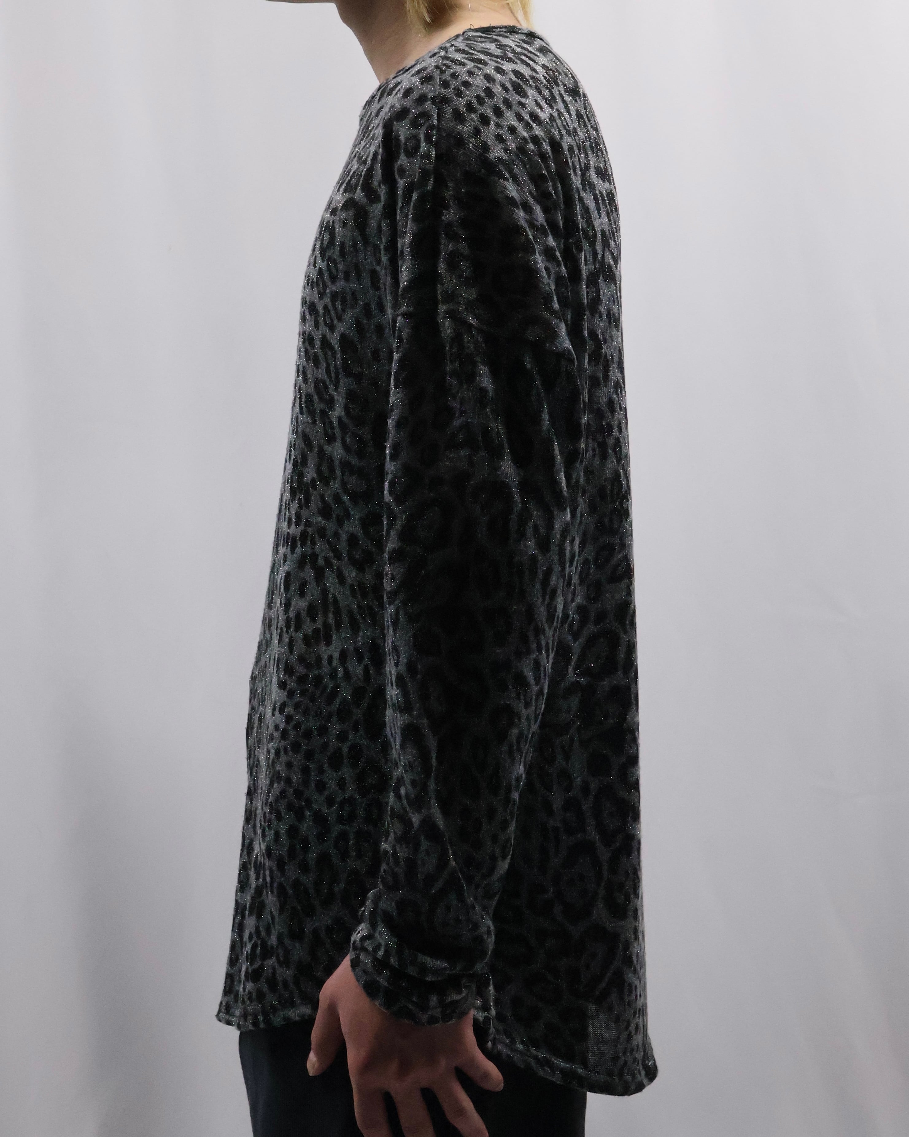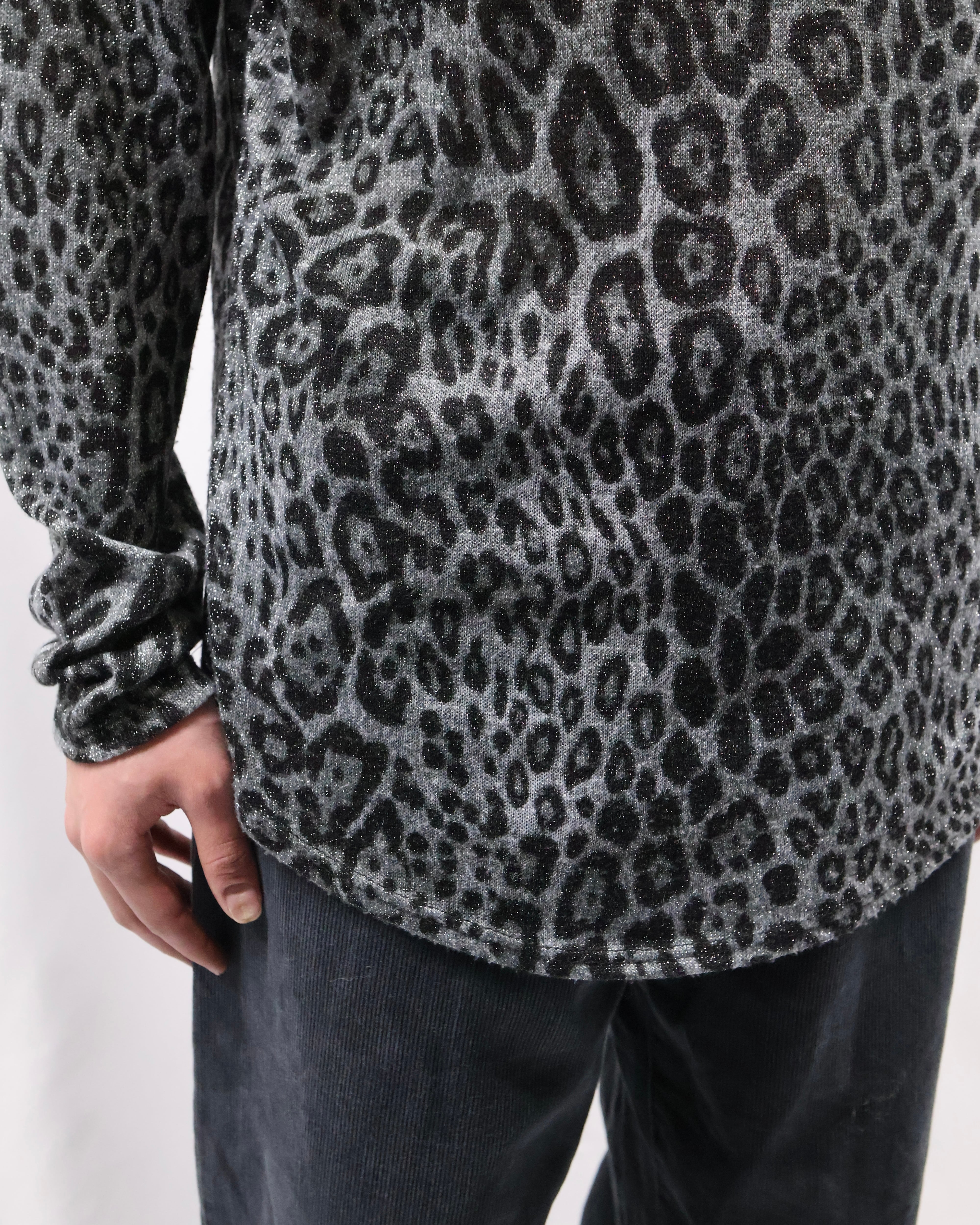 インナーとして優秀なラメとレオパードのデザインがあしらわれたトップス。ラメとレオパードという華美なデザインをダークトーンで表現することで、ファッション性は高く、合わせやすさも考慮されたファッションできる一枚。