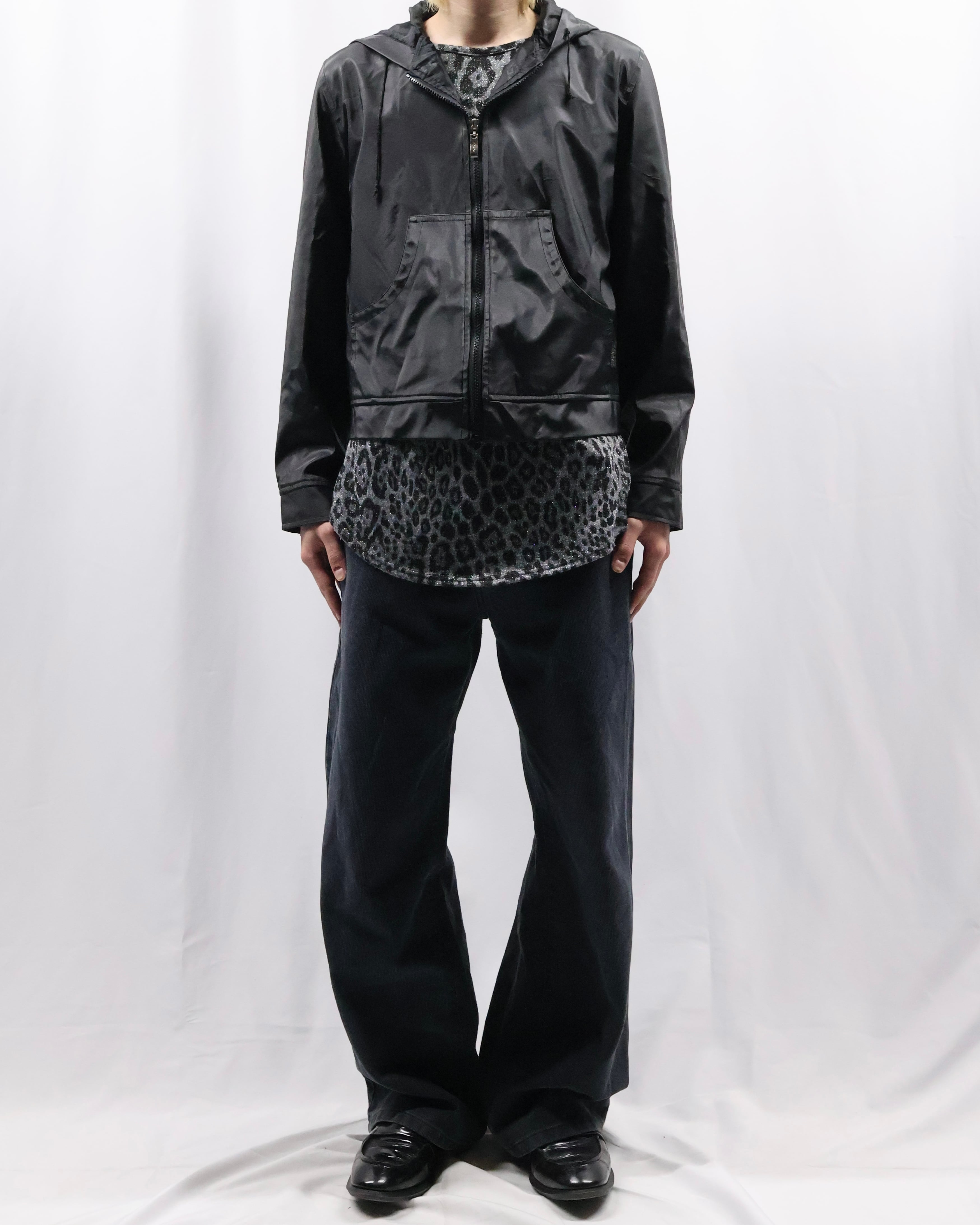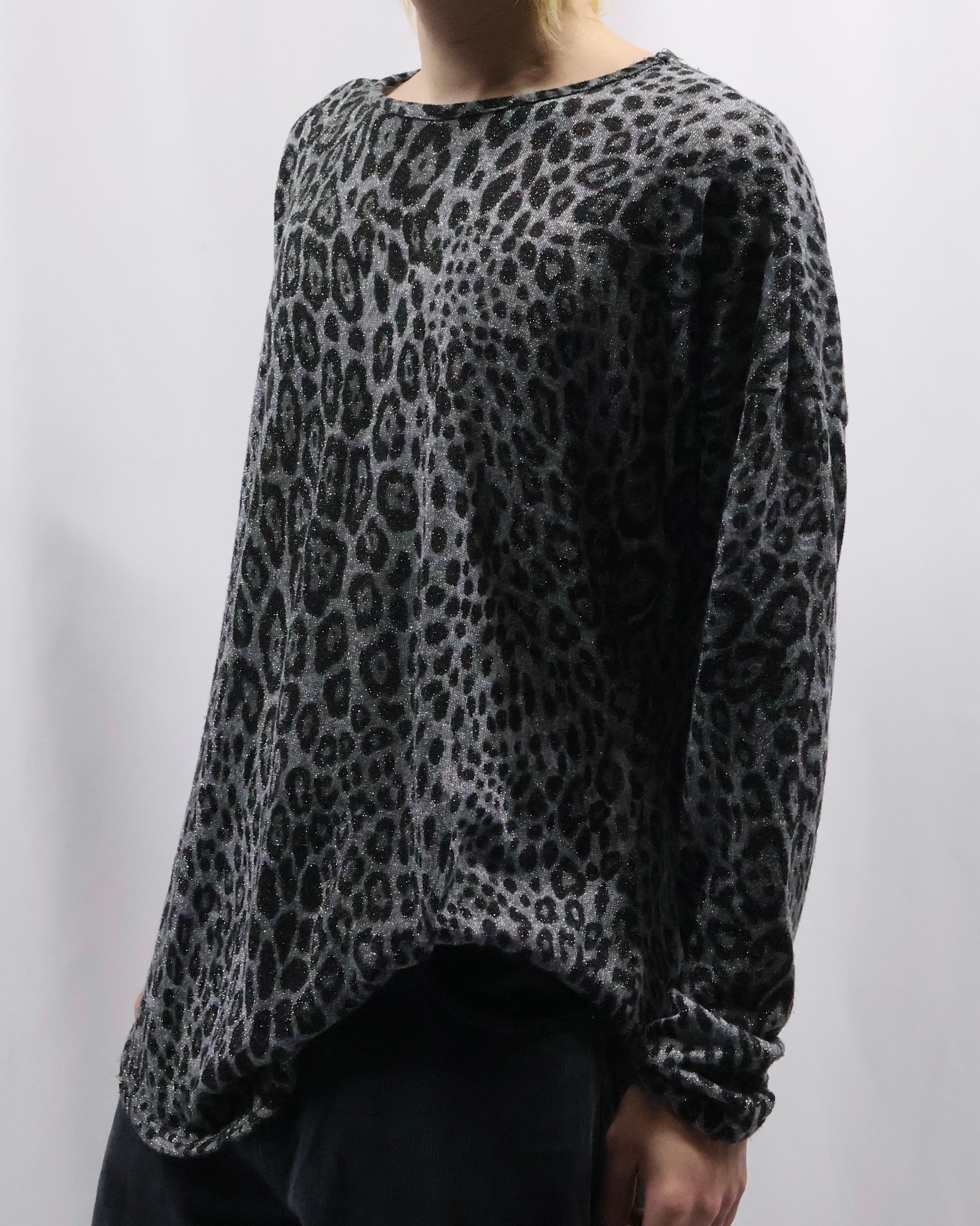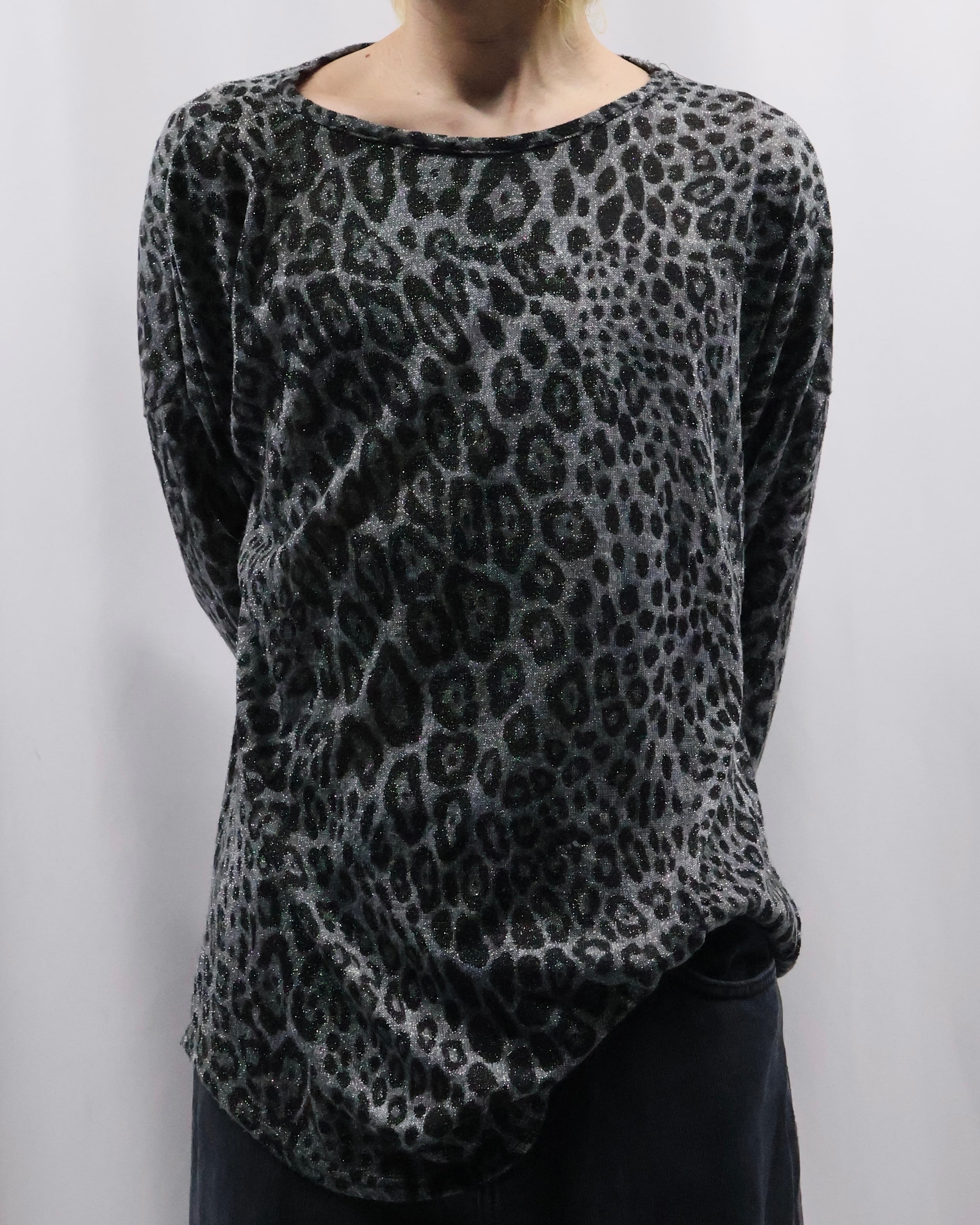 インナーとして優秀なラメとレオパードのデザインがあしらわれたトップス。ラメとレオパードという華美なデザインをダークトーンで表現することで、ファッション性は高く、合わせやすさも考慮されたファッションできる一枚。