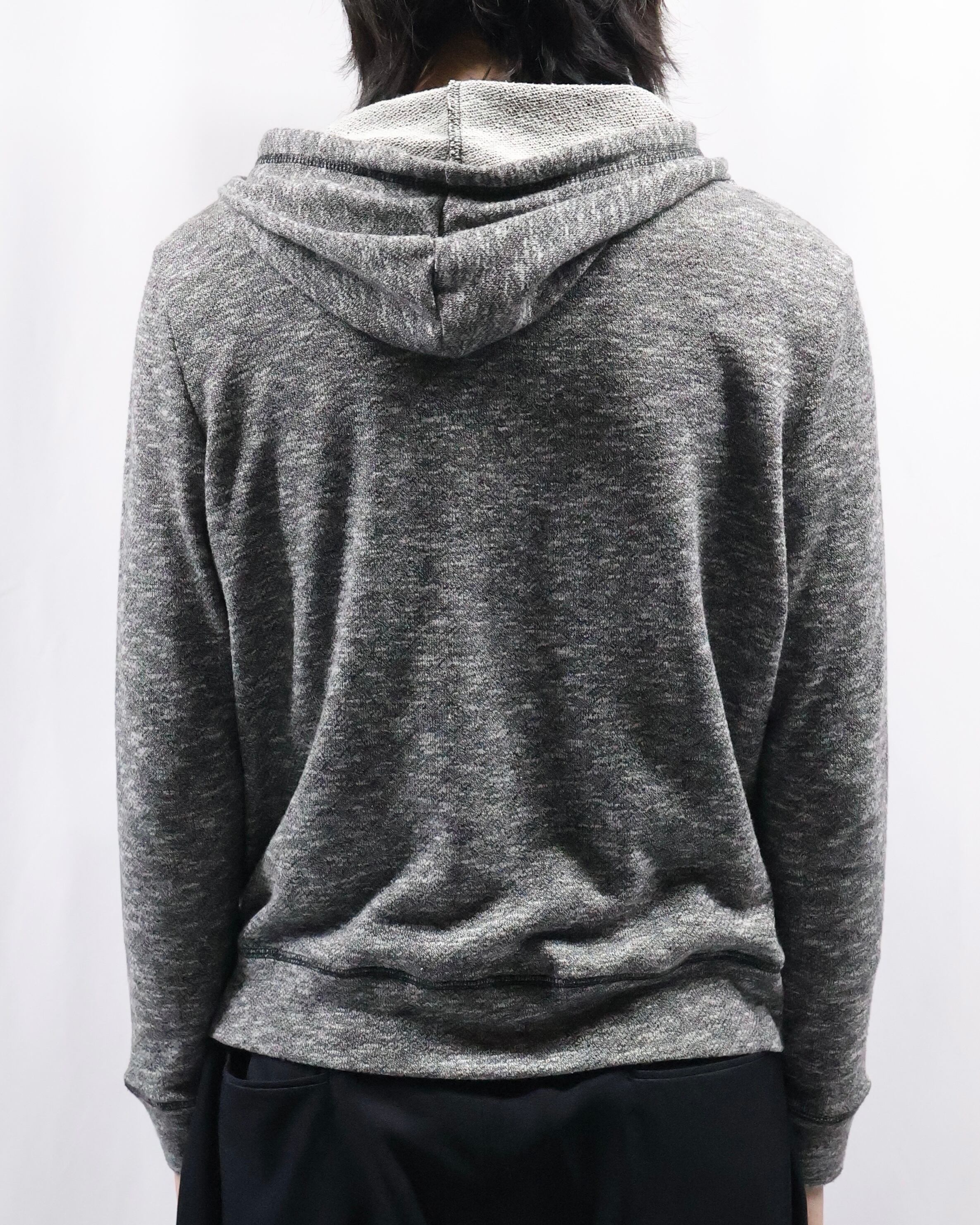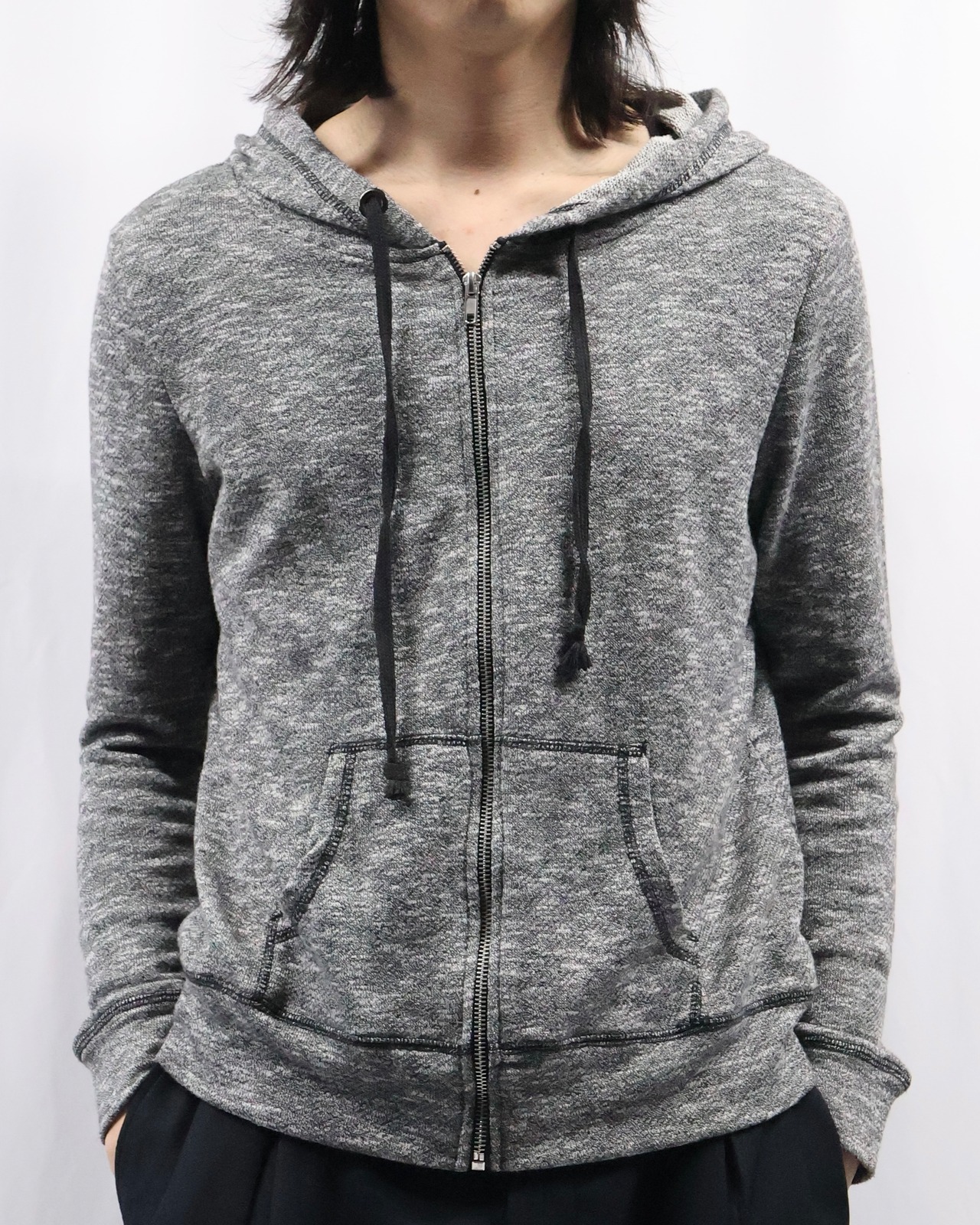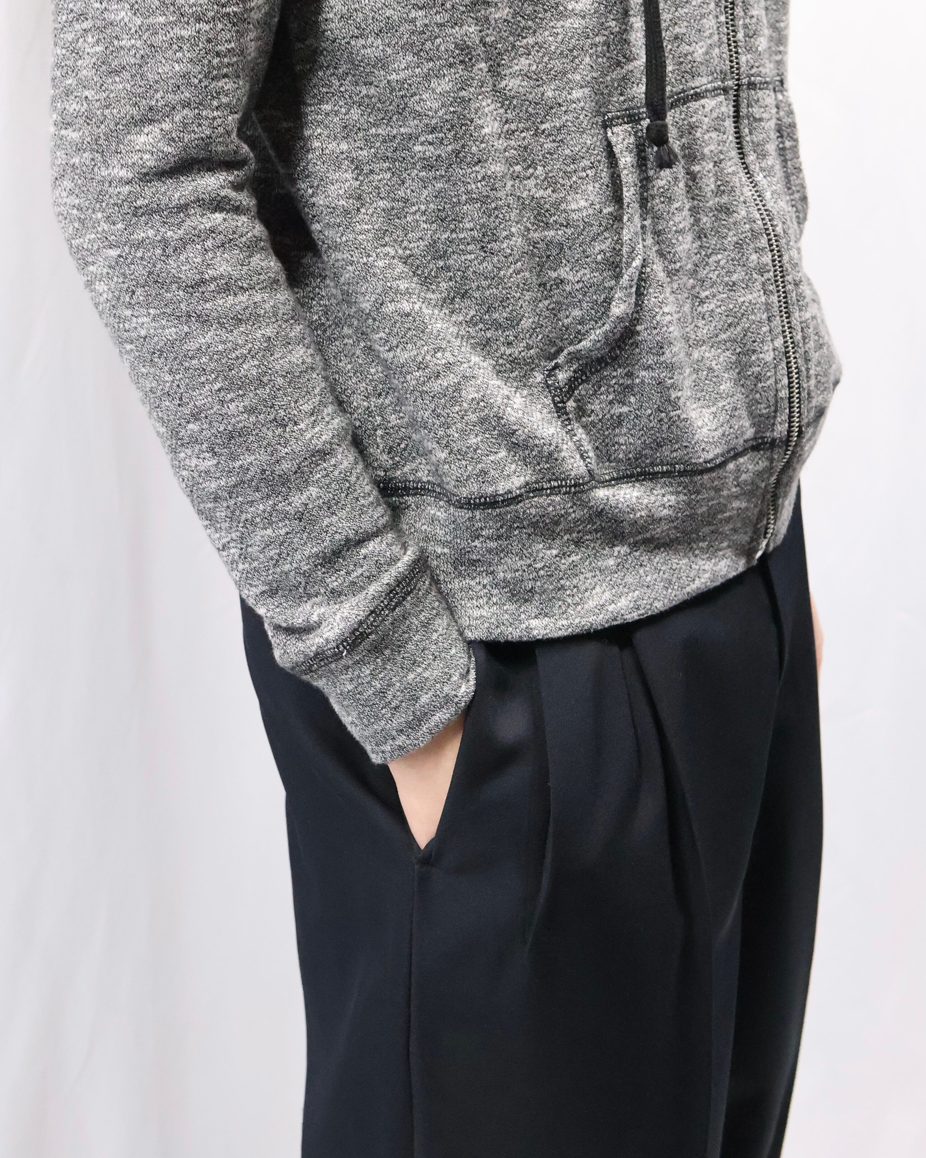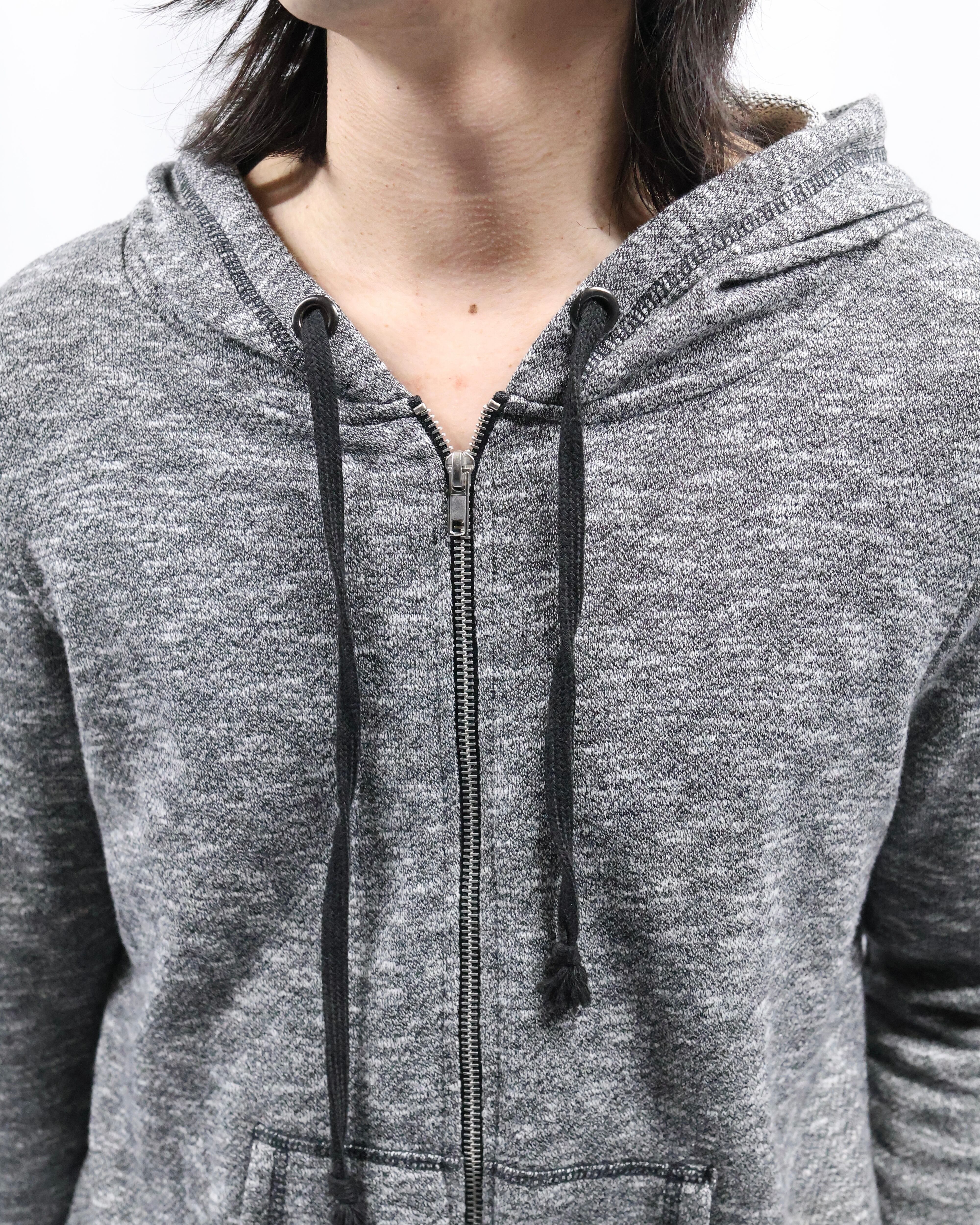 インナーとして優秀なジップアップのグレーフーディ。クラシックからカジュアルまで、幅広いインナーとして、適度な抜け感やこなれ感を演出してくれる一枚。