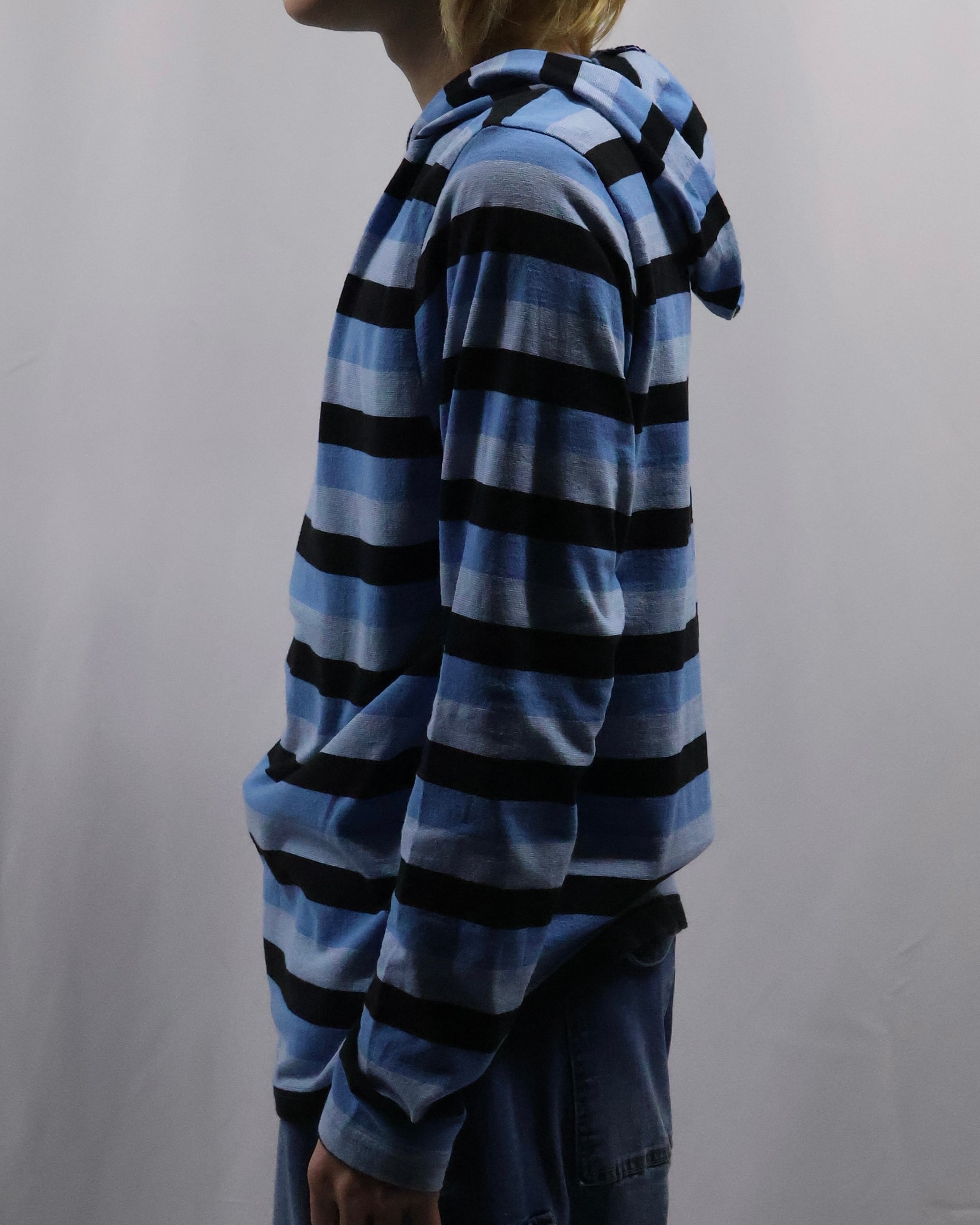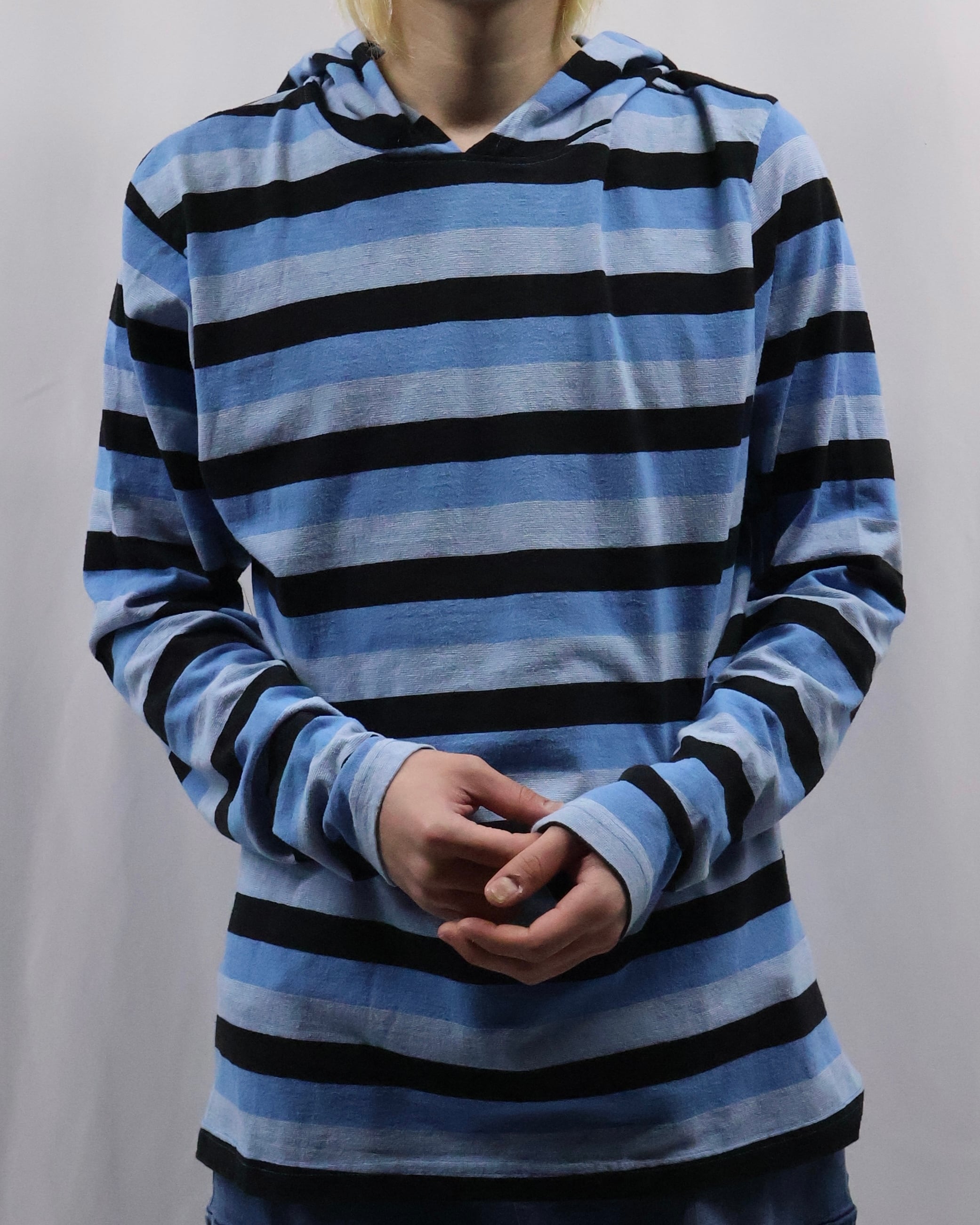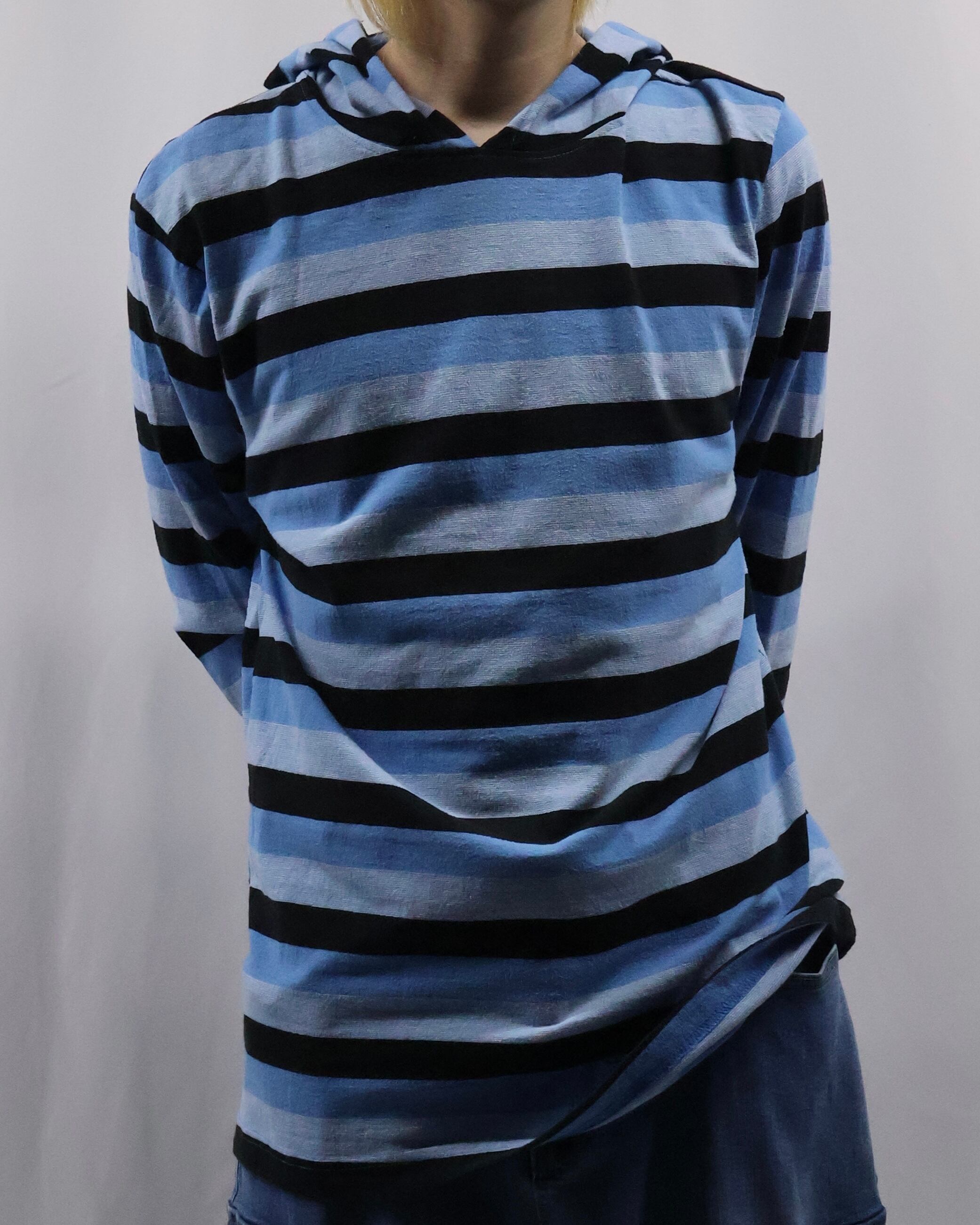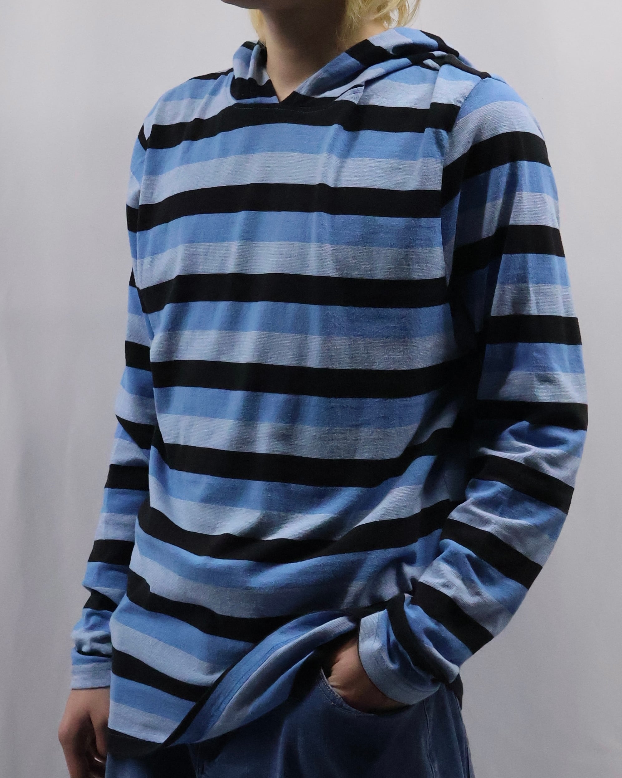 インナーとして存在感を発揮する薄地のフーディ。色味のインパクトはありつつ細かいボーダーで、外しすぎずファッションできる優秀な一枚
