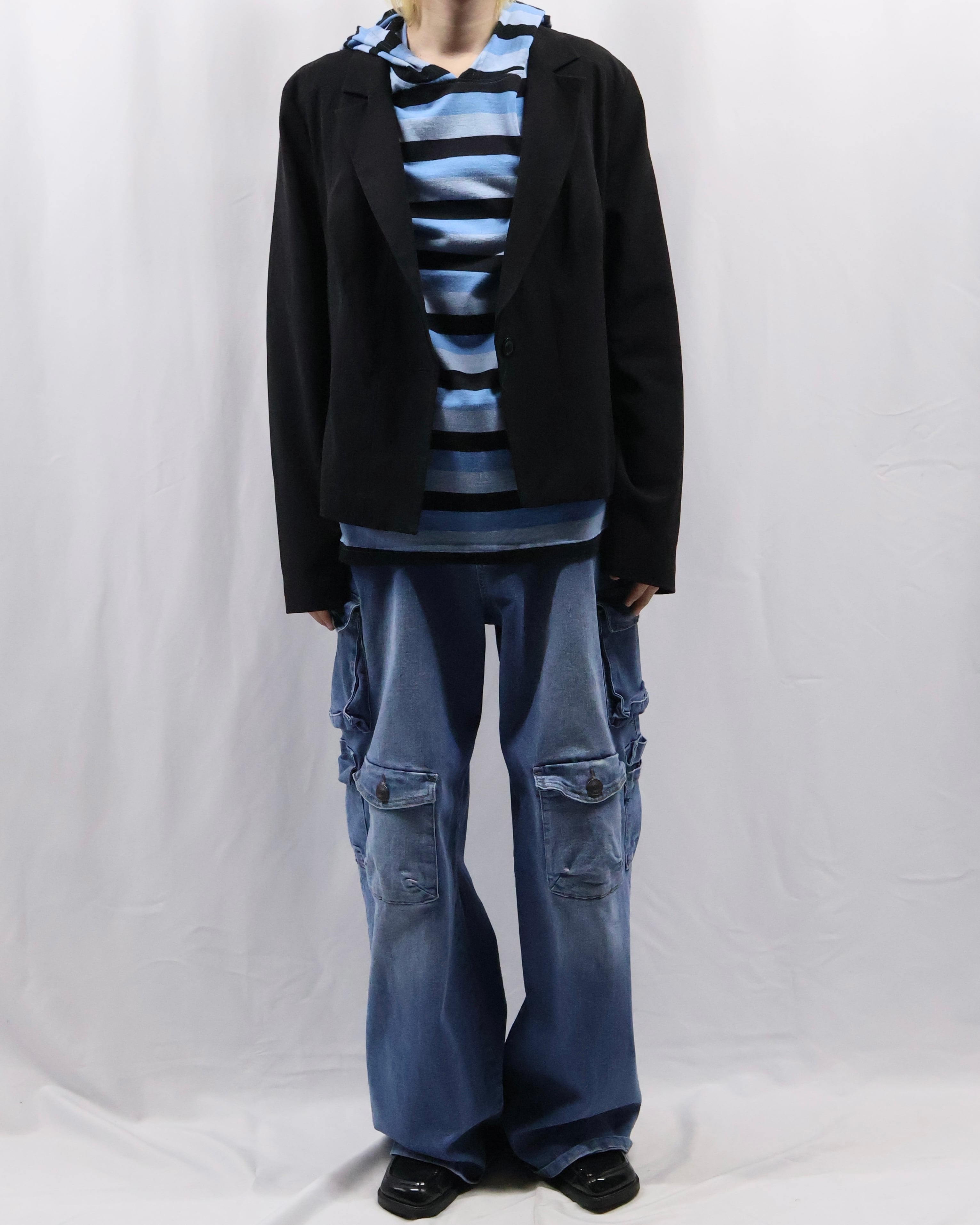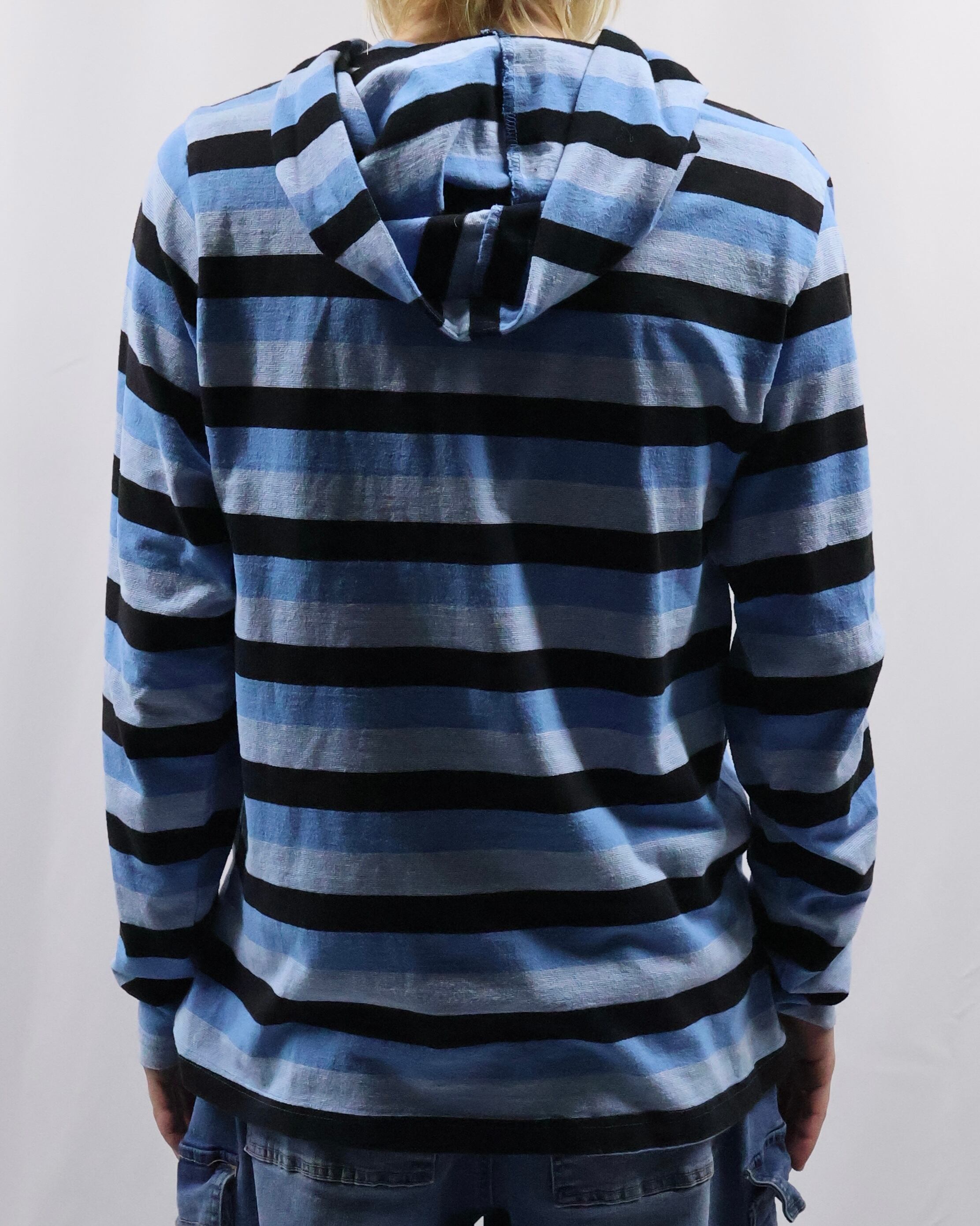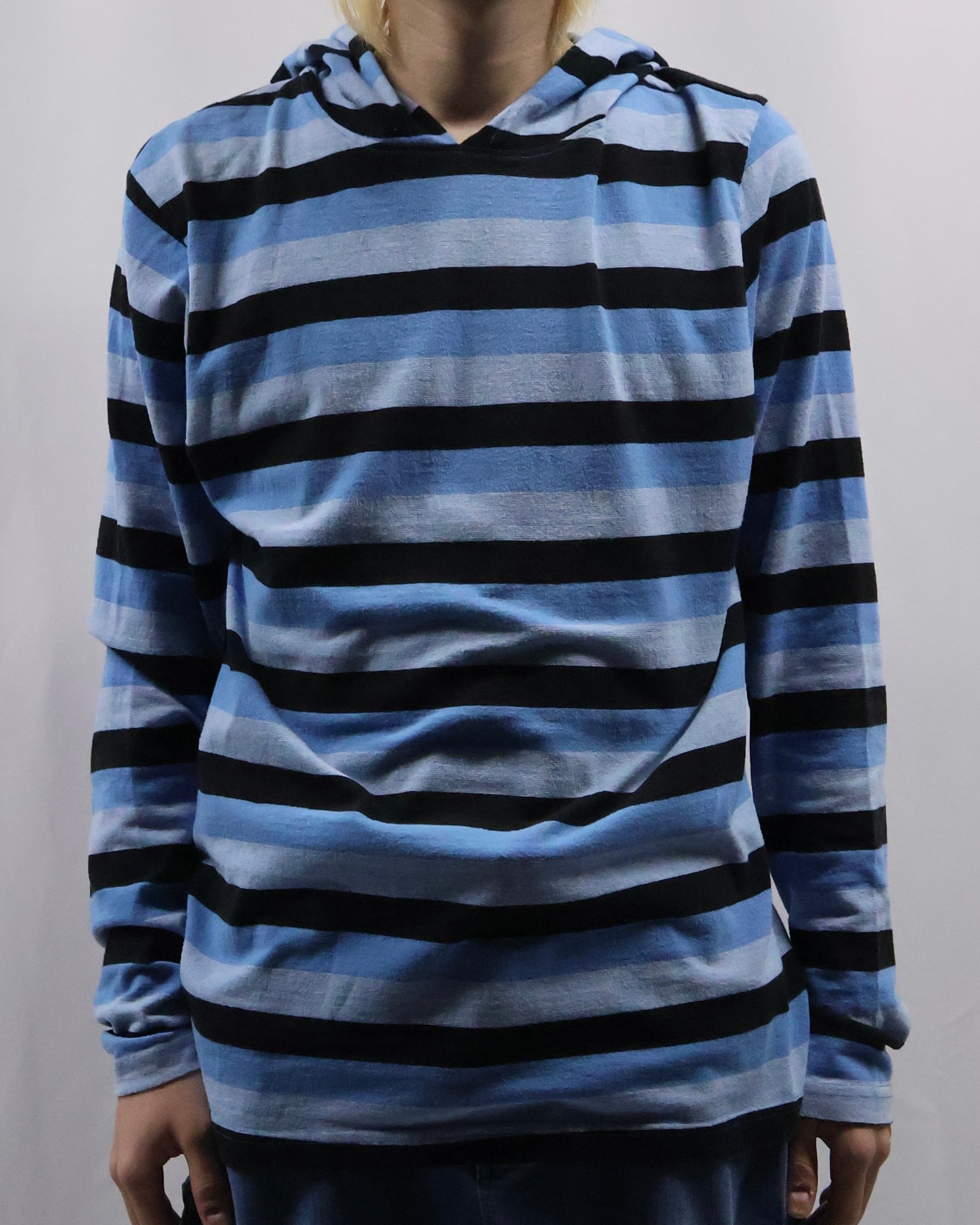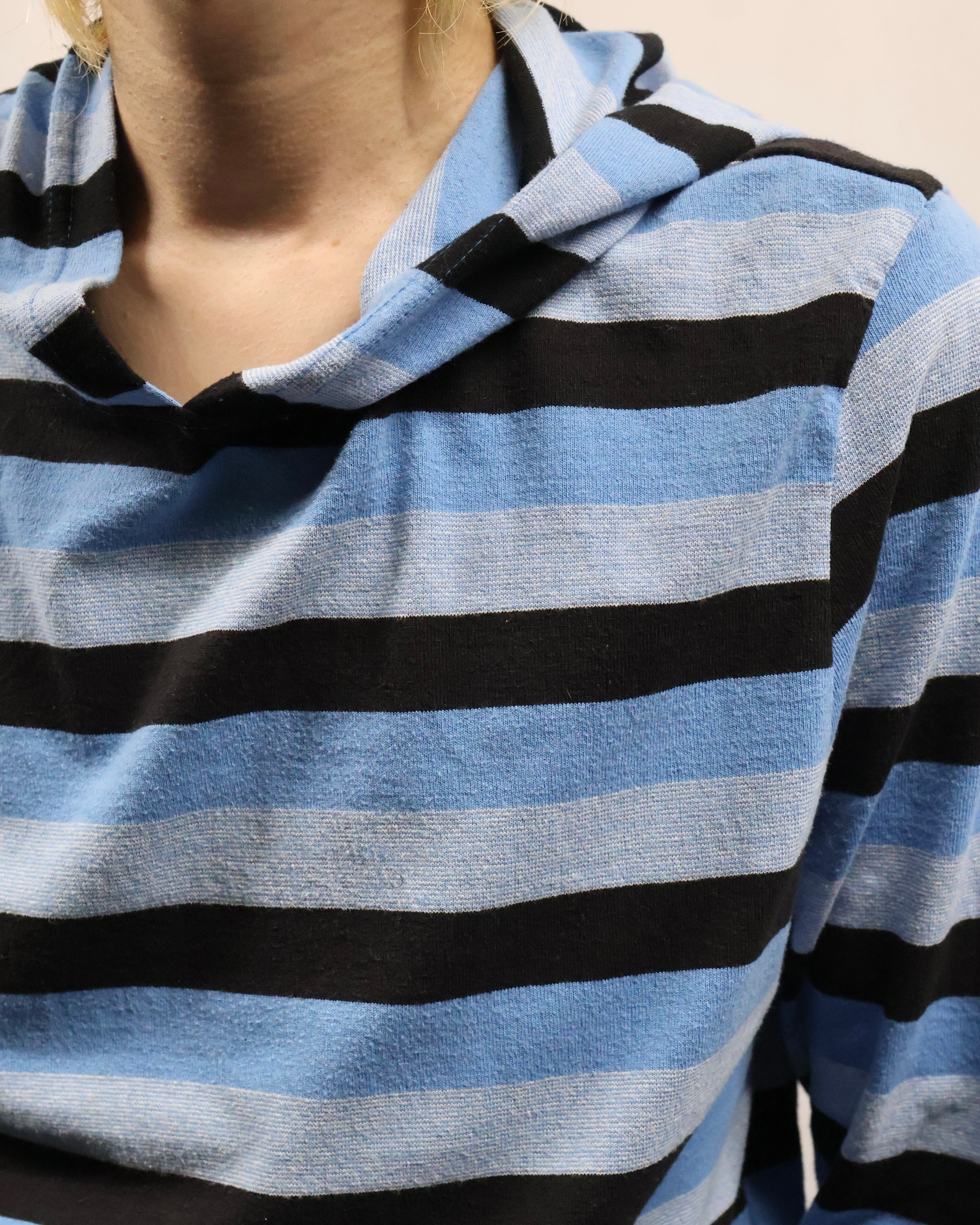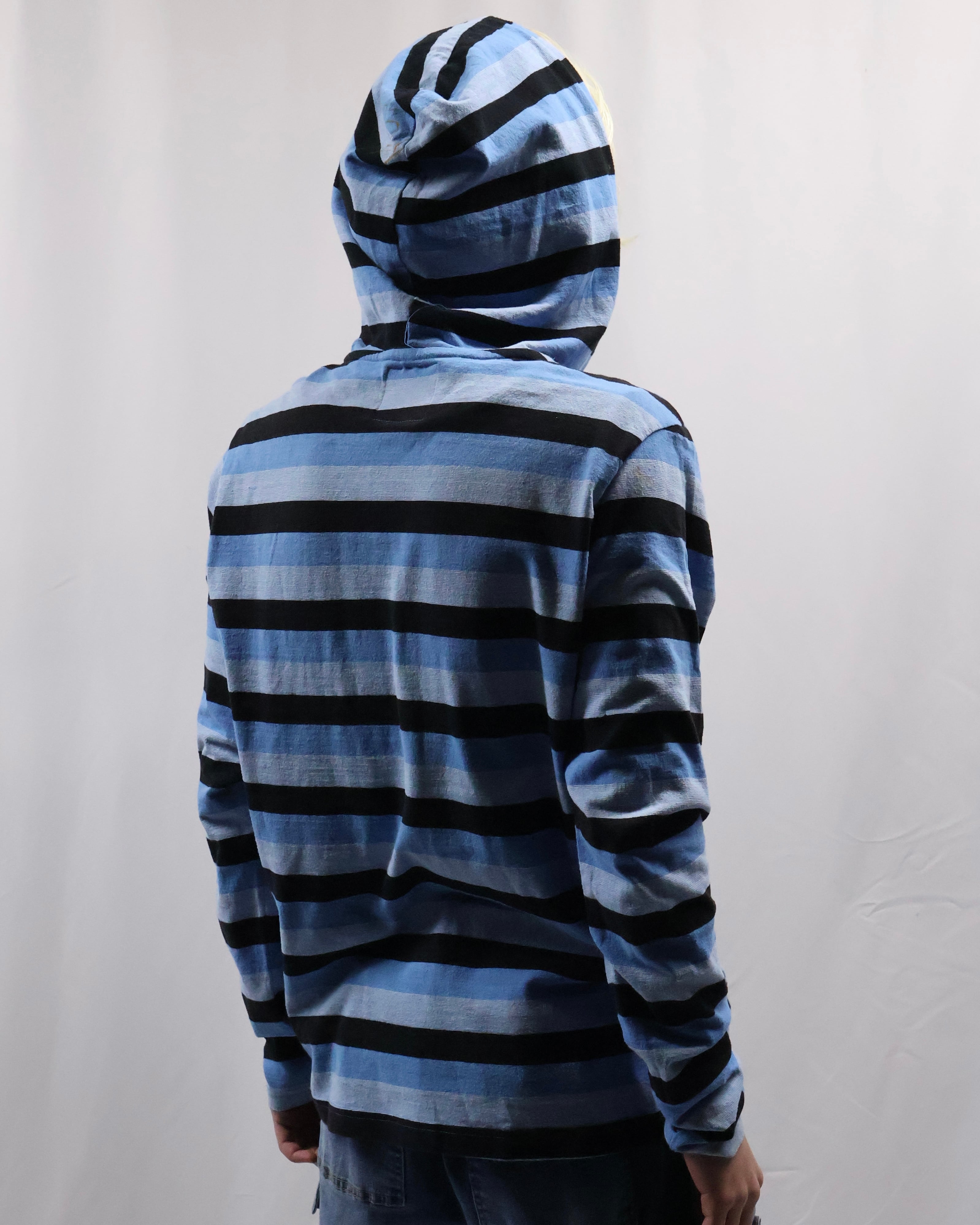 インナーとして存在感を発揮する薄地のフーディ。色味のインパクトはありつつ細かいボーダーで、外しすぎずファッションできる優秀な一枚