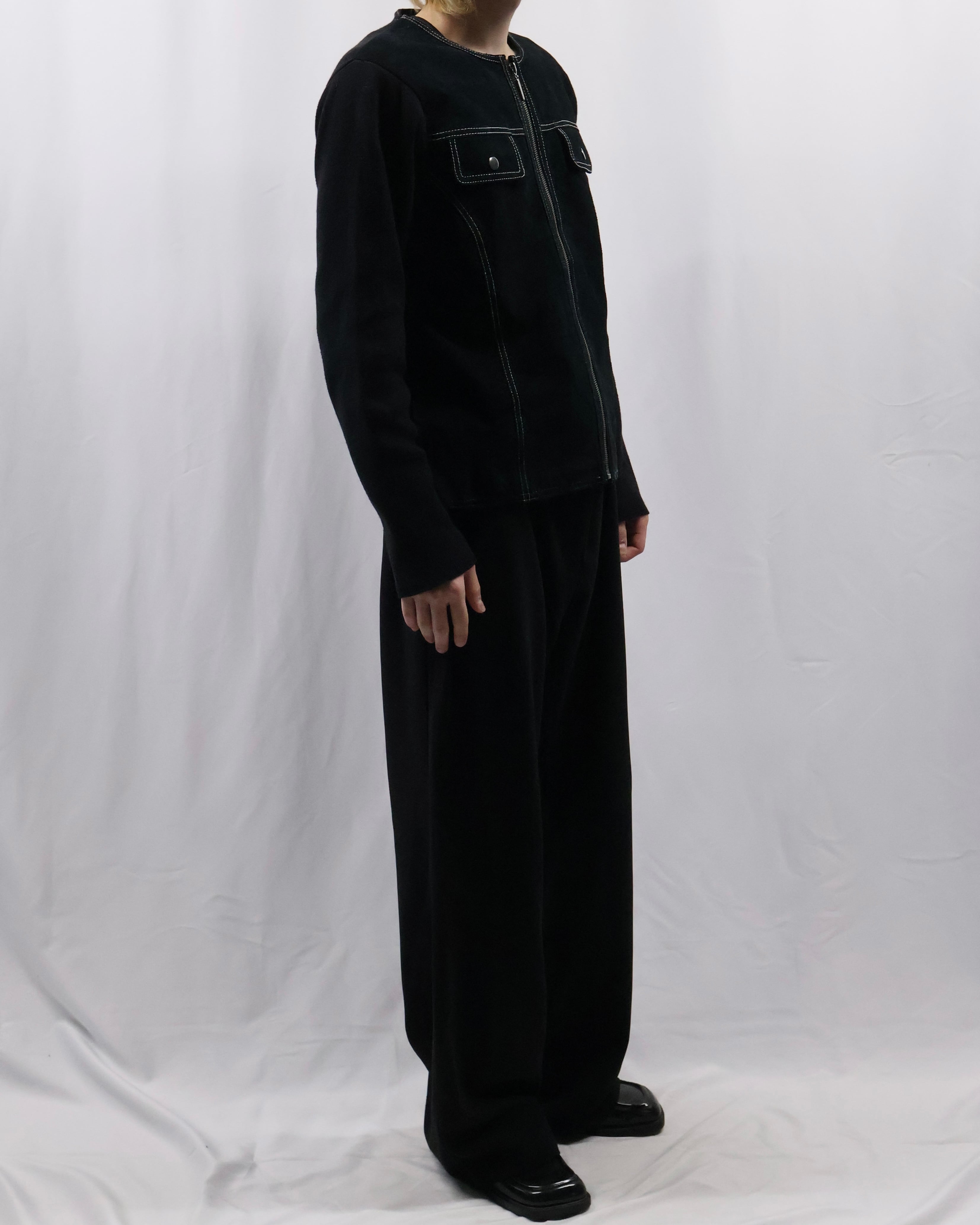スリムなシルエットのノーカラージャケット。ハードな雰囲気は持ちつつ、アームのニットが適度にコーディネートに緩さをもたらし、抜け感と緊張感を併せ持つ一枚。