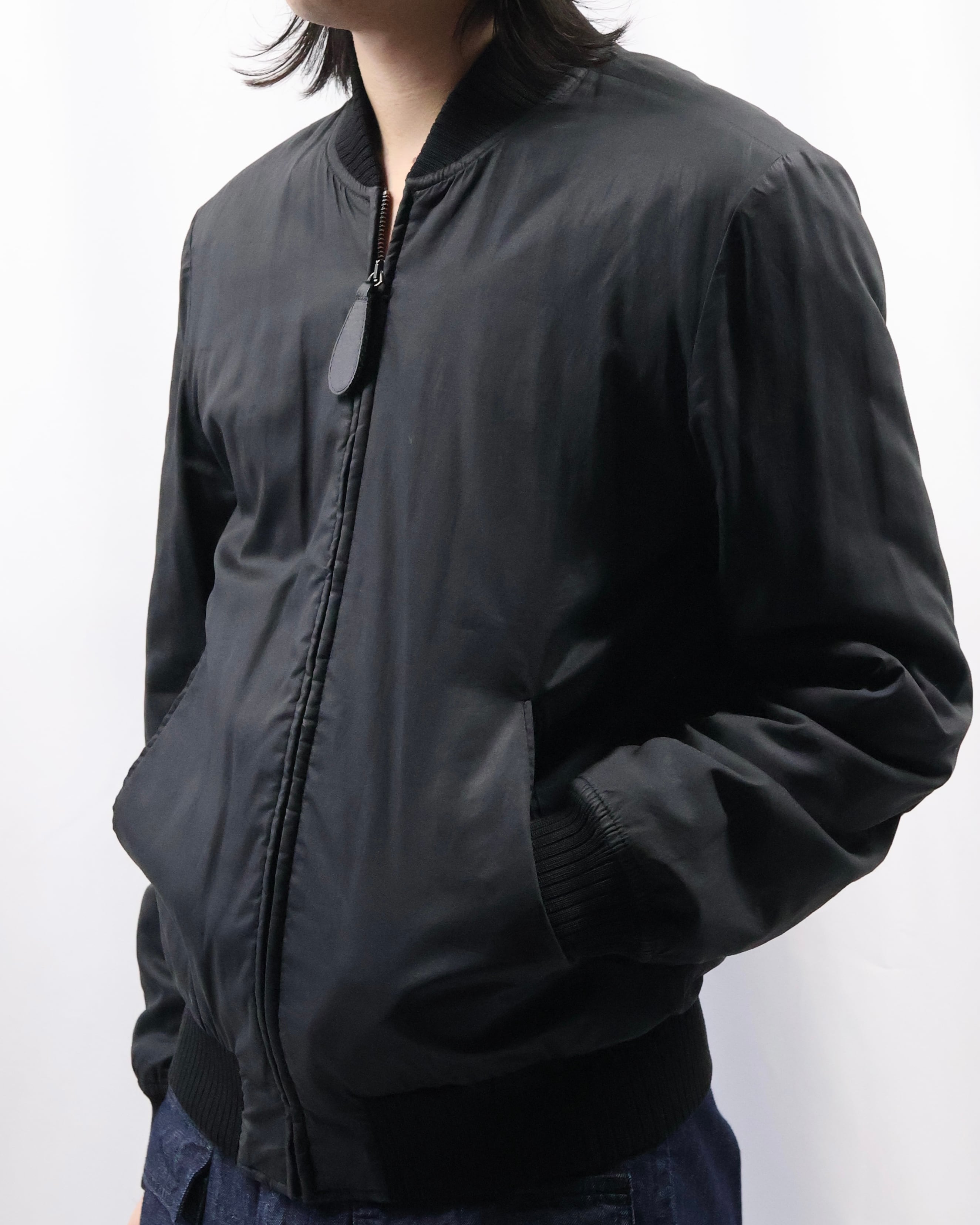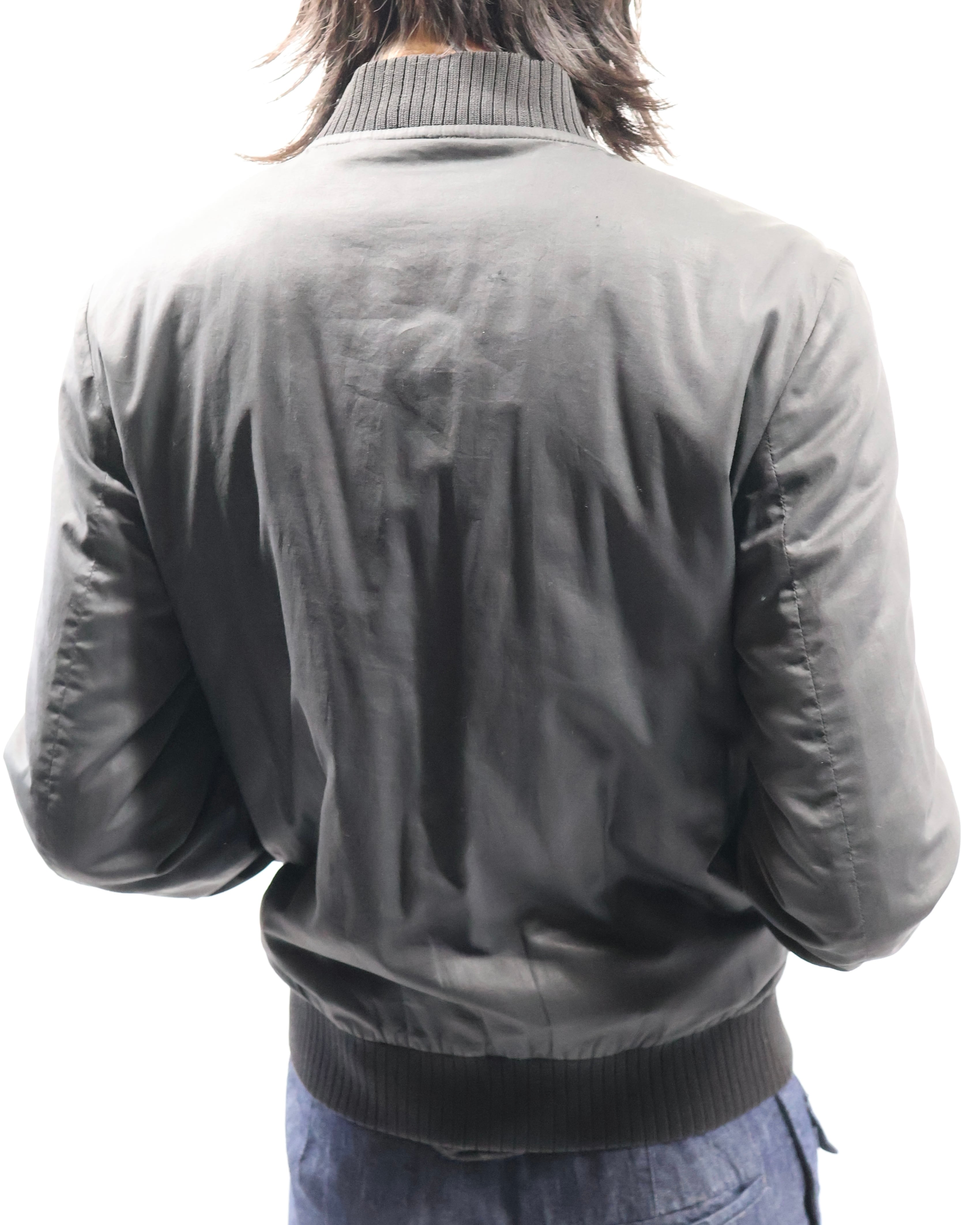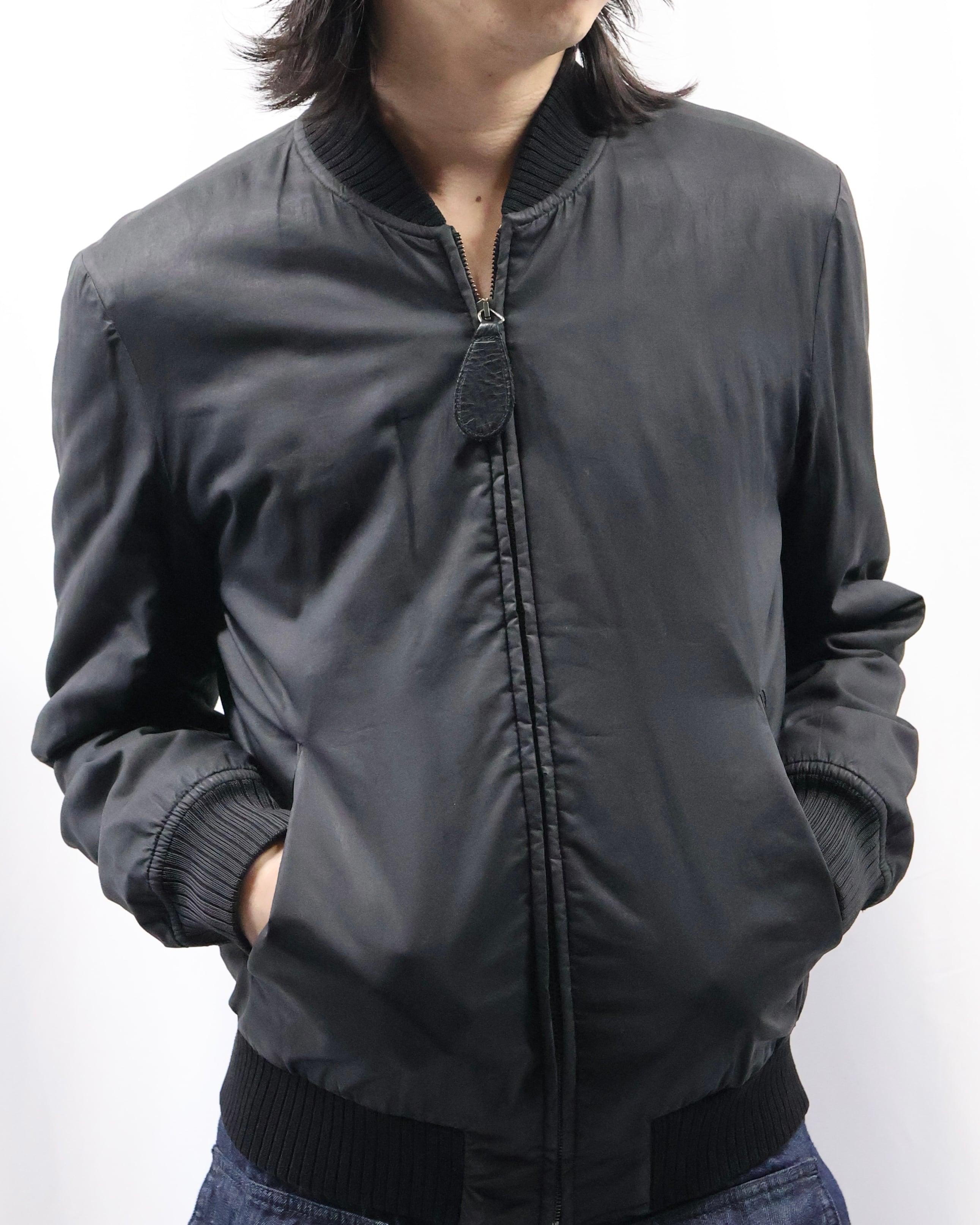 一見シンプルなMA-1だが、胴ポケットのフラップや袖のポケットを削ぎ落とし、光沢がありながらどこかダークな印象を残してくれるコットン地、力強いリブなど、ミニマルかつ退廃的でブランドらしさを感じられる1着。