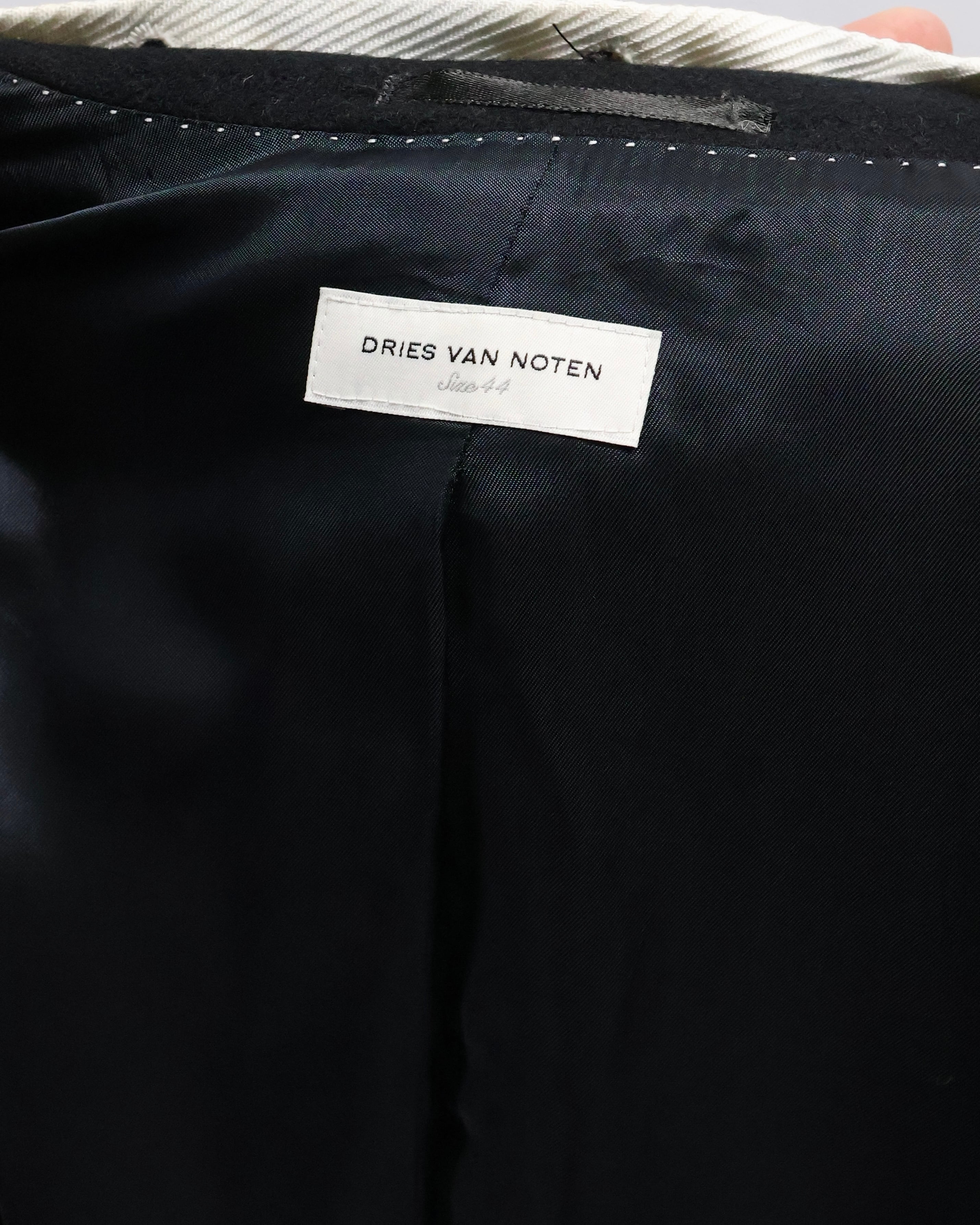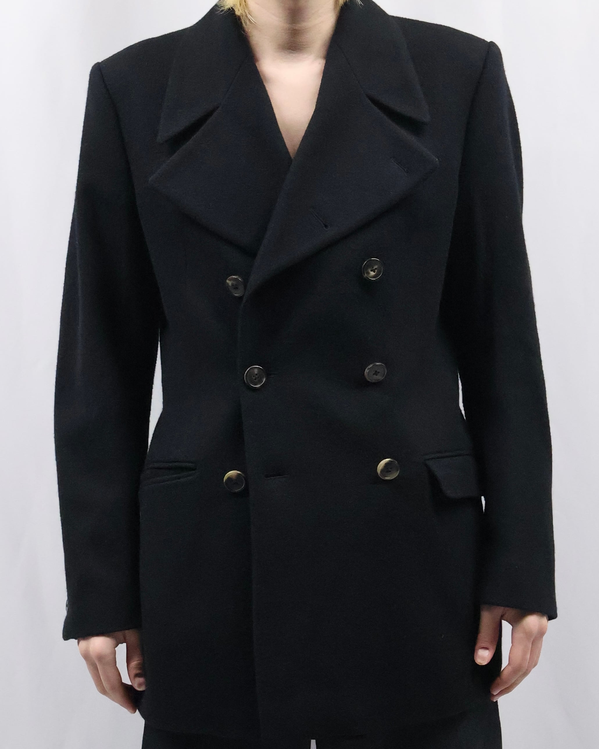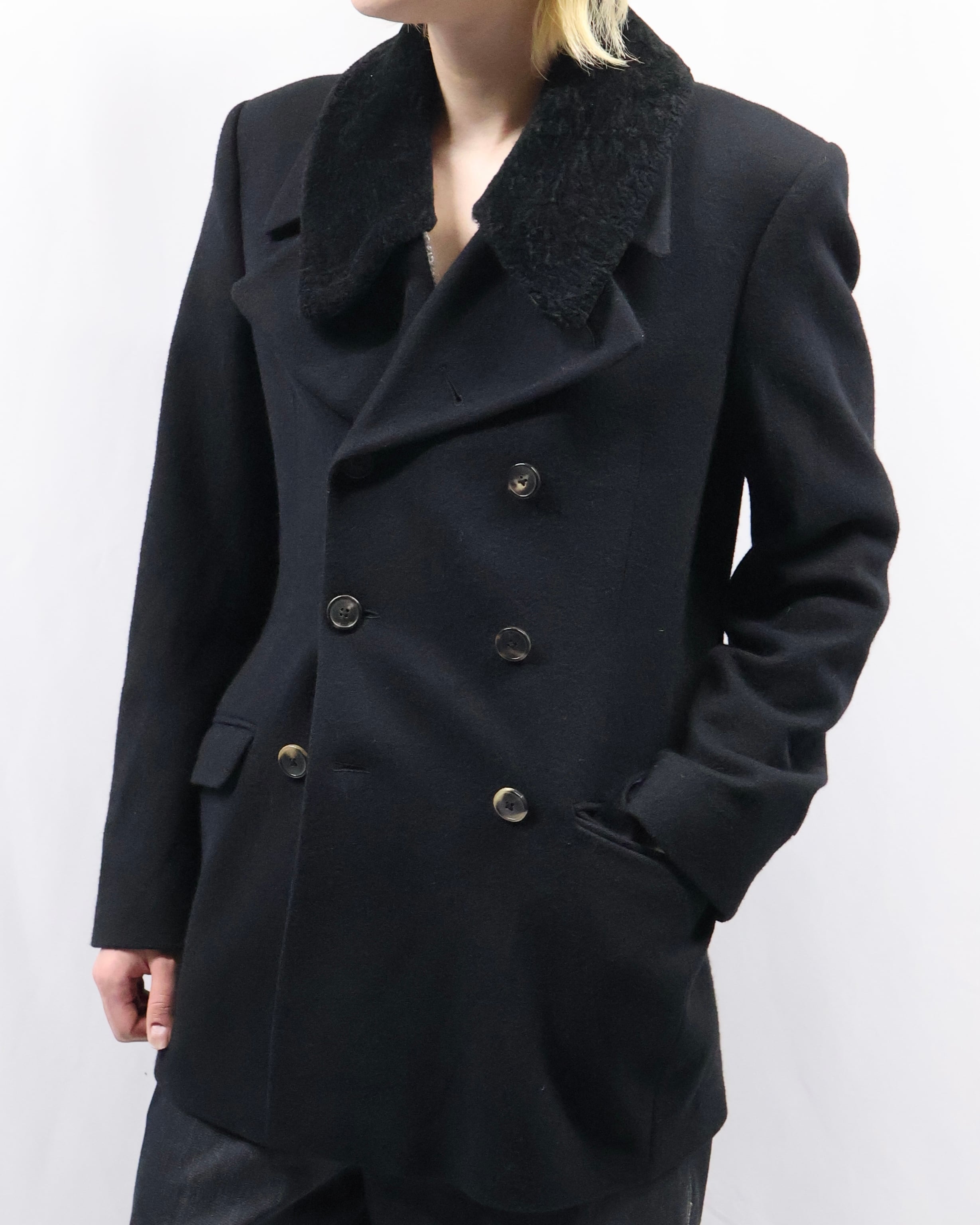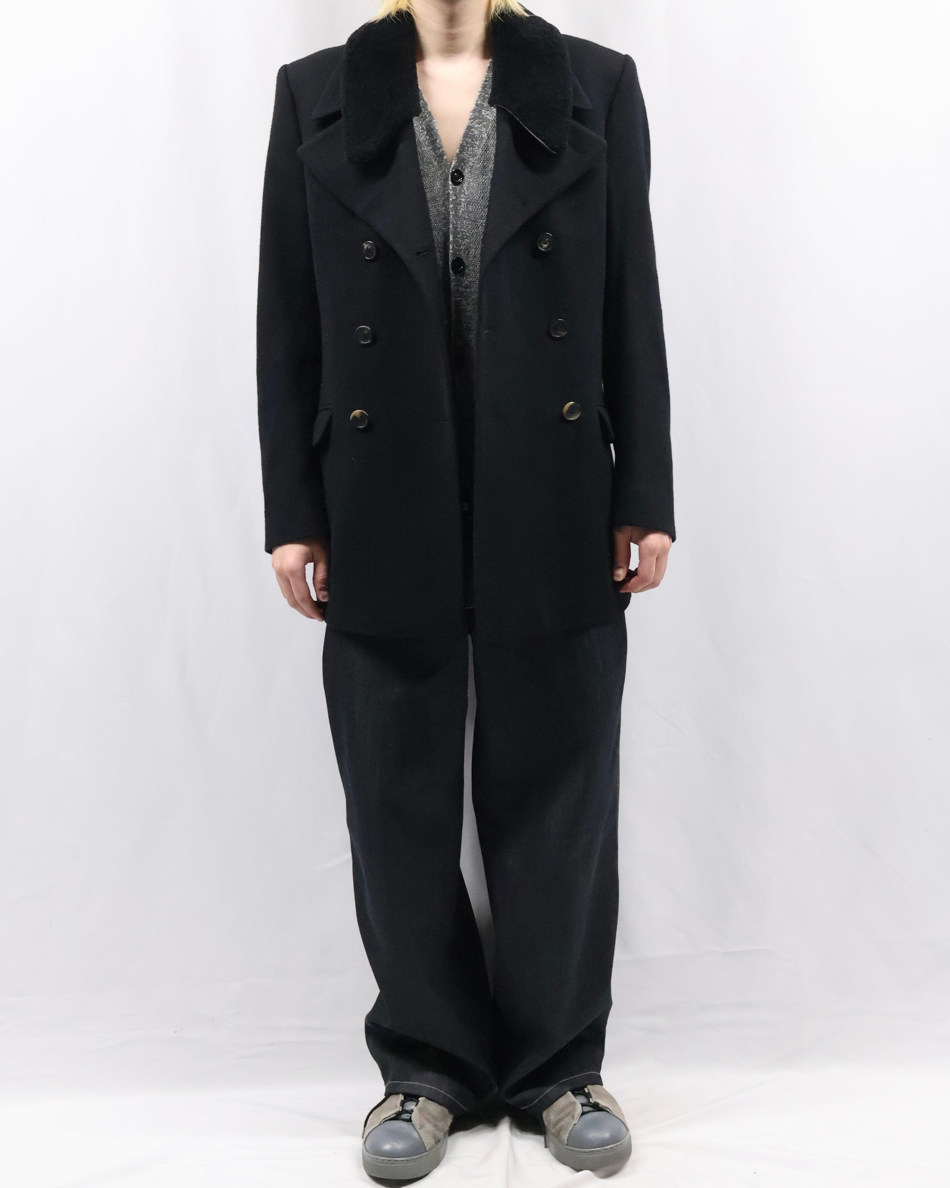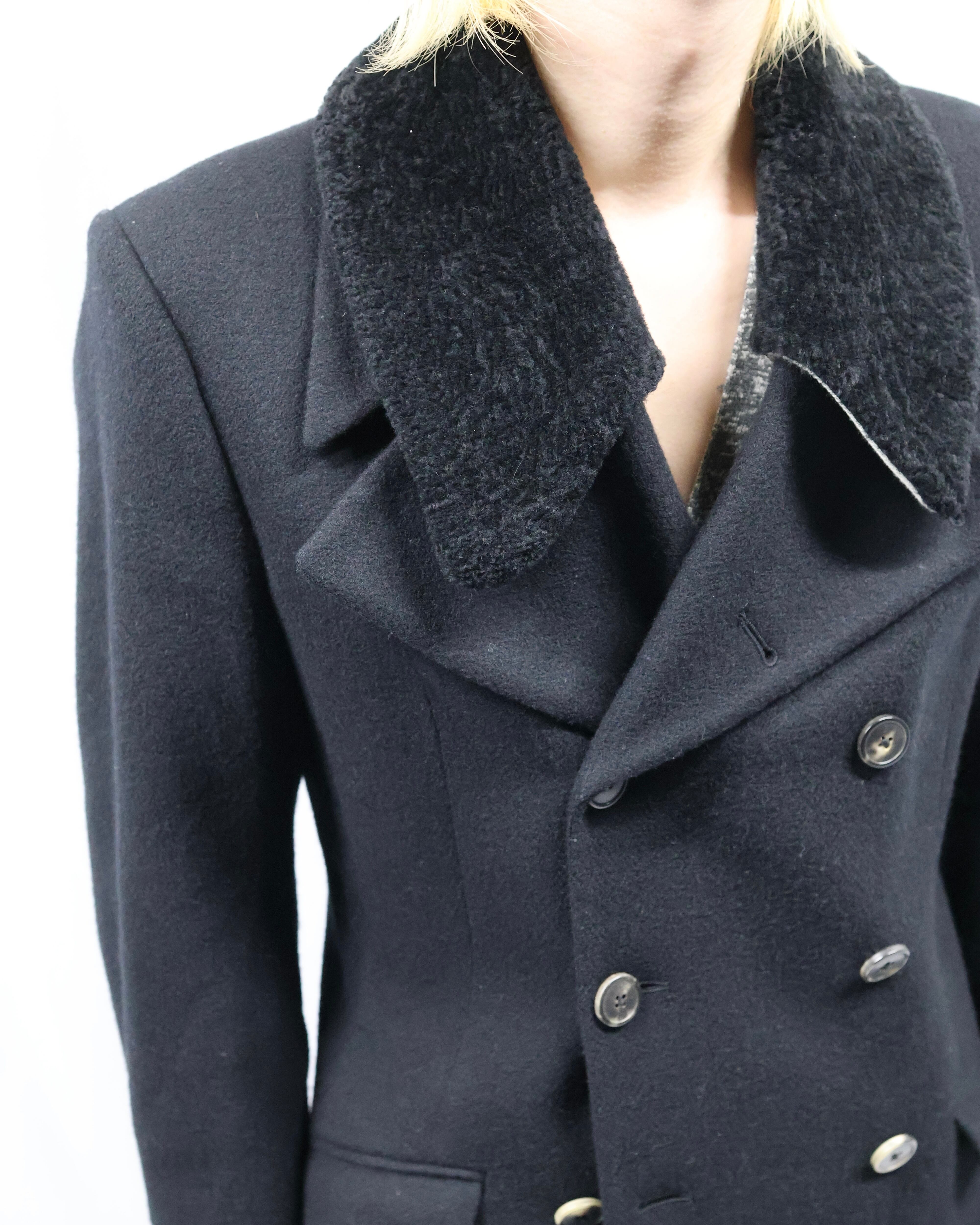 取り外し可能なボア襟が特徴的なミドル丈pコート。ウエストのシェイプや袖のカーブ、袖口やボア襟を外すと出てくる異なる形の襟など、ドリスにしか出来ないテーラリングが反映された1着。