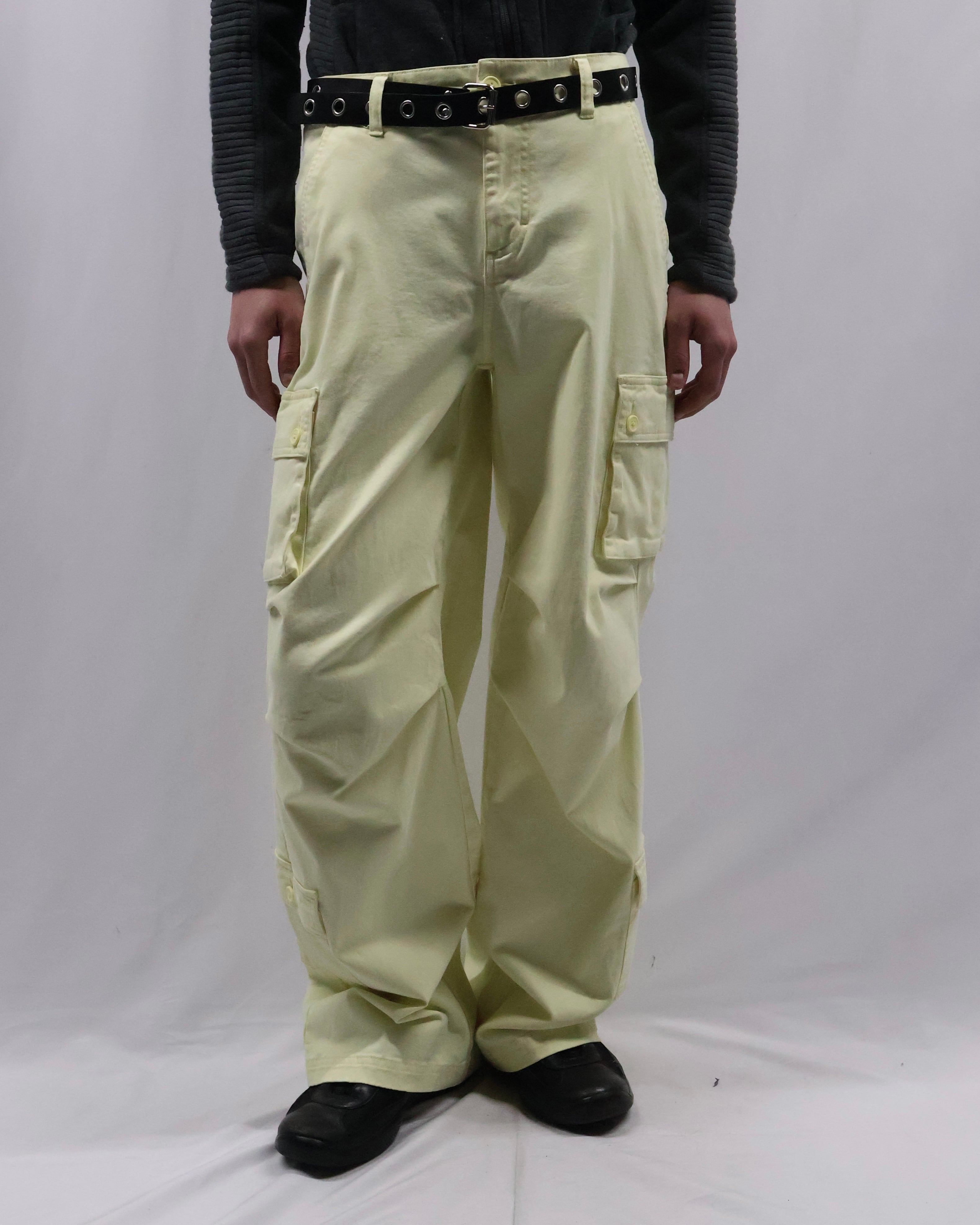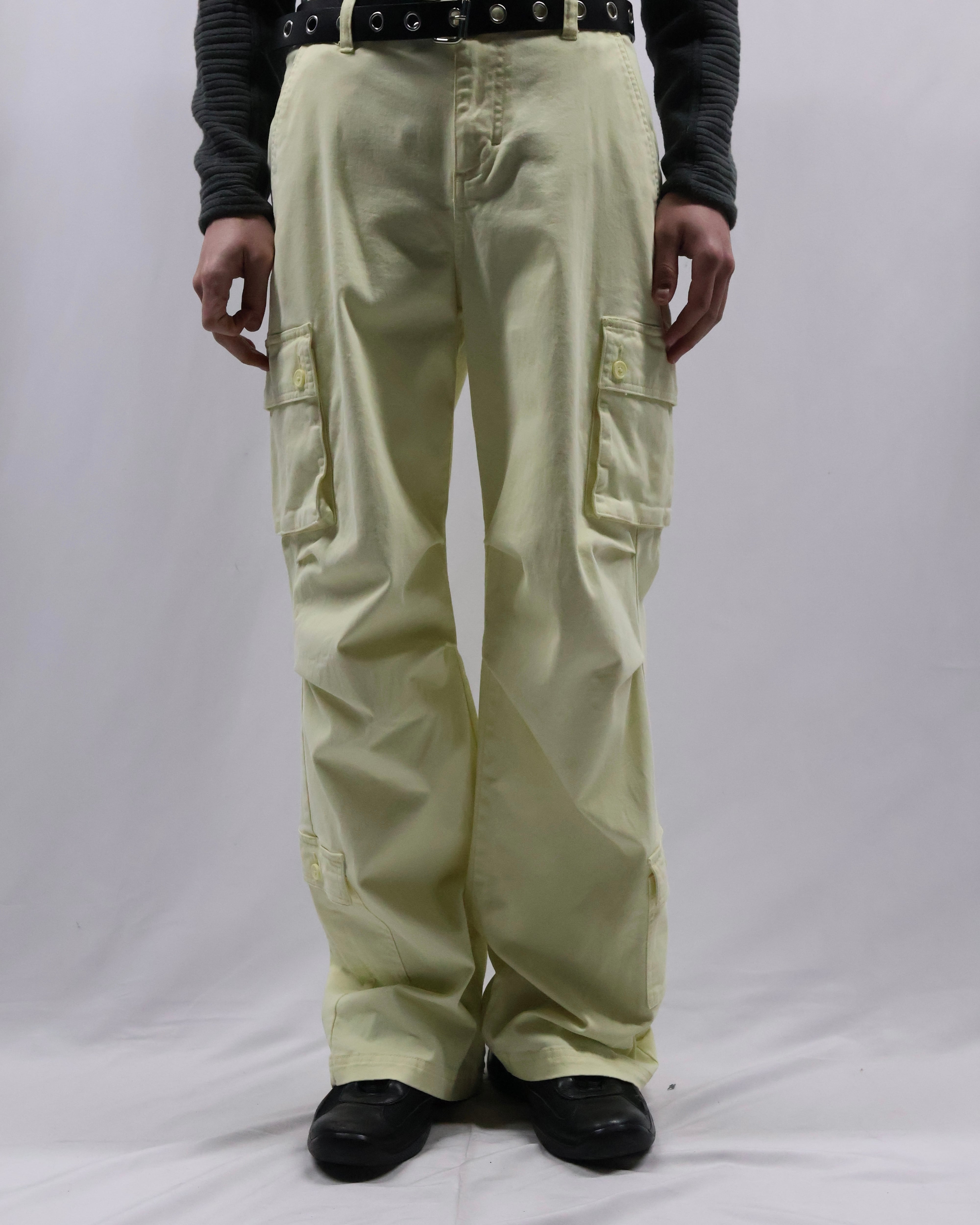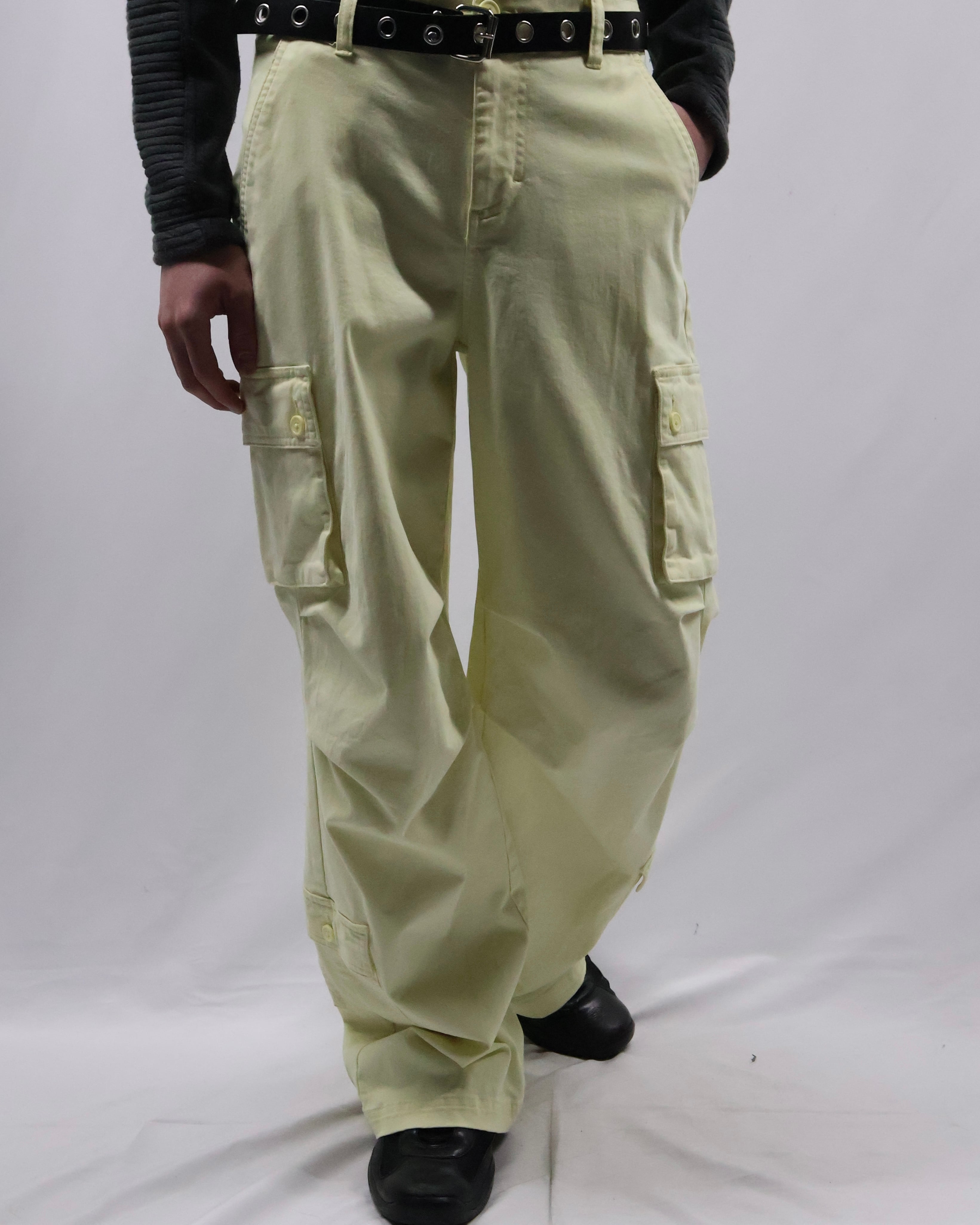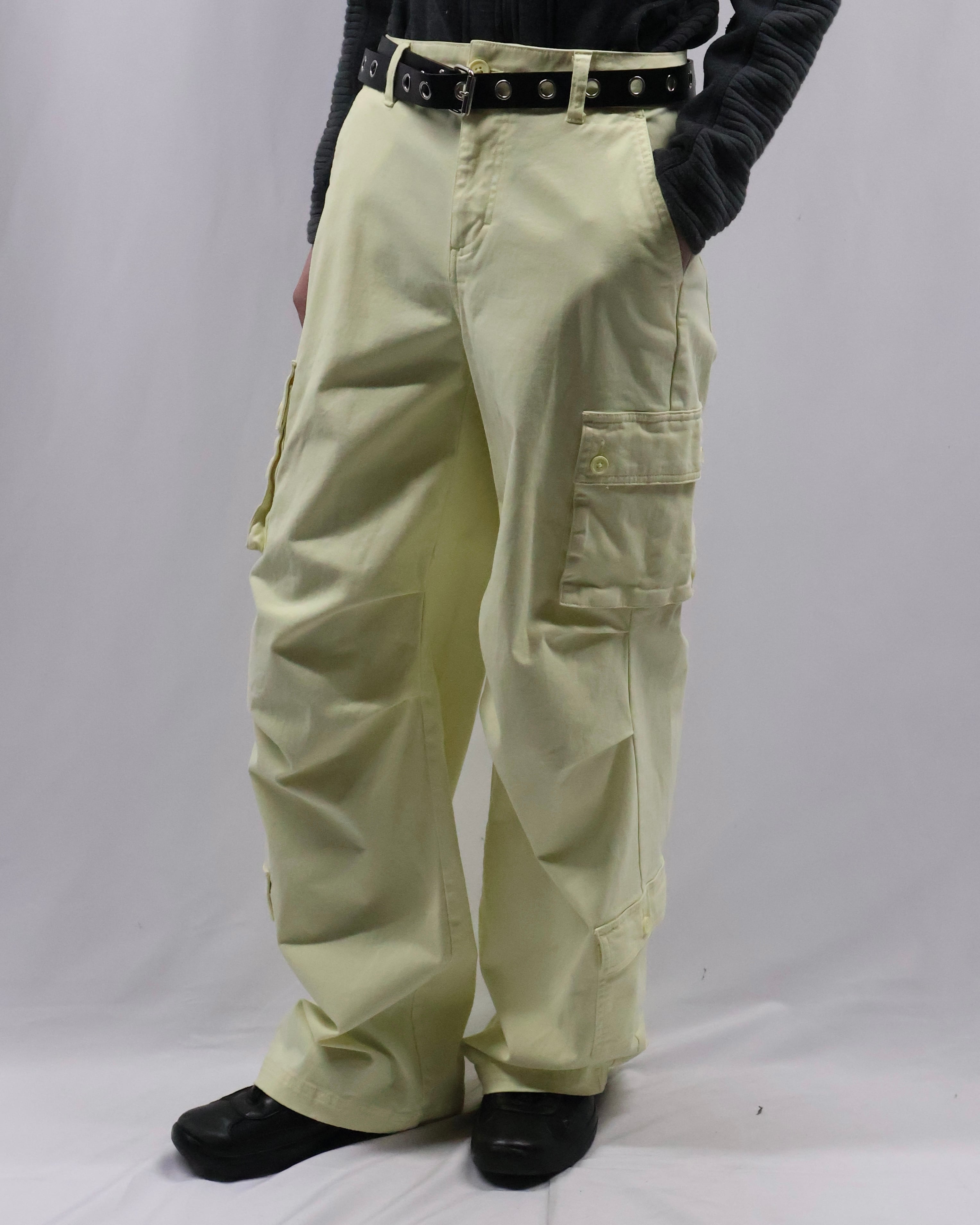 パステルイエローの色味が特徴のカーゴパンツ