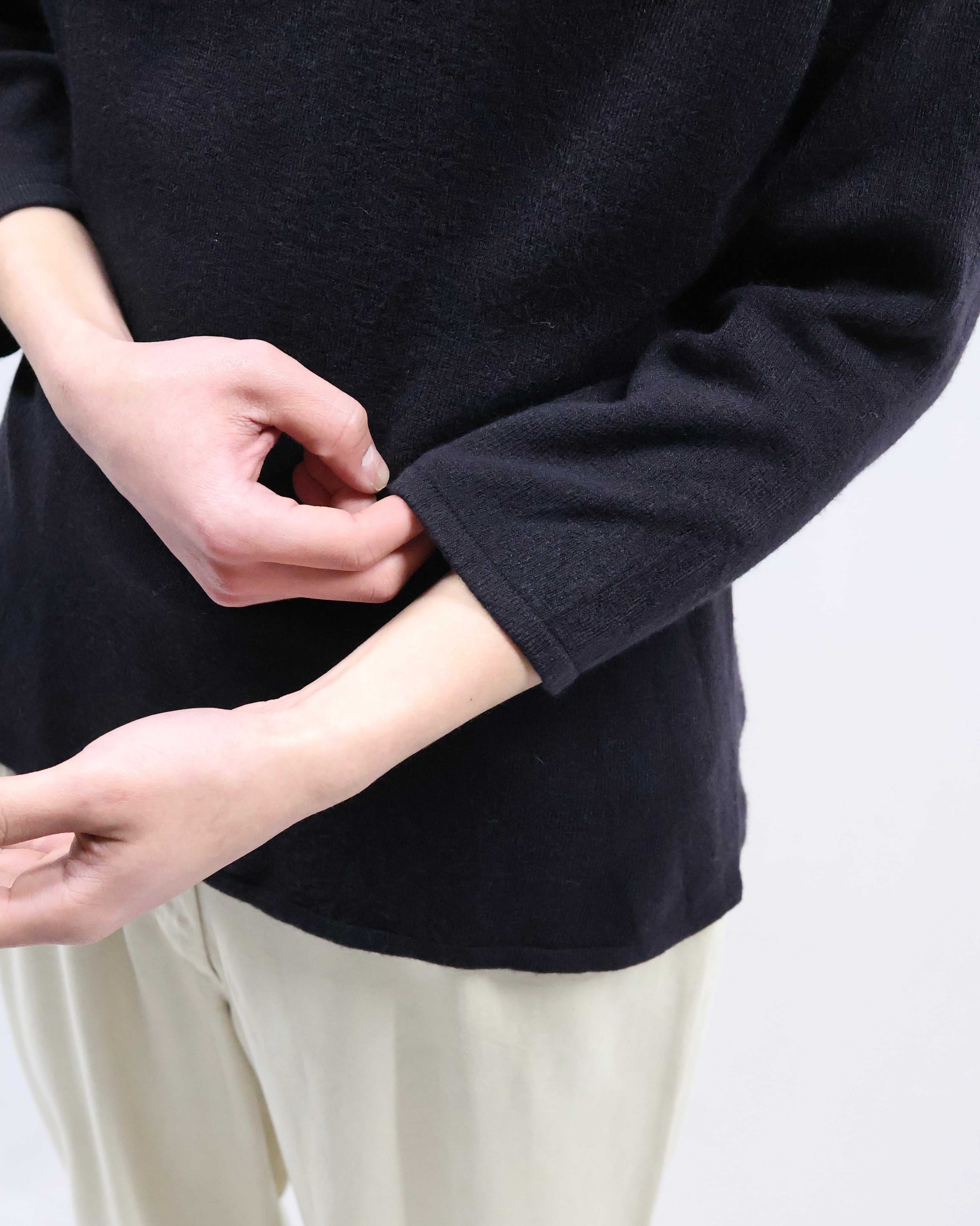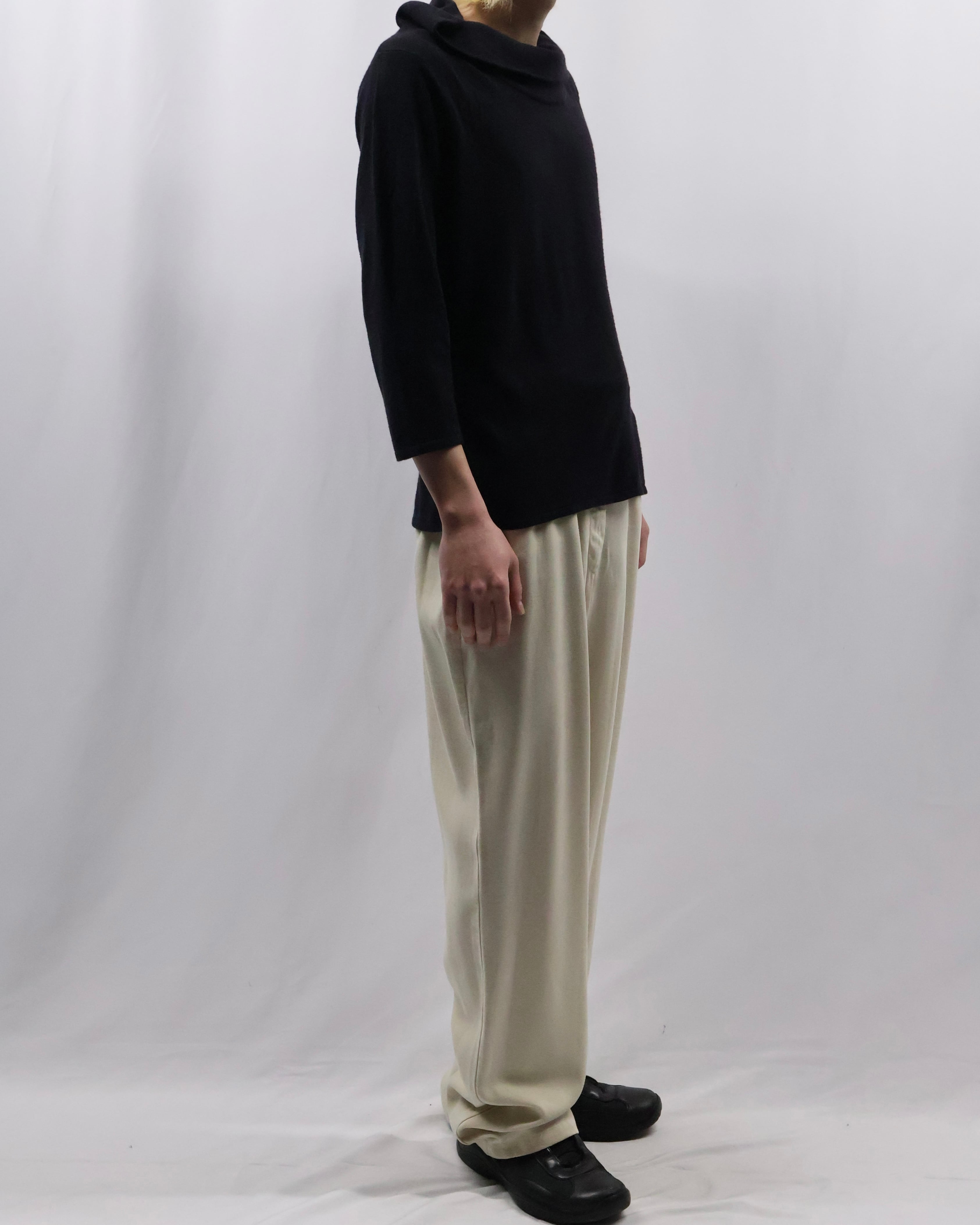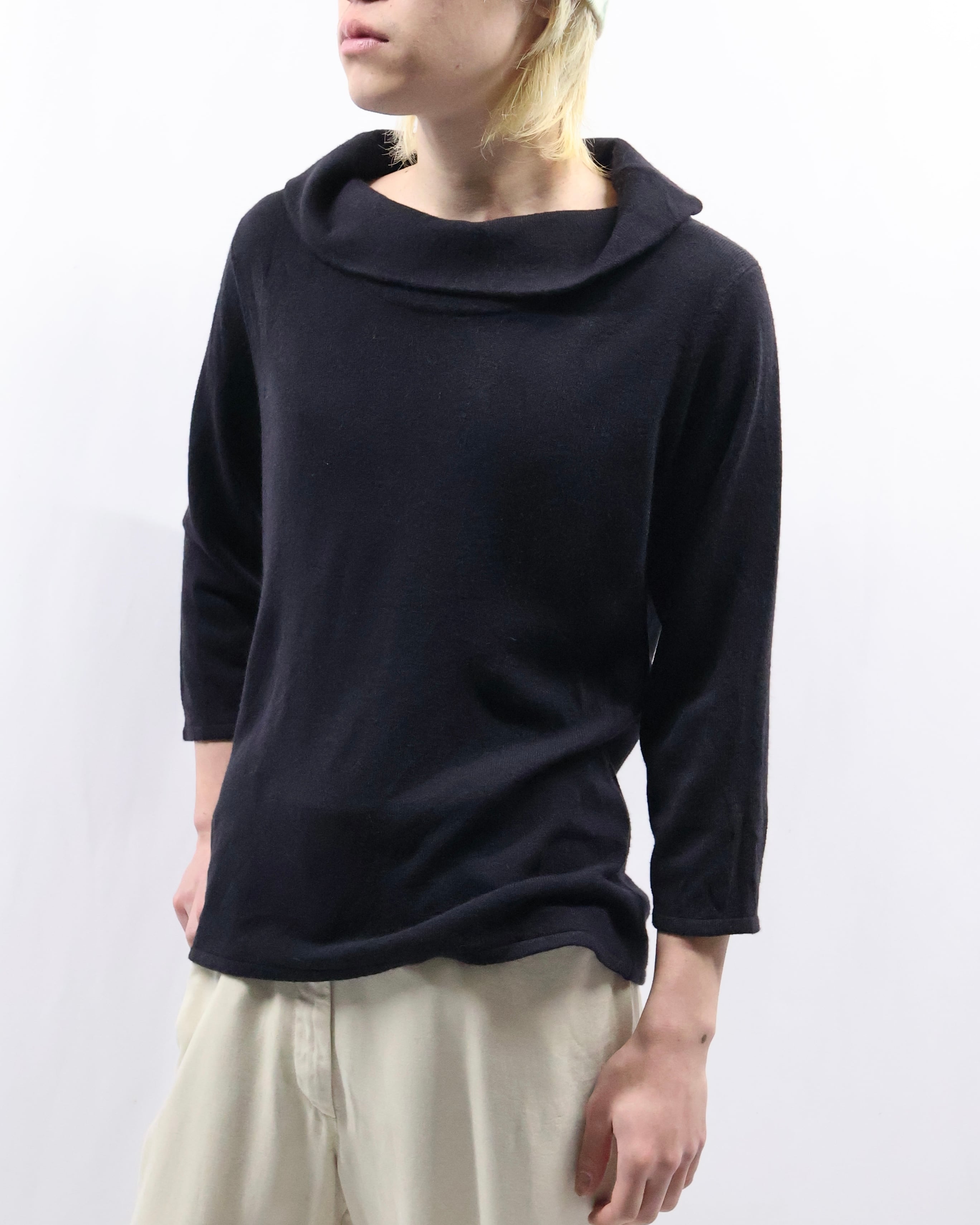 ゆるいタートルネックのようなディテールとクロップド丈の袖で一枚ではもちろんレイヤードも楽しめるアイテム。
