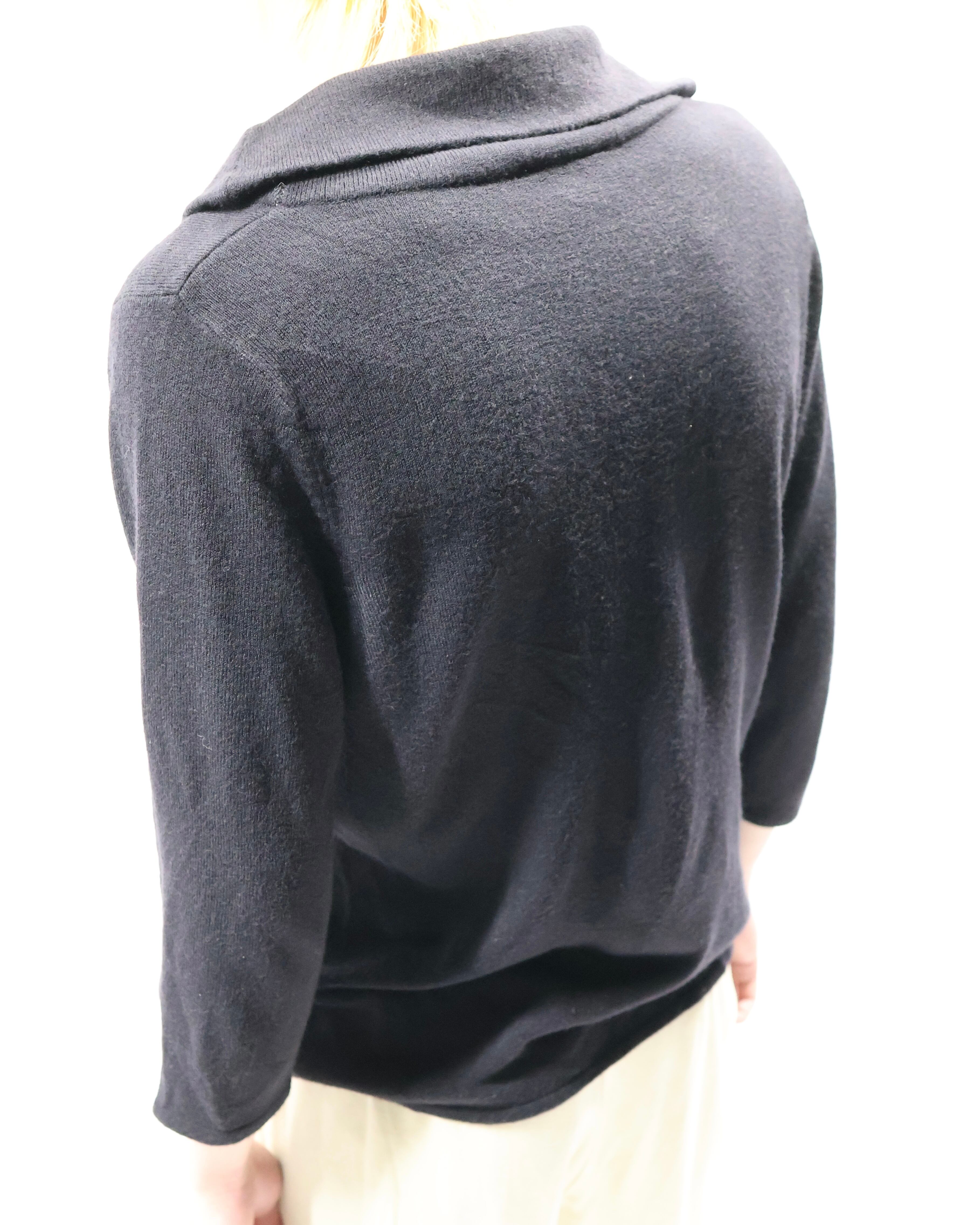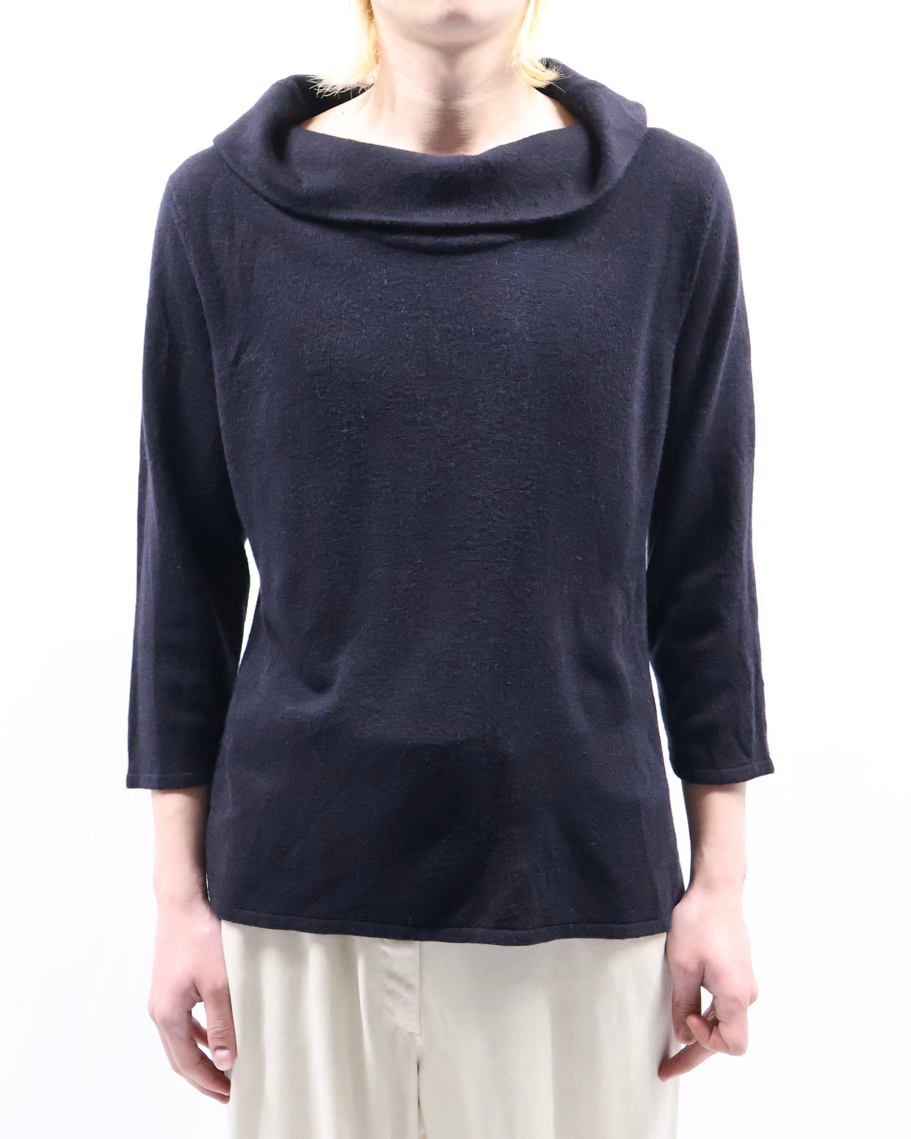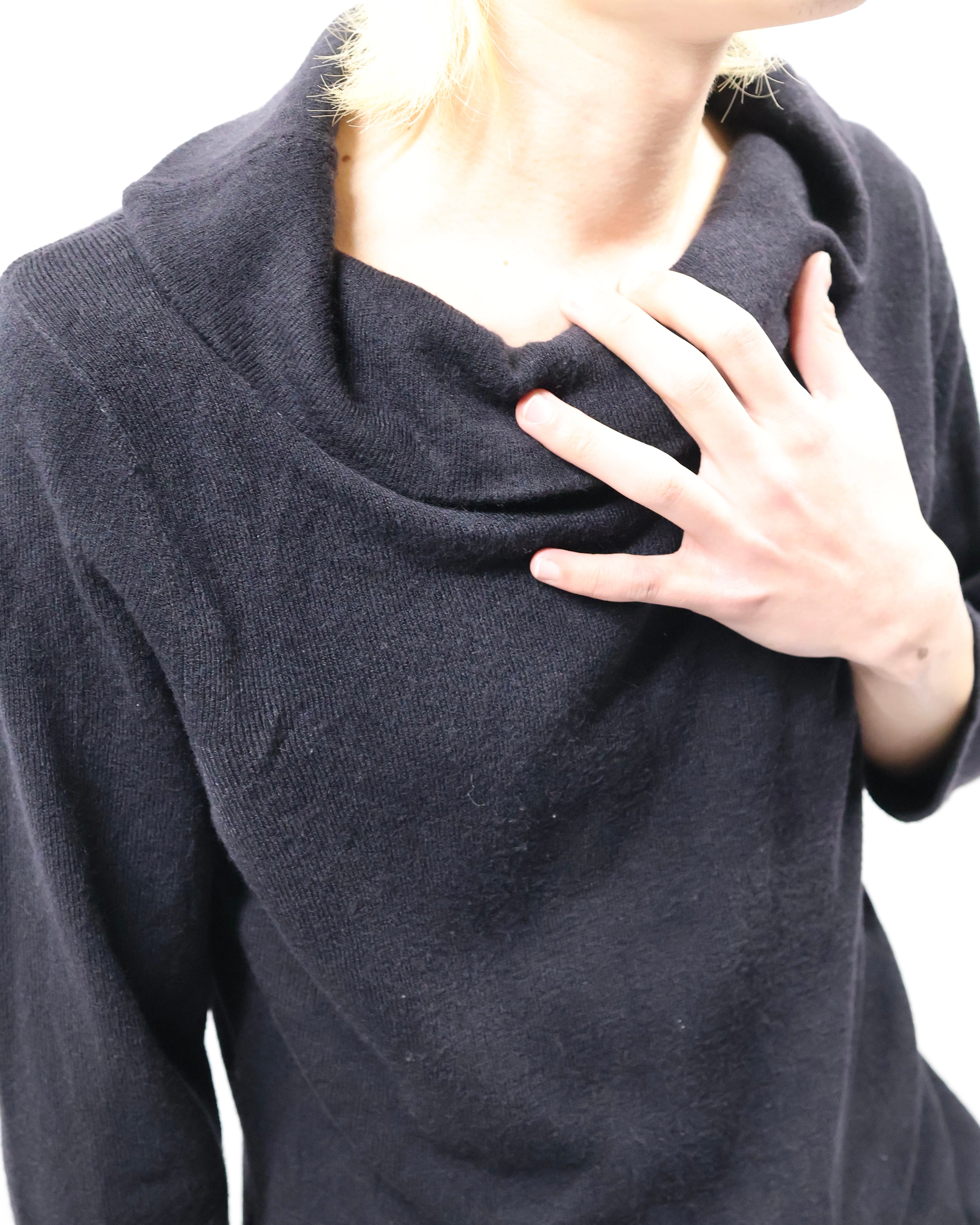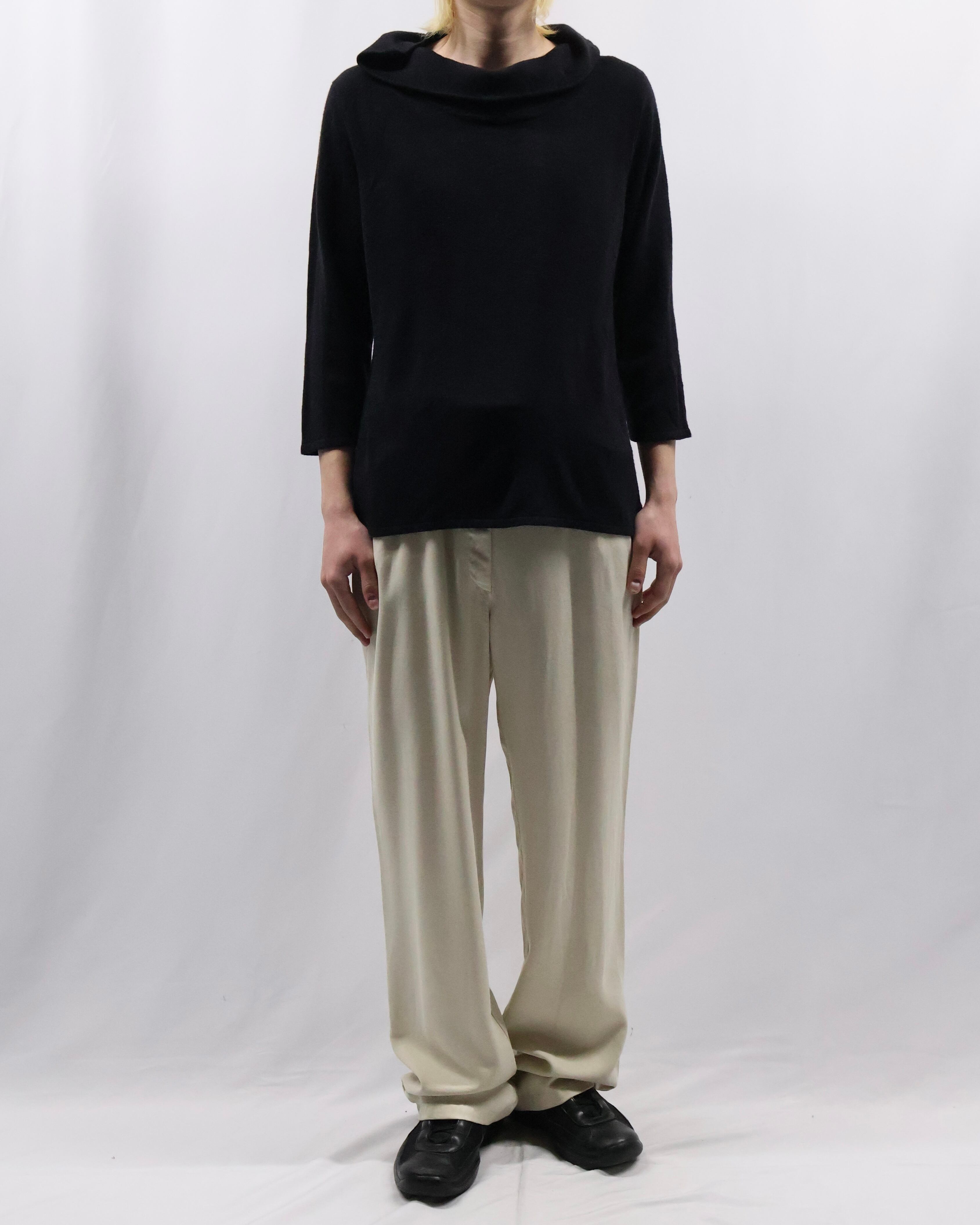 ゆるいタートルネックのようなディテールとクロップド丈の袖で一枚ではもちろんレイヤードも楽しめるアイテム。