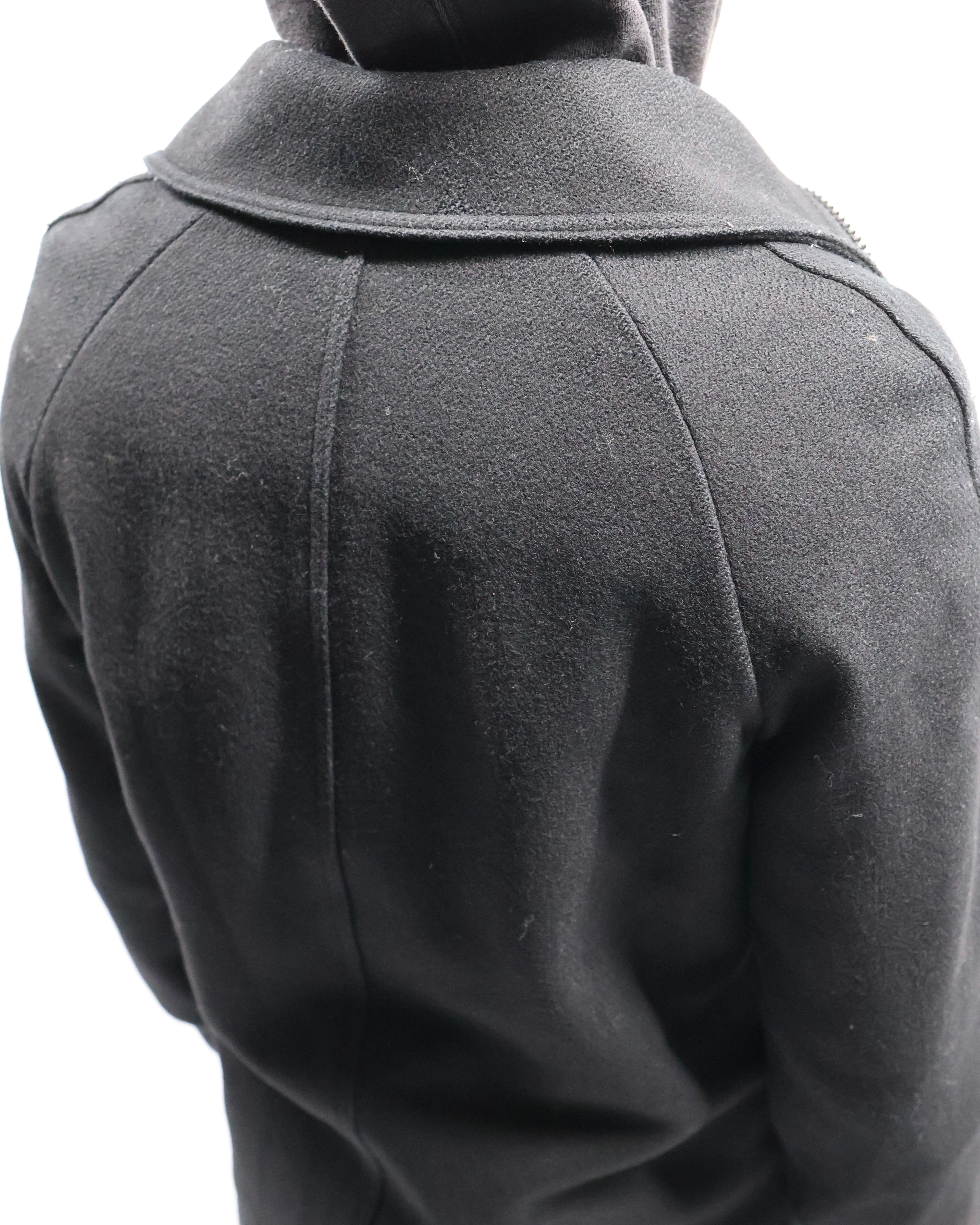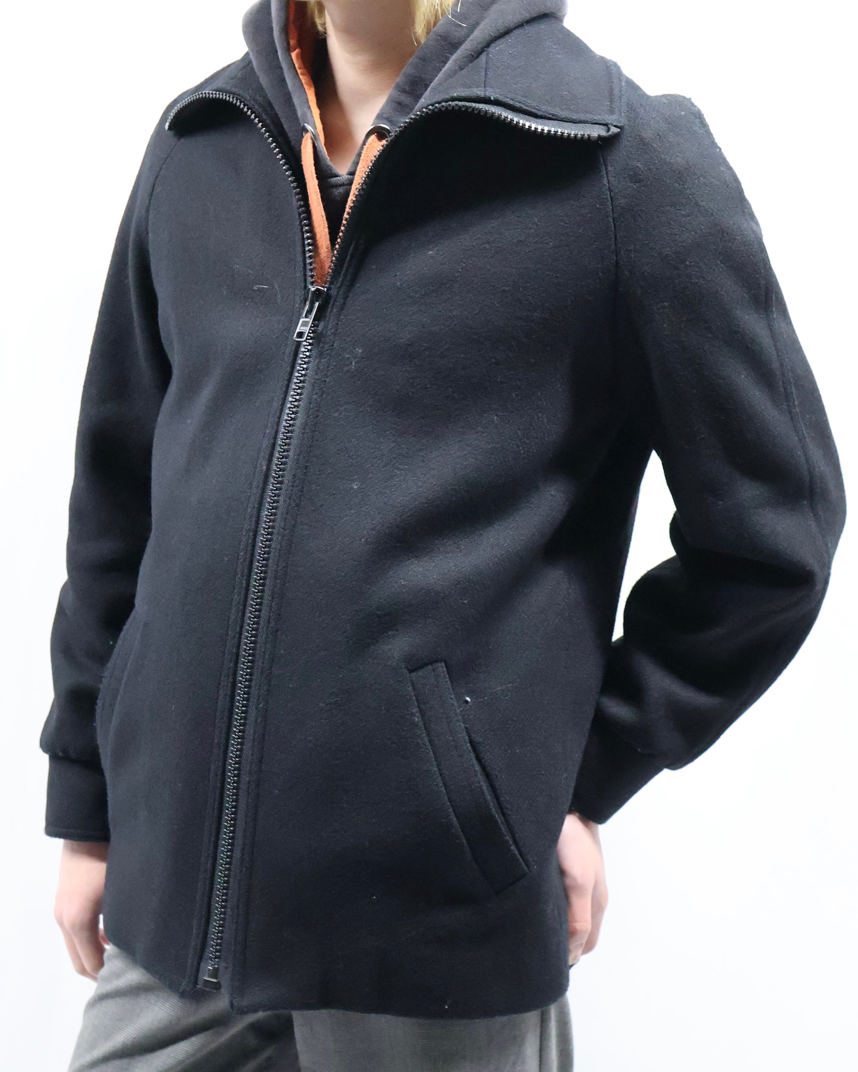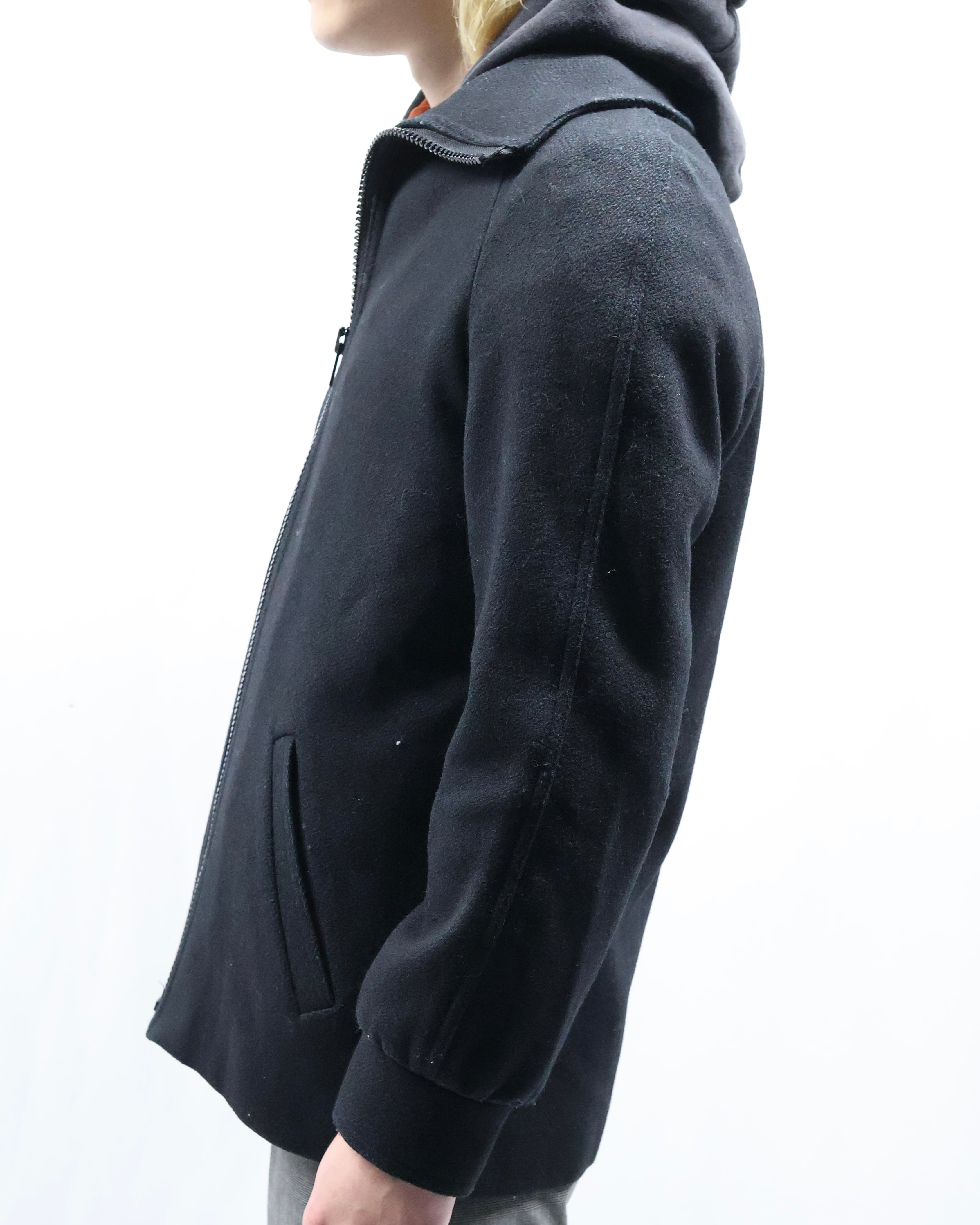 タイトなシルエットのハイネックウールブルゾン。ウールの素材感とタイトなサイズ感がコーディネートに適度な緊張感を与えてくれるアウターとして優秀な一枚。