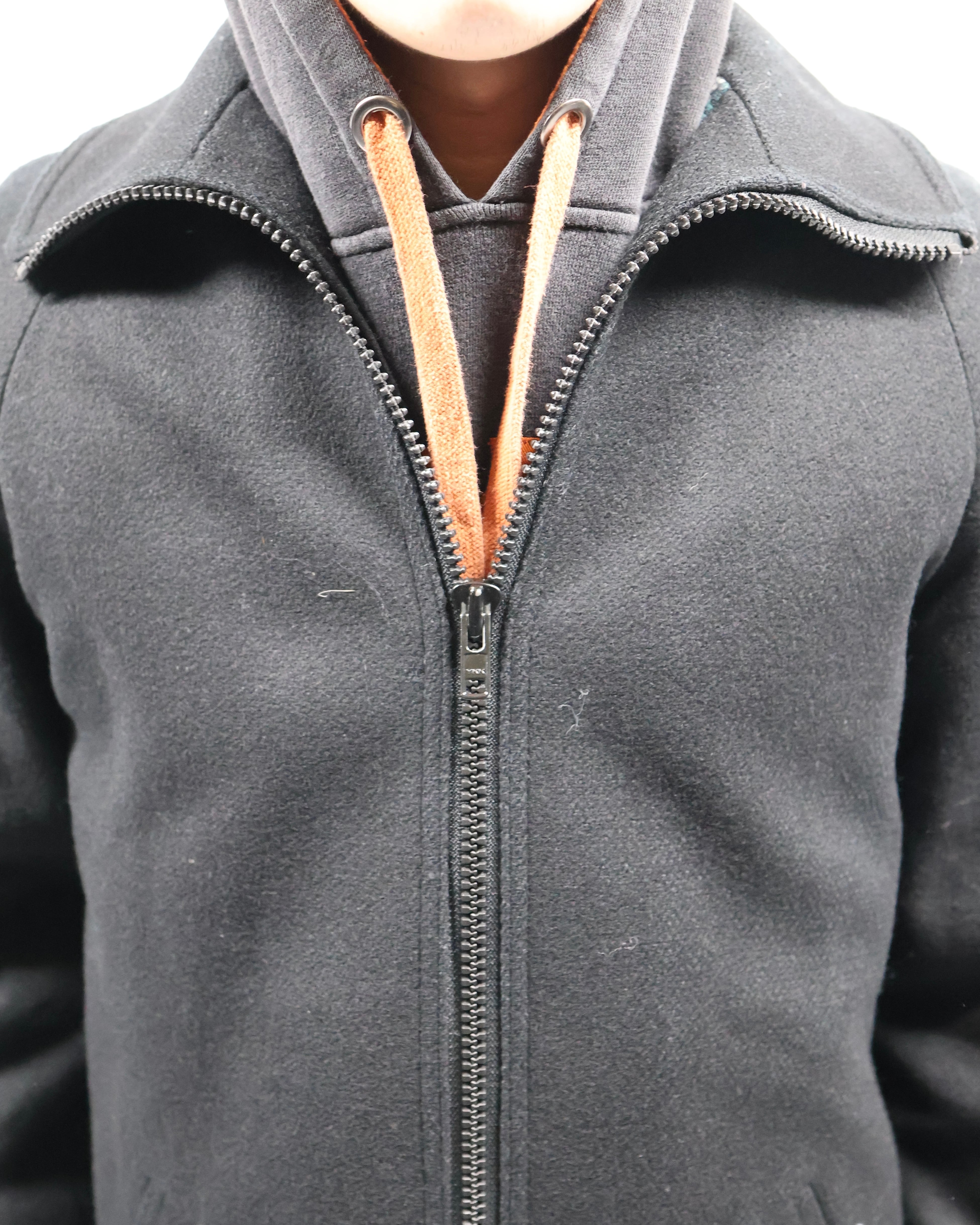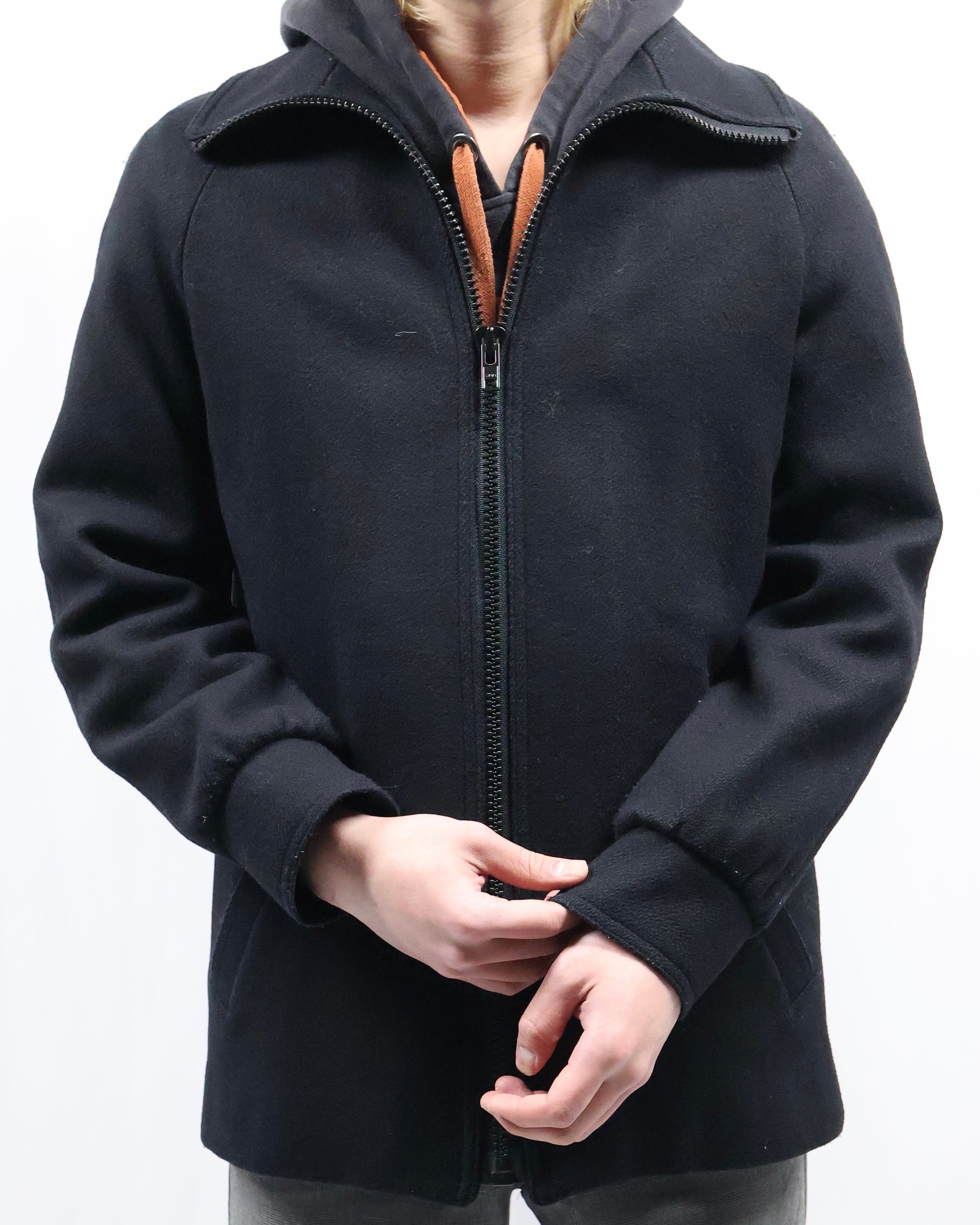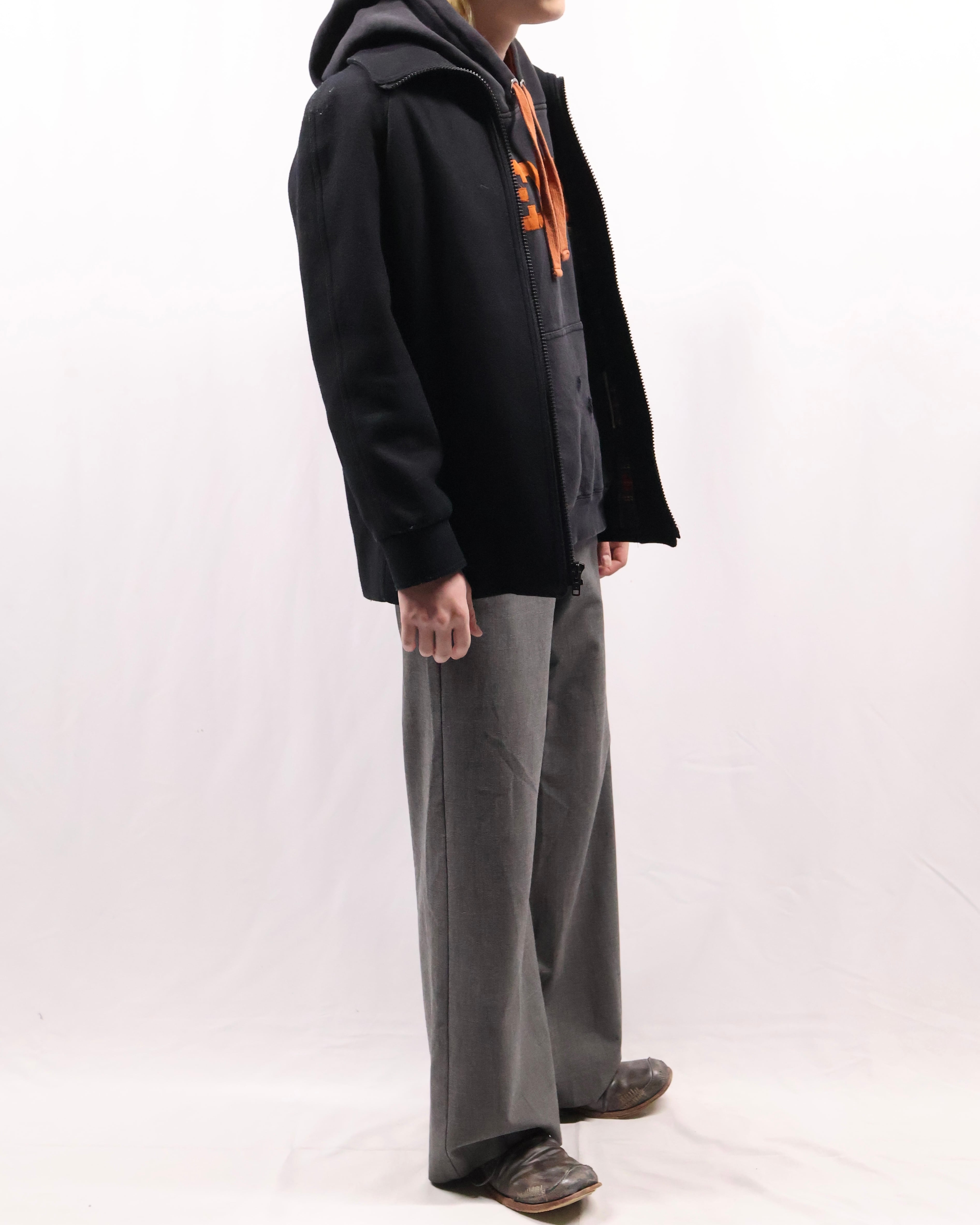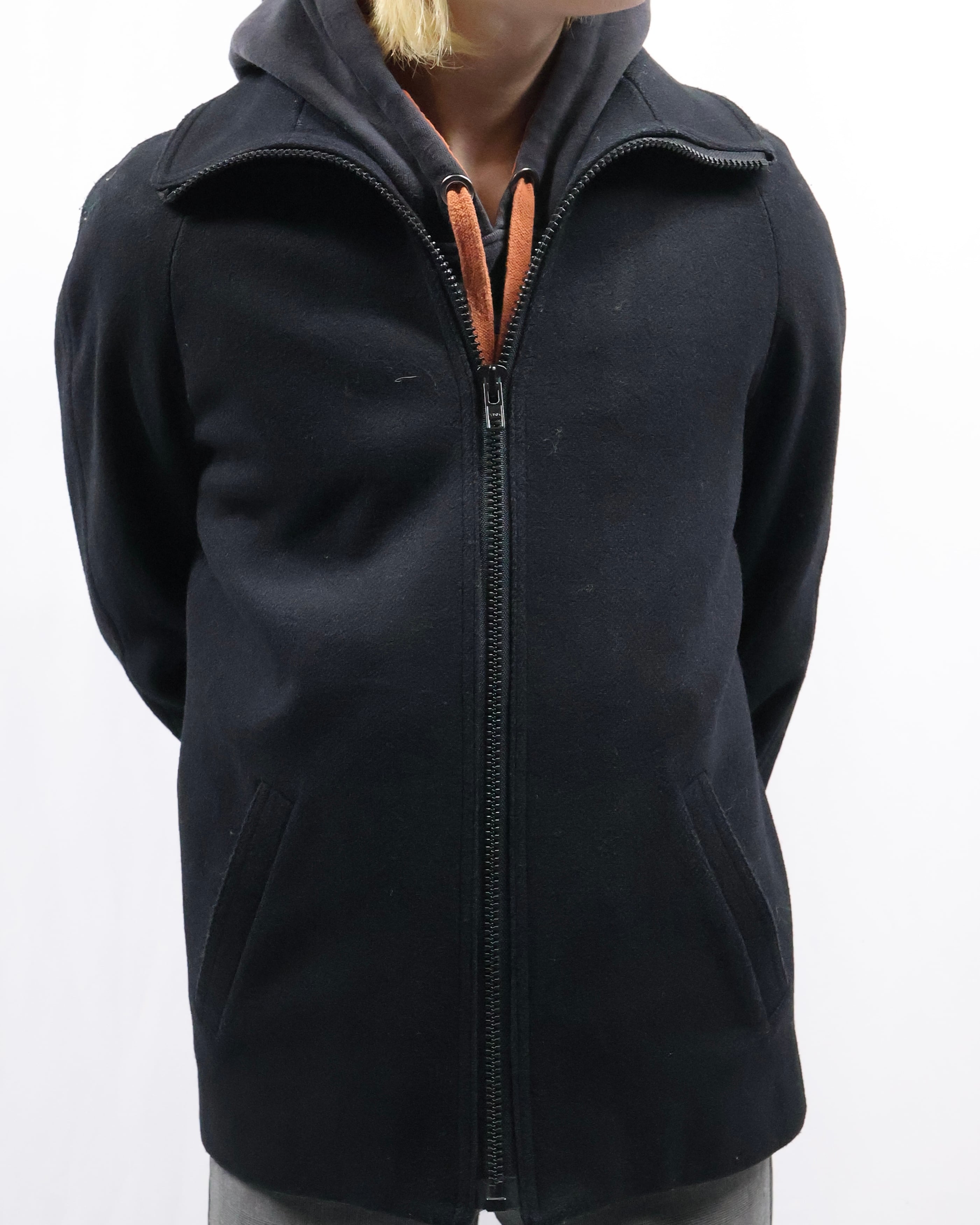 タイトなシルエットのハイネックウールブルゾン。ウールの素材感とタイトなサイズ感がコーディネートに適度な緊張感を与えてくれるアウターとして優秀な一枚。