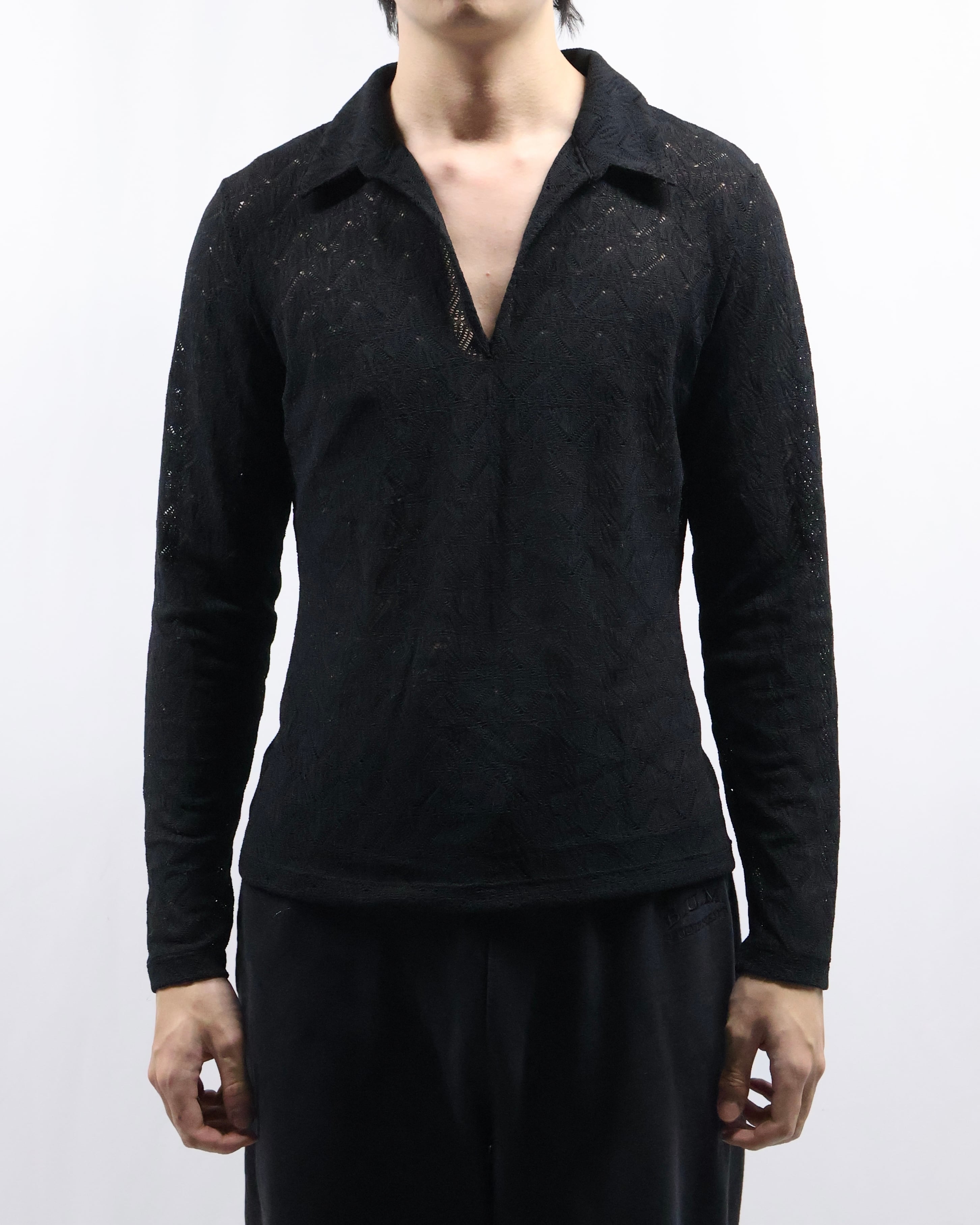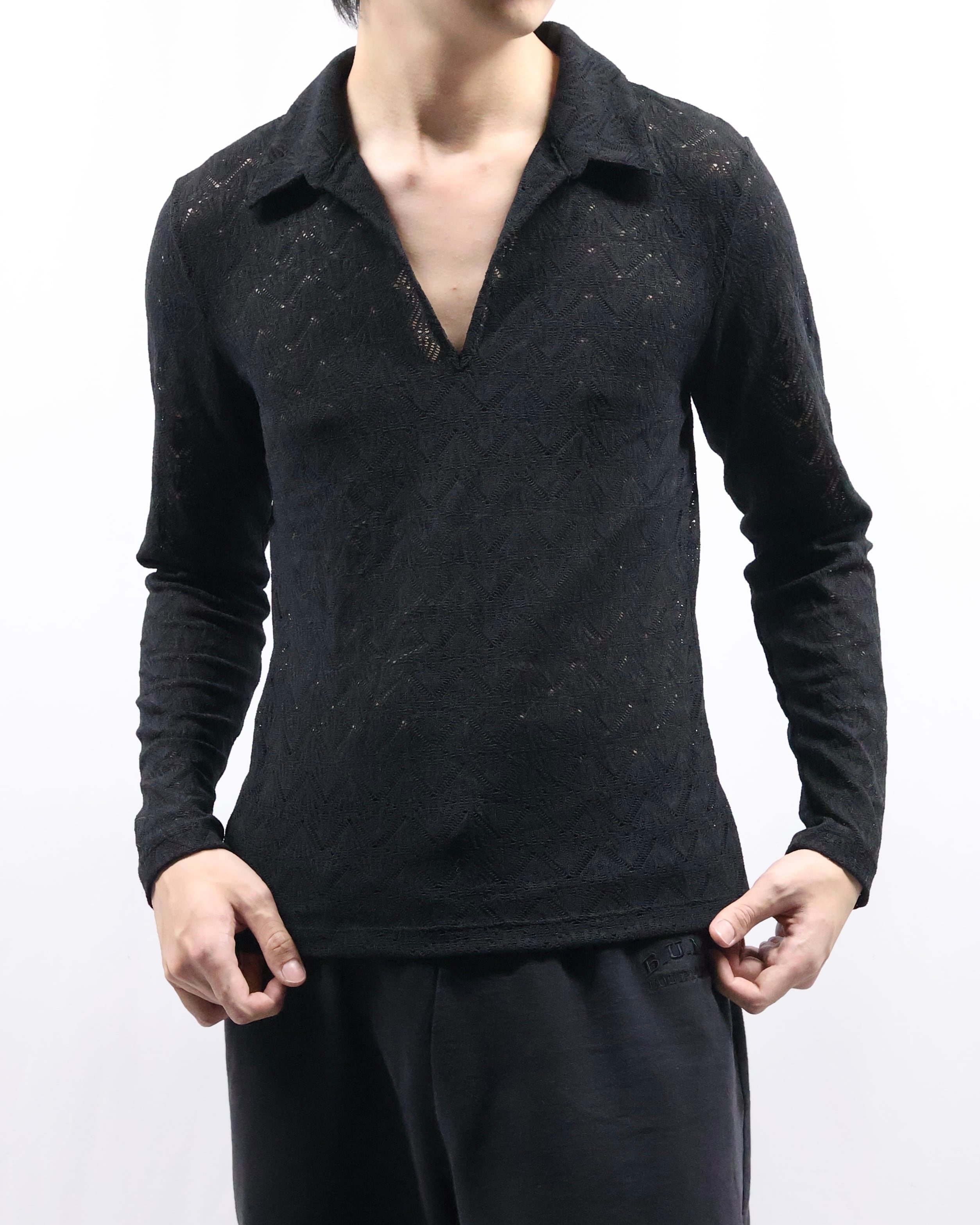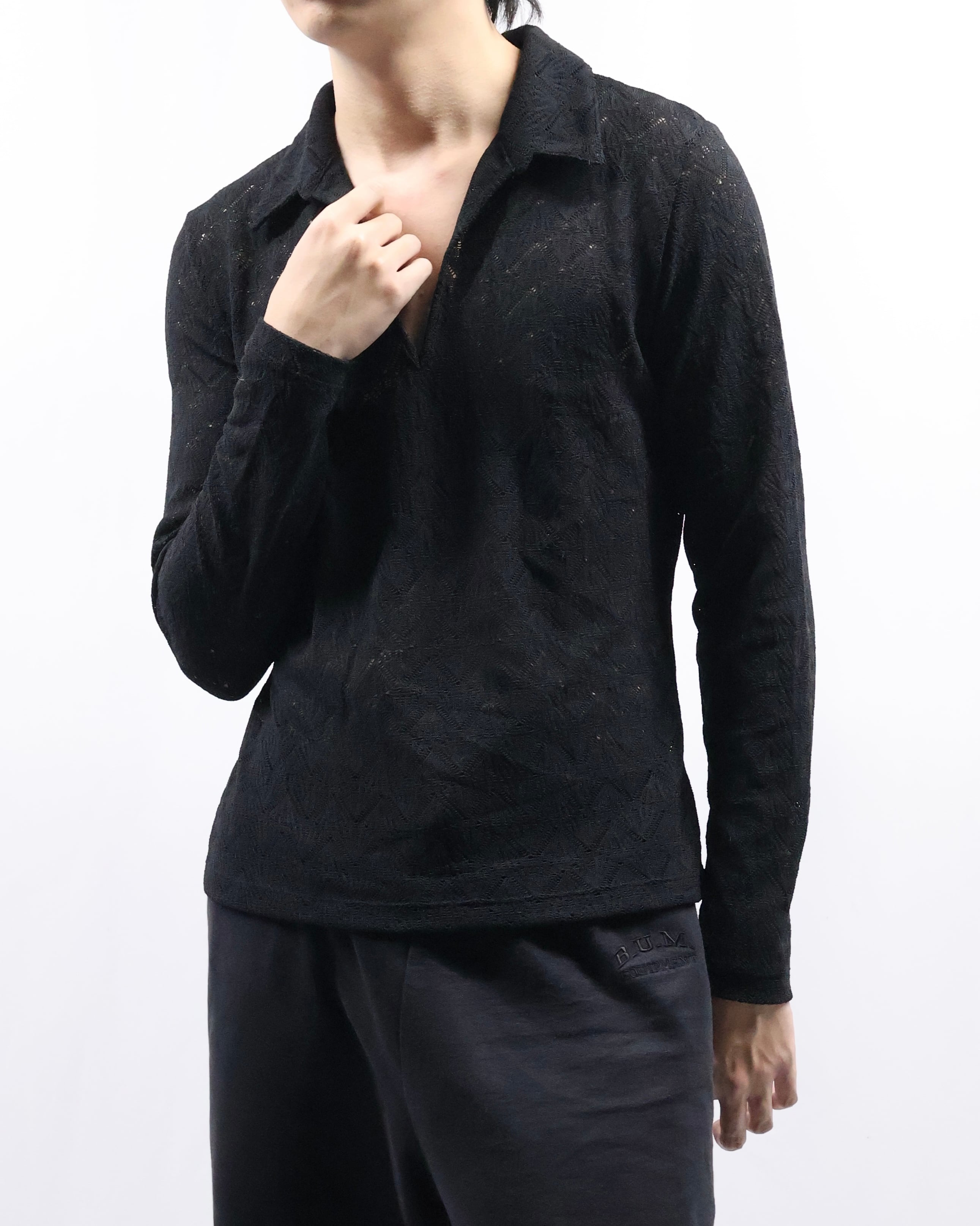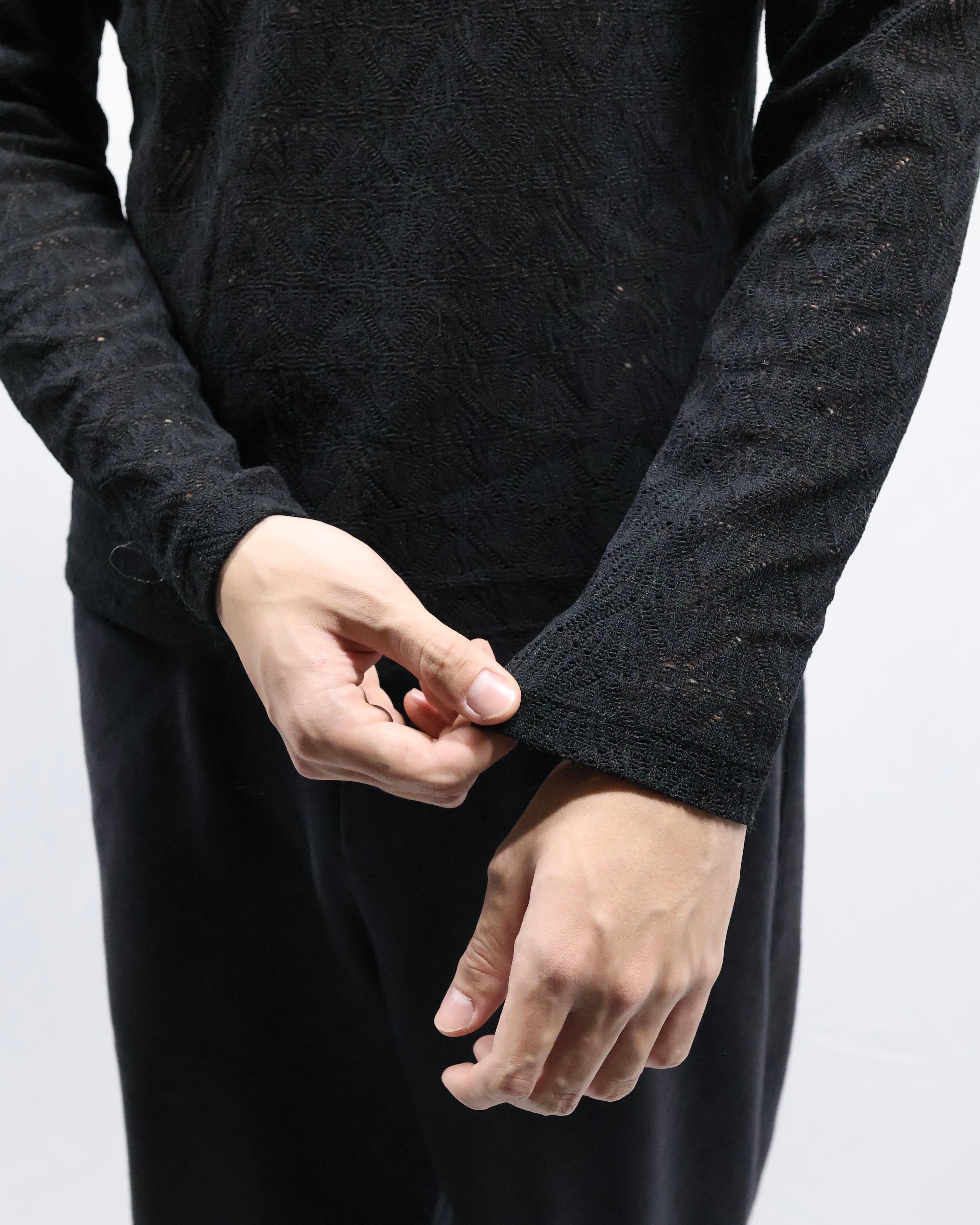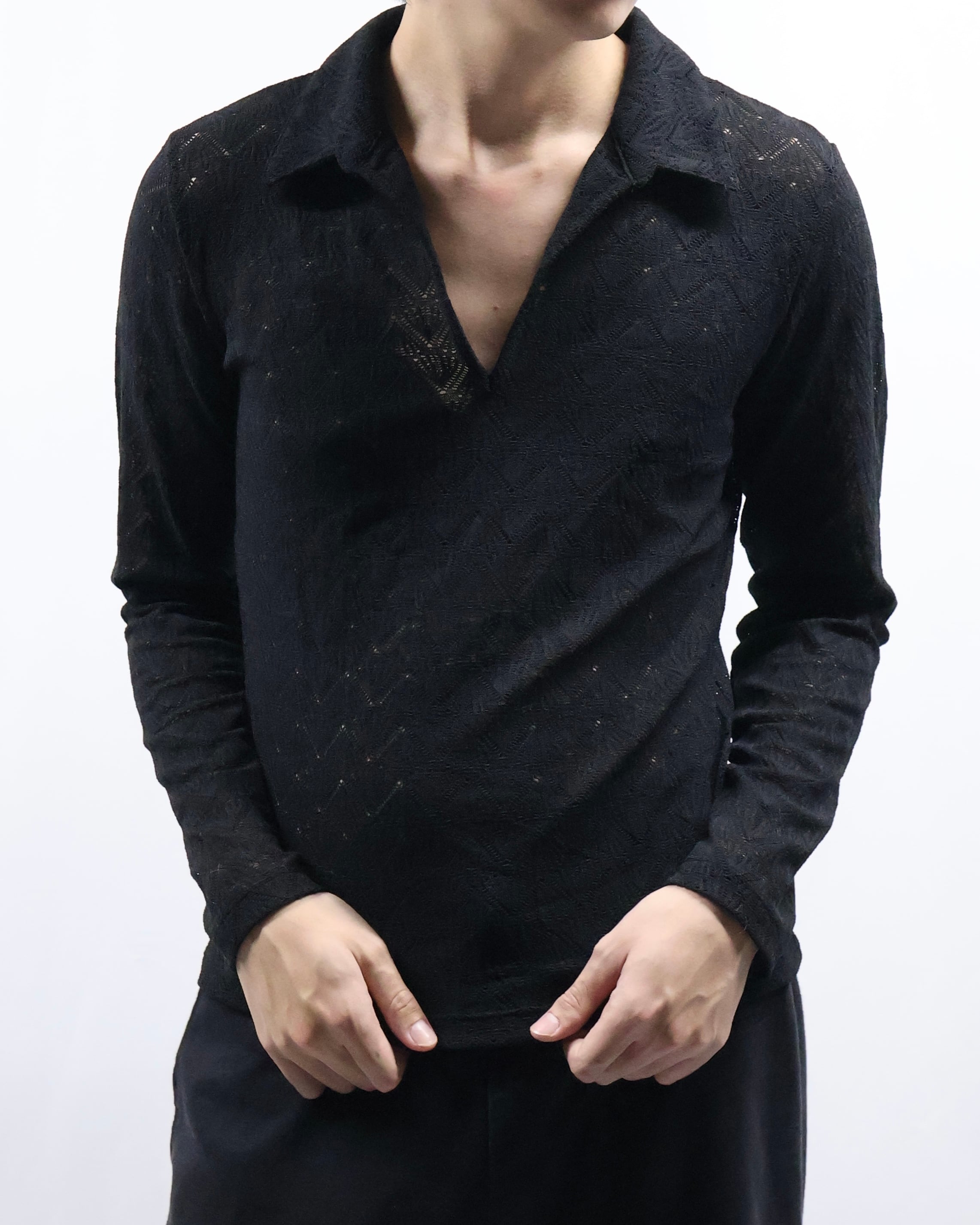 タイトなサイジングのためインナー使いとして最適で、ダークトーンだがシアーかつ首回りの抜け感があるため軽い印象を与えながらレイヤードをすることができるアイテム