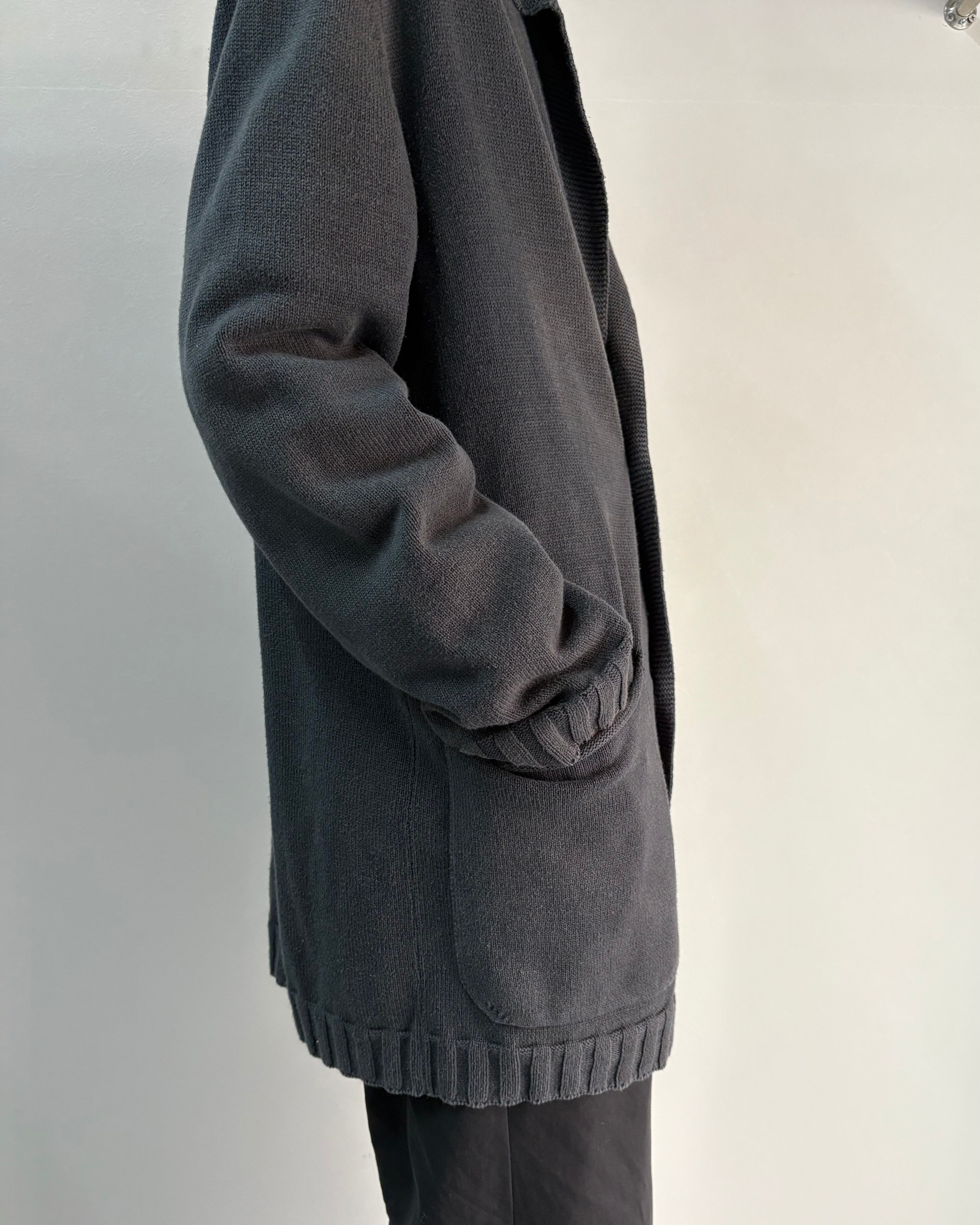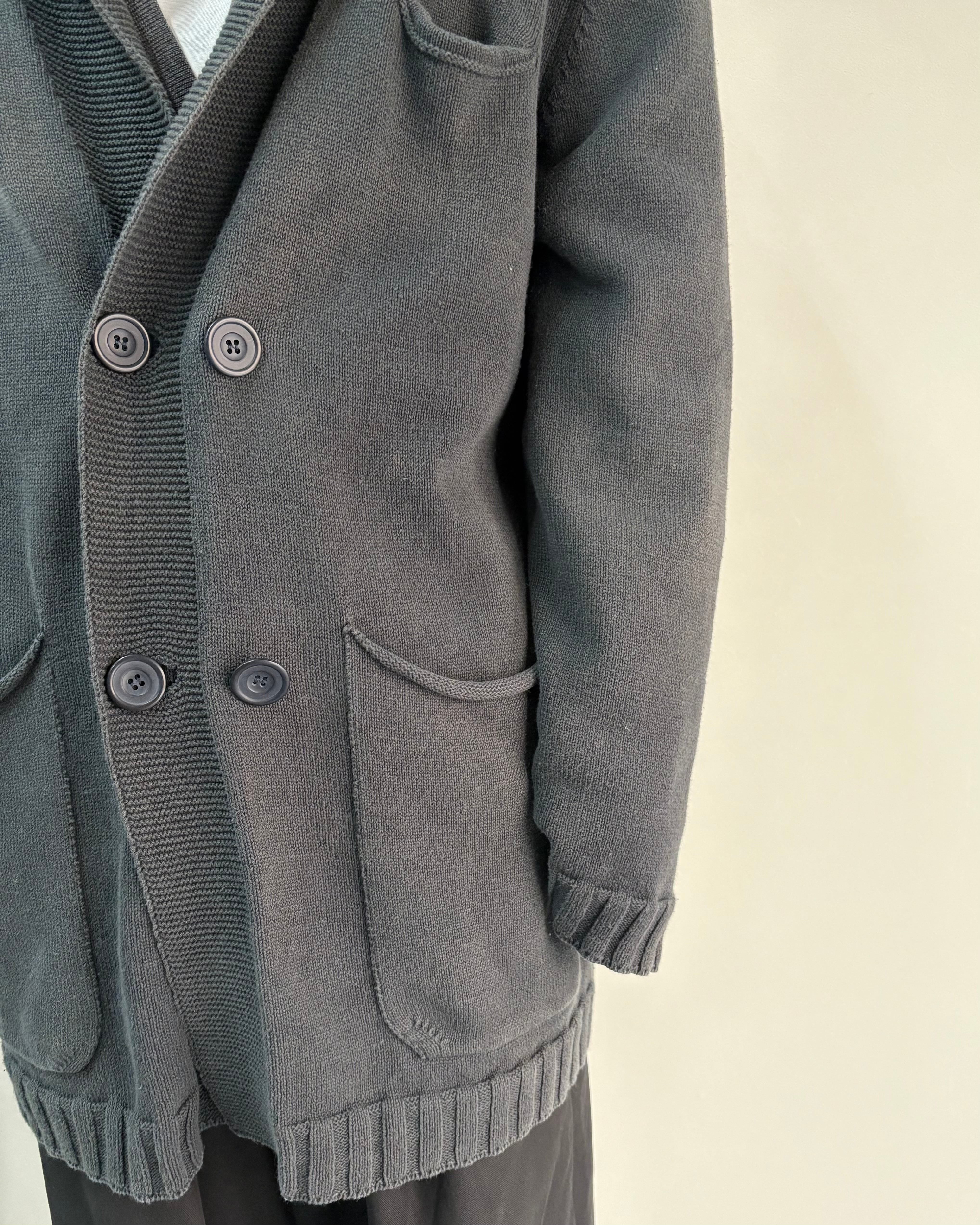 ゆったりとしたシルエットとロング丈のバランスが、落ち着いた印象の一着。ダブルブレスト仕様のフロントデザインが特徴的で、カーディガンでありながらジャケットのような存在感を持つアイテム。