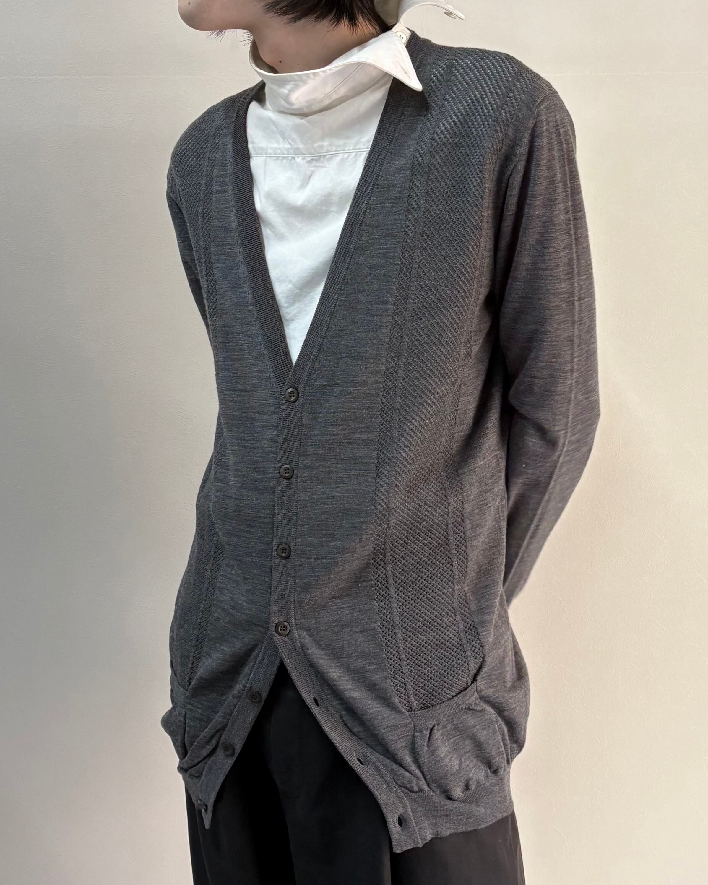 PRADAのベーシックなカーディガン。途中で折り方を変え、縦に大きく太く取られた柄が目を引く1着。オーソドックスでどんなスタイリングにも溶け込み、着る人を選ばないアイテム。