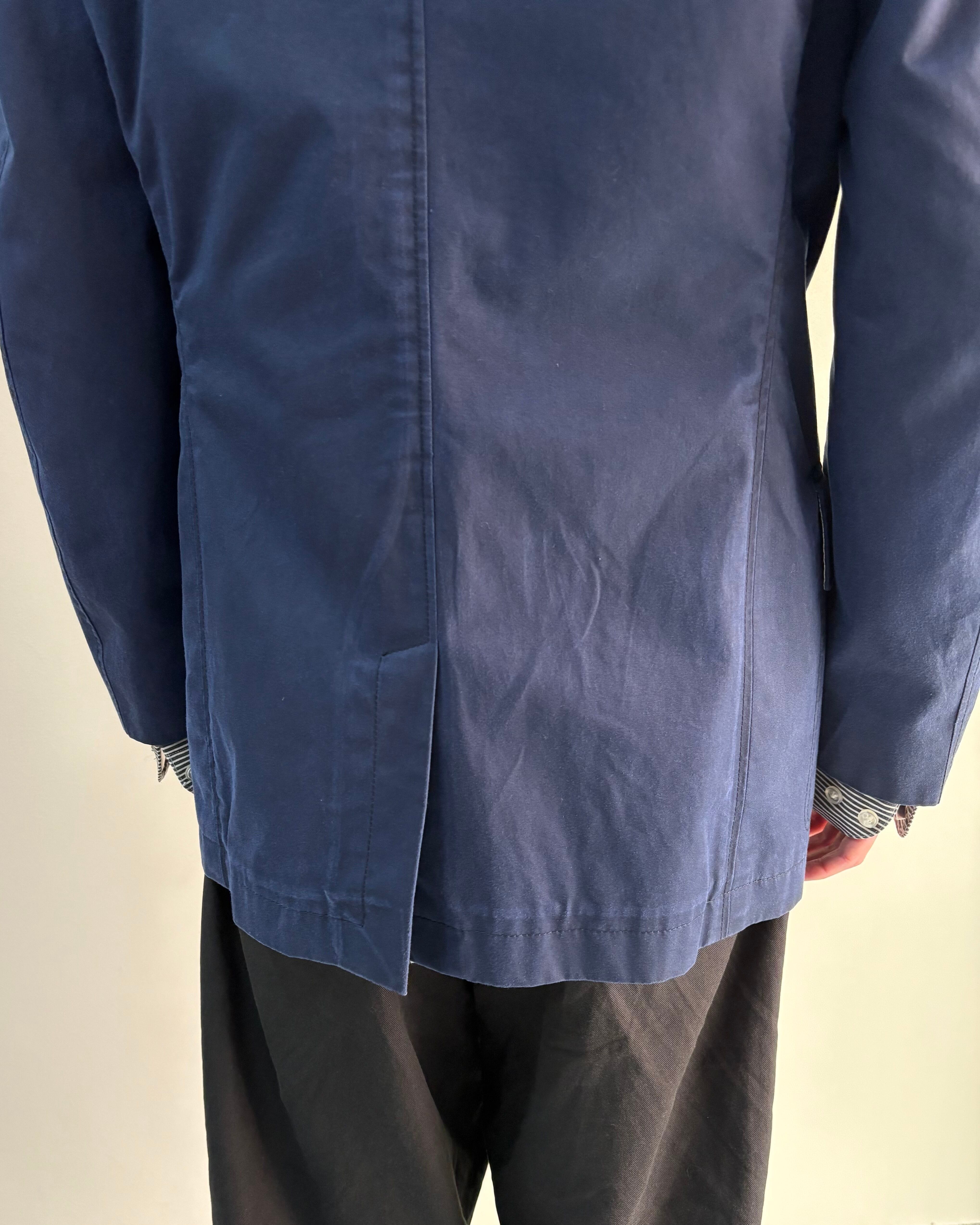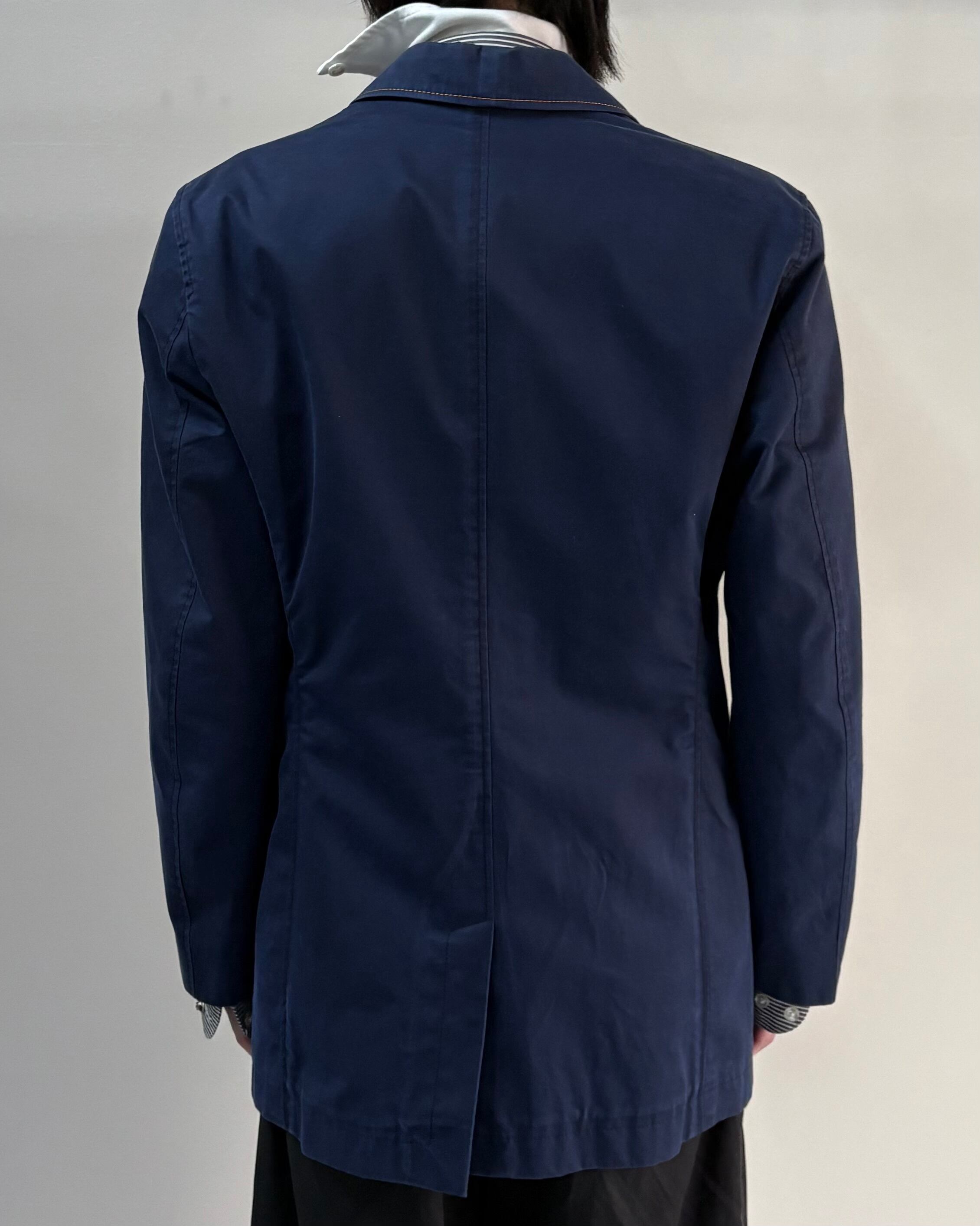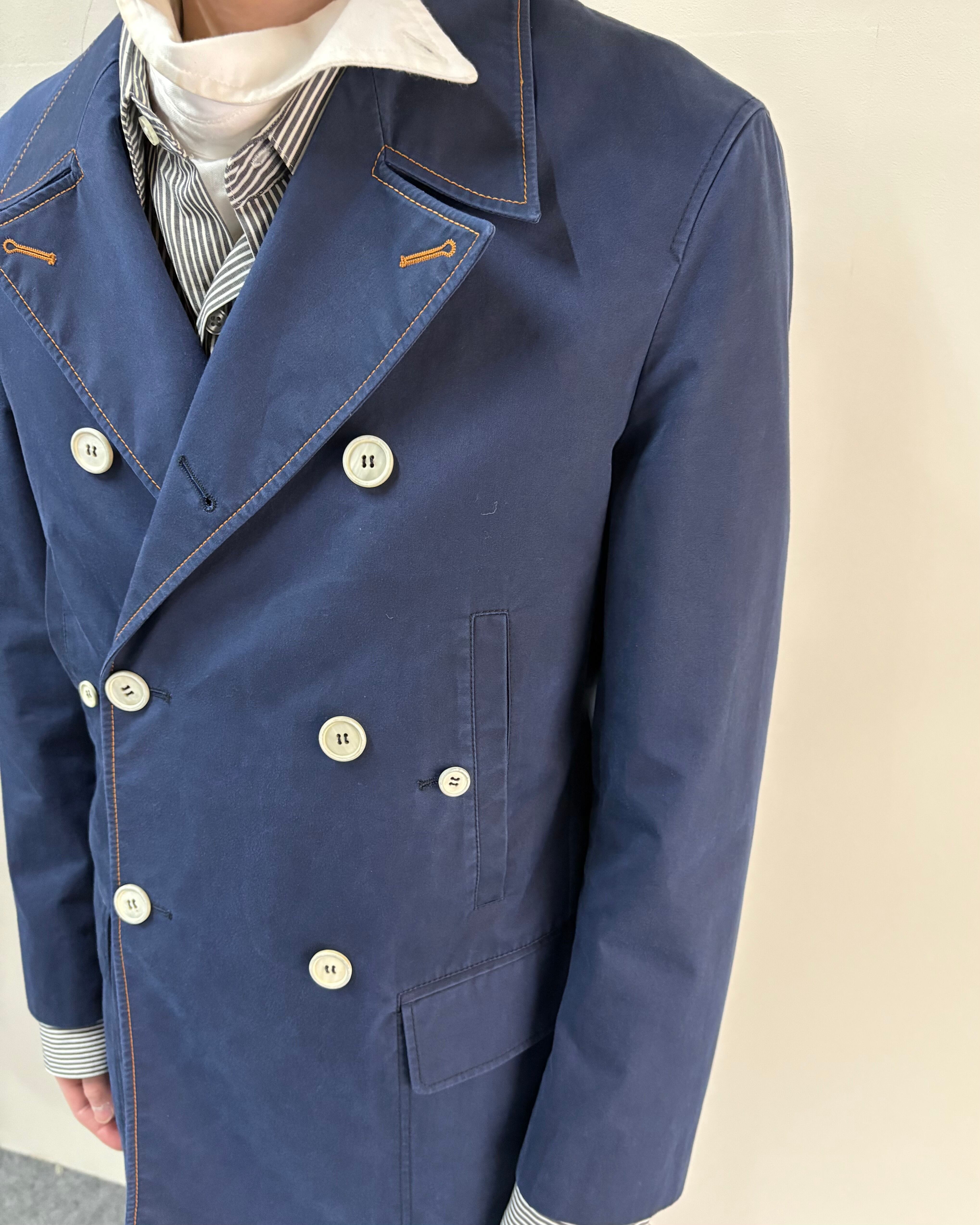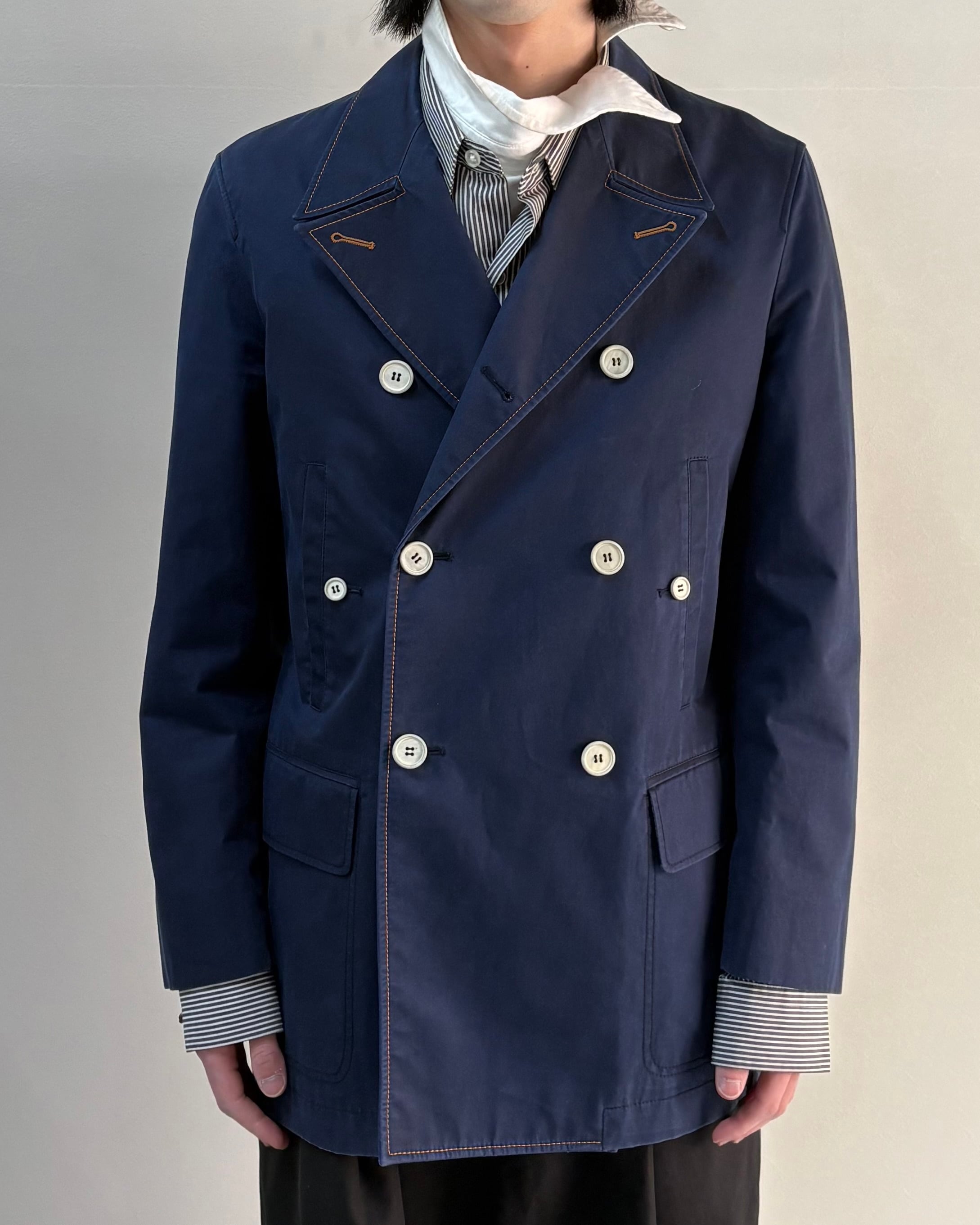 クラシックなミリタリージャケットを思わせるダブルブレスト仕様にブランドらしいシャープなシルエットを掛け合わせた一着。端正なネイビーカラーにコントラストの効いたステッチがさりげないアクセントとなっており、クラシックからモードなスタイリングまで落とし込めるアイテム。