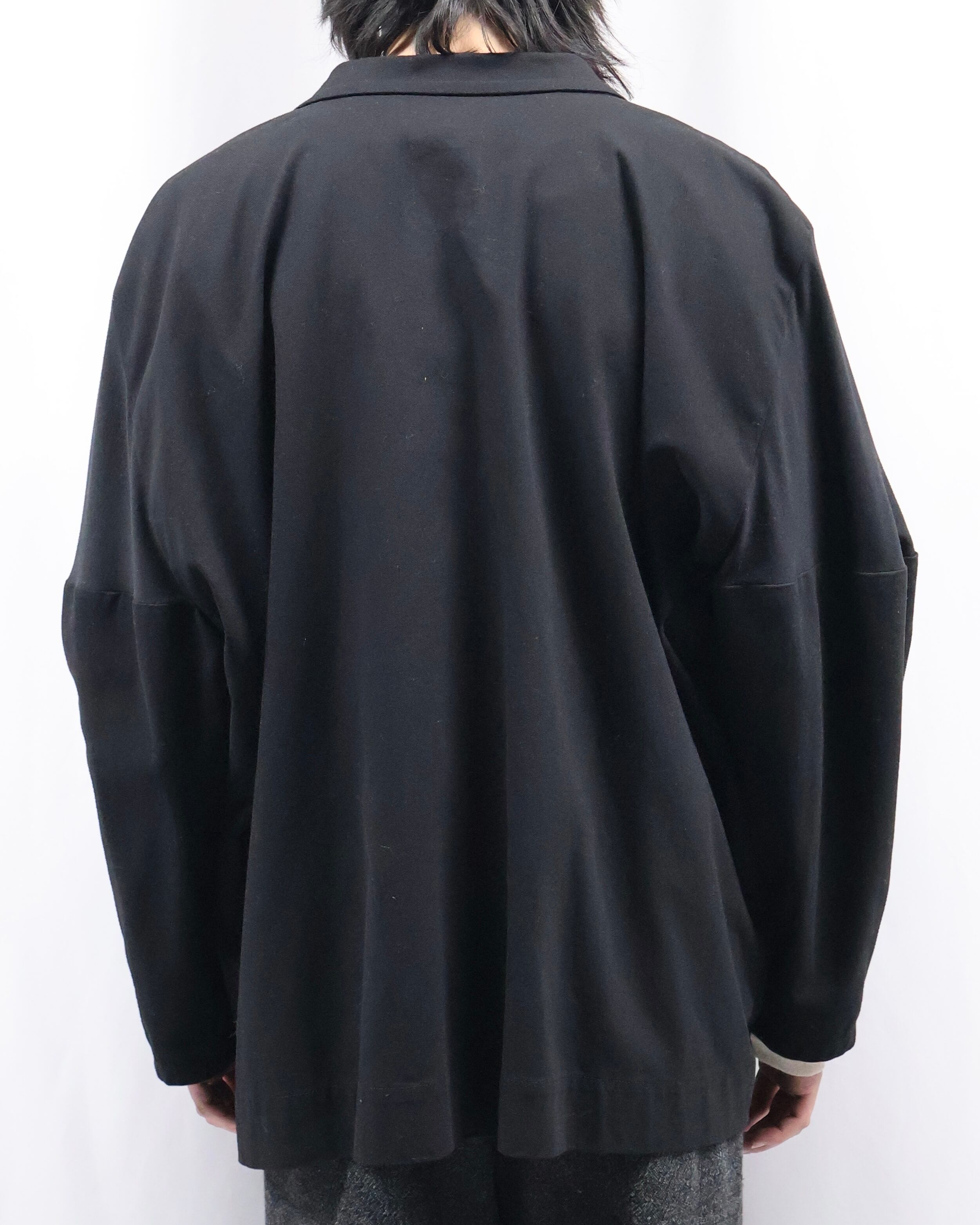 襟のデザインが特徴的なブランドらしい変形デザインのジャケット。身幅やアームホールのゆとりとボックスシルエットのバランスが良く、適度な緊張感と緩さを併せ持つブランドならではの一枚。