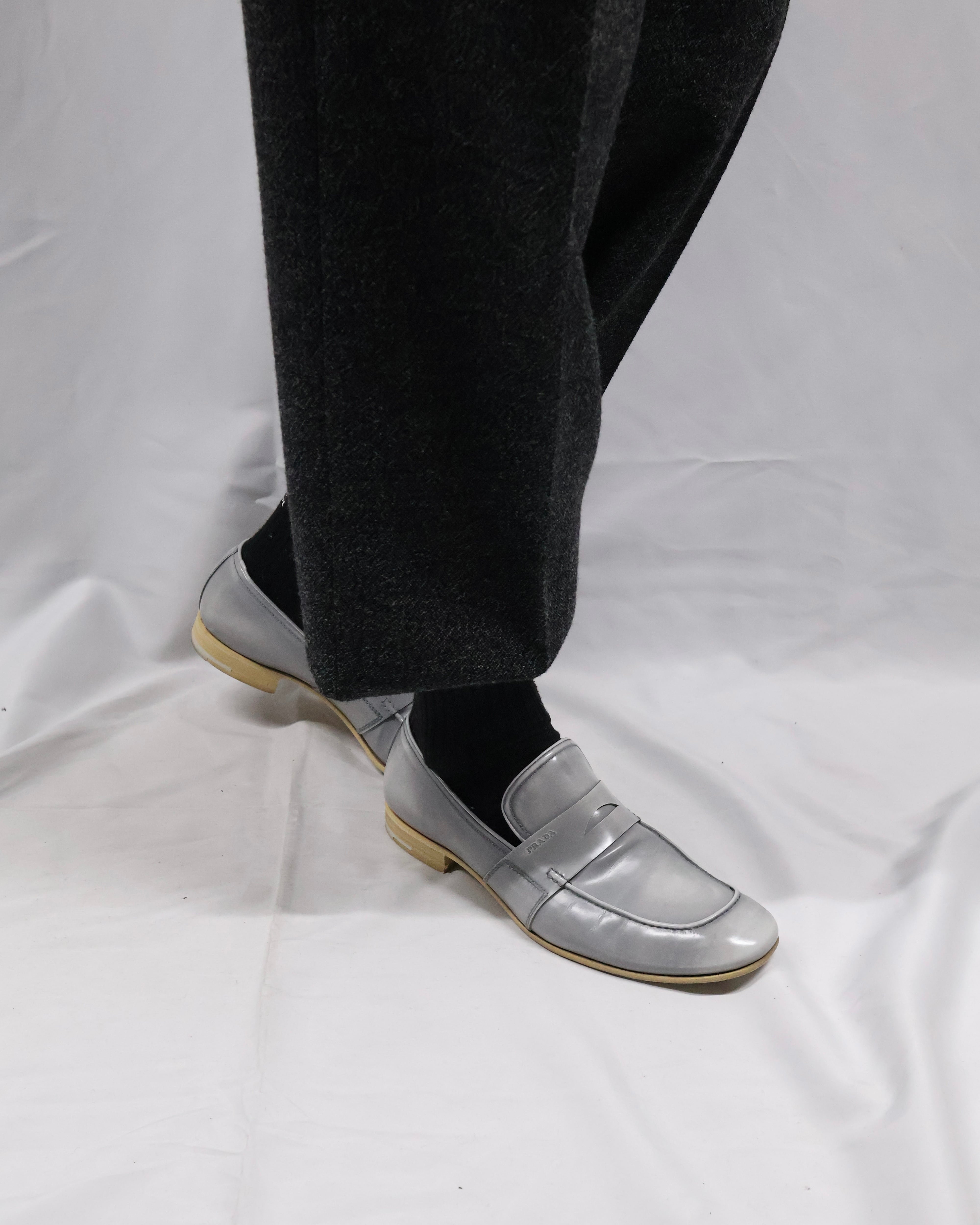 上品な風合いのプラダのカラーリングローファー。色は珍しい配色ではあるが、ミニマルでクラシックな雰囲気がコーディネートの格は下げず、外しとして成立するようなブランドが出すローファーとして相応しい一品。