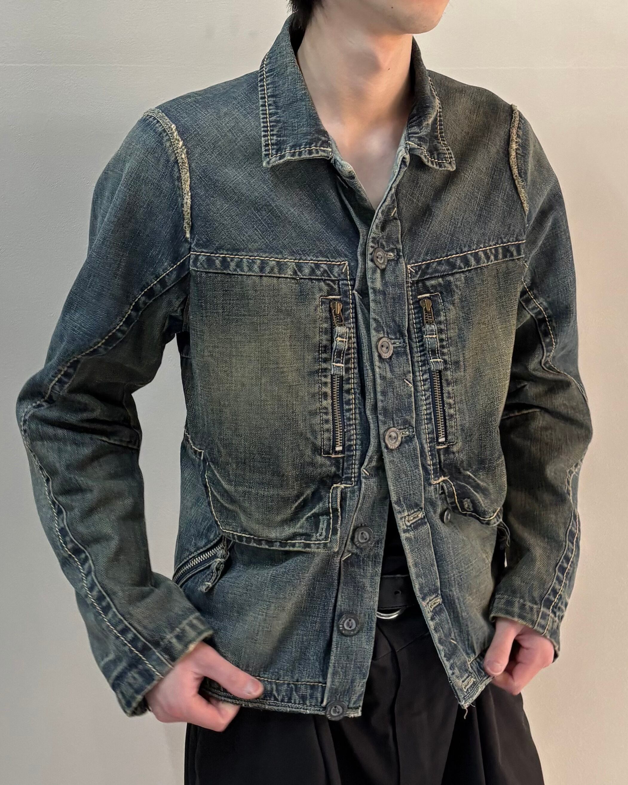 ヴィンテージを思わせるフェード感のあるデニム生地に、独特の切り替えやステッチワークが加えられた存在感のあるアイテム。