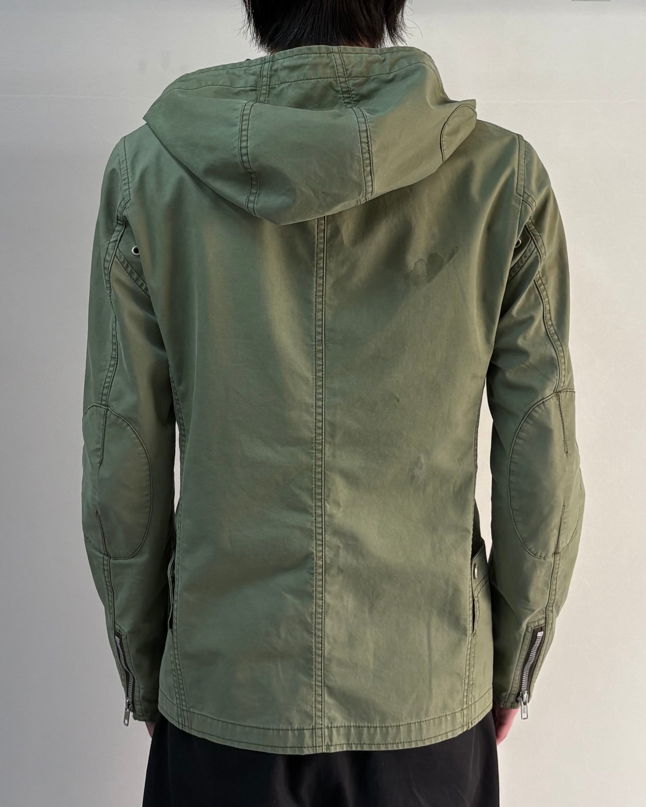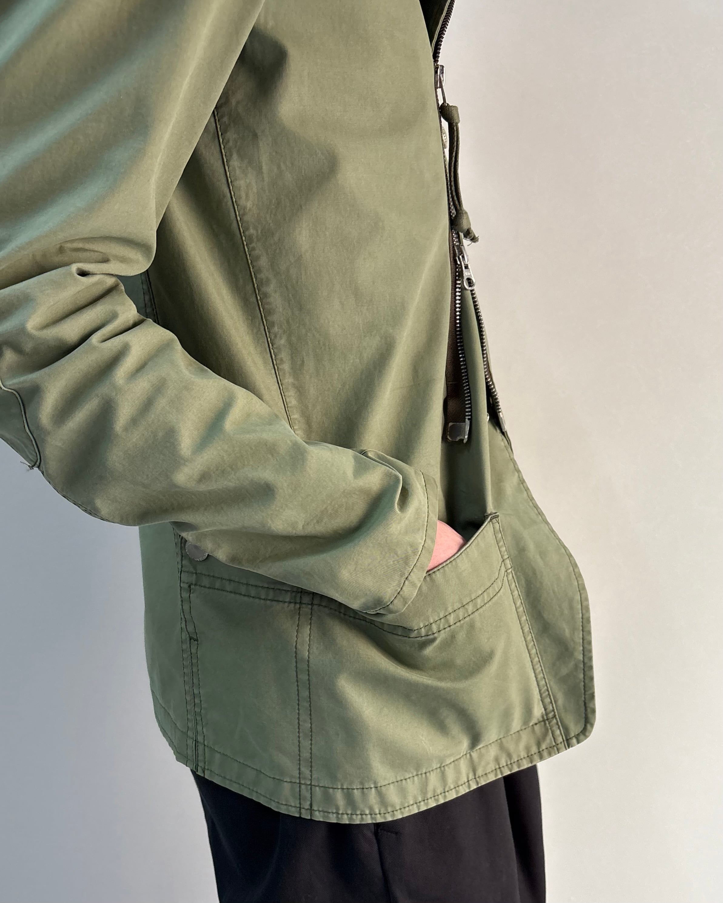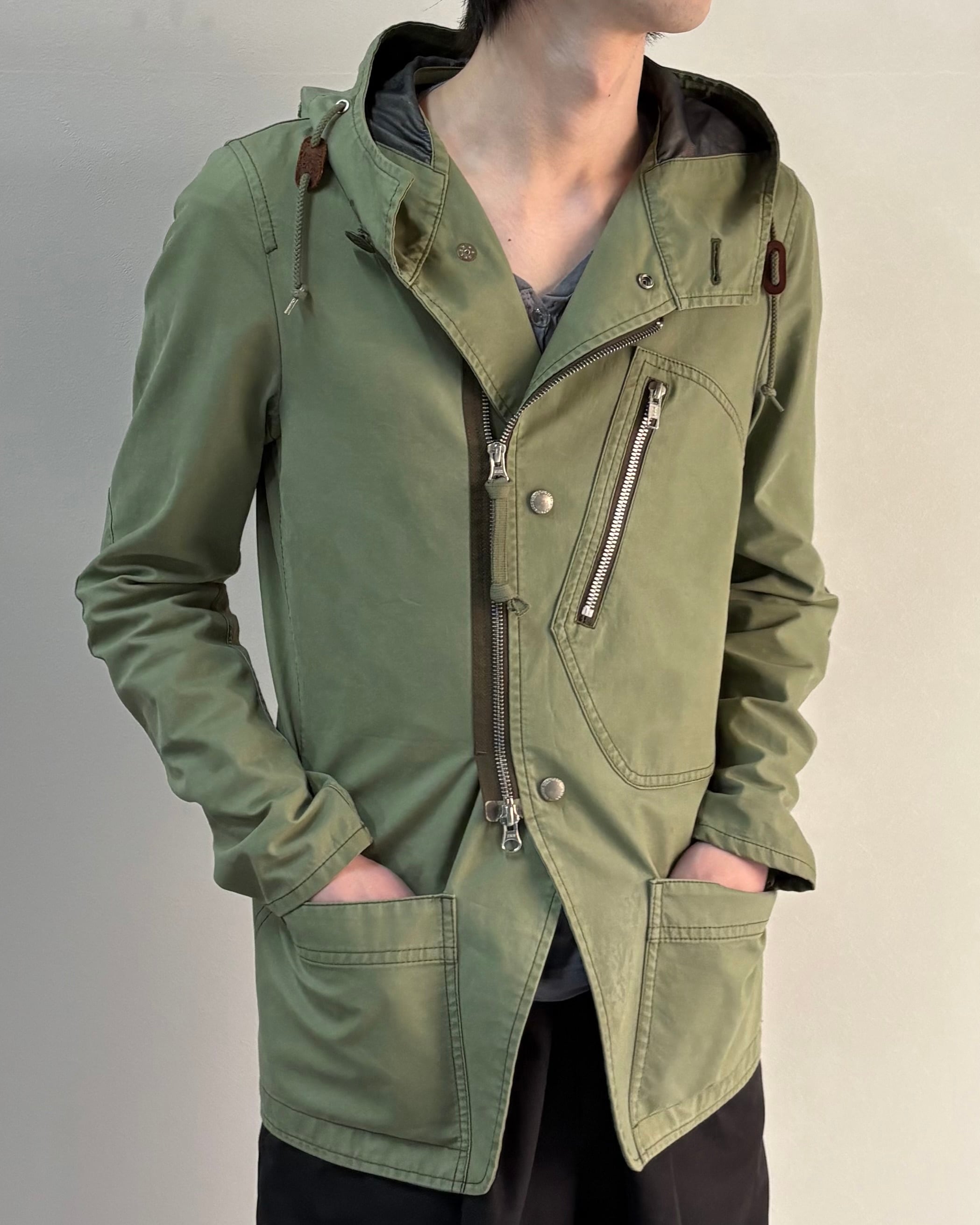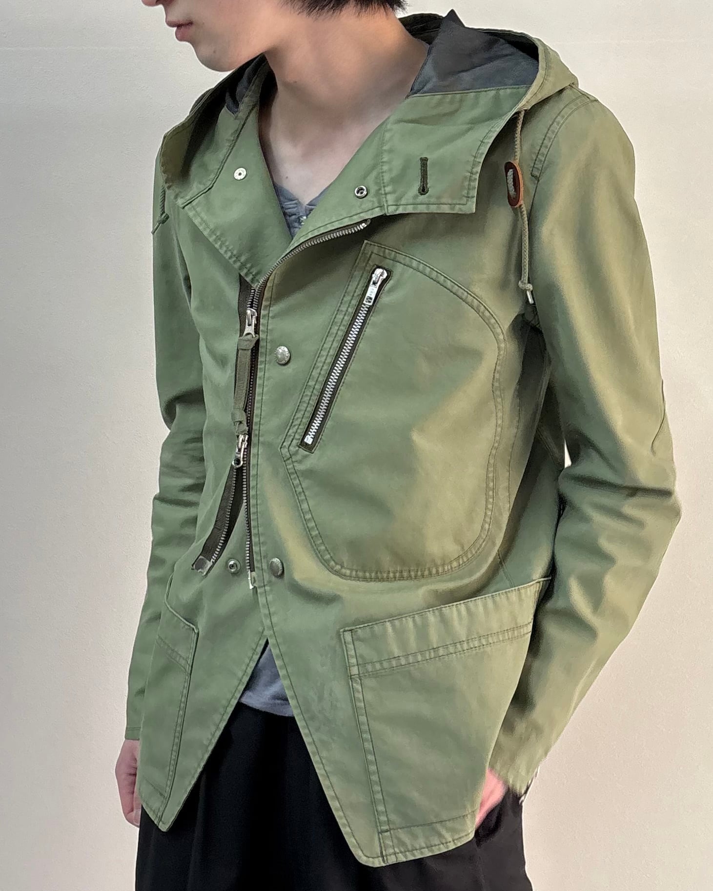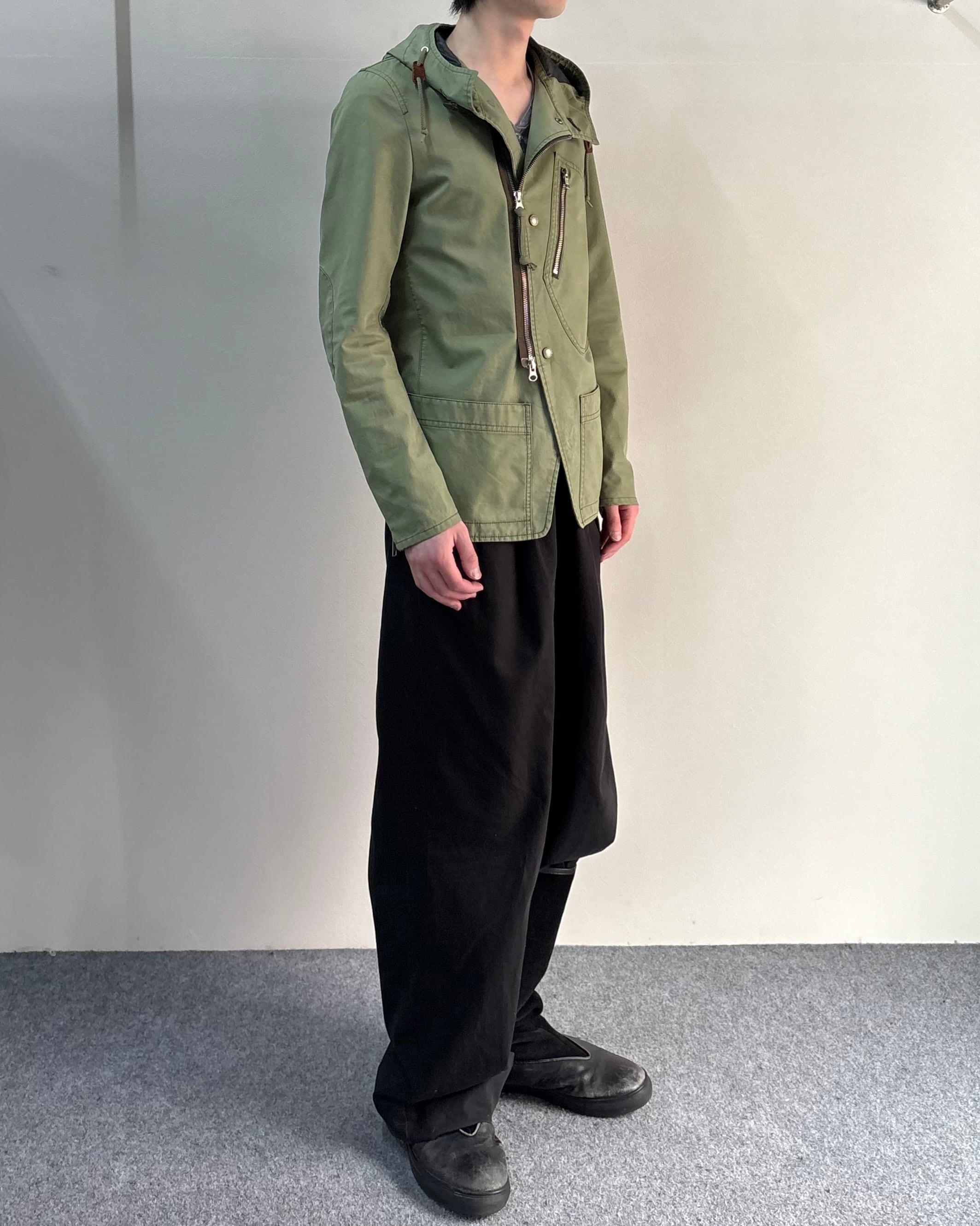 斜めに配置されたジップポケットやアシンメトリーなディテールが特徴。無骨なミリタリーテイストの中にも洗練された雰囲気があり、スラックスやワイドパンツと合わせたモードスタイルにも相性の良い一着。