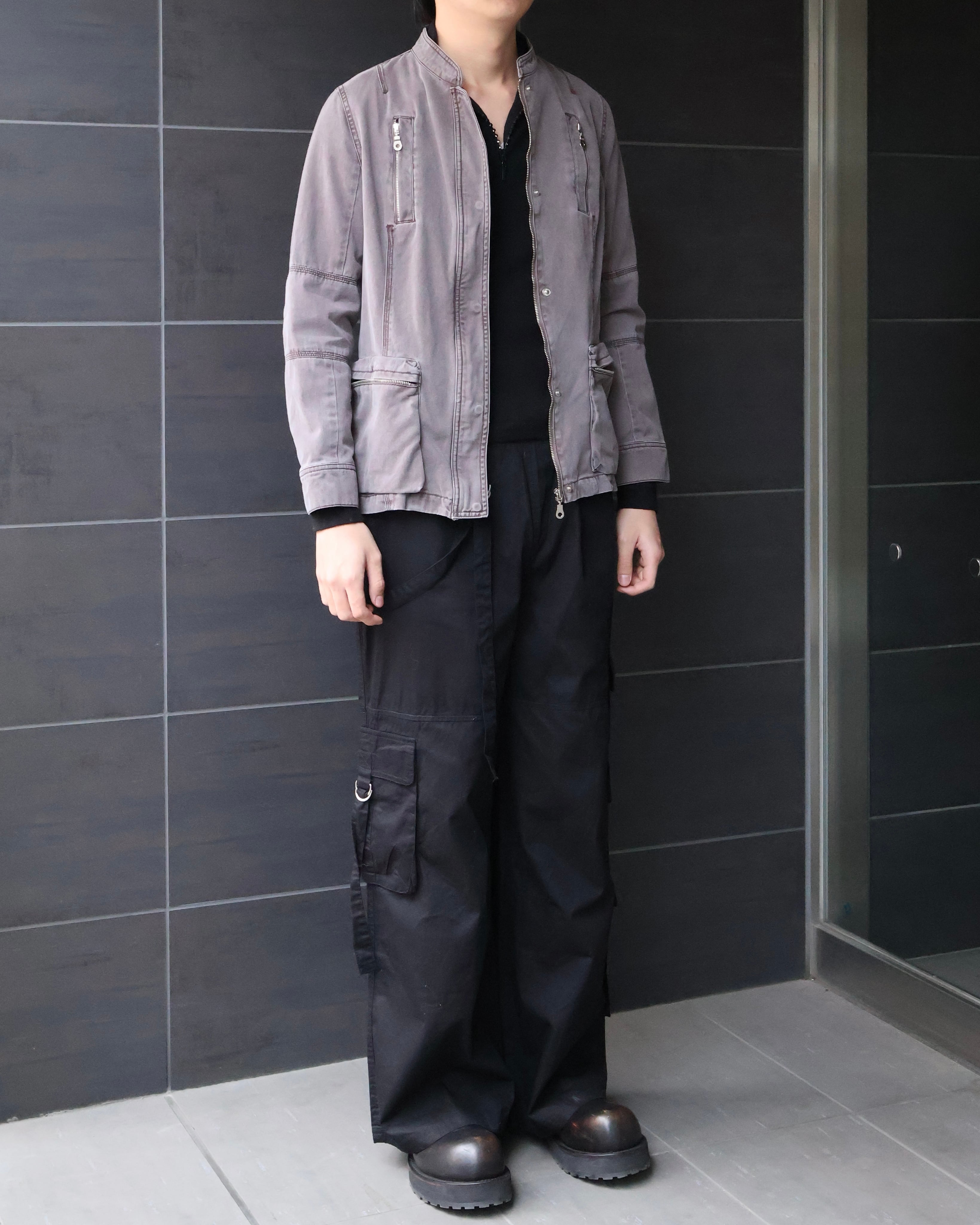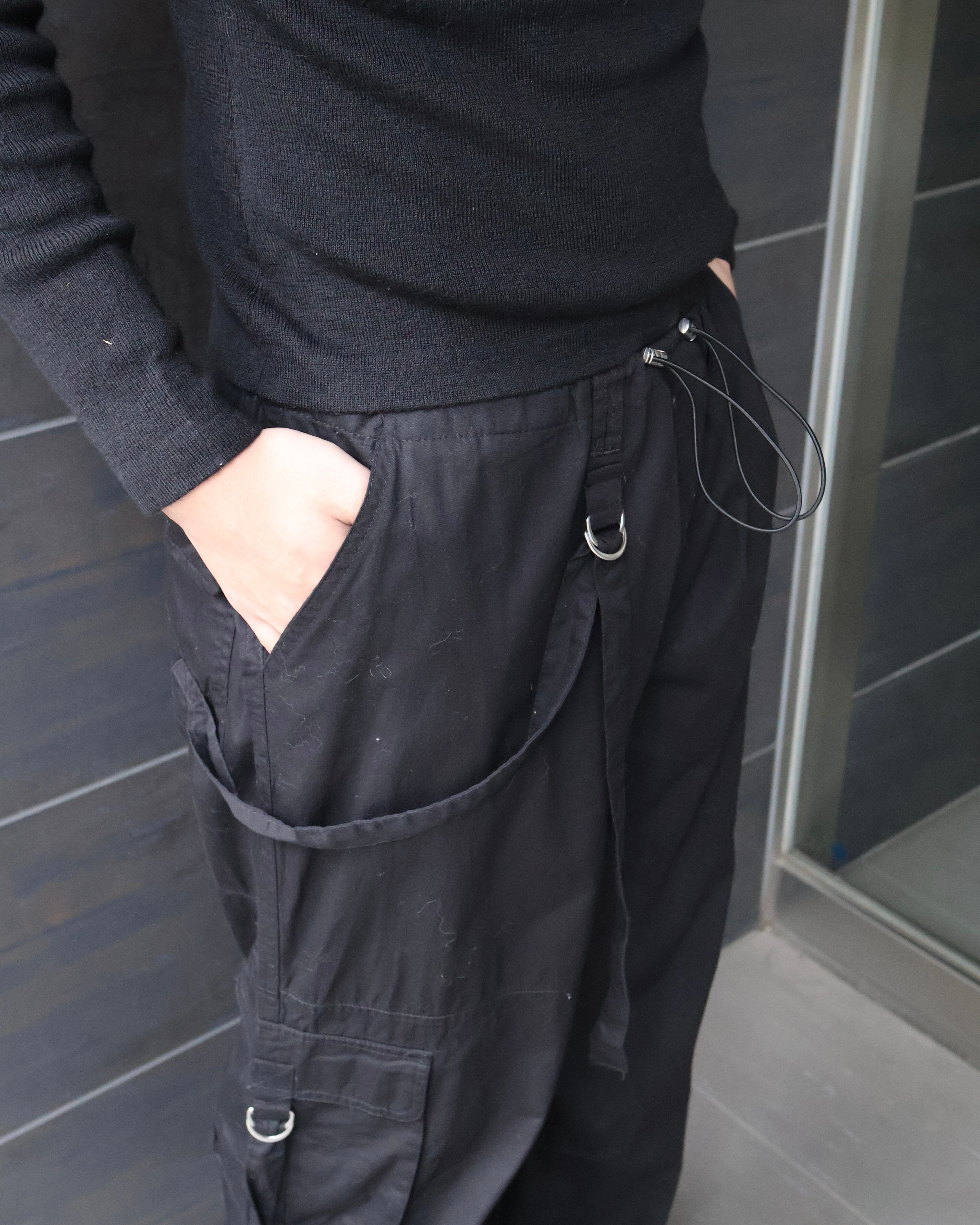 鈍い光沢感のある、ワイドカーゴパンツ。ボンテージのディテールもあり、コテコテのファッションができる面白い一本。モノトーンベースのスタイリングはどうしてものっぺりしがちで、そう言ったイメージを払拭できるような新しいアイテム。